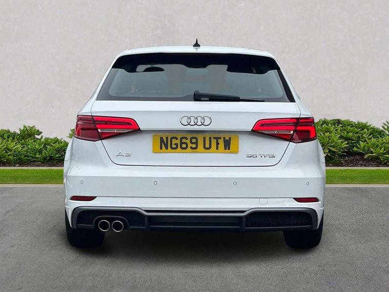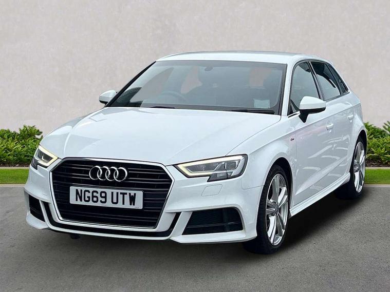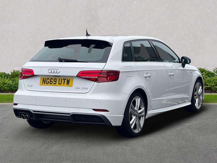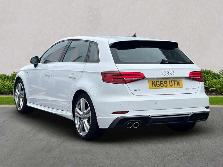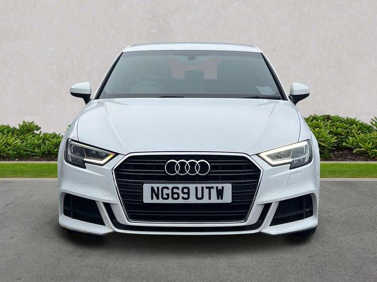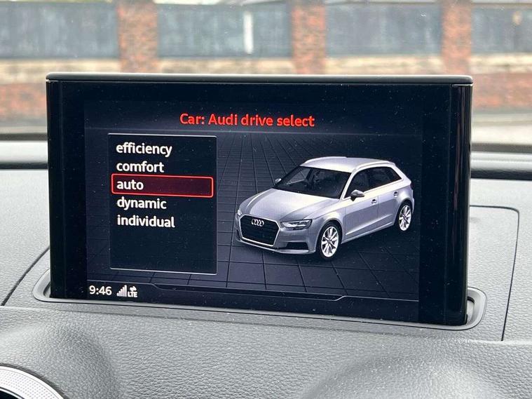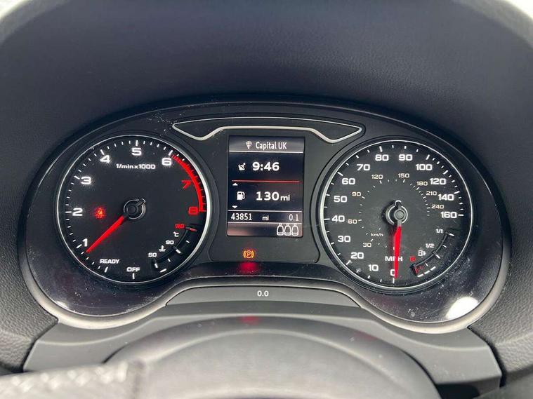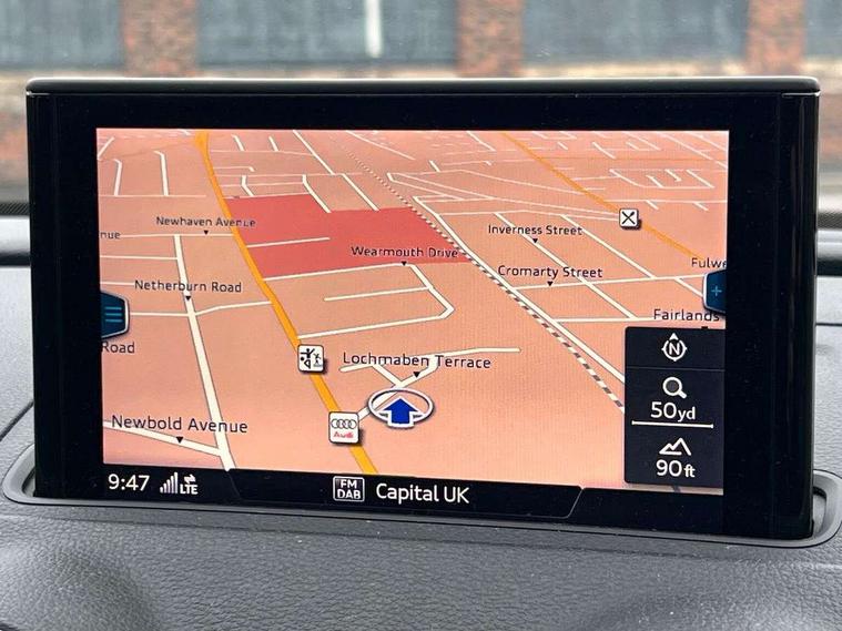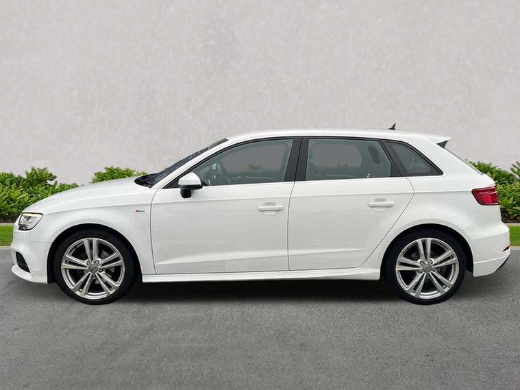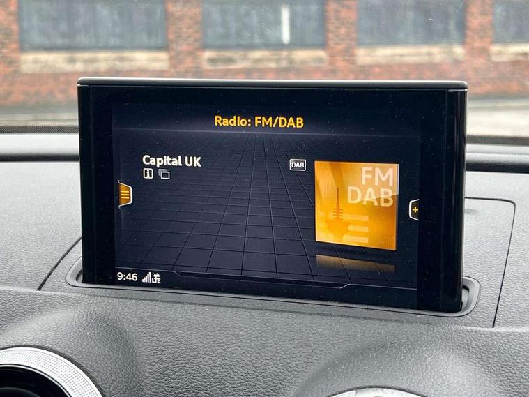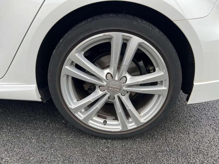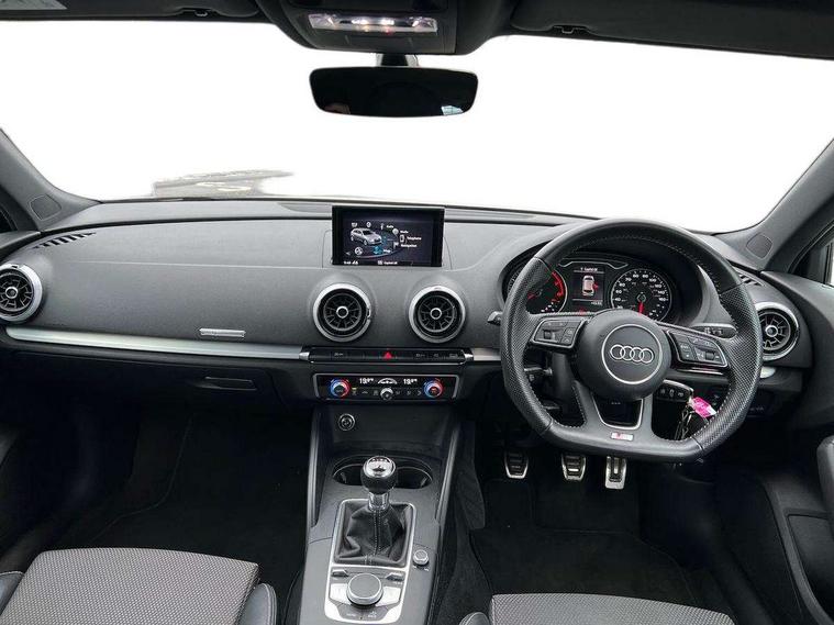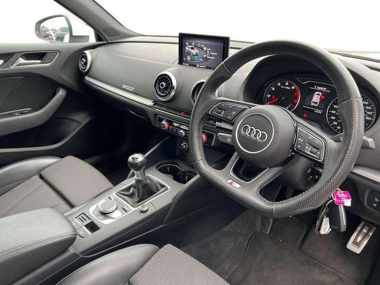 Aluminium air vent surrounds, Aluminium trim elements, Matt brushed aluminium inlays, LED interior light pack - A3/RS3, Non smoking pack - A3, Storage and luggage pack - A3/RS3, Tyre repair kit, Anti theft alarm, Anti-theft wheel bolts, Remote control central locking, Thatcham category 1 alarm + immobiliser, 2 USB interfaces and Aux-In jack, Audi music interface, CD player, DAB Digital radio, MMI radio plus with 7" colour MMI screen and MMI controller, Online entertainment, 3 point seatbelts on all seats, ABS/EBD, Active bonnet, Active front headrests, Airbags - front driver/passenger, front & rear side, curtain, drivers knee, ASR, EDL, Electromechanical parking brake, ESC - Electronic Stability Control + traction control, Front passenger airbag deactivation, Hill hold assist, Manual rear child locks, Multi-Collision braking, Seatbelt warning, Tyre pressure warning, Warning triangle and first aid kit, Aluminium window trim, Auto dimming interior rear view mirror, Body colour door mirrors, Chrome exhaust tailpipes, Electric front windows, Electric rear windows, Electrically adjustable and heated door mirrors with integrated LED side indicators, Heated windscreen washer jets, LED daytime running lights, Light and rain sensors, Matt black radiator grille, Rear wiper, S line badges on front wings, S Line body styling with front & rear bumpers and side skirts, radiator grille and rear diffuser insert, roof spoiler, Sport specific side air inlet grille and diffuser insert, 3 adjustable rear headrests, 3 spoke flat bottomed multi-function leather sport steering wheel, 60/40 split folding rear seat, Adjustable front centre armrest, Black cloth headlining, Dual zone electronic climate control, Front and rear interior lights with delay, Front/rear floor mats, Height and reach adjustable steering wheel, Illuminated door sill trims with S logo, Isofix child seat preparation for front passenger/outer rear seats inc passenger airbag deactivation including top tether, Lashing point in luggage compartment, Manual height adjustable front seats, Stainless steel pedals, Storage compartments in doors side trims, centre console and under front drivers seat, Tool kit, Audi drive select, Audi smartphone interface, Automatic start/stop system, Colour driver's information system display, Electro - mechanical power assisted steering, Mobile telephone preparation - bluetooth interface, SD card based MMI navigation, Service interval indicator, Speed limit display, Voice control system, Voice recognition for navigation system, Sports suspension,