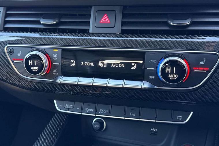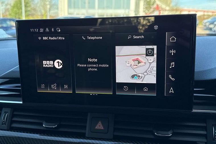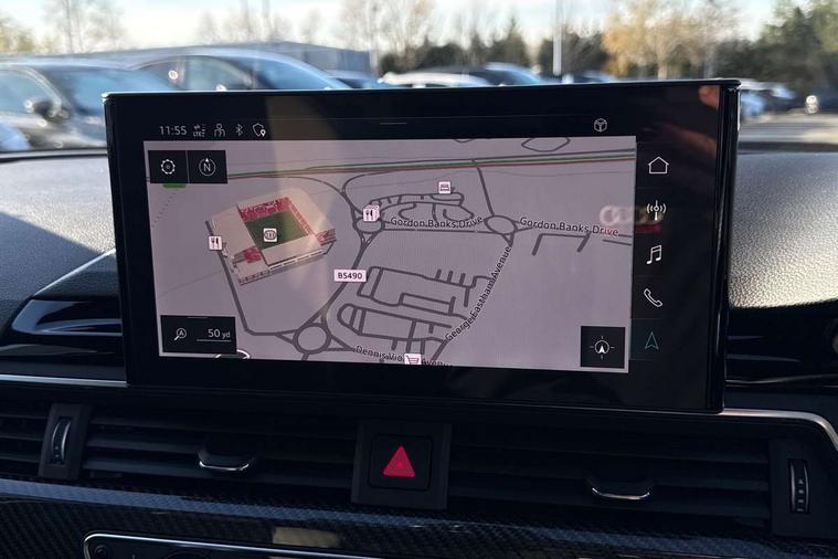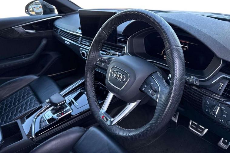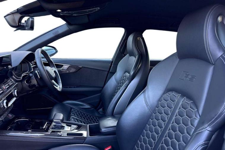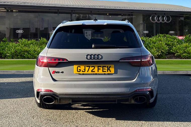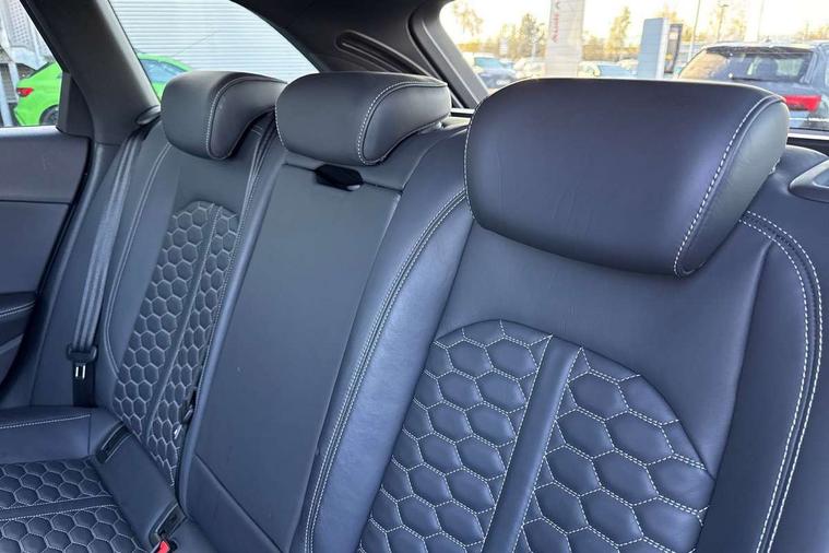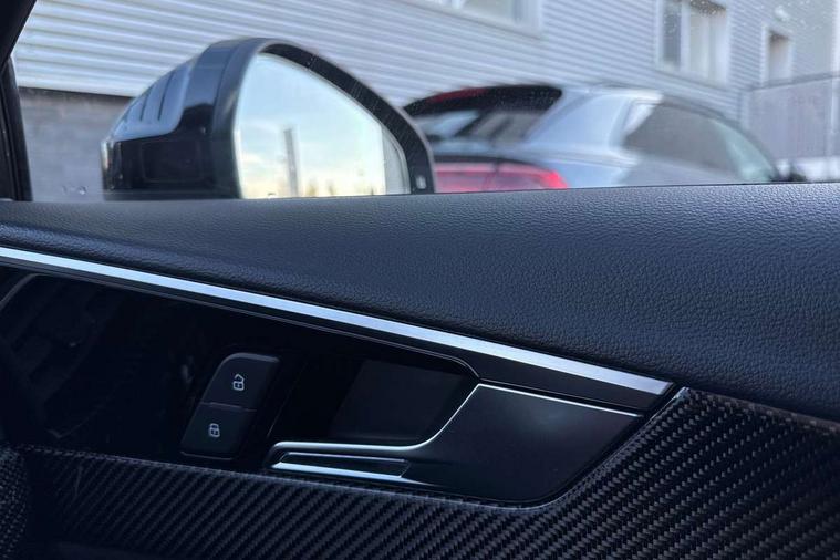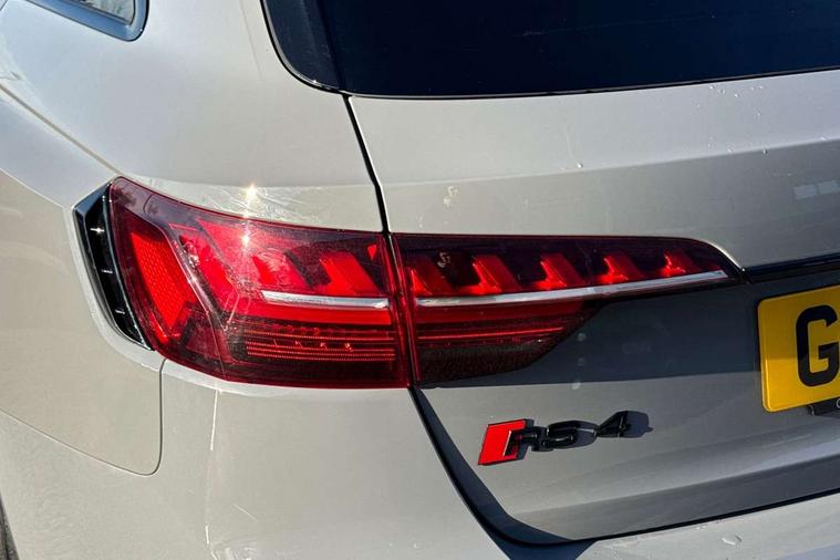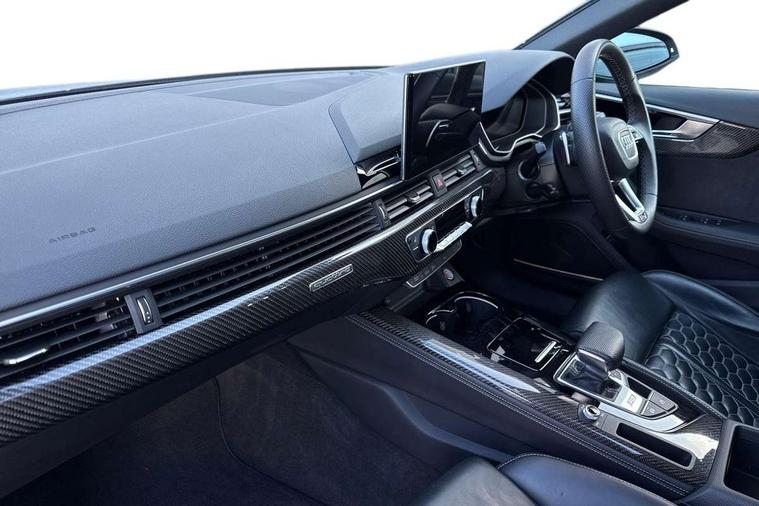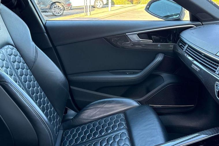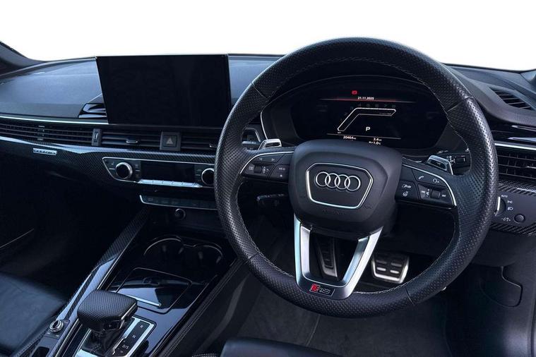 Carbon twill inlays, Carbon black styling pack - RS4, LED Interior light pack - RS4, Non Smokers pack, 20" 5 segment spoke evo design glossy black sport alloy wheels, Tyre repair kit, Anti theft alarm, Anti-theft wheel bolts, Immobiliser, Keyless Go, Remote central locking, Remote control key with RS emblem, 2 USB charging ports, Audi sound system, DAB digital radio module, 3 point seatbelts on all rear seats, Adaptive driver and front passenger airbags, Electromechanical parking brake, Electronic stabilisation control including ABS, ASR and EDL, Enhanced braking system, Front head airbags, Front seatbelt pretensioners + load limiters, Front side airbags, Hill hold assist, Manual child lock in rear doors, Multi-Collision braking, Pop-up bonnet for pedestrian protection, Pre sense city, Rear side airbags, Seatbelt monitoring, Traction control, Tyre pressure warning, Variable restraint system, Warning triangle and first aid kit, 3rd brake light, Acoustic windscreen, Audi Beam uses LEDs to project the RS logo onto ground as you exit your RS4, Audi matrix LED headlights with LED rear lights + dynamic front and rear indicators, Audi rings and lettering glossy black, Auto dimming rear view mirror, Automatic headlights + automatic windscreen wipers, Black roof rails, Blue tinted glass, Body colour door handles, Electric front windows, Electric rear windows, Electrically folding auto dimming/adjustable/heated door mirrors with memory function, LED side indicators and kerb view function for passenger side, Flared front and rear wheel arches, Front bumper with enlarged air inlets, Headlight range control, High beam assistant, High gloss black door mirror housing, High gloss black triangular aperture at rear door, Honeycomb design grille with quattro logo, Lateral air inlets next to front headlights, LED daytime running lights, LED indicators in door mirrors, Privacy glass with rear acoustic glazing, Rain and light sensors, Rear side wing doors, Rear wiper, Roof spoiler, RS 4 badges on grille and rear, RS4 dual branch chrome tailpipes with left and right oval pipes, 3 seat bench in 2nd row, 3 spoke multifunction plus leather steering wheel with heating and RS badging, 40/20/40 split folding rear seats with rear centre armrest, Black cloth headlining, Deluxe 3 zone electronic climate control, Electric load area cover, Electrically adjustable front seats, Fine nappa leather with contrast honey comb stitching + super sports seats with pneumatic massage function, Front centre armrest, Front headrests, Front/rear floor mats, Heated front seats, Height and reach adjustable steering wheel with full size airbag, Illuminated door sill trims with RS4 logo, ISOFIX child seat mounting and top tether, Leather door armrests and knee pad, Luggage compartment carpet, Perforated leather gear lever knob with contrast stitching, Rear headrests, Retractable load area cover, Single front passenger seat, Stainless steel pedals, Sunvisors with vanity mirrors, Tool kit, 7" Colour driver information system, Amazon alexa Integration, Audi connect safety and service (e-call), Audi drive select, Audi side assist, Audi smartphone interface, Audi virtual cockpit with RS specific display, Automatic start-stop system with coasting functionality and efficiency programme, Bluetooth interface, Electromechanical power steering, Email, calendar and text messages displayed via MMI, MMI Navigation plus with MMI touch includes 10.1" high resolution colour MMI display, 3D map, Power opening/closing tailgate, Service interval indicator, Voice control system, 58 Litre fuel tank, Quattro sports differential,