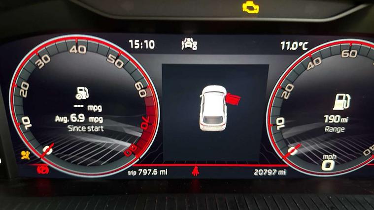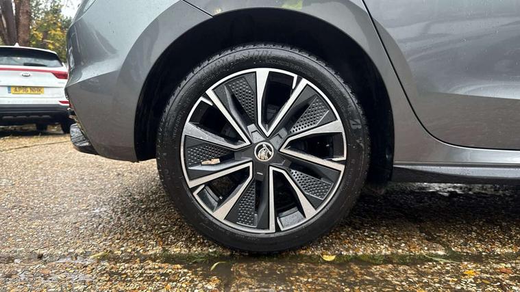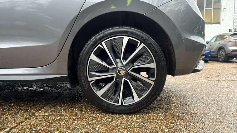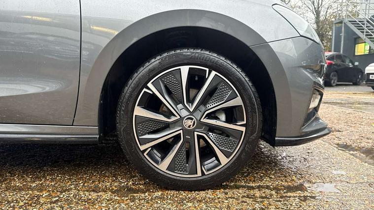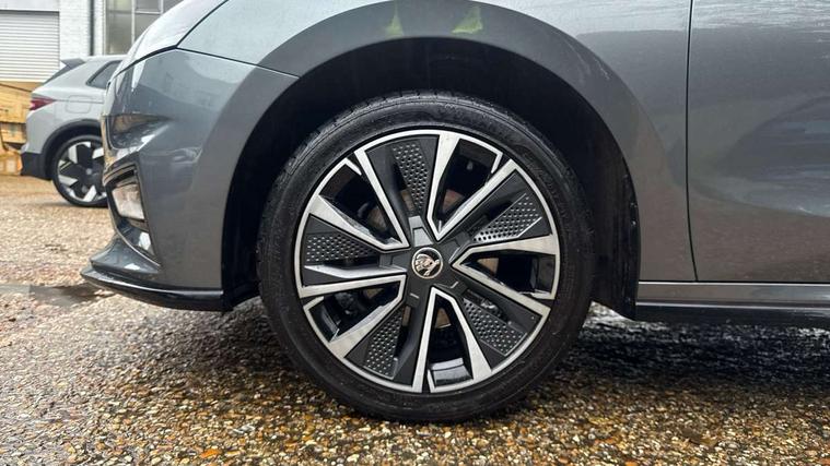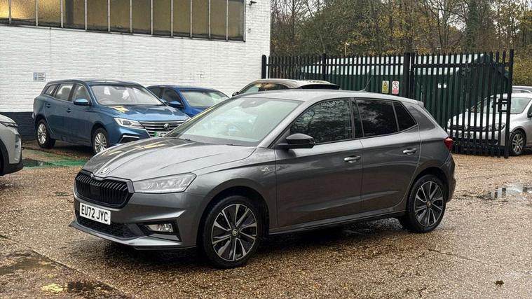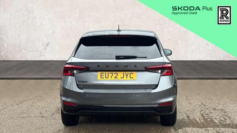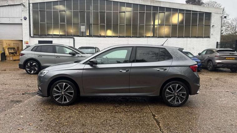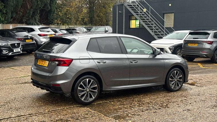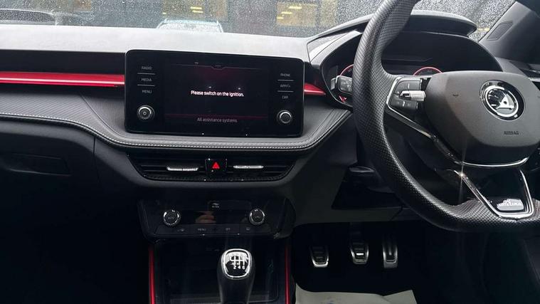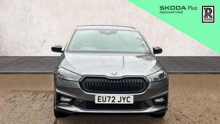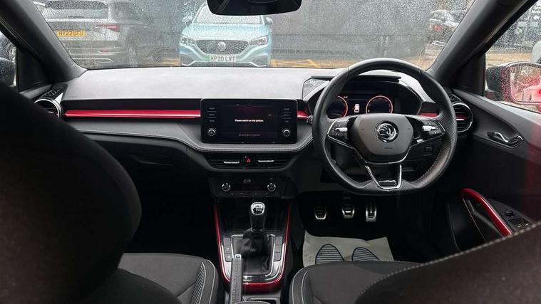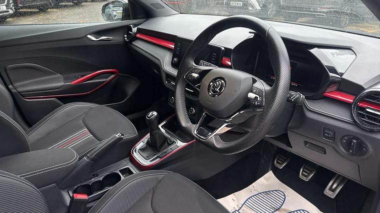 Carbon effect door and side trim panels, Carbon effect lower decorative trim with white stitching, Red metallic upper decorative trim, Ambient lighting pack 2 - Fabia Hatchback, Anti-theft wheel bolts protection, Super-low rolling resistance tyres, Anti-theft alarm system including immobiliser, interior monitoring, backup horn, and towing protection, 2x USB-C in the front (for data transmission and charging), 6 Speakers (4 in front and 2 in rear), Auxiliary socket for external MP3 player, Bolero radio with 8" colour display, DAB digital radio reception, 3-point height adjustable front seats belts with pretensioner and force limiter, Automatic warning lights in case of crash, Driver and passengers airbag with switch off function, e-Call+, ESC including ABS, MSR, ASR, EDS, HBA and XDS, Front and rear seat belt warning, FRONT ASSIST (AEB City and AEB Inter Urban), Front side airbags, Head airbags, One tone horn, Pedestrian protection, Three rear 3-points safety seat belts with pretensioner and force limiter including stop function for outer rear seat belts, Tyre pressure monitoring system, Auto dimming rear view mirror, Basic rear light, Black radiator grille, Body coloured bumpers, Door mirror integrated indicators, Electrically adjustable and heated door mirrors, Front and rear electric windows, Front window wiper intermittent control, Headlight range control - Automatic, Ice scraper in fuel cap, LED daytime running lights with coming and leaving home feature, Monte Carlo badging, Privacy glass, Rear LED fog light, Rear side wing doors, Rear window wiper with washing nozzles, Roof mounted spoiler, SKODA tailgate lettering in black, Sports bumpers, Third brake light, 3 rear headrests, Aluminium pedals, Backrest split and folding, Black headlining, Central console with removable cup holder and storage box, Chrome handbrake release button, Fabric/artificial leather upholstery, Front sports seats, Gearshift knob/handle in leather, Hand brake lever handle in leather, Height adjustable front headrests, Height adjustable steering wheel, ISOFIX and TopTether anchorage points to the outer rear seats, ISOFIX and TopTether on the front passenger seat, Luggage compartment lighting, Metallic painted red central console cover, Metallic red interior door handles, Monte Carlo door sills, Pollen filter, Rear seat bench unsplit, Single front passenger seat, Sun visors with mirror and airbag label on passenger side, Textile floor mats, Ticket holder, Umbrella in drivers door, Bluetooth connection, Driver alert system - DAS, Electromechanical power steering, Exterior temperature gauge, Service interval indicator,