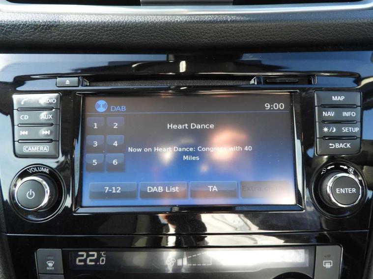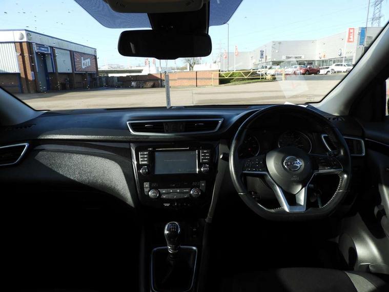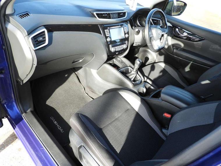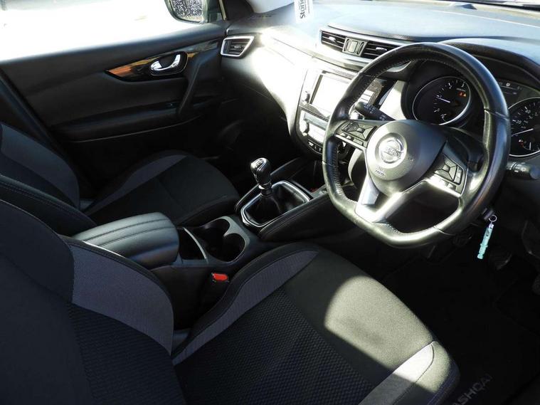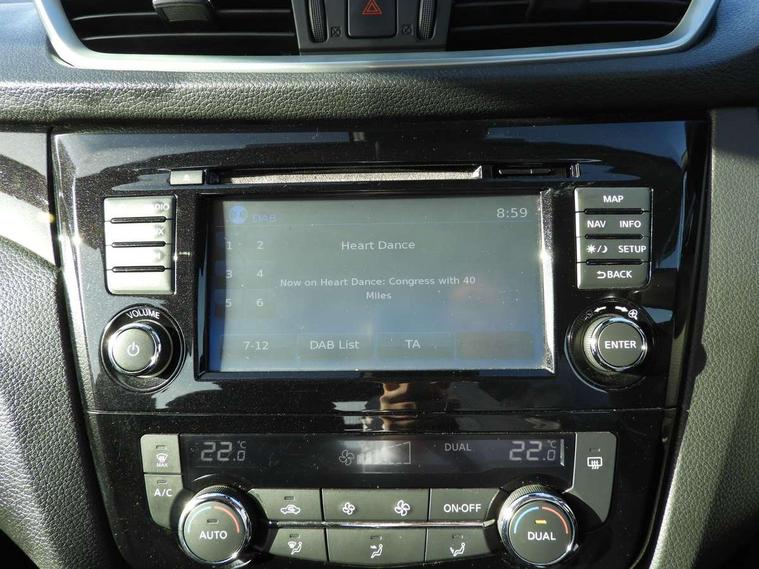 Piano black dash trim, 17" alloy wheels, Tyre puncture repair kit, Anti-theft immobiliser, Remote central locking, Thatcham Cat.1 alarm, 6 speakers, AM/FM radio, CD audio system, Aux-in socket, DAB Digital radio, Steering wheel mounted audio controls, USB port, 6 airbags - Driver, front passenger, curtain and side airbags, ABS, ESP, EBD and brake assist, Auto hold function, Child locks on rear doors, Electronic parking brake, Front and rear seat belt warning, Front passenger airbag deactivation, Height adjustable front seatbelts, Hill start assist, Intelligent emergency braking with pedestrian recognition, Three 3 point rear seatbelts, Tyre pressure monitoring system, Anti dazzle rear view mirror, Auto wipers, Body colour bumpers, Body coloured door handles, Body coloured door mirrors, Chrome window surround, Daytime running lights dip function when turn signal applied, Electric folding door mirrors, Electric front and rear windows with one touch illuminated window controls, Electric front/rear windows, Electrically adjustable door mirrors, Front fog lights, Halogen headlights, Heated door mirrors, High beam assist, Intelligent auto headlights, LED indicators in door mirrors, Rear roof spoiler, Rear wiper with reverse link, Shark fin antenna, Signature LED daytime running lights, Underbody vortex generators, 2 X front 12v power sockets, 3 height adjustable rear headrests, 60/40 split folding rear seat, Ambient lighting in centre console, Boot lighting, Centre console storage box/armrest, Chrome interior door handles, Cloth upholstery, Configurable luggage board system, Driver's seat manual height adjust, Dual zone climate control, Front and rear door pockets with bottle holders, Front and rear seat belt pre-tensioners with load limiters, Height adjustable front headrests, ISOFIX on outer rear seats, Leather D shaped steering wheel, Leather gear lever, Leather knee pad, Manual height adjustable front passenger seat, Manual lumbar support on driver seat, Manual lumbar support on passenger seat, Parcel shelf stow function under luggage board, Pollen filter, Rear armrest with 2 cupholders, Tilt/telescopic adjustable steering wheel, Advanced drive assist display 5'' TFT coloured screen, Android Auto, Apple CarPlay preparation, Bluetooth connectivity, Cruise control + speed limiter, Electric speed sensitive power steering, Front parking sensors, Lane departure warning system, Nissan connect evo 7" touchscreen navigation and entertainment system, Normal or sport selectable steering, Outside temperature sensor, Rear parking sensors, Rear view camera, Service interval indicator, Smartphone integration, Stop/start system, Tomtom connected services, Traffic sign recognition, Trip computer, Voice control system, Diesel particulate filter, Nissan chassis control (intelligent ride control, intelligent trace control, intelligent engine brake),