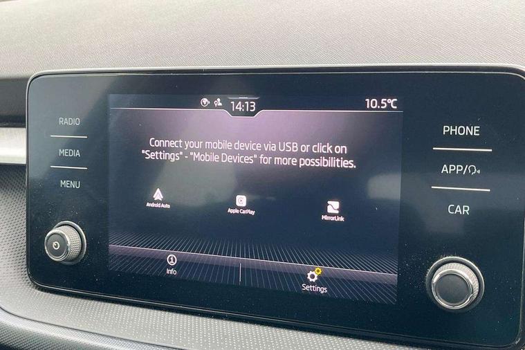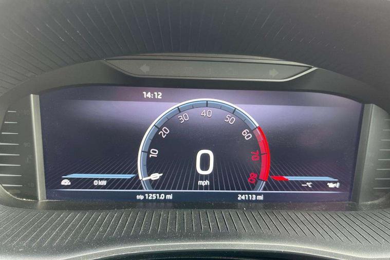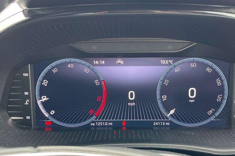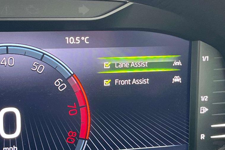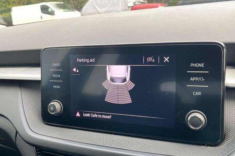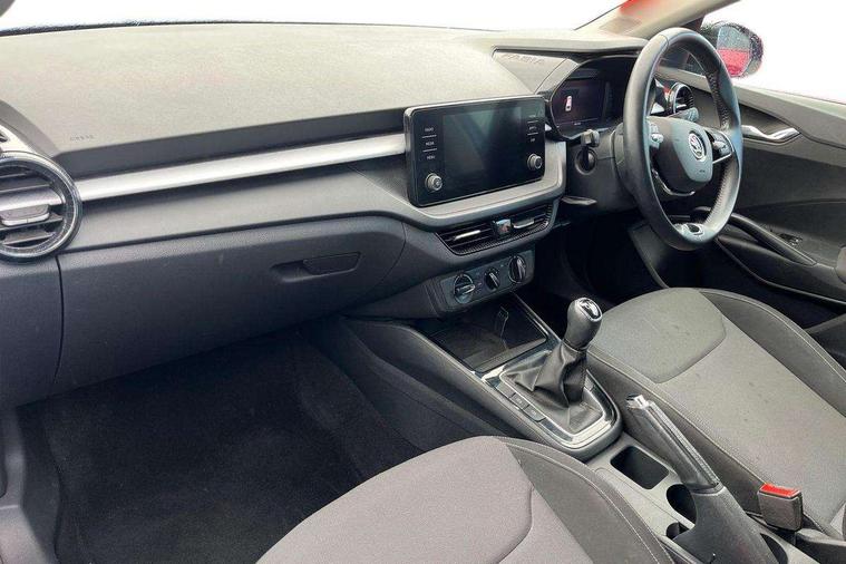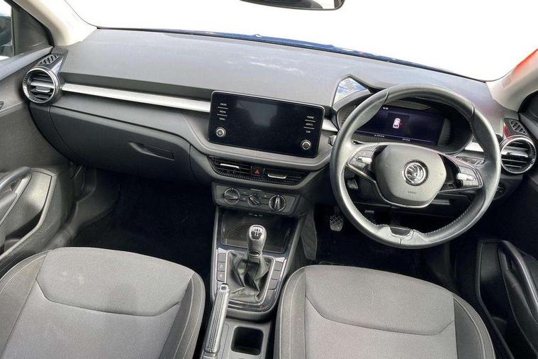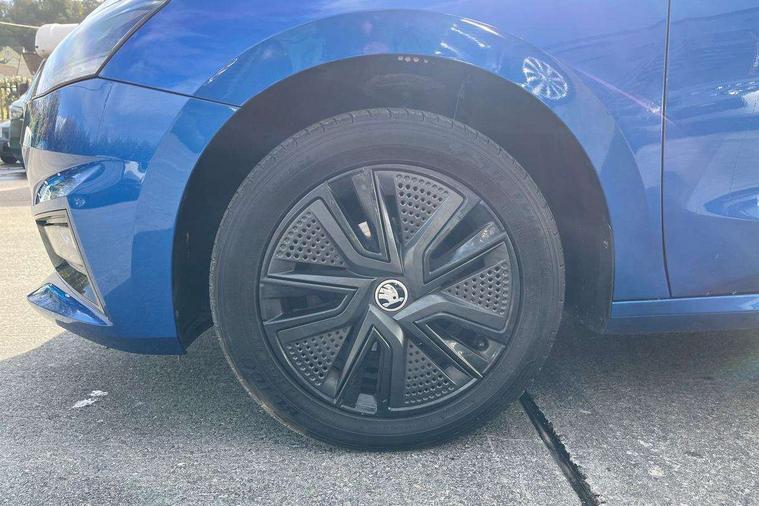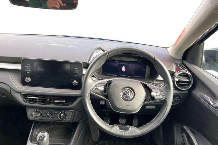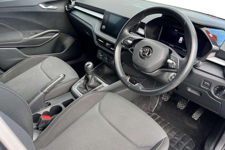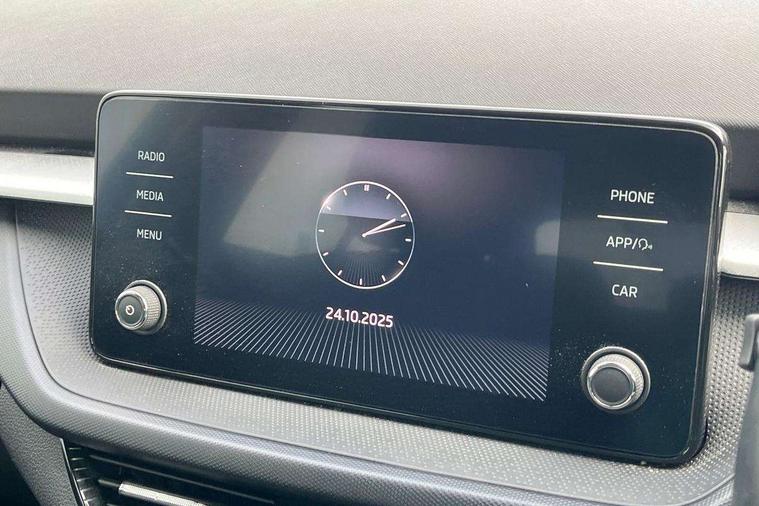 Anodized cross line upper decorative trim, Colour Edition air vents, Grain satin black central console cover, Grain satin black lower decorative trim, Satin black door and side trim panel in front, Anti-theft wheel bolts protection, Super-low rolling resistance tyres, Anti-theft alarm system including immobiliser, interior monitoring, backup horn, and towing protection, 2x USB-C in the front (for data transmission and charging), 6 Speakers (4 in front and 2 in rear), Auxiliary socket for external MP3 player, Bolero radio with 8" colour display, DAB digital radio reception, 3-point height adjustable front seats belts with pretensioner and force limiter, Automatic warning lights in case of crash, Driver and passengers airbag with switch off function, e-Call+, ESC including ABS, MSR, ASR, EDS, HBA and XDS, Front and rear seat belt warning, FRONT ASSIST (AEB City and AEB Inter Urban), Front side airbags, Head airbags, One tone horn, Pedestrian protection, Three rear 3-points safety seat belts with pretensioner and force limiter including stop function for outer rear seat belts, Tyre pressure monitoring system, Basic rear light, Body coloured bumpers, Dimming rear view mirror with black frame, Door mirror integrated indicators, Electrically adjustable and heated door mirrors, Electrically adjustable front windows with function auto up/down, Front window wiper intermittent control, Headlight range control - Automatic, Ice scraper in fuel cap, LED daytime running lights with coming and leaving home feature, Mechanical adjustable rear windows, Privacy glass, Rear LED fog light, Rear side wing doors, Rear window wiper with washing nozzles, Roof mounted spoiler, SKODA tailgate lettering in chrome, Third brake light, 3 rear headrests, Backrest split and folding, Central console with fixed cup holder and storage box, Chrome handbrake release button, Fabric upholstery, Gearshift knob/handle in leather, Grain satin black interior door handles, Hand brake lever handle in leather, Height adjustable front headrests, Height adjustable steering wheel, ISOFIX and TopTether anchorage points to the outer rear seats, ISOFIX and TopTether on the front passenger seat, Luggage compartment lighting, Pollen filter, Rear seat bench unsplit, Single front passenger seat, Storm grey headlining, Sun visors with mirror and airbag label on passenger side, Ticket holder, Umbrella in drivers door, Bluetooth connection, Driver alert system - DAS, Electromechanical power steering, Exterior temperature gauge, Lane assist including road edge detection, Service interval indicator, Virtual cockpit with 10.25" colour display,