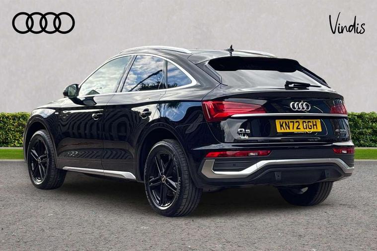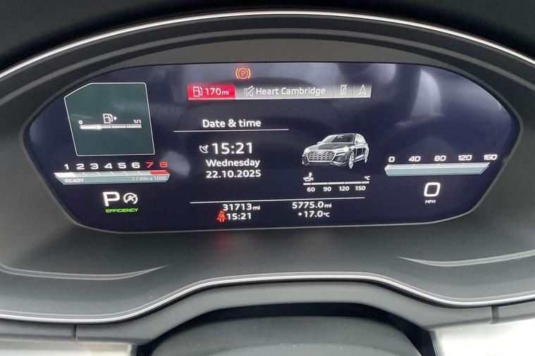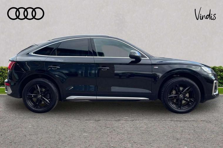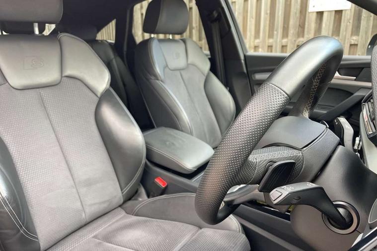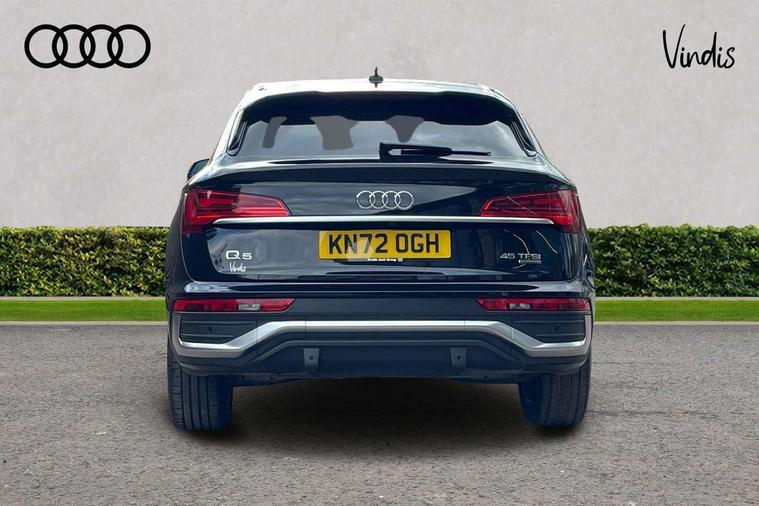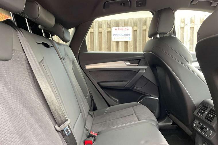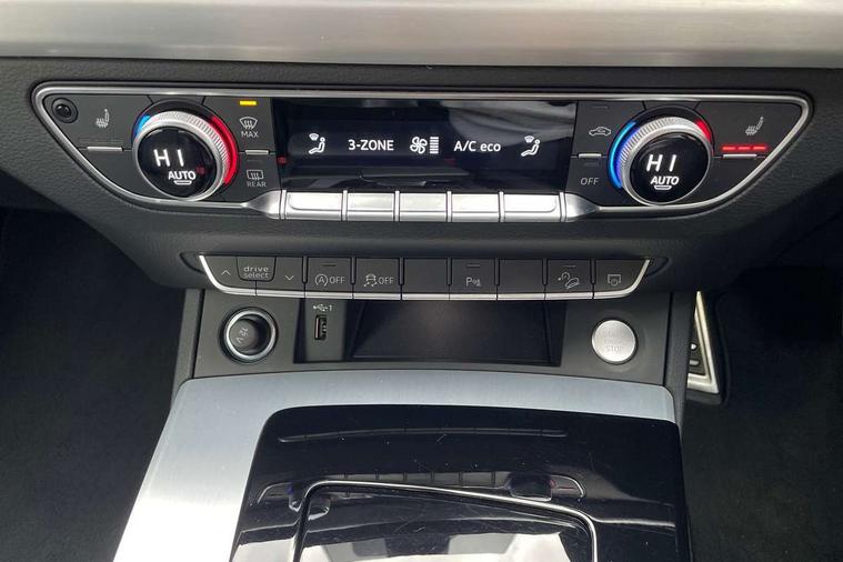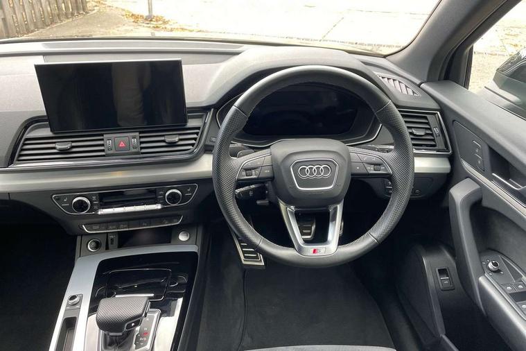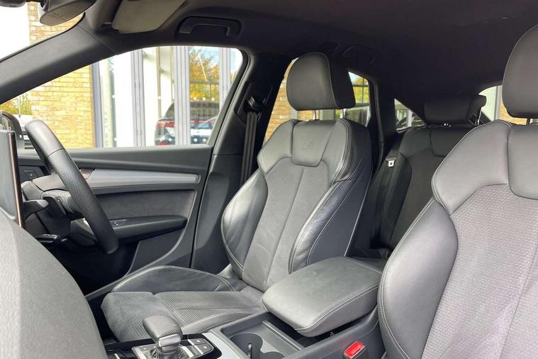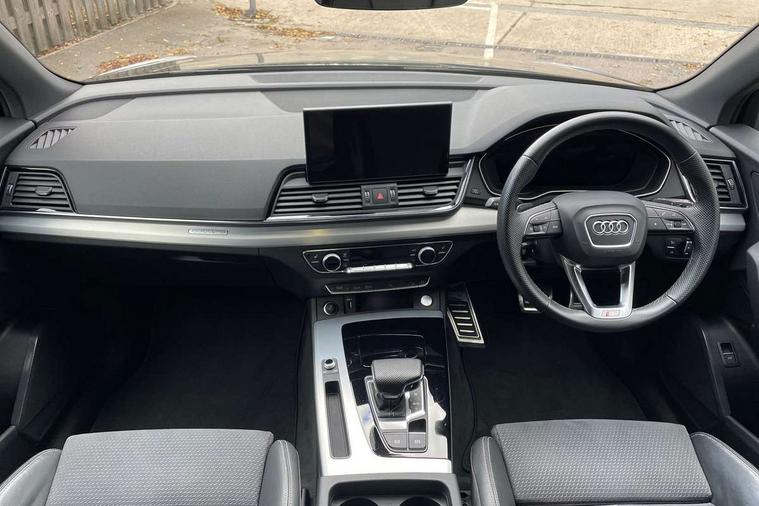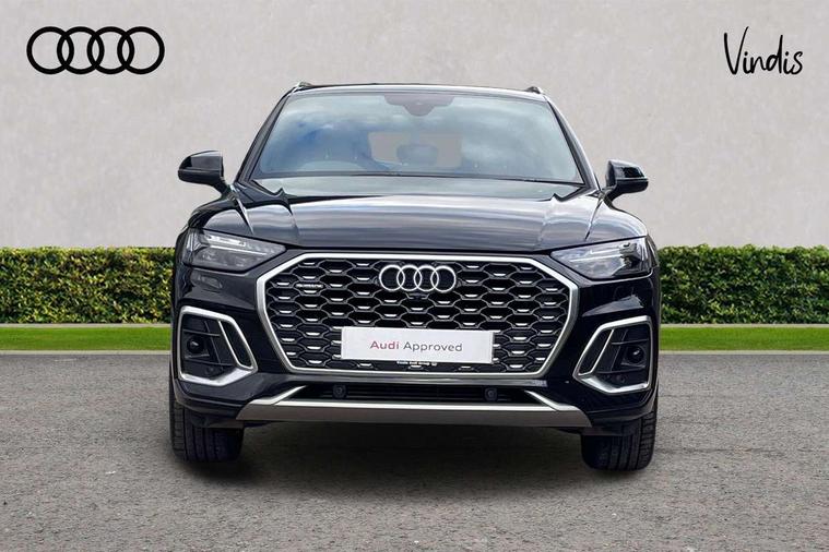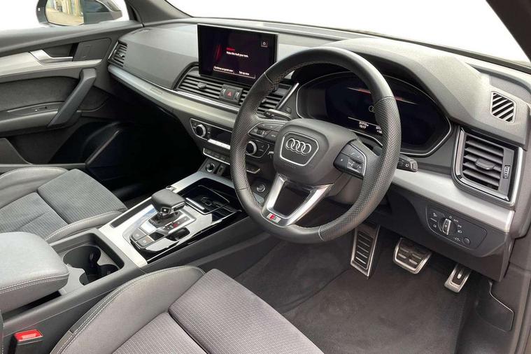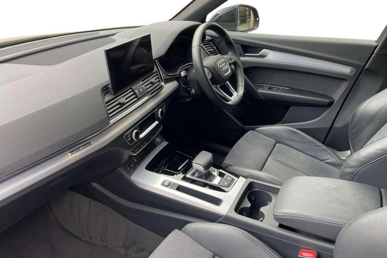 Matt brushed aluminium inlays, High gloss pack - Q5, LED interior light pack - Q5, Anti theft alarm, Anti-theft wheel bolts, Keyless Go access/ignition system, Remote central locking, DAB Digital radio, 3 point seatbelts on all seats, 6 airbags - Driver, front passenger, curtain and side airbags, Electrically operated child locks on rear doors, Electromechanical parking brake, Electronic stabilisation control including ABS, ASR and EDL, Front passenger airbag deactivation, Hill descent control, Hill hold assist, Multi collision brake assist, Pop-up bonnet for pedestrian protection, Pre sense city, Seat belt force limiter, Seatbelt monitoring, Tyre pressure warning, Warning triangle and first aid kit, Acoustic windscreen, Aluminium roof rails, Audi matrix LED headlights with dynamic front and rear indicators, Auto dimming door mirrors, Auto dimming rear view mirror, Automatic headlight adjustment, Automatic headlights and windscreen wipers, Body colour door mirrors, Body colour rear diffuser with matt aluminium silver surrounds, Body colour underbody protection, Chrome plated exhaust trims, Daytime running lights, Door sills in Selenite silver, Electric adjustable/heated/folding door mirrors, Front air inlet surrounds in aluminium, Front and rear electric windows, Front radiator grille in honeycomb design, Headlight washers, High level LED brake light, Lower bumpers painted in contrast Manhattan grey, Rear chrome trim strip below lights, Rear privacy glass and rear side windows, Rear side wing doors, Rear wiper, Roof bars, S Line badges on the front wings, S Line front and rear bumpers, S Line rear spoiler, S Line side skirts, 2 x USB charging port with aux input socket, 3 rear headrests, 40:20:40 split folding 3 rear bench seat in 2nd row with rear centre armrest, Black cloth headlining, Comfort front centre armrest, Contrast stitching on seats, steering wheel and gear lever gaiter, Deluxe 3 zone electronic climate control, Front head restraints, Front/rear floor mats, Gear lever in black leather, Heated front seats, Height/reach adjustable steering column, Illuminated door sill trims with S logo, ISOFIX child seat mounting and top tether, Manual seat adjustment with 4-way electric lumbar support, Removable luggage compartment floor, Single front passenger seat, Stainless steel pedals, Sunvisors with vanity mirrors, Trunk roller cover, Audi connect safety and service (e-call), Audi connect with Amazon Alexa Integration, Audi drive select, Audi virtual cockpit plus with 12.3" screen and three different layout designs, Audi wireless smartphone interface, Automatic start-stop system with coasting functionality and efficiency programme, Bluetooth interface, Electro - mechanical power assisted steering, MMI navigation plus with 10.1" touch screen, Power tailgate, Reversing camera, Service interval indicator, Voice control system with Audi hotword activation "Hey Audi", Quattro on demand, S line sports suspension,