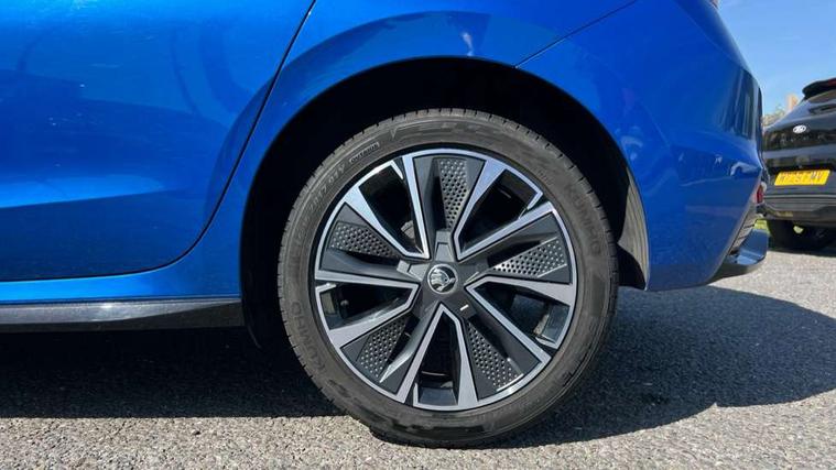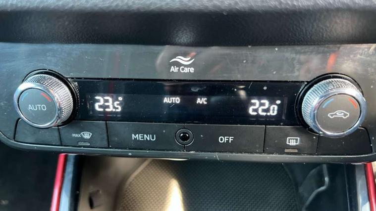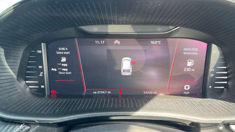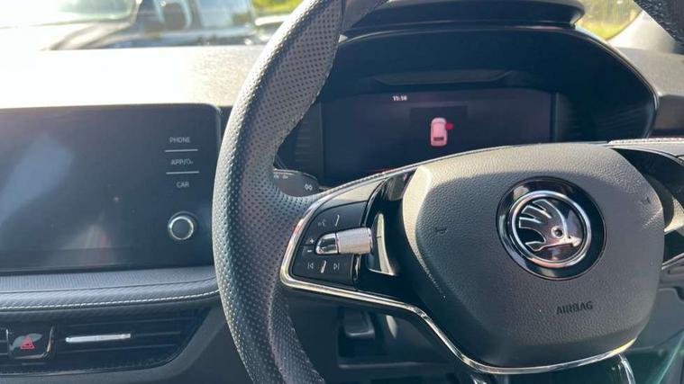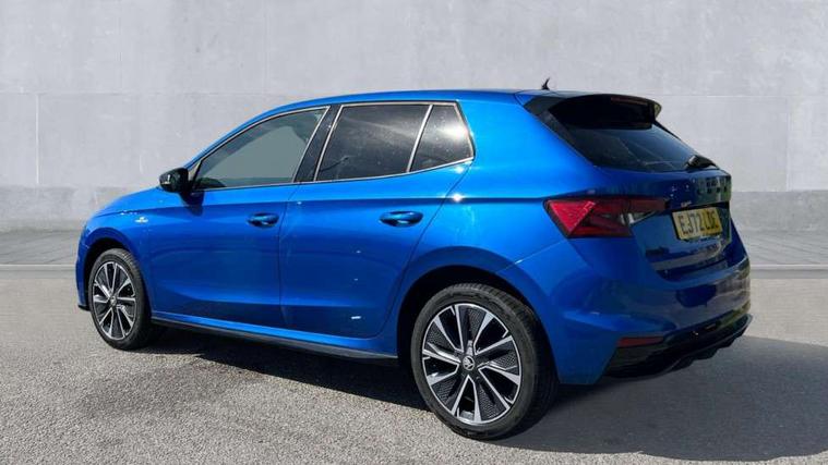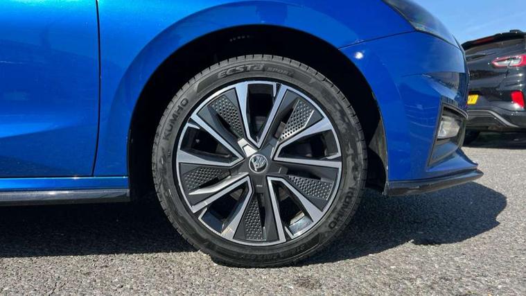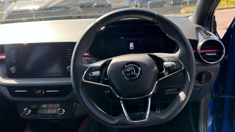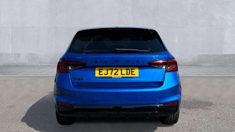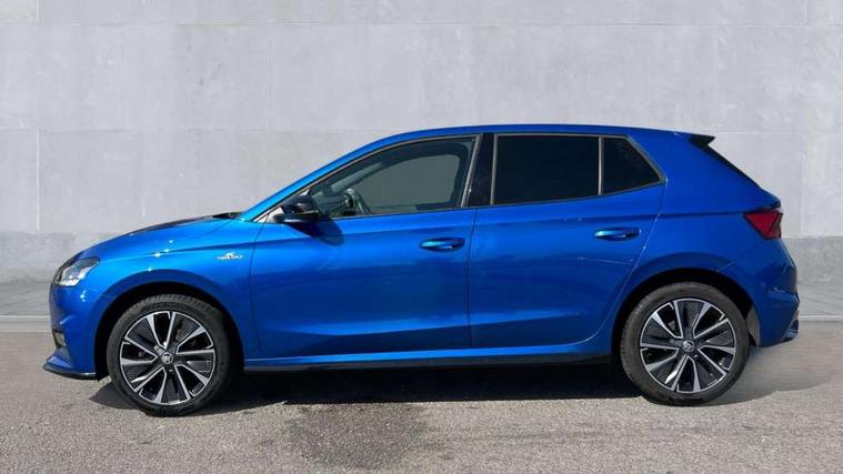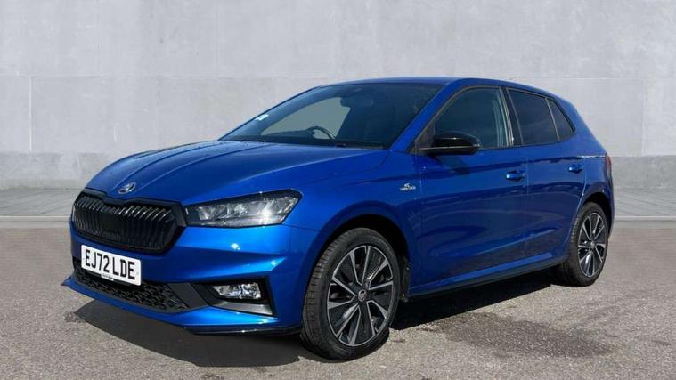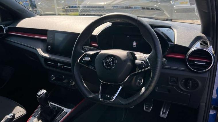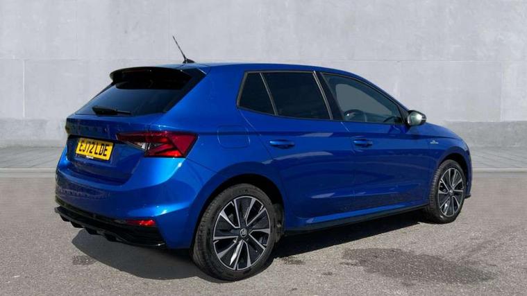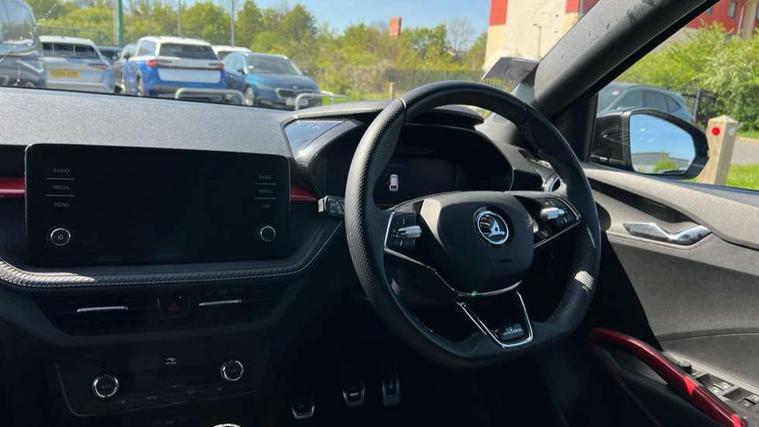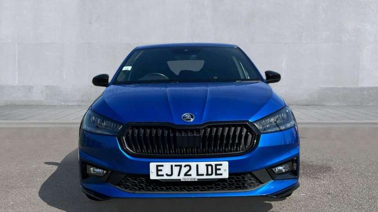 Carbon effect door and side trim panels, Carbon effect lower decorative trim with white stitching, Red metallic upper decorative trim, Ambient lighting pack 2 - Fabia Hatchback, Anti-theft wheel bolts protection, Super-low rolling resistance tyres, Anti-theft alarm system including immobiliser, interior monitoring, backup horn, and towing protection, 2x USB-C in the front (for data transmission and charging), 6 Speakers (4 in front and 2 in rear), Auxiliary socket for external MP3 player, Bolero radio with 8" colour display, DAB digital radio reception, 3-point height adjustable front seats belts with pretensioner and force limiter, Automatic warning lights in case of crash, Driver and passengers airbag with switch off function, e-Call+, ESC including ABS, MSR, ASR, EDS, HBA and XDS, Front and rear seat belt warning, FRONT ASSIST (AEB City and AEB Inter Urban), Front side airbags, Head airbags, One tone horn, Pedestrian protection, Three rear 3-points safety seat belts with pretensioner and force limiter including stop function for outer rear seat belts, Tyre pressure monitoring system, Auto dimming rear view mirror, Basic rear light, Black radiator grille, Body coloured bumpers, Door mirror integrated indicators, Electrically adjustable and heated door mirrors, Front and rear electric windows, Front window wiper intermittent control, Headlight range control - Automatic, Ice scraper in fuel cap, LED daytime running lights with coming and leaving home feature, Monte Carlo badging, Privacy glass, Rear LED fog light, Rear side wing doors, Rear window wiper with washing nozzles, Roof mounted spoiler, SKODA tailgate lettering in black, Sports bumpers, Third brake light, 3 rear headrests, Aluminium pedals, Backrest split and folding, Black headlining, Central console with removable cup holder and storage box, Chrome handbrake release button, Fabric/artificial leather upholstery, Front sports seats, Gearshift knob/handle in leather, Hand brake lever handle in leather, Height adjustable front headrests, Height adjustable steering wheel, ISOFIX and TopTether anchorage points to the outer rear seats, ISOFIX and TopTether on the front passenger seat, Luggage compartment lighting, Metallic painted red central console cover, Metallic red interior door handles, Monte Carlo door sills, Pollen filter, Rear seat bench unsplit, Single front passenger seat, Sun visors with mirror and airbag label on passenger side, Textile floor mats, Ticket holder, Umbrella in drivers door, Bluetooth connection, Driver alert system - DAS, Electromechanical power steering, Exterior temperature gauge, Service interval indicator,