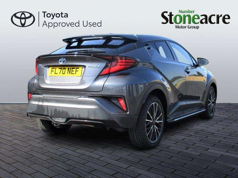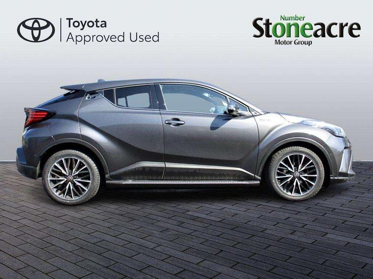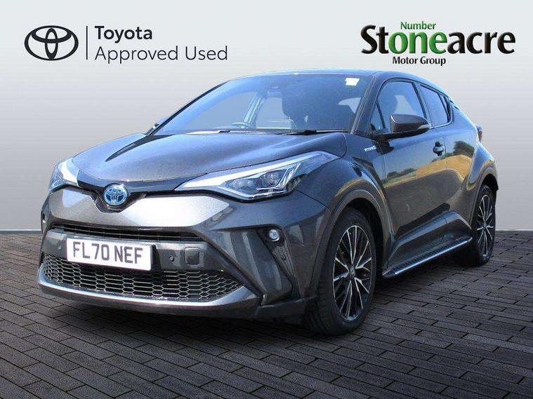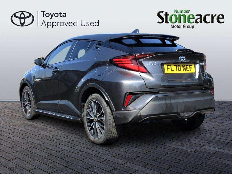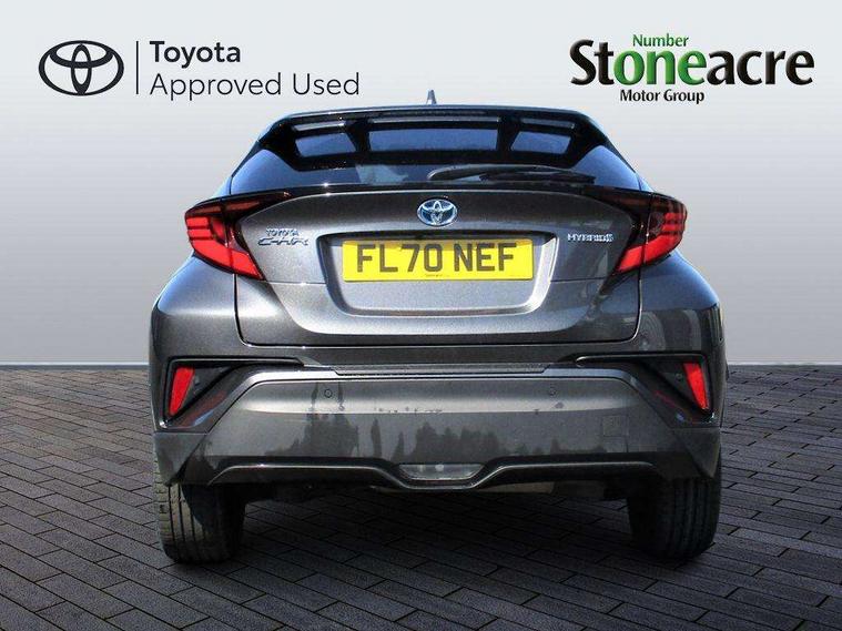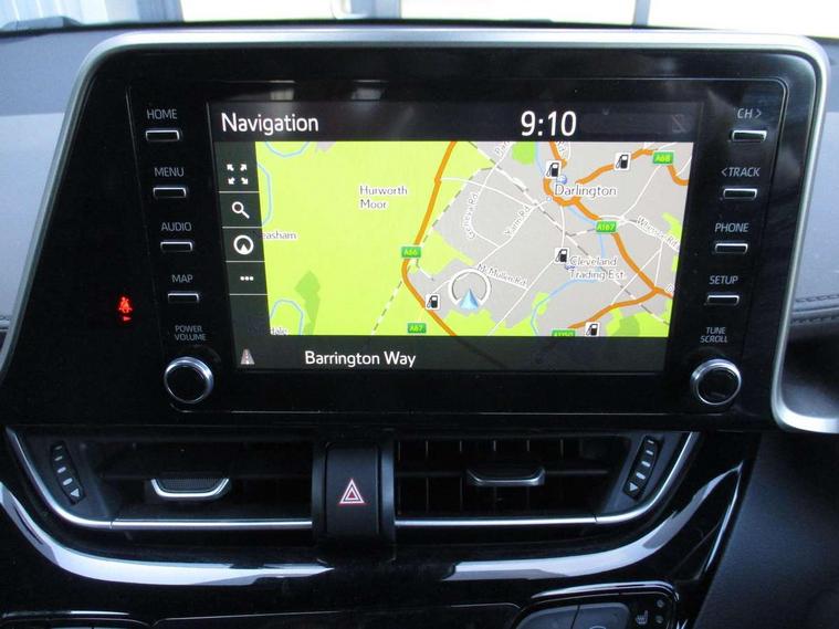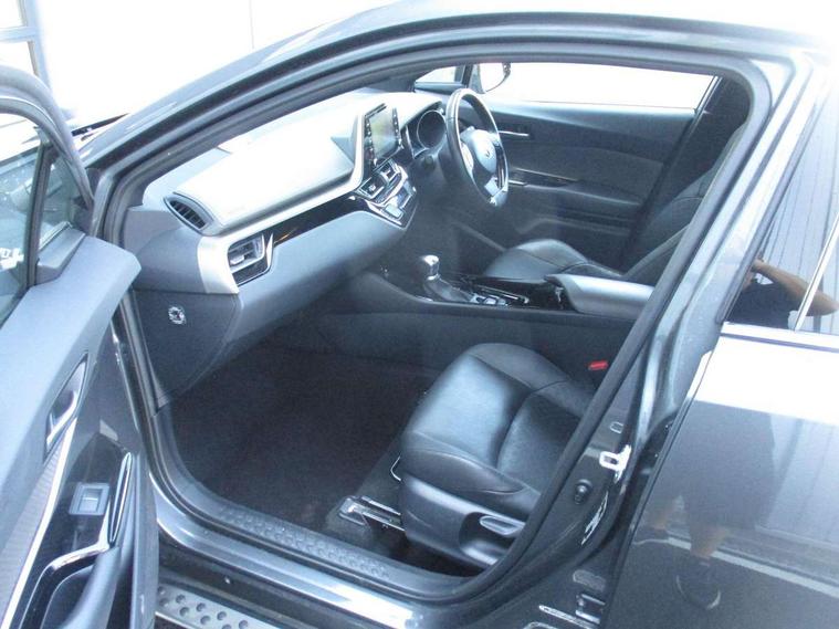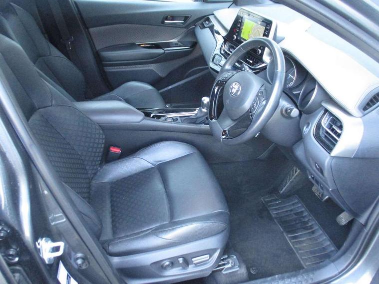 Black lower dashboard, Black lower driver dashboard, Dark brown upper dashboard, Piano black console, Silver deco line on upper dashboard, Leather pack - C-HR, Tech with parking sensor pack - C-HR, Tyre repair kit, Glass-breaking alarm sensors, Immobiliser, Intrusion alarm, Intrusion sensor, Motion sensor alarm, Power door locks, Power passenger window lock, Remote central locking, Remote door lock, 6 speakers, Aux connectors + 12V front outlet, DAB Radio (Digital Audio Broadcasting), Toyota touch 2 multimedia system with 8" display, USB connector integrated with radio and CD player, Wi-fi connectivity, 16 Disk front wheel brake, 3x3 point rear seatbelts, ABS+EBD+Brake assist, Electronic parking brake, ESP + traction control, Front and rear seatbelt reminder, Front passenger airbag on/off switch, Hill start assist control (HAC), Pre collision system with pedestrian detection, Pre-tensioners and force limiters, Rear door child safety locks, SRS Airbags - Driver + Front passenger, front side, front and rear curtain and driver's knee airbags, Toyota safety sense, Tyre pressure monitoring system, Adaptive front light system, Adaptive LED Headlights, Anti-jam protection on power windows, Auto high beam, Auto up and down function on all power windows, Automatic headlight levelling, Automatic headlights, Automatic headlights cut-off, Black and body coloured rear bumper, Black front bumper, Black upper front grille, Body colour door handles, Body colour door mirrors, Boot door release with push button, Electric heated door mirrors, Follow me home headlights, Front and rear power windows, Front spoiler, Hard tonneau cover, Honeycomb lower front grille, LED daytime running lights, LED fog lights, LED front light guide, LED High mounted stop light, LED rear brake lights, LED rear combination lights, Noise reduction layer on front windows and windscreen, Power adjustable door mirrors, Privacy glass, Rear spoiler, Rear tailgate, Rear window defogger, Rear window wiper, Shark fin antenna, UV-filter on driver and passenger windows, UV-filter on rear windows, 12v power outlet - front, 3 rear headrests, 3 spoke leather steering wheel, 60/40 split folding rear seat, Adjustable rear headrests, Adjustable speed limiter switch on steering wheel, Assist grips front and centre pillar, Audio and telephone switches on steering wheel, Black front door assist grips, Blue ambient lighting on front cup holders, Blue ambient lighting on front doors, Boot light, Chrome interior door handles, Driver and front passenger personal light, Driver and front passenger Whiplash Injury Lessening seats, Driver and passenger seatback pockets, Dual zone automatic air conditioning, Front cupholders, Front head restraints, Front sports seats, Glovebox with internal light, Heated driver and front passenger seats, Heated steering wheel, Hooks for luggage holding net, Humidifying Nanoe air purifier, Illuminated entry system, Isofix attachments on rear seats, Leather gearshift, Light on driver sun visor, Light on passenger sun visor, Manual telescopic steering wheel, Manual tilt steering wheel, Microphone on front personal light, Mirror on driver sun visor, Mirror on passenger sun visor, Multimedia switches on steering wheel, Pollen filter, Power adjustable lumbar support on driver seat, Power tilting cushion on driver seat, Shopping bag hooks, Slow opening on lower glovebox, Voice recognition switch on steering wheel, 4.2" coloured TFT screen for multi-information display, Adaptive cruise control, Bluetooth connectivity, Electric power steering, Hybrid system indicator, Lane departure alert with steering control, Remote boot door release in cabin, Remote boot door release in key, Reversing camera, Road sign assist - RSA, Simple Intelligent parking assist, Touch 2 Go navigation system, Trip computer, Voice recognition, Vehicle Stability Control (VSC),