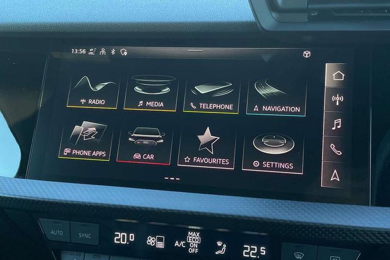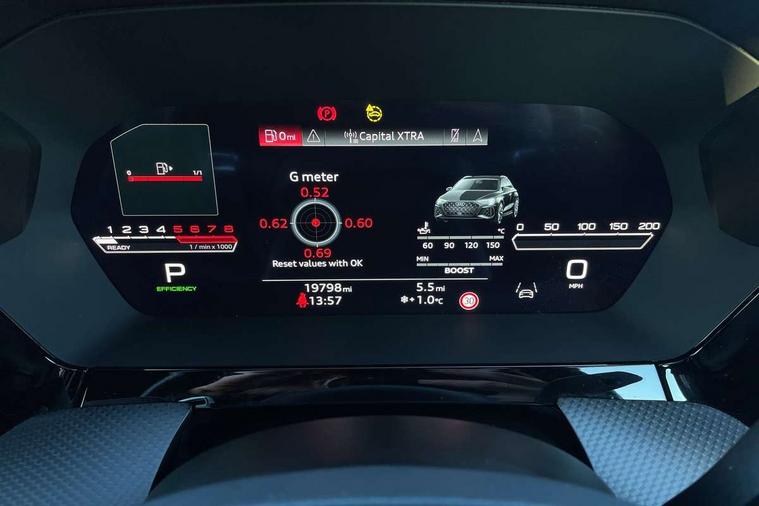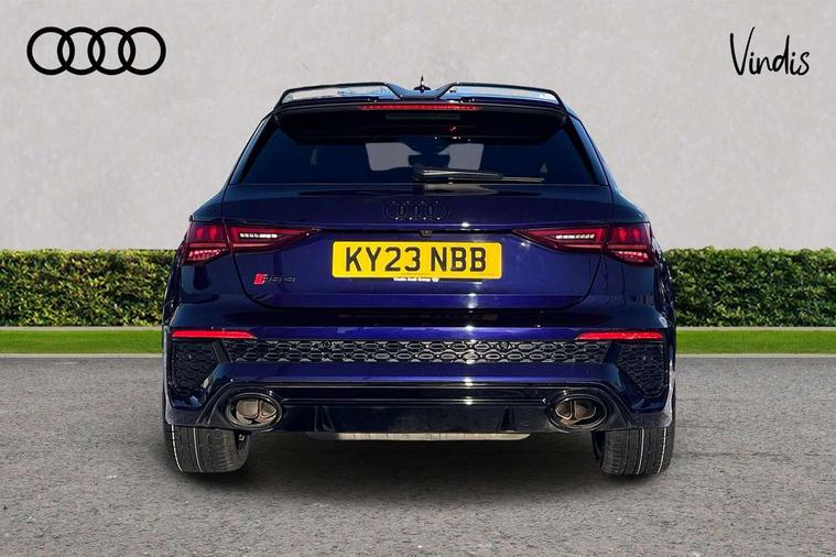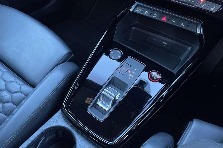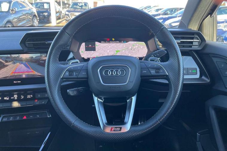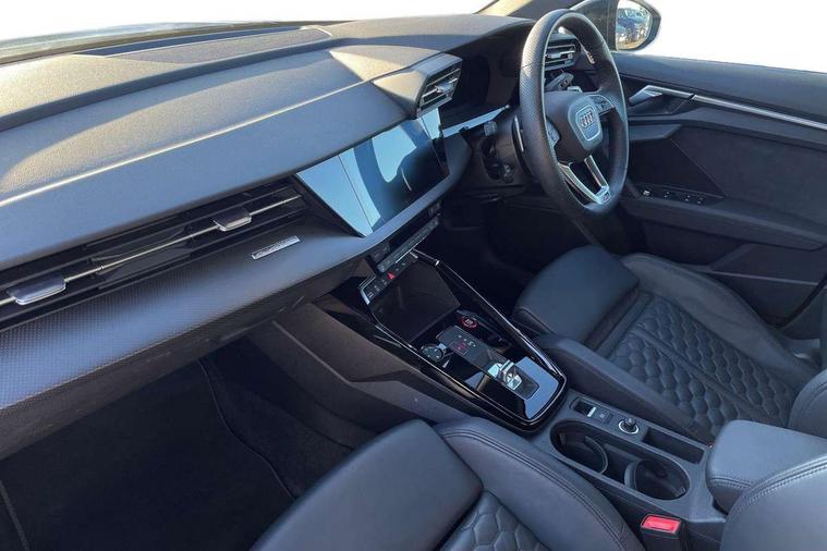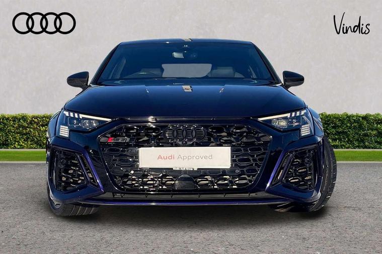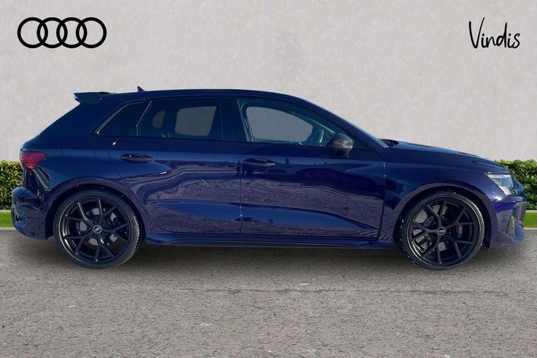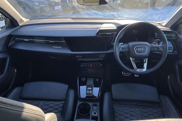 Carbon inlays, accent surfaces in the dashboard and centre console in platinum grey silk effect paint finish, Full decorative carbon trim, Aluminium interior elements pack - RS3, Ambient lighting pack - RS3, MMI navigation plus with MMI touch - RS3, RS bodystyling - RS3, Storage Pack - RS3, 19" 5 Y spoke matt black alloy wheels, Tyre repair kit, Anti theft alarm, Anti-theft wheel bolts, Electronically operated child lock, Remote control central locking, DAB Digital radio, 3x3 point rear seat belts, ABS/EBD, ASR, Audi pre sense front, Driver/Front Passenger airbags, EDL, ESC - Electronic Stability Control + traction control, Front passenger airbag deactivation, Front side airbags with head airbags and interaction airbag, Hill hold assist, Seat belt reminder with passenger presence detection in rear, Tyre pressure loss indicator, Warning triangle and first aid kit, 3rd brake light, Acoustic glass windscreen, Audi beam uses LEDs to project the Audi sport logo onto the ground as you exit your RS 3, Audi matrix LED headlights, LED rear lights, dynamic front and rear indicators and headlight cleaning system, Auto dimming rear view mirror, Body colour roof, Carbon exterior door mirror, Carbon fibre engine cover, Carbon roof spoiler, Daytime running lights, Door mirrors - electrically adjustable, heated, folding and auto dimming on both sides, Headlight washers, Light and rain sensors, Privacy glass - dark tinted rear and rear side windows from B-pillar backwards, Rear side wing doors, Rear window wiper and washer system, RS exterior features in gloss black, RS sports exhaust system, Side skirt in carbon inlay, 3 seat bench in 2nd row, 40/20/40 split folding rear seat bench, Black cloth headlining, Dual zone electronic climate control, Front and rear headrests, Front centre armrest, Front sports seats RS embossed logo, Front/rear floor mats, Heated front seats, Honeycomb stitching and RS embossing, Illuminated door sill trims inlays in aluminium with RS 3 logo, Illuminated vanity mirror, Manually adjustable front seats, RS emblems, Single front passenger seat, Stainless steel pedals and front footrest in black, Tool kit, Audi smartphone interface, Audi virtual cockpit with RS specific display 12.3" full colour digital instrument cluster, Automatic start/stop system with recuperation, Bluetooth interface, Collision avoidance assistant, Emergency e-call, Lane departure warning system, Legal emergency call, Manual boot opening, Parking assist with parking system plus, Progressive power assisted steering, Quattro permanent four wheel drive, Rear suspension,