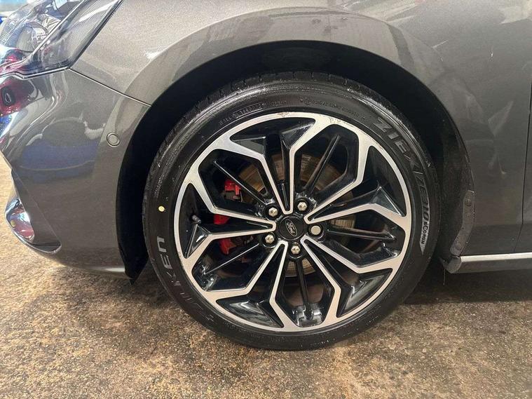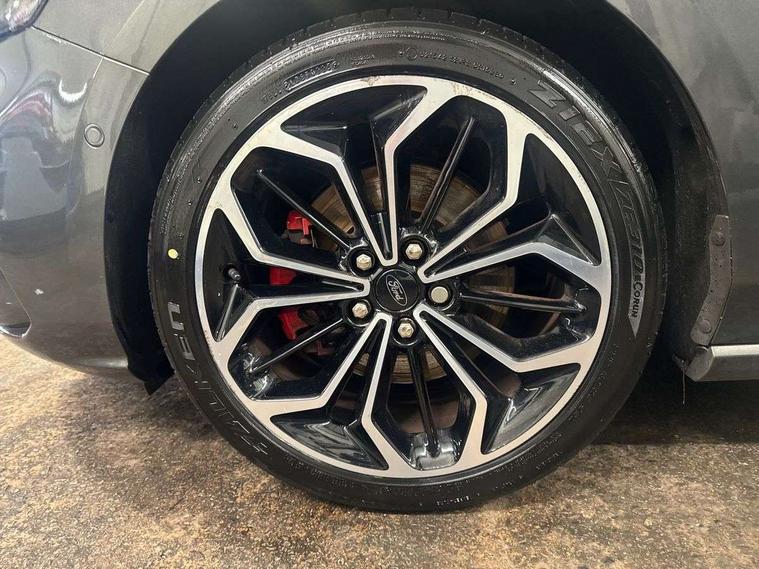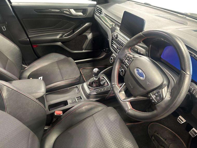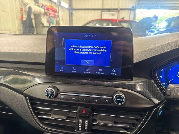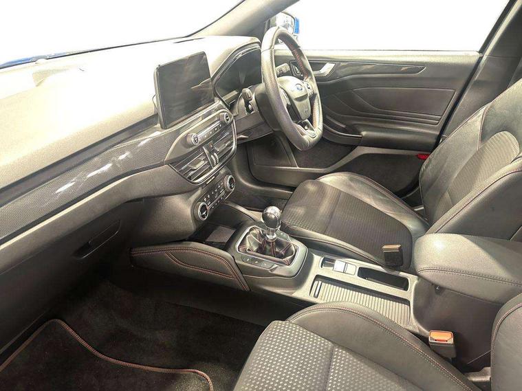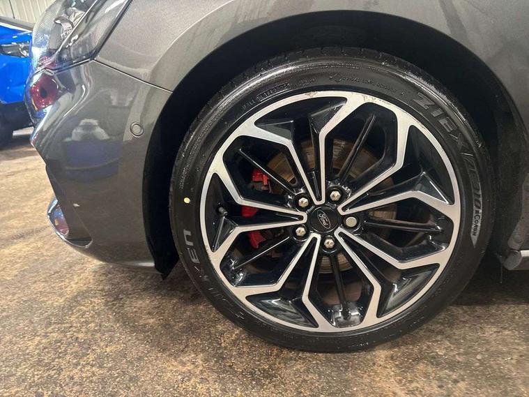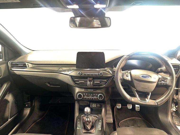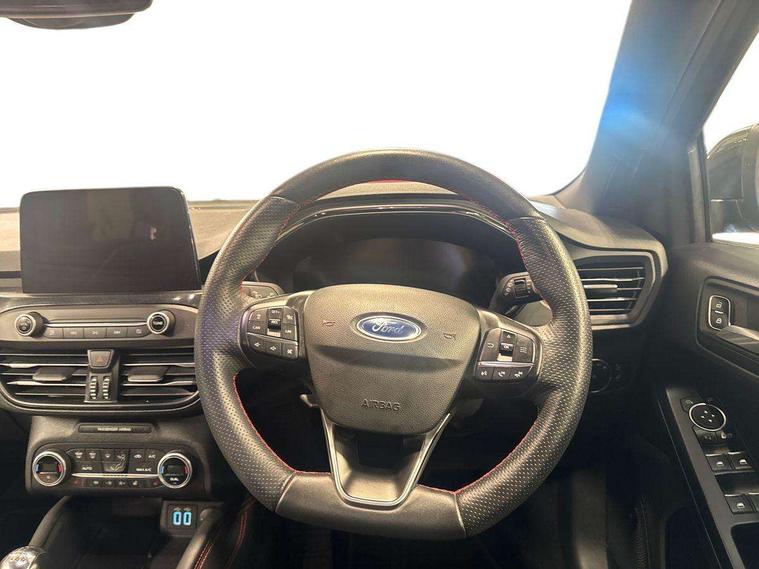 18" 5x2 spoke gloss black machined finish alloy wheels, Mini steel spare wheel, Ford keyfree system with Keyless entry and keyless start/sleep mode key fob, MyKey system, Remote central locking & engine immobiliser, Thatcham category 1 alarm, 2 USB ports, Aux input, 3x3 point rear seatbelts, ABS+Electronic Brake force Distribution, Auto hold function, Driver airbag, Electronic parking brake, Electronic stability control, Front and rear seatbelt reminder, Front inertia reel height adjustable seatbelts with pre-tensioners, Front passenger airbag, Front side airbags, Hill start assist, Passenger airbag deactivate switch, Post collision braking, Power child locks on rear doors, Pre collision assist with autonomous emergency braking and pedestrian/cyclist detection, Side curtain airbags, Three rear inertia reel lap/diagonal seatbelts, Tyre pressure monitoring system, Auto dimming rear view mirror, Auto headlamps (on/off), Automatic rain sensing wipers, Body colour large rear spoiler, Body coloured bumpers, Body coloured door handles, Body coloured electrically operated and heated door mirrors with side indicators, Electrically operated front and rear windows with one touch opening and closing, Front variable intermittent wipers with electric wash, Heated rear window, LED daytime running lamp, Polished twin tailpipe, Power folding door mirrors with puddle lights, Quickclear heated windscreen, Rear privacy glass, Roof rails, ST-Line upper and lower grille with full body styling kit and wing badges, Tailgate wash/wipe, Unique door and instrument panel inserts, 2nd Load floor, 3 spoke flat bottomed Sensico steering wheel with red stitching, 6 way power adjustable driver seat, Aluminium gear knob, Auto fold rear seats, Dark headliner, Driver's lumbar support, Dual zone electronic air temperature control, Front and rear floor mats with red stitching, Heated driver and front passenger seats, Heating for Sensico steering wheel, Height adjustable front headrests, Isofix child seat preparation, Reach + rake adjustable steering column, Rear centre headrest, Sensico partial premium upholstery, Soft console knee pads with red stitching, 12.3" Digital instrument cluster, Bluetooth system, Digital clock, Easy fuel capless refuelling system, Eco mode, Ford SYNC 3 navigation with 8" TFT touchscreen, DAB radio and app link Android auto/Apple carplay, Intelligent speed assist, Lane keeping system - lane keeping alert and lane keeping aid, PAS, Selectable drive mode, Trip computer, Sports tuned suspension,