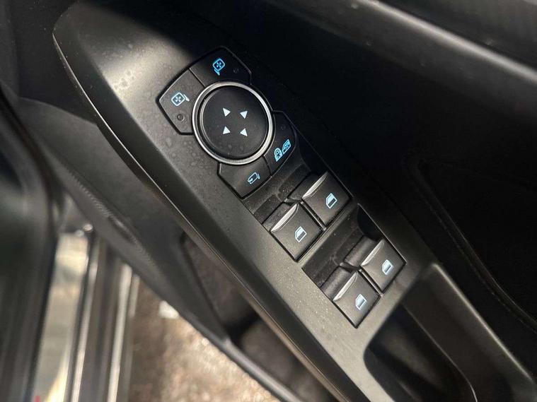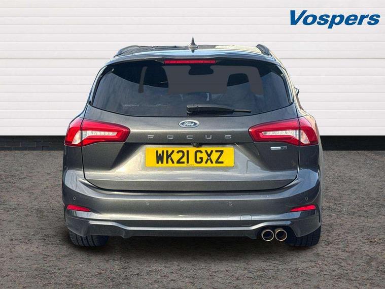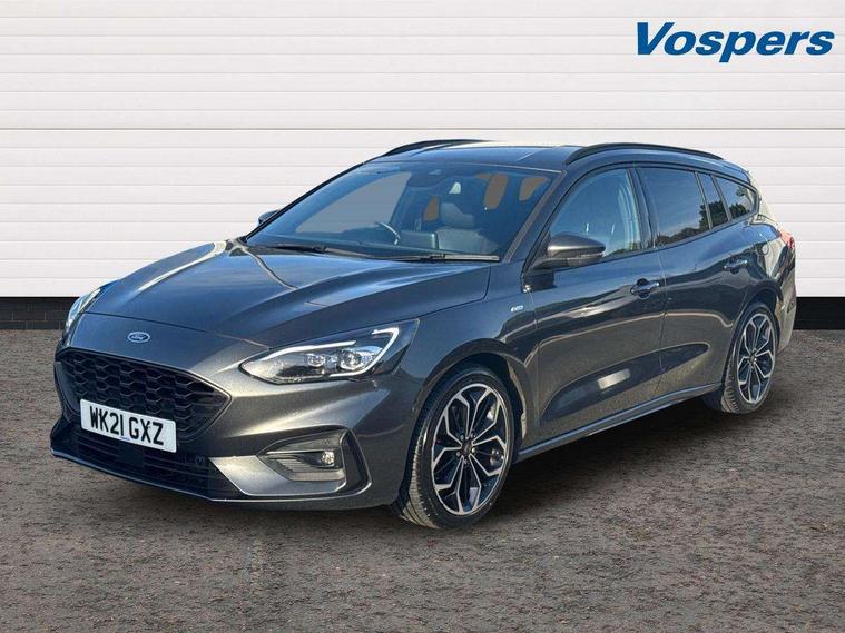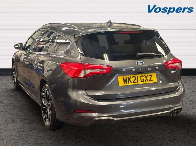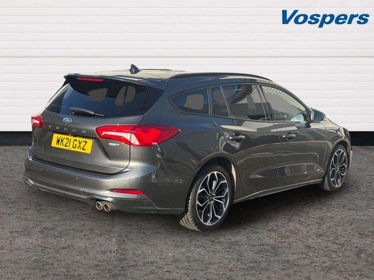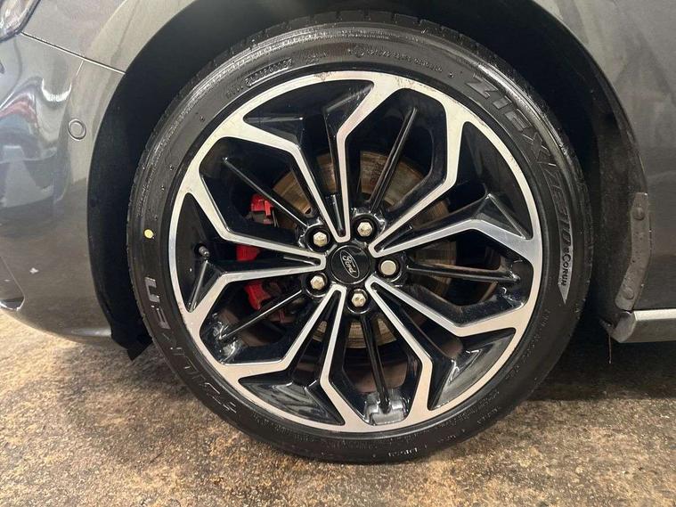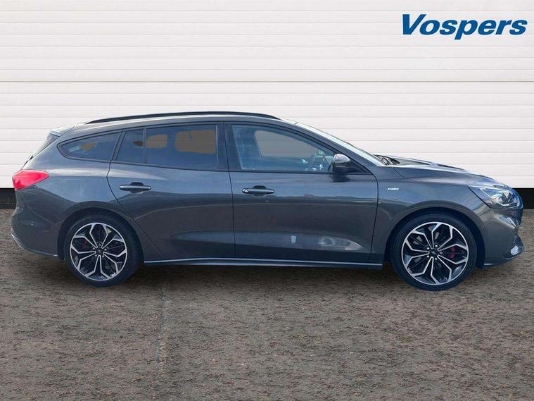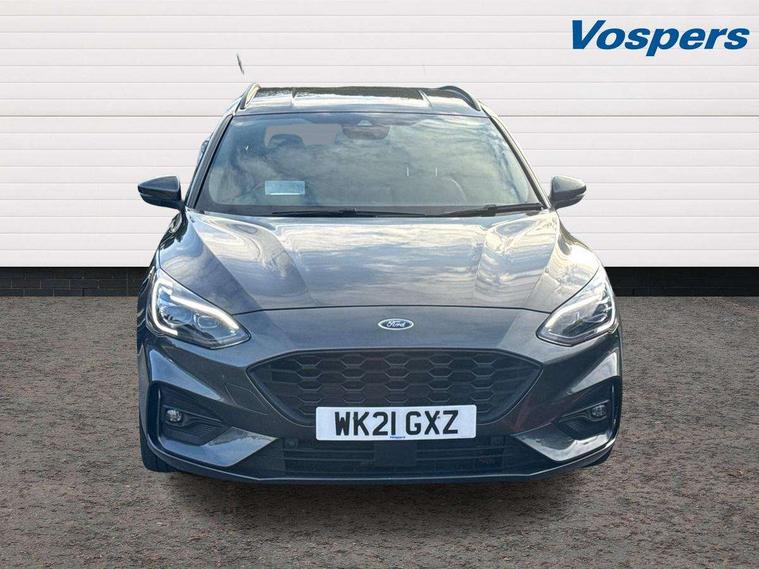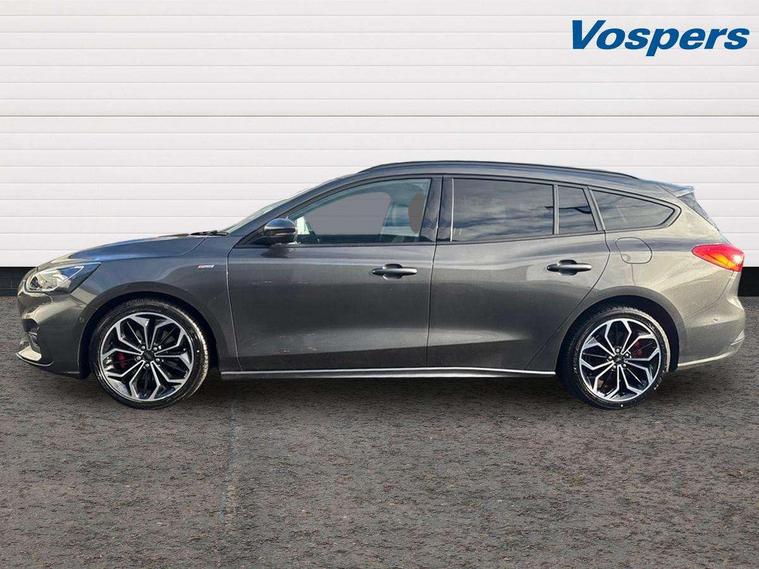 18" 5x2 spoke gloss black machined finish alloy wheels, Mini steel spare wheel, Ford keyfree system with Keyless entry and keyless start/sleep mode key fob, MyKey system, Remote central locking & engine immobiliser, Thatcham category 1 alarm, 2 USB ports, Aux input, 3x3 point rear seatbelts, ABS+Electronic Brake force Distribution, Auto hold function, Driver airbag, Electronic parking brake, Electronic stability control, Front and rear seatbelt reminder, Front inertia reel height adjustable seatbelts with pre-tensioners, Front passenger airbag, Front side airbags, Hill start assist, Passenger airbag deactivate switch, Post collision braking, Power child locks on rear doors, Pre collision assist with autonomous emergency braking and pedestrian/cyclist detection, Side curtain airbags, Three rear inertia reel lap/diagonal seatbelts, Tyre pressure monitoring system, Auto dimming rear view mirror, Auto headlamps (on/off), Automatic rain sensing wipers, Body colour large rear spoiler, Body coloured bumpers, Body coloured door handles, Body coloured electrically operated and heated door mirrors with side indicators, Electrically operated front and rear windows with one touch opening and closing, Front variable intermittent wipers with electric wash, Heated rear window, LED daytime running lamp, Polished twin tailpipe, Power folding door mirrors with puddle lights, Quickclear heated windscreen, Rear privacy glass, Roof rails, ST-Line upper and lower grille with full body styling kit and wing badges, Tailgate wash/wipe, Unique door and instrument panel inserts, 2nd Load floor, 3 spoke flat bottomed Sensico steering wheel with red stitching, 6 way power adjustable driver seat, Aluminium gear knob, Auto fold rear seats, Dark headliner, Driver's lumbar support, Dual zone electronic air temperature control, Front and rear floor mats with red stitching, Heated driver and front passenger seats, Heating for Sensico steering wheel, Height adjustable front headrests, Isofix child seat preparation, Reach + rake adjustable steering column, Rear centre headrest, Sensico partial premium upholstery, Soft console knee pads with red stitching, 12.3" Digital instrument cluster, Bluetooth system, Digital clock, Easy fuel capless refuelling system, Eco mode, Ford SYNC 3 navigation with 8" TFT touchscreen, DAB radio and app link Android auto/Apple carplay, Intelligent speed assist, Lane keeping system - lane keeping alert and lane keeping aid, PAS, Selectable drive mode, Trip computer, Sports tuned suspension,