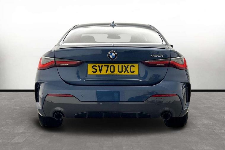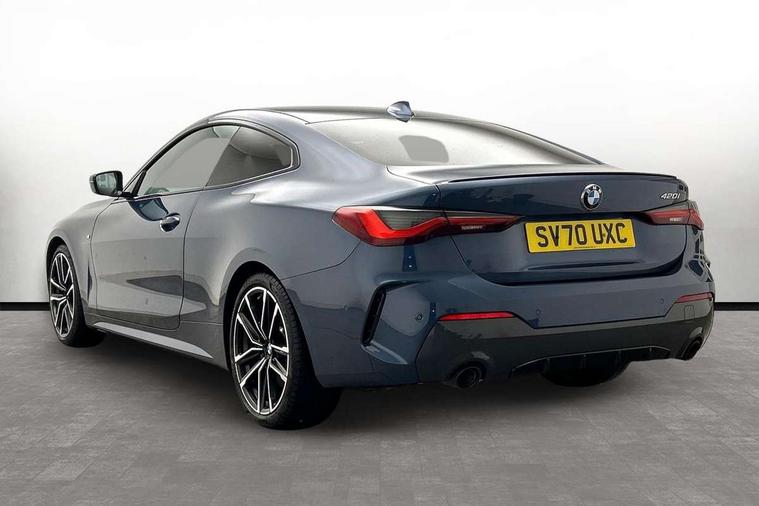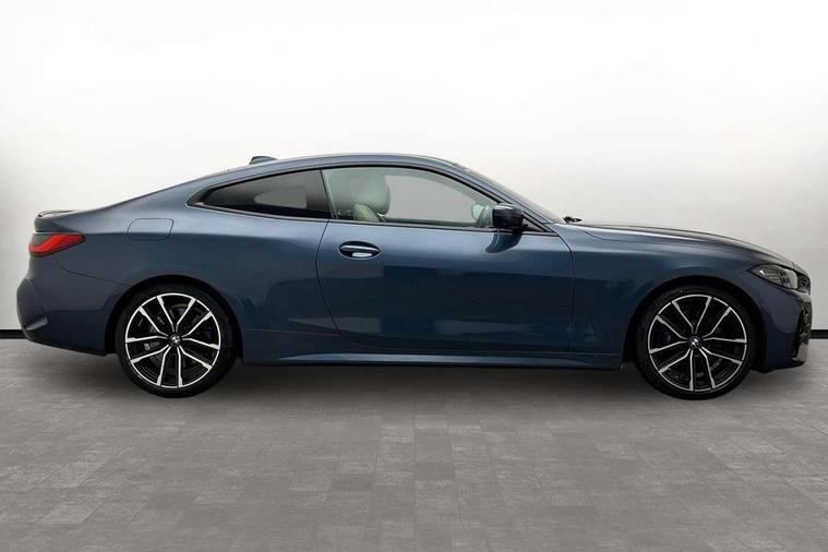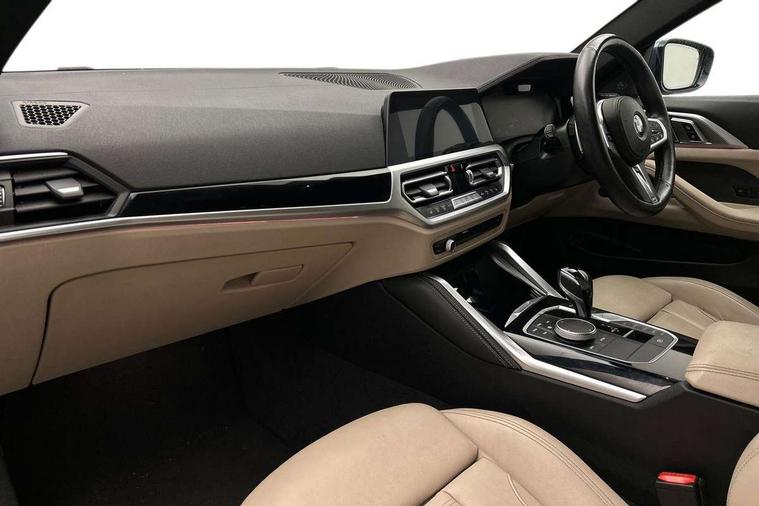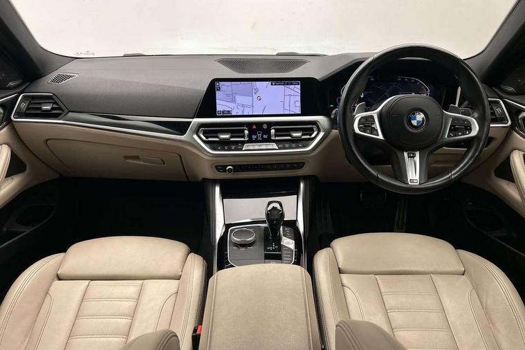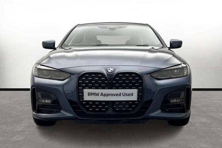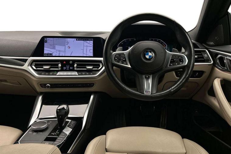 Aluminium carbon trim finishers with pearl chrome highlight, Sensatec instrument panel, Connected professional package - 4 Series, M Aerodynamics pack - 4 Series, Reduced rolling resistance tyres, Alarm system (Thatcham 1) with remote control and electronic engine immobiliser, Central locking switch for all doors, fuel filler cap and luggage compartment, Remote control with integrated key one button open/close vehicle and windows, sole opening of the luggage compartment lid and panic mode, Start/stop button with Comfort Go keyless engine start and auto Start/stop deactivation button, Vehicle key with M specific designation, DAB tuner, Electronic service booklet, Battery safety cut-off, BMW emergency call, Brake energy regeneration, Braking pre-tensioning, Child proof locking system in rear door, Child seat ISOFIX attachment for the two outer rear seats, Coasting in idle in ECO PRO mode, Cornering brake control (CBC), Crash sensor activating of airbags, Unlocking doors, hazard warning lights, fuel cut off, interior lighting+activation of safety battery terminal clamp, Driver and front passenger side airbags, integrated in the door side seat backrest bolsters for all seat variants, Driver/Front Passenger airbags, Dry braking, Dynamic brake control, Dynamic stability control + (DSC+) - Anti-lock Braking System (ABS) with brake assist and cornering brake control + Automatic Stability Control (ASC), Dynamic Traction Control - DTC, Electromechanical parking brake including automatic hold function and automatic release of the parking brake when pulling away, Electronic differential lock control (EDLC), Front and rear ventilated brake disc, Front passenger manual airbag deactivation, Head airbags for all 4 outer seats, Hill start assistant, Seat belt security check for driver and front passenger, Side impact protection, Tyre pressure monitoring with three level warning strategy, Warning triangle and first aid kit, Acoustic glazing, Automatic headlight beam throw control with load dependent regulating reaction, dynamic compensation of braking dive and acceleration squat, Automatically dimming electrochromatic rear view mirror, BMW emblem on engine compartment lid and tailgate, BMW kidney grille with mesh grille front side of the nuggets in matt aluminium and frame in chrome high gloss, Body colour fuel filler flap, Brushed aluminium inserts in the front door sill finishers with BMW designation, Dynamic brake lights, Electric windows - front and rear, with open/close fingertip control, anti trap facility and comfort closing function all round, Exhaust tailpipe - split left and right, Exterior mirrors - electrically folding with anti-dazzle, Fading support, Front and rear bumper system, Front apron plastic in body colour, Green tinted heat protection glazing, High gloss shadow line exterior trim, Illuminated bow type door handles in body colour drivers side with door lock, Interior rear view electrochromatic mirror with automatic anti dazzle function, LED front fog lights, LED Headlights, Licence plate panel integrated into front bumper and tailgate, Lightweight engineering, M designation on front side panels, left and right, M rear spoiler, Model designation on right side of tailgate, One piece front bumper cover including towing eye cover in body colour, Preparation for high beam assistant, Rain sensor, Side frame decorative moulding black matt, Two part LED tailights in L-shape with components in smoked glass, brake light, LED turn indicator and rear fog light, Visible VIN plate, Welcome lights in interior and door handle area, Window recess cover black high gloss, Windscreen wipers with integrated washing jets, 12V power socket in front centre console, 2 front cupholder in centre console with clamping elements and matt black inlay, 2 Rear seat headrests, 3 spoke leather M sport multifunction sports steering wheel, 3 zone automatic air conditioning, 4 pieces lashing eyelets in luggage compartment, 40:20:40 split folding rear seat and rear centre armrest with two cupholders, Ambient lighting with welcome carpet light, Anthracite headlining, Armrest integrated in front and rear door trim + front centre console armrest, Four grab handles integrated in roof lining, Front and rear door exit lighting (left / right), Front and rear door pockets, Front and rear footwell lights, Front and rear reading lights, Front headrests, Front seat backrest width adjustment, Front sport seats, Glove compartment lighting, Heated driver and front passenger seats, Height adjustable mechanically and infinitely variable steering column, Illuminated armrest storage compartment, Illuminated glove compartment with separate small compartment, Luggage compartment light, M leather steering wheel, Make-up mirror lights, Storage compartment in rear centre console, Sunvisors with vanity mirrors and ticket pocket, Toolkit located in luggage compartment, Velour front floor mats, Vernasca leather upholstery, Active guard plus, Attentiveness assist, Auto start-stop, BMW ConnectedDrive online services, BMW Live Cockpit Professional Nav with 12.3" instrument display + 10.25" display, Intelligent Voice Assist, BMW OS 7, HDD, 2USB, 4G LTE connect, BMW service history, BMW Teleservices, Brake pad wear indicator in front and rear, Check Control warning system for monitoring of lights and door/luggage compartment open warning, Condition based service, Cruise control with brake assist, Electric power steering, Electric power steering with Servotronic steering optimised at all speed ranges, Gearshift time display in manual mode, Instrument cluster with speedometer with mph readout, tachometer, fuel gauge and oil temperature gauge, Integrated owners handbook, On board computer - average speed, fuel consumption, outside temp display with acoustic warning, clock/date, service interval, odometer/trip meter, Optimum shift indicator, Personal Profile - automatic lock when driving away selectable, Variable sport steering, 8 speed automatic steptroni