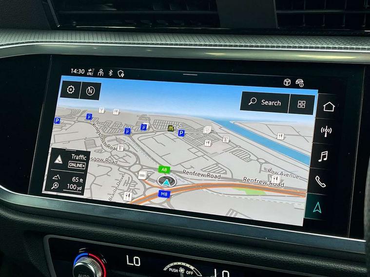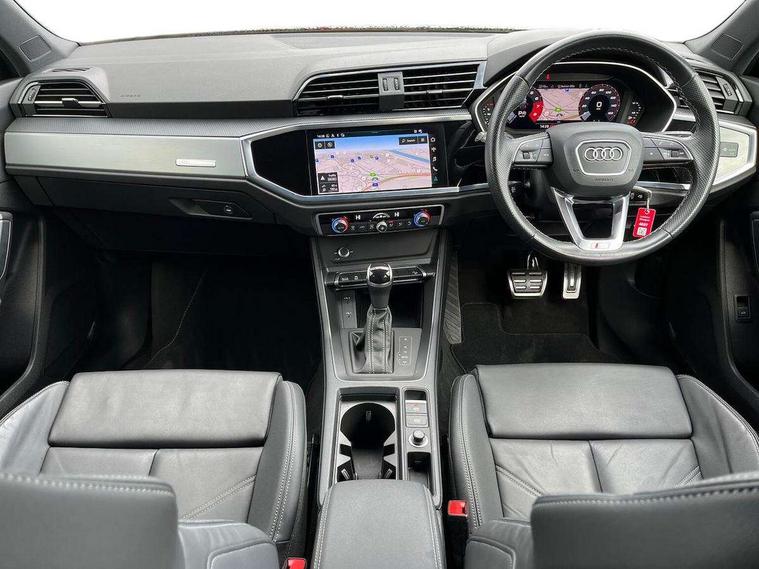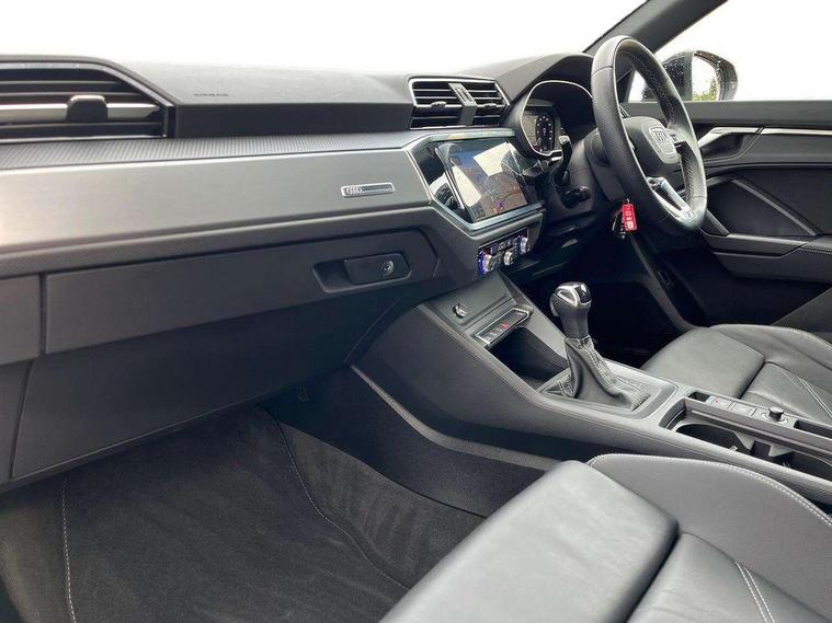Aluminium look interior elements, Black dashboard, Dark matt brushed aluminium inlay, Detail dashboard around MMI touch colour display in glass look, black with surround in aluminium look, Leatherette door armrest, Ambient lighting pack - Q3, Non smoking pack - Q3, Anti theft alarm, Anti theft wheel bolts, Immobiliser, Remote central locking, 2 USB-C ports with charge and data functions, 6 passive loudspeakers, DAB digital radio module, 3x3 point rear seatbelts, 6 airbags - Driver, front passenger, curtain and side windows, Audi pre-sense front with pedestrain and cyclist recognition, Electrically operated child locks on rear doors, Electromechanical parking brake, Electronic stabilisation control including ABS, ASR and EDL, Front seatbelt reminder, Hill descent control, Hill hold assist, Pre sense basic, Seatbelt monitoring, Tyre pressure warning, Warning triangle and first aid kit, Acoustic windscreen, Aluminium window trim, Auto dimming frameless rear view mirror, Diffuser grille in grained matt black, Diffuser trim in selenite silver, Electrically folding, adjustable and heated door mirrors with integrated LED side indicators and kerb view function for passenger side, Front and rear electric windows, Front fog lights, Front side air inlets in selenite silver, Front underbody protection in manhattan grey paint finish, Grille surround in aluminium silver matt, High gloss black finish B and C pillars, LED Dynamic rear indicators, LED headlights with LED daytime running lights, LED rear lights, LED third brake light, Privacy glass dark tinted rear and rear-side windows (from B-pillar backwards), Radiator grille in anthracite black with inlay in matt aluminium silver, Rain and light sensors, Rear side wing doors, Rear underbody protection in matt black, Rear wiper, S line badges on front wings, S line front and rear bumpers and side skirts in contrasting Manhattan grey paint finish, Side skirt insert in matt Platinium grey, Variable front intermittent wipers, 12V socket in rear centre console, 3 seat bench in 2nd row, 3 spoke leather multifunction steering wheel features S badging and grips in perforated leather with contrast stitching, 40:20:40 folding with manual adjustment for 60:40 forwards/backwards position and backrest angle, Adjustable rear seat bench/backrest with centre armrest and cupholder, Black cloth headlining, Dual zone electronic climate control, Front and rear black floor mats with contrast stitching, Front and rear headrests, Front and rear roof module including reading lights, Front centre armrest, Glove compartment lighting, Height and reach adjustable steering wheel, Illuminated door sill trims with S logo, ISOFIX child seat mounting for front passenger with airbag deactivation and outer rear seat including top tether attachment point for outer rear seats, Luggage compartment light in right, Luggage compartment sill protection in stainless steel, Manual front seats with height adjustment, Perforated leather gearknob, Single front passenger seat, Stainless steel pedals, Audi drive select, Audi lane departure warning, Audi smartphone interface includes wireless Apple carplay/Android Auto, Audi Virtual Cockpit - 10.25" display, Bluetooth interface, Camera based traffic sign recognition, Legal emergency call, MMI Navigation Plus with high resolution 10.1 inch touchscreen colour display, Power operated tailgate, Progressive steering, Service interval indicator, Start stop system with recuperation, Voice control system with natural language interaction, Sports suspension,