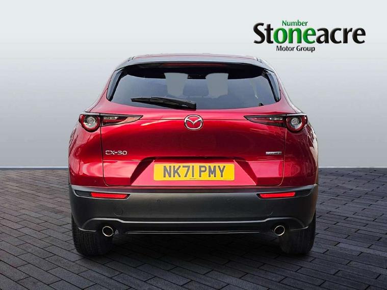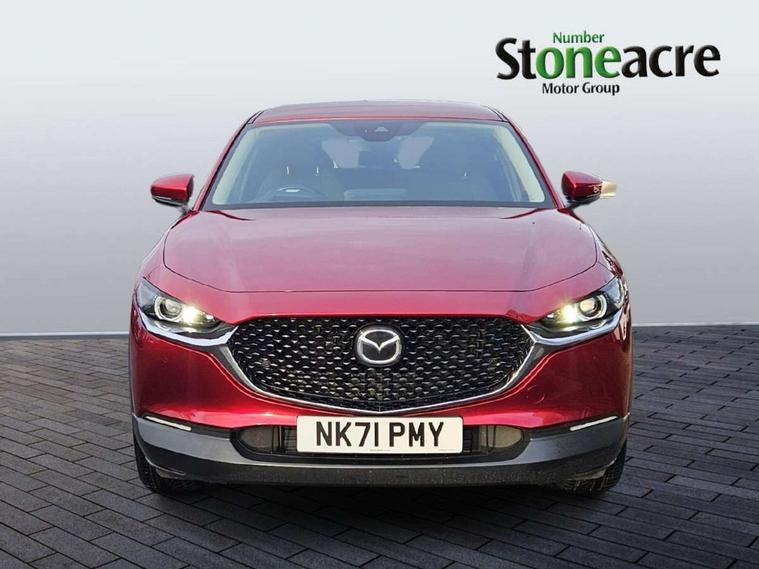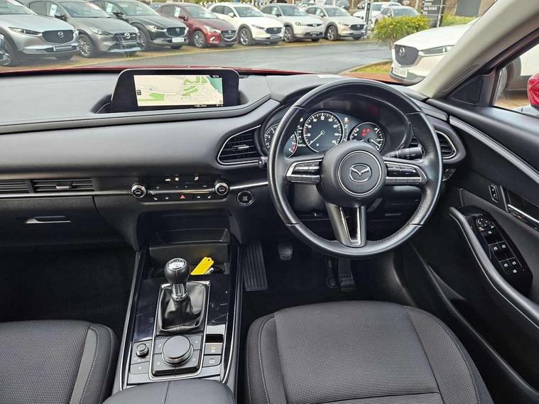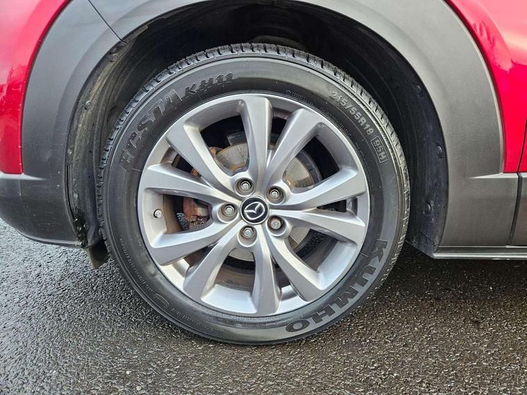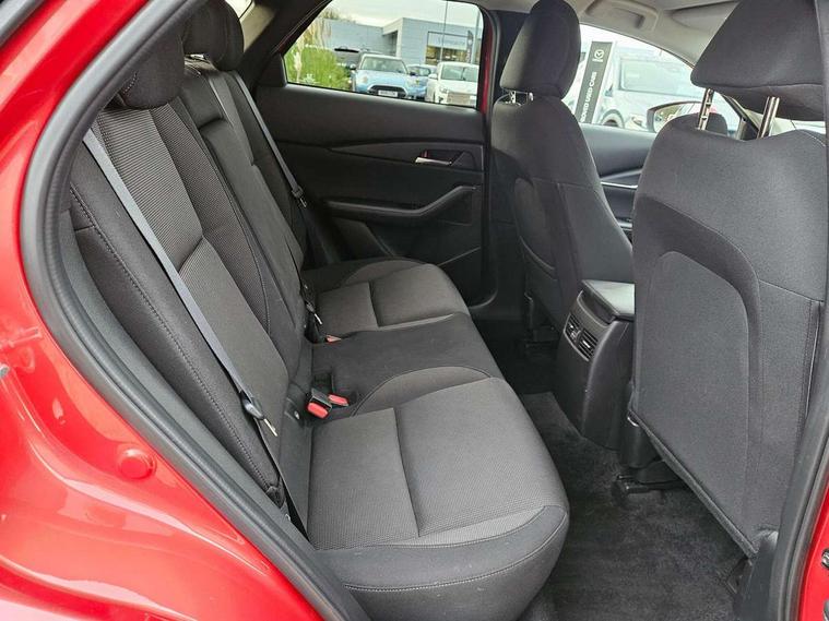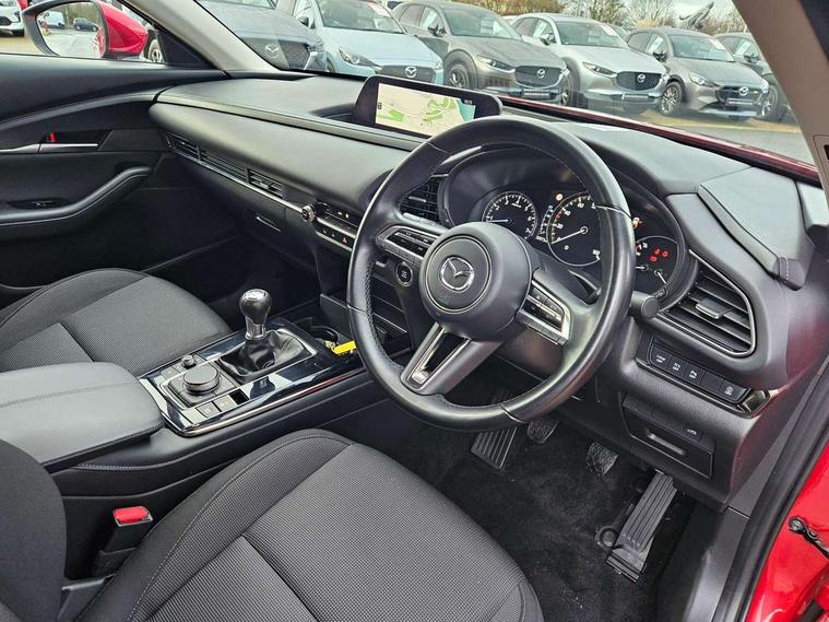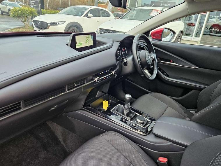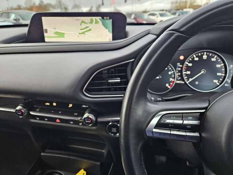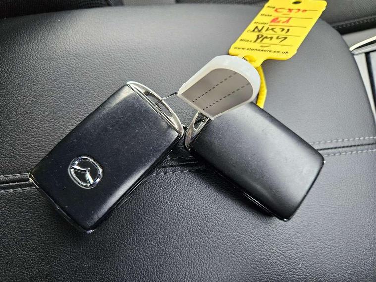 18" Silver alloy wheels, Emergency tyre repair kit, Remote central locking with deadlocking and automatic door lock when driving, Smart keyless entry, Thatcham accredited alarm and immobiliser, 2 USB charging ports in front inner central armrest, AM / FM / DAB radio with 8 speakers, Multimedia Commander including separate volume dial, Steering wheel mounted audio/bluetooth controls, 3 point ELR front seat belts x2 with pretensioners, 3 point ELR rear seat belts, Anti-lock braking system (ABS), Drivers knee airbag, DSC - Dynamic Stability Control, Electronic parking brake with auto disengage function and auto hold function, Front and rear curtain airbags, Front dual stage driver and single stage front passenger airbags, Front passenger airbag cut-off switch, Front side airbags, Front smart city brake support, G-Vectoring control plus, Hill launch assist, Manual child lock in rear doors, Mild Hybrid system with regenerative braking, Seatbelt reminder for driver/front passenger and rear seats, Traction control system (TCS), Tyre pressure monitoring system (TPMS), Adaptive LED Headlights, Auto dimming driver's door mirror, Auto headlight levelling, B-pillar and C-pillar garnishes in piano black finish, Body coloured, electrically adjustable, heated auto power folding door mirrors with integrated indicators, Chrome finish signature wing in front grille, Coming/leaving home lighting function, Dual chrome exhaust, Dusk sensing headlights, Electric front/rear windows with one touch auto up/down, Frameless auto dimming interior rear view mirror, Front kodo turn signal, Gloss black front grille, Gloss black rear roof spoiler, High beam assist, LED signature daytime running lights, Privacy glass (rear side windows and rear screen), Rain sensing front wipers with adjustable speed and intermittent wipe, Rear fog lights, Rear side wing doors, Rear wiper, Signature LED rear combination lights, Third brake light, 12V power outlet in centre console, 3 seat bench in 2nd row, 60/40 split fold down rear seats, Chrome horn pad ring, Chrome interior trim accents with steering wheel centre bezel, surround of engine start / stop button and glove box handle, Cloth upholstery with interior accents, Dark cloth door panel inserts, Dashboard, door cards and front centre armrest in black cloth, Driver and front passenger visors with covered vanity mirror and driver ticket holder, Driver seat manual slide, recline, height and seat tilt adjust, Driver, front passenger and two rear door storage, Driver, Front passenger and two rear grab handles with coathooks, Dual zone climate control air conditioning with rear air vents, Folding rear centre armrest with two cup holders, Front and rear (x3) head restraints, Front and rear LED lighting, Front armrest, Front centre storage with two cupholders with lid, Front passenger seatback pockets, Front passengers seat manual slide, recline and height adjustment, Gear shift indicator, Glovebox illumination, Heated front seats with 3 stage setting, ISOFIX child seat anchorage points attached on outer rear seats, Leather wrapped gear shift knob, Leather wrapped steering wheel with telescopic and tilt adjustment, LED luggage compartment lighting, Light roof headlining and pillars, Roof mounted sunglasses holder, Single front passenger seat, 7" TFT Colour driver instrument panel display, 8.8" Colour centre touch screen display with Mazda Connect infotainment, Adaptive cruise control (Mazda radar cruise control), Apple car play/Android Auto, Blind spot monitoring with rear cross traffic alert, Driver attention alert system, E-call with GPS, Emergency stop signalling system, Engine start/stop button, Front and rear parking sensors, Integrated bluetooth, Integrated Mazda navigation system, Intelligent speed assist, Lane keep assist system (LAS) with Lane departure warning system (LDWS), Mazda connected services, PAS, Power lift gate, Reversing camera, Service indicator, Traffic sign recognition, Trip computer, Cylinder Deactivation, i-stop,