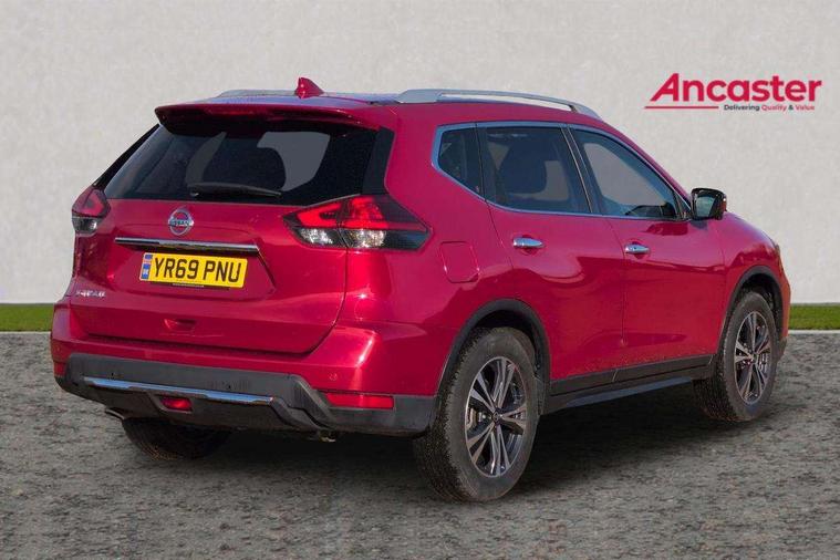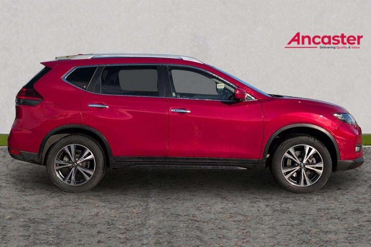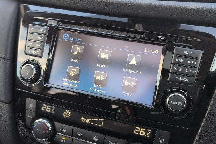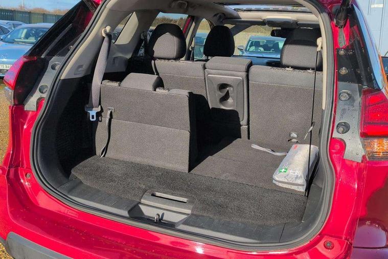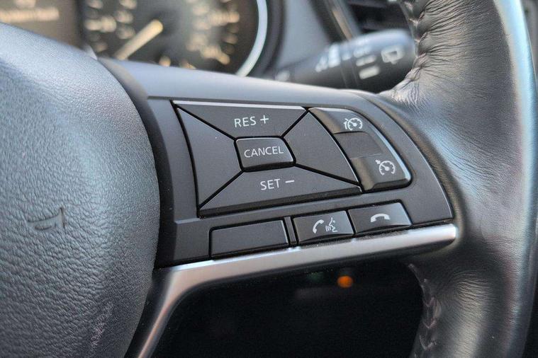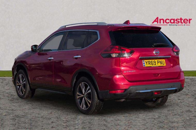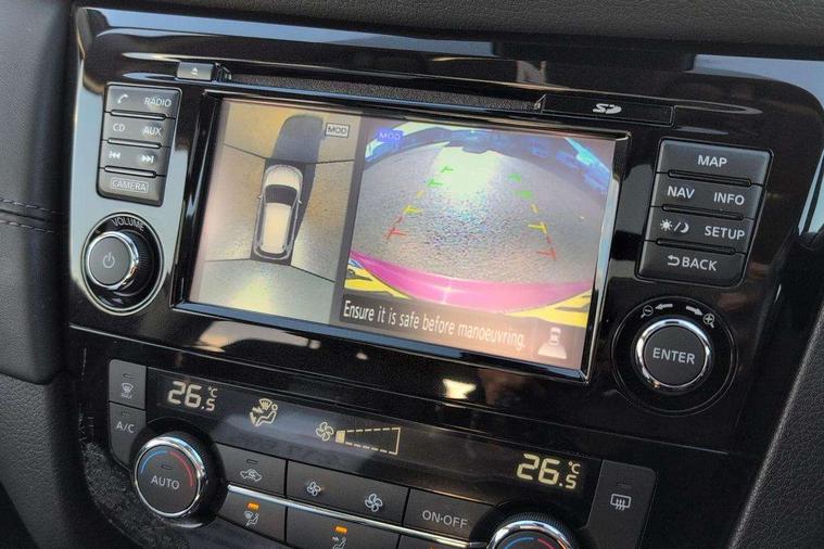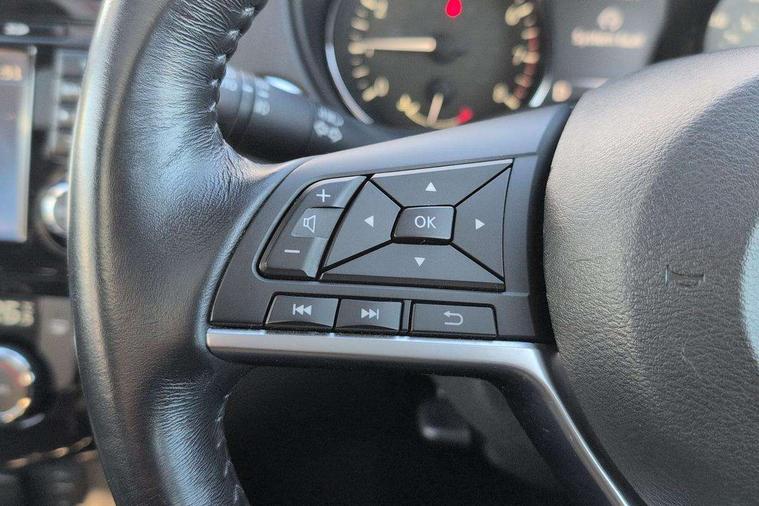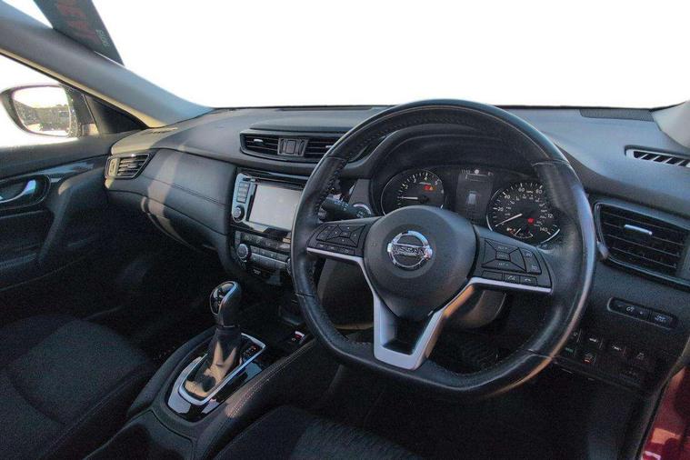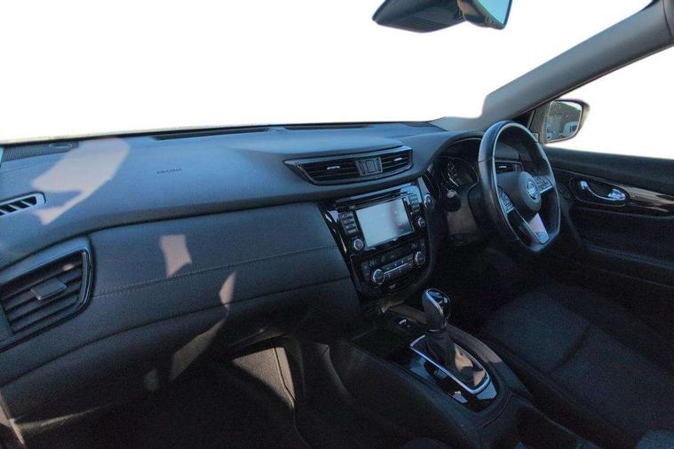 Full size spare wheel, Immobiliser, Intelligent Key, Remote central locking, Thatcham Cat.1 alarm, 6 speakers, DAB Digital radio, Radio/CD, Smartphone apps, Steering wheel mounted audio controls, USB/aux input socket, 3 point seatbelts on all seats, 6 airbags - Driver, front passenger, curtain and side airbags, ABS, Child locks on rear doors, EBD + Brake Assist, Electric parking brake, ESP + traction control, Intelligent emergency braking with pedestrian recognition, Seatbelt warning, Tyre pressure monitoring system, Anti dazzle rear view mirror, Automatic headlights, Automatic rain sensing wipers, Black honeycomb front grille, Body colour door mirrors, Chrome door handles, Chrome window surround, Electric folding door mirrors, Electric heated door mirrors, Front and rear electric windows, Front fog lights, Halogen headlights, LED daytime running lights, Panoramic sunroof with one touch shade, Rear privacy glass, Satin silver roof rails, Shark fin roof aerial, 3 rear headrests, 60/40 split rear bench seat, Centre console storage box/armrest, Cloth upholstery, Configurable luggage board system, Driver's manual adjustable lumbar support, Dual zone climate control, Front and rear door pockets with bottle holders, Front cupholders, Front/rear armrests, Height adjustable front headrests, Individual rear reading lights, Isofix child seat attachment, Leather D shaped steering wheel, Leather steering wheel and gear knob, Pollen filter, Tilt/telescopic adjustable steering wheel, 5" TFT driver information centre, Automatic tailgate opening, Bluetooth phone integration system, Cruise control + speed limiter, Front and rear parking sensors, Intelligent around view monitor, Lane departure warning system, Nissan connect evo 7" touchscreen navigation and entertainment system, PAS, Push button start, Traffic sign recognition, Trip computer, Nissan chassis control (intelligent ride control, intelligent trace control, intelligent engine brake),