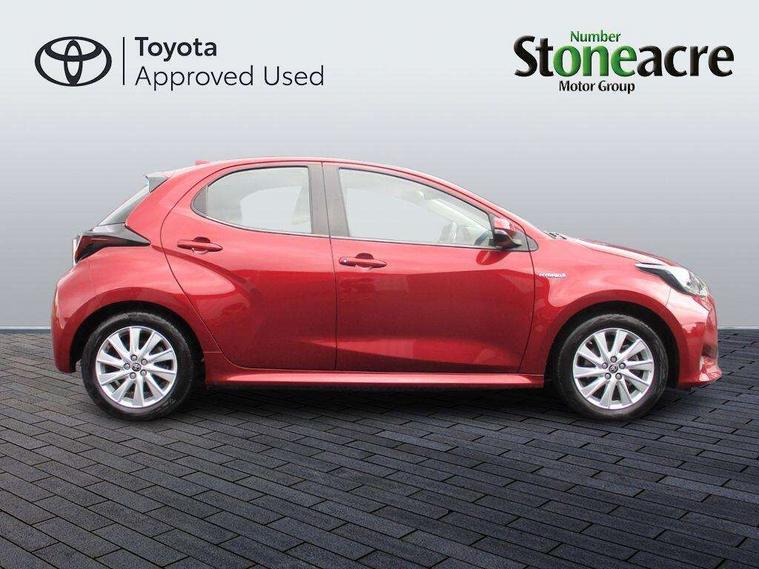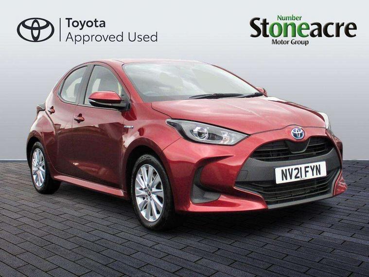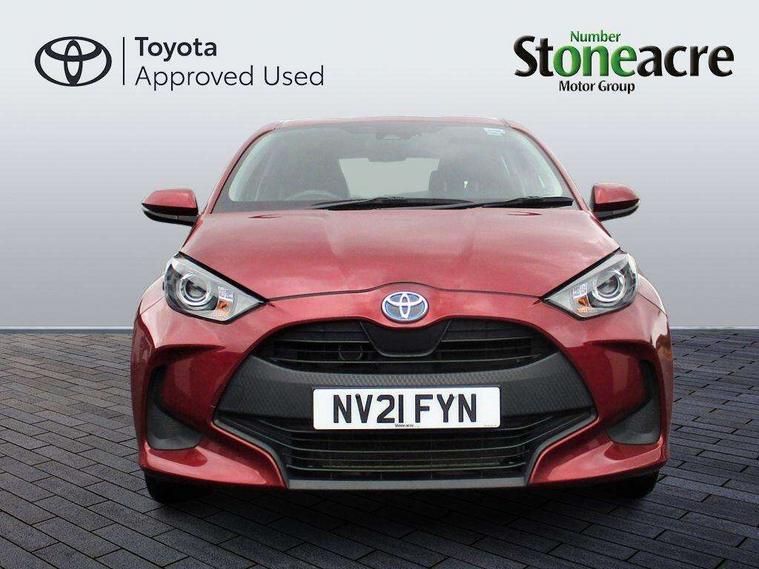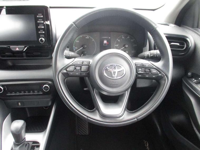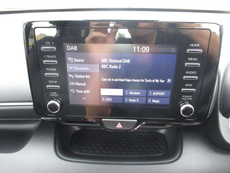 Soft touch instrument panel, 16" Silver alloy wheels, Space saver spare wheel, Alarm/immobiliser, Remote powered central double locking doors, 4 speakers, 7" Multimedia display touch screen, Toyota Touch 2 with DAB, USB connection, 3 point seatbelts on all rear seats, ABS+EBD+Brake assist, Active headrests, Electronic parking brake, Emergency brake light system (EBS), Front passenger airbag on/off switch, Front seatbelt reminder, Hill start assist control (HAC), Rear child proof door locks, Rear seat belt reminder, Supplemental Restraint System (SRS) 8 airbags: Driver & passenger's airbags, dual side curtain airbags, side impact airbags, front centre airbag, Toyota Safety Sense 2, Precollison + Night time Pedestrian & Cyclist Detection, Lane Trace Assist, Auto High Beam, Intelligent ACC & Road Sign Assist, Tyre pressure warning system, Acoustic windscreen glass, Auto windscreen wipers, Automatic headlights, Body coloured door mirrors, Electric adjustable heated door mirrors, Follow me home headlights, Front auto power windows with anti jam protection, Halogen projector headlights, LED daytime running lights, LED High mounted stop lamp, Rear spoiler, Shark fin antenna, Turning signal integrated indicators in door mirrors, 3 adjustable rear headrests, 3 spoke leather steering wheel, 60/40 split folding rear seat, Adjustbale boot height, Auto air conditioning, Coat hooks in rear grab handles, Cup holders (2 front & door), Data Communication Module (DCM) connected services, Fabric upholstery, Front armrest, Glovebox, Height adjustable driver's seat, Isofix seat fixing, Leather gearshift, Pollen filter, Shopping bag hooks, Tilt/telescopic steering column, 4.2" coloured LED TFT multi information display with analogue speedometer, Adaptive cruise control, Adjustable speed limit with speed warning, Bluetooth connectivity, E-call, Electric power steering, Hybrid energy display, Multi information display switches on steering wheel, Reversing camera, Smartphone integration with Apple CarPlay and Android auto, Vehicle Stability Control (VSC),