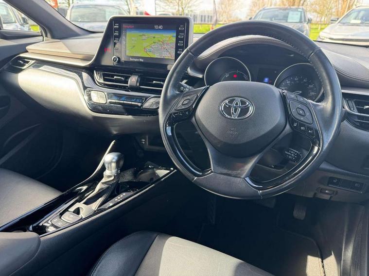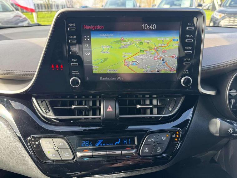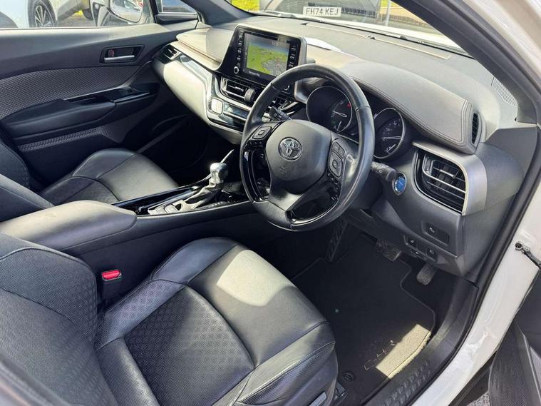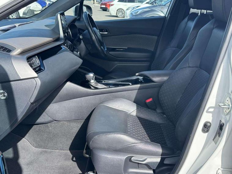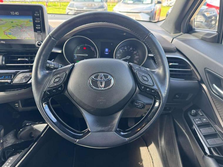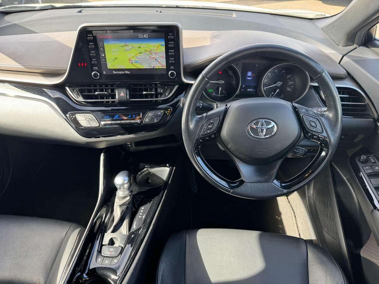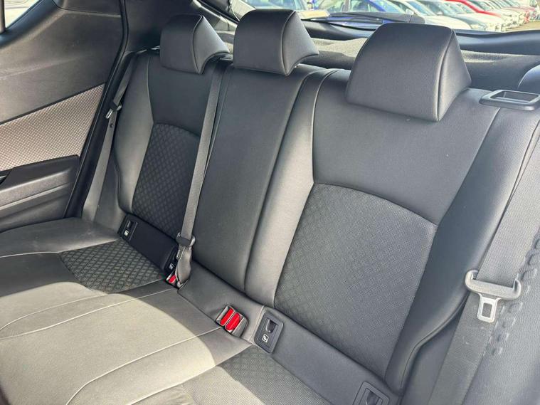 Black lower dashboard, Black lower driver dashboard, Dark brown upper dashboard, Piano black console, Silver deco line on upper dashboard, Leather pack - C-HR, Tech with parking sensor pack - C-HR, Tyre repair kit, Glass-breaking alarm sensors, Immobiliser, Intrusion alarm, Intrusion sensor, Motion sensor alarm, Power door locks, Power passenger window lock, Remote central locking, Remote door lock, 6 speakers, Aux connectors + 12V front outlet, DAB Radio (Digital Audio Broadcasting), Toyota touch 2 multimedia system with 8" display, USB connector integrated with radio and CD player, Wi-fi connectivity, 16 Disk front wheel brake, 3x3 point rear seatbelts, ABS+EBD+Brake assist, Electronic parking brake, ESP + traction control, Front and rear seatbelt reminder, Front passenger airbag on/off switch, Hill start assist control (HAC), Pre collision system with pedestrian detection, Pre-tensioners and force limiters, Rear door child safety locks, SRS Airbags - Driver + Front passenger, front side, front and rear curtain and driver's knee airbags, Toyota safety sense, Tyre pressure monitoring system, Adaptive front light system, Adaptive LED Headlights, Anti-jam protection on power windows, Auto high beam, Auto up and down function on all power windows, Automatic headlight levelling, Automatic headlights, Automatic headlights cut-off, Black and body coloured rear bumper, Black front bumper, Black upper front grille, Body colour door handles, Body colour door mirrors, Boot door release with push button, Electric heated door mirrors, Follow me home headlights, Front and rear power windows, Front spoiler, Hard tonneau cover, Honeycomb lower front grille, LED daytime running lights, LED fog lights, LED front light guide, LED High mounted stop light, LED rear brake lights, LED rear combination lights, Noise reduction layer on front windows and windscreen, Power adjustable door mirrors, Privacy glass, Rear spoiler, Rear tailgate, Rear window defogger, Rear window wiper, Shark fin antenna, UV-filter on driver and passenger windows, UV-filter on rear windows, 12v power outlet - front, 3 rear headrests, 3 spoke leather steering wheel, 60/40 split folding rear seat, Adjustable rear headrests, Adjustable speed limiter switch on steering wheel, Assist grips front and centre pillar, Audio and telephone switches on steering wheel, Black front door assist grips, Blue ambient lighting on front cup holders, Blue ambient lighting on front doors, Boot light, Chrome interior door handles, Driver and front passenger personal light, Driver and front passenger Whiplash Injury Lessening seats, Driver and passenger seatback pockets, Dual zone automatic air conditioning, Front cupholders, Front head restraints, Front sports seats, Glovebox with internal light, Heated driver and front passenger seats, Heated steering wheel, Hooks for luggage holding net, Humidifying Nanoe air purifier, Illuminated entry system, Isofix attachments on rear seats, Leather gearshift, Light on driver sun visor, Light on passenger sun visor, Manual telescopic steering wheel, Manual tilt steering wheel, Microphone on front personal light, Mirror on driver sun visor, Mirror on passenger sun visor, Multimedia switches on steering wheel, Pollen filter, Power adjustable lumbar support on driver seat, Power tilting cushion on driver seat, Shopping bag hooks, Slow opening on lower glovebox, Voice recognition switch on steering wheel, 4.2" coloured TFT screen for multi-information display, Adaptive cruise control, Bluetooth connectivity, Electric power steering, Hybrid system indicator, Lane departure alert with steering control, Remote boot door release in cabin, Remote boot door release in key, Reversing camera, Road sign assist - RSA, Simple Intelligent parking assist, Touch 2 Go navigation system, Trip computer, Voice recognition, Vehicle Stability Control (VSC),