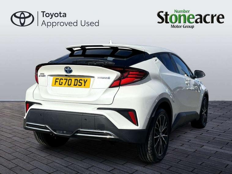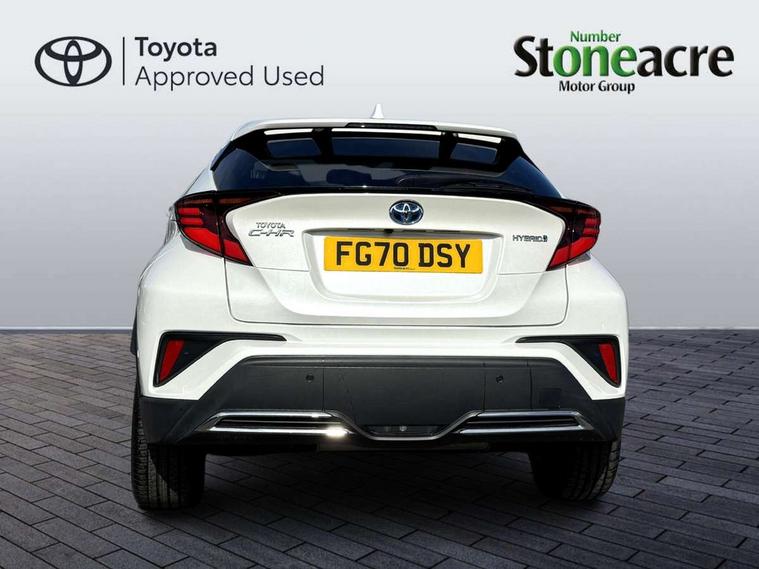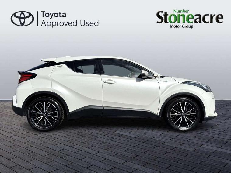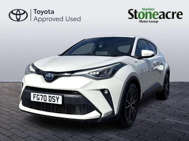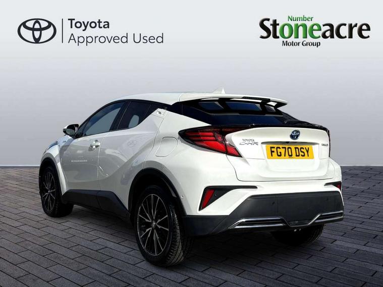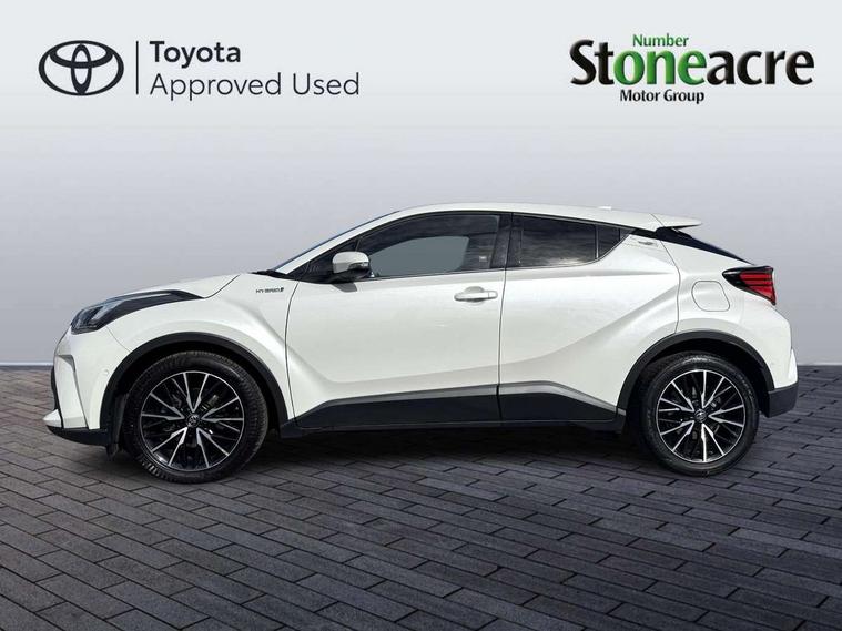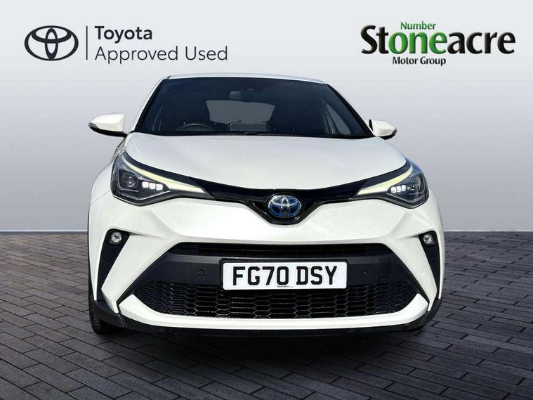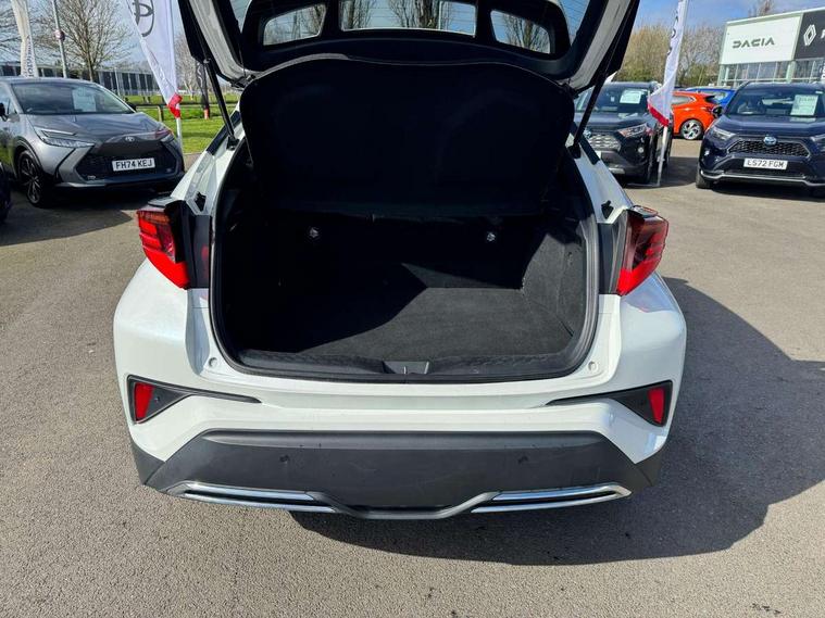 Black lower dashboard, Black lower driver dashboard, Dark brown upper dashboard, Piano black console, Silver deco line on upper dashboard, Leather pack - C-HR, Tech with parking sensor pack - C-HR, Tyre repair kit, Glass-breaking alarm sensors, Immobiliser, Intrusion alarm, Intrusion sensor, Motion sensor alarm, Power door locks, Power passenger window lock, Remote central locking, Remote door lock, 6 speakers, Aux connectors + 12V front outlet, DAB Radio (Digital Audio Broadcasting), Toyota touch 2 multimedia system with 8" display, USB connector integrated with radio and CD player, Wi-fi connectivity, 16 Disk front wheel brake, 3x3 point rear seatbelts, ABS+EBD+Brake assist, Electronic parking brake, ESP + traction control, Front and rear seatbelt reminder, Front passenger airbag on/off switch, Hill start assist control (HAC), Pre collision system with pedestrian detection, Pre-tensioners and force limiters, Rear door child safety locks, SRS Airbags - Driver + Front passenger, front side, front and rear curtain and driver's knee airbags, Toyota safety sense, Tyre pressure monitoring system, Adaptive front light system, Adaptive LED Headlights, Anti-jam protection on power windows, Auto high beam, Auto up and down function on all power windows, Automatic headlight levelling, Automatic headlights, Automatic headlights cut-off, Black and body coloured rear bumper, Black front bumper, Black upper front grille, Body colour door handles, Body colour door mirrors, Boot door release with push button, Electric heated door mirrors, Follow me home headlights, Front and rear power windows, Front spoiler, Hard tonneau cover, Honeycomb lower front grille, LED daytime running lights, LED fog lights, LED front light guide, LED High mounted stop light, LED rear brake lights, LED rear combination lights, Noise reduction layer on front windows and windscreen, Power adjustable door mirrors, Privacy glass, Rear spoiler, Rear tailgate, Rear window defogger, Rear window wiper, Shark fin antenna, UV-filter on driver and passenger windows, UV-filter on rear windows, 12v power outlet - front, 3 rear headrests, 3 spoke leather steering wheel, 60/40 split folding rear seat, Adjustable rear headrests, Adjustable speed limiter switch on steering wheel, Assist grips front and centre pillar, Audio and telephone switches on steering wheel, Black front door assist grips, Blue ambient lighting on front cup holders, Blue ambient lighting on front doors, Boot light, Chrome interior door handles, Driver and front passenger personal light, Driver and front passenger Whiplash Injury Lessening seats, Driver and passenger seatback pockets, Dual zone automatic air conditioning, Front cupholders, Front head restraints, Front sports seats, Glovebox with internal light, Heated driver and front passenger seats, Heated steering wheel, Hooks for luggage holding net, Humidifying Nanoe air purifier, Illuminated entry system, Isofix attachments on rear seats, Leather gearshift, Light on driver sun visor, Light on passenger sun visor, Manual telescopic steering wheel, Manual tilt steering wheel, Microphone on front personal light, Mirror on driver sun visor, Mirror on passenger sun visor, Multimedia switches on steering wheel, Pollen filter, Power adjustable lumbar support on driver seat, Power tilting cushion on driver seat, Shopping bag hooks, Slow opening on lower glovebox, Voice recognition switch on steering wheel, 4.2" coloured TFT screen for multi-information display, Adaptive cruise control, Bluetooth connectivity, Electric power steering, Hybrid system indicator, Lane departure alert with steering control, Remote boot door release in cabin, Remote boot door release in key, Reversing camera, Road sign assist - RSA, Simple Intelligent parking assist, Touch 2 Go navigation system, Trip computer, Voice recognition, Vehicle Stability Control (VSC),