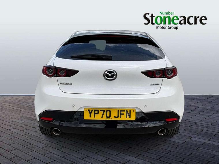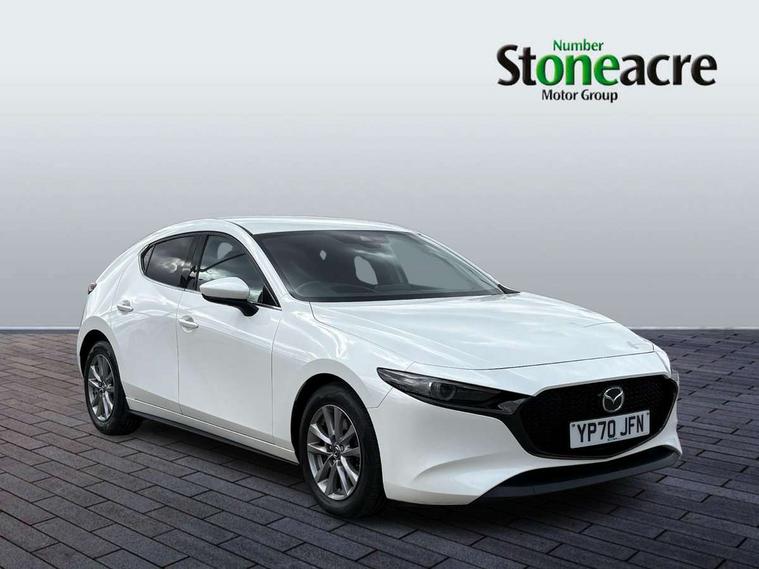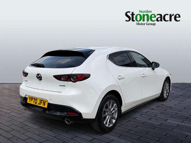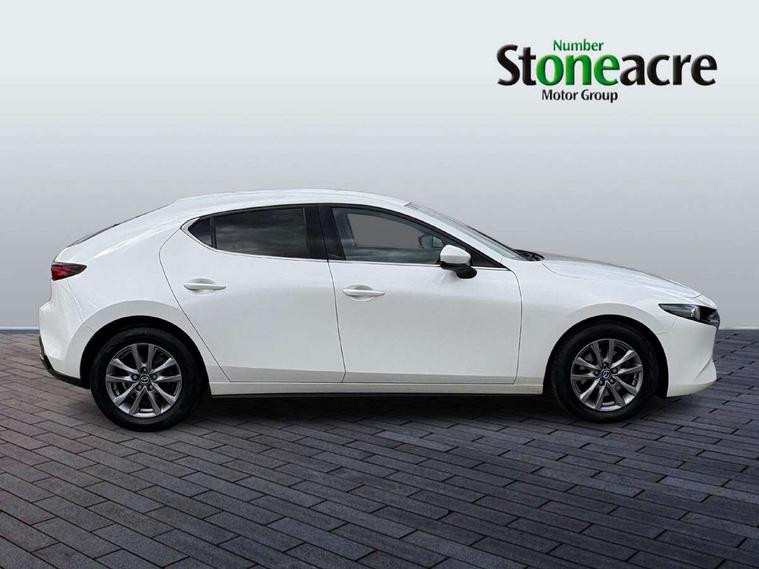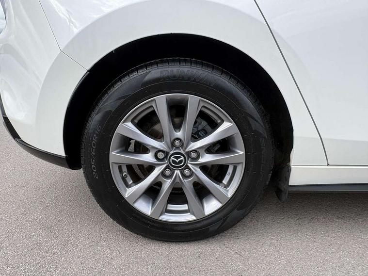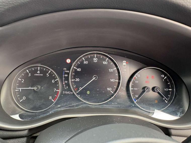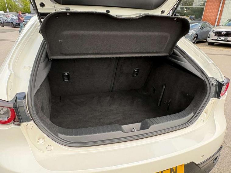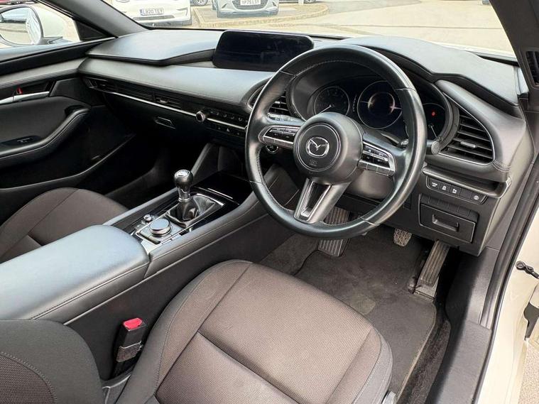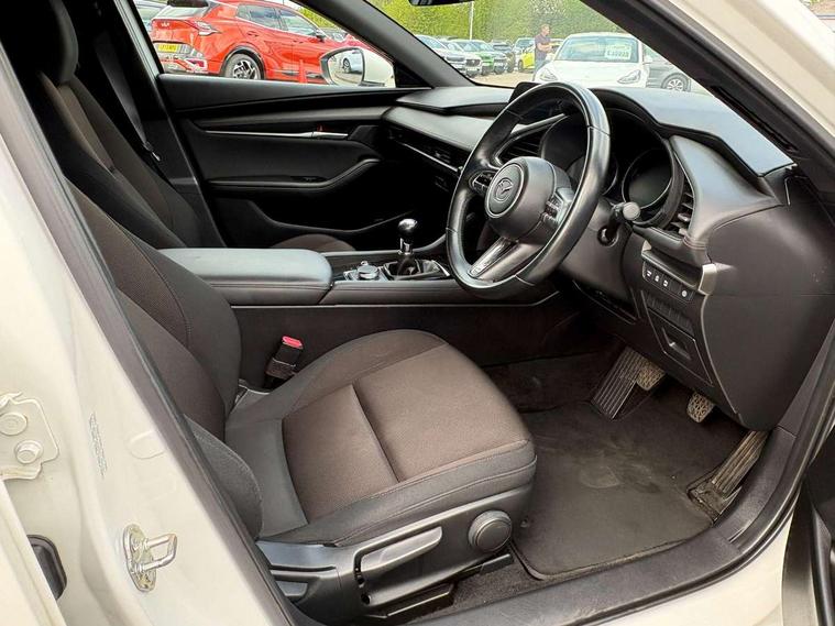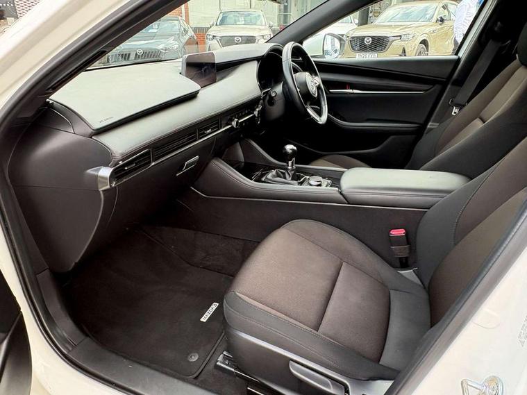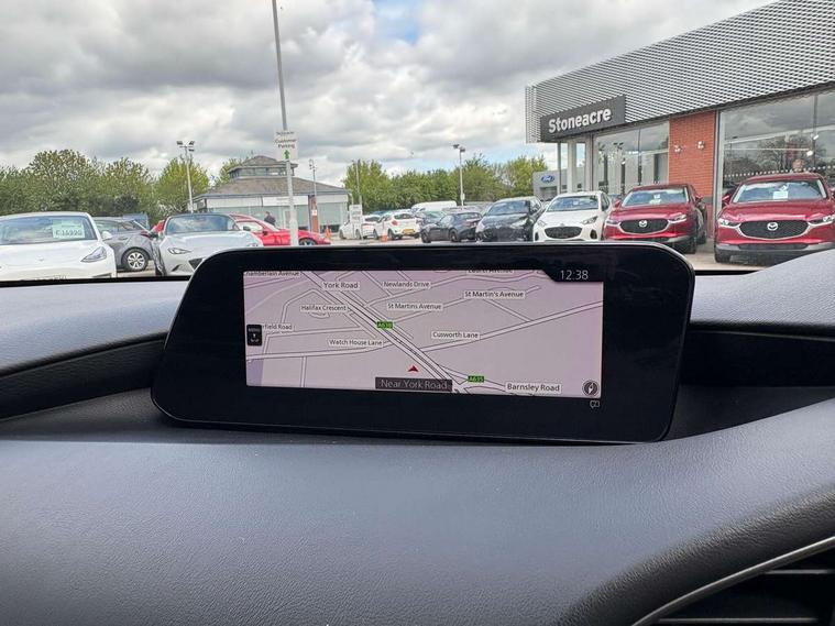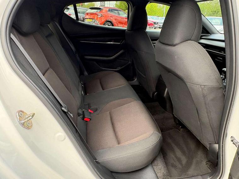 7" colour TFT display, 8.8" Colour centre touch screen display with Mazda Connect infotainment, Apple car play/Android Auto, Audio transfer from bluetooth devices, Blind spot monitoring with rear cross traffic alert, Colour active driving display inc Windscreen projected, Traffic Sign Recognition, turn-by- turn navigation and Mazda Radar Cruise Control information, Digital instrument cluster, Driver attention alert system, E-call with GPS, Emergency stop signalling system, Engine start/stop button, Head up Display, Integrated bluetooth with steering wheel mounted controls, Intelligent speed assist, Lane keep assist system (LAS) with Lane departure warning system (LDWS), Mazda Navigation System with european mapping, Mazda Radar Cruise Control, Mobile App interface, Multimedia Commander, PAS, Rear parking sensor, Service indicator, Start/stop button chrome surround, Trip computer, Mazda Multimedia System with AM / FM / DAB radio with 8 speakers, Adaptive LED Headlights, Coming/leaving home lighting function, Dark metallic finish signature wing, Daytime running lights, Dusk sensing headlights, Electric front/rear windows with one touch/auto up/down, Electrically adjustable/heated/auto power folding door mirrors with integrated indicators, Frameless auto dimming interior rear view mirror, Front body coloured bumper with black/bright lower bezel, Gloss black mesh grille, Gloss black rear roof spoiler, High beam assist, LED headlamps with auto levelling, LED indicator lights, LED third brake light, Piano black window garnish, Privacy glass with dark tinting on rear side windows and rear window, Rain sensing front wipers, Rear fog lights, Rear gloss black lower moulding, Signature LED lights, Signature LED rear combination lights with LED rear turn lights, Speed adjustable rear wash wiper with intermittent wipe, 60/40 split fold down rear seats, Chrome centre bezel steering wheel, Chrome-plated glovebox handle, Cloth upholstery + front heated with 3 stage setting, Driver, Front passenger and two rear grab handles with coathooks, Driver/passenger sunvisors + vanity mirrors (drivers side with ticket holder), Drivers seat manual slide recline and height adjustment, Electrical power outlet, Folding rear centre armrest with two cup holders, Front and rear courtesy lamps, Front armrest, Front centre console with storage box with tray, lid + 2 cupholders, Front head restraints, Front passengers seat manual slide, recline and height adjustment, Gear shift indicator, Illuminated glovebox, ISOFIX child seat anchorage points attached on outer rear seats, Leather wrapped gear shift knob, Leather wrapped steering wheel, LED interior light, Luggage compartment light, Manual air conditioning, Reach adjustable steering wheel, Storage - glovebox, driver and front passenger door pockets and roof mounted sunglasses holder, Three height adjustable rear head restraints, Tilt/height adjustable steering wheel, USB charging point, 3 point ELR front seatbelts with pretensioners, 3 rear 3 point seatbelts with ELR, Anti-lock braking system (ABS), Drivers knee airbag, DSC - Dynamic Stability Control, Dual front airbags, EBD - Electronic brakeforce distribution, Electronic parking brake with auto disengage function and auto hold function, Front and rear curtain airbags, Front passenger airbag cut-off switch, Front side airbags, Front smart city brake support, G-Vectoring control plus, Hill launch assist, Intelligent Traction Control system, Mild Hybrid system with regenerative braking, Seatbelt reminder for driver/front passenger and rear seats, Tyre pressure monitoring system (TPMS), Auto door lock when driving, Remote central locking + deadlocks, Thatcham accredited alarm and immobiliser, 16" Silver metallic alloy wheels, Emergency tyre repair kit,