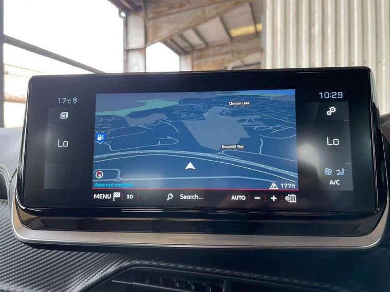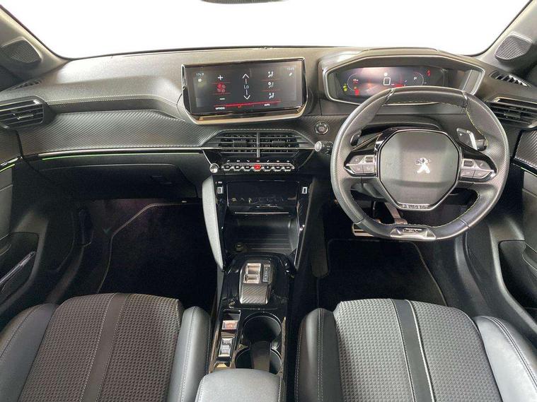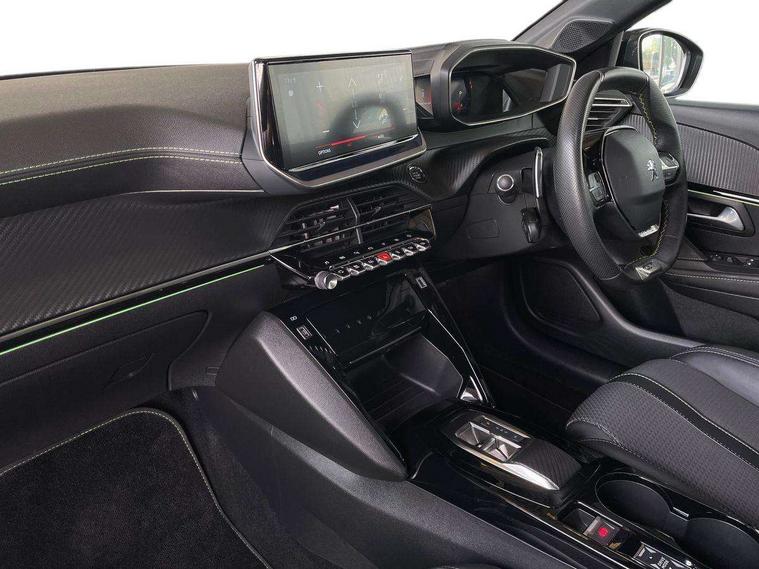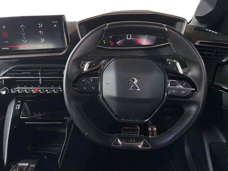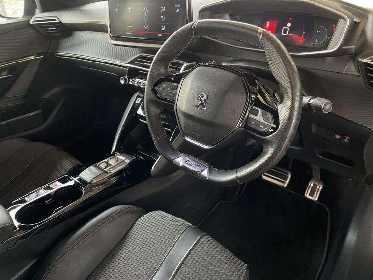 Carbon effect Dashboard, front and rear door panel finish, 17" Camden diamond cut two tone alloy wheels, Space saver spare wheel, Acoustic vehicle alert system (AVAS), Automatic door locking when moving off, Automatic hazard light activation upon heavy brake application, Deadlock, Electronic code immobiliser, Remote central locking, Thatcham cat. 1 alarm with anti lift sensor, 2 front USB socket with USB-C, 2x USB sockets in rear, 6 speakers radio with mp3 compatible, DAB Digital radio, Voice recognition for radio, navigation and telephony features, 3 rear 3 point seatbelts, ABS (Anti-lock Braking System) with EBD (Electronic Braking Distribution) and EBA (Emergency Braking Assistance), Active safety brake with night function/cyclists/pedestrians, Adaptive driver and front passenger airbags with passenger airbag deactivation function, Child locking functionality on rear doors, Driver/front passenger side airbags, Electric parking brake, ESP with Hill Assist, Front and rear curtain airbags, Front and rear disc brakes, Front optimised safety headrests and 3 x rear retractable headrests with height adjustable, Front three point retractable seatbelts with force limiters, Tyre pressure sensor, 2 X Rear number plate lights, Automatic lights, Automatic windscreen wipers, Body coloured exterior door handles, Dark tinted Rear side and tailgate windows, Diamond Black roof, Electric front windows + one touch + anti-pinch, Electric rear windows with one touch/anti-pinch, Electrically adjustable, heated and power folding door mirrors, Extended diamond black rear spoiler, Follow me home headlights, Frameless electrochrome interior rear view mirror, Full LED headlights with smartbeam assist, Gloss black finish on B pillar, Gloss black rear cluster connecting strip, Gloss black wheel arch extensions, Gloss black window surround, GT model designation badging on C pillar, GT model designation badging on tailgate, Headlights left on audible warning, LED daytime running lights with 3 claw headlight with distinctive tooth design, LED side indicator lights integrated into door mirrors, LED third brake light, Model designation badges front and rear, Nera black door mirror shells, Peugeot scuff plates, Radiator grille - Dark chrome chequered and gloss black edge trim, Rear bumper with gloss black finish, Rear full LED 3D peugeot signature claw effect lights with daylight function, Rear lower bumper diffuser effect trim in gloss black, Rear reversing lights, Rear side wing doors, Rear windscreen wiper triggered automatically in reverse gear, Roof mounted aerial with fin design, Roof spoiler, Single exhaust tailpipe, Tailgate with heated rear windscreen and wiper blade, Variable front intermittent wipers, 1/3 to 2/3 split folding rear seats, 12V socket, 3 seat bench in 2nd row, 8 Colour personalisable ambient lighting, Aluminium pedals and foot rest, Automatic air conditioning, Automatic gear lever in full grain leather and satin chrome, Driver and front passenger seat manual adjustment in longitudinal and back rest angle, Driver and front passenger seat mechanical height adjustment, Driver and front passenger sport seats, Electric power steering with reach and rake adjustable steering column, Front and rear carpet mats in black with lime green stitch detail, Front centre armrest with storage compartment, Front LED interior light with 2 reading spotlights and rear interior light with timer, High centre console with 2 cup holders, ISOFIX child seat mounting points on passenger seat, Lime green contrast stitching to armrest, front centre console, door panels and dashboard facia, Map pockets on the backs of the front seats, Mistral full grain perforated leather steering wheel with aikinite stitch detail and satin chrome 'GT' emblem, Paddle shifts, Piano keys gloss black plated toggle switches to access main functions of the vehicle, Piano keys gloss black plated toggle switches to access touchscreen functions, Push button finished in black with chrome circle, Rear centre headrest, Roof lining - Mistral black, Seatbelt unfastened on the move audible and visual alert for front and rear seats, Single front passenger seat, 10" Capacitive colour touchscreen with connected 3D navigation, Blind spot monitoring, Bluetooth telephone facility, Driver attention warning, e-Toggle driving selector, Exterior temperature indicator with ice warning, Mirror screen with mirror link, apple carplay and android auto, Multi function trip computer, Peugeot connect SOS and assistance, PEUGEOT i-Cockpit with compact steering wheel, PEUGEOT i-Cockpit with configurable 3D headup instrument panel, Push button start, Smart phone docking station, Speed limit recognition and recommendation, Start/stop system, Visio park assist 180 with colour reversing camera + front and rear parking sensor,
