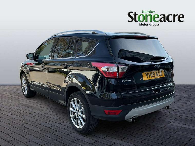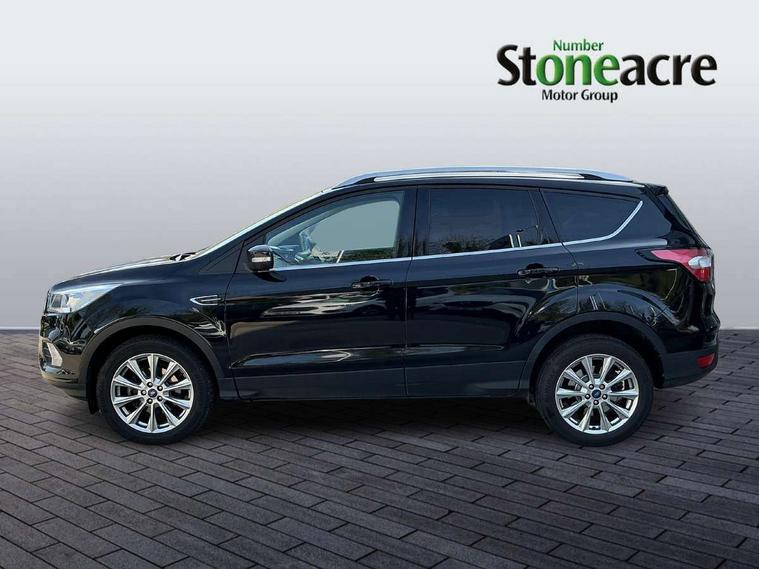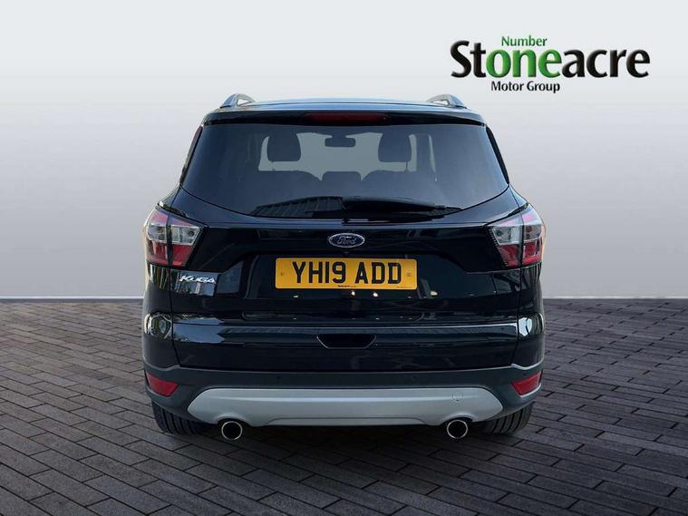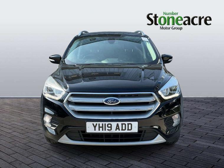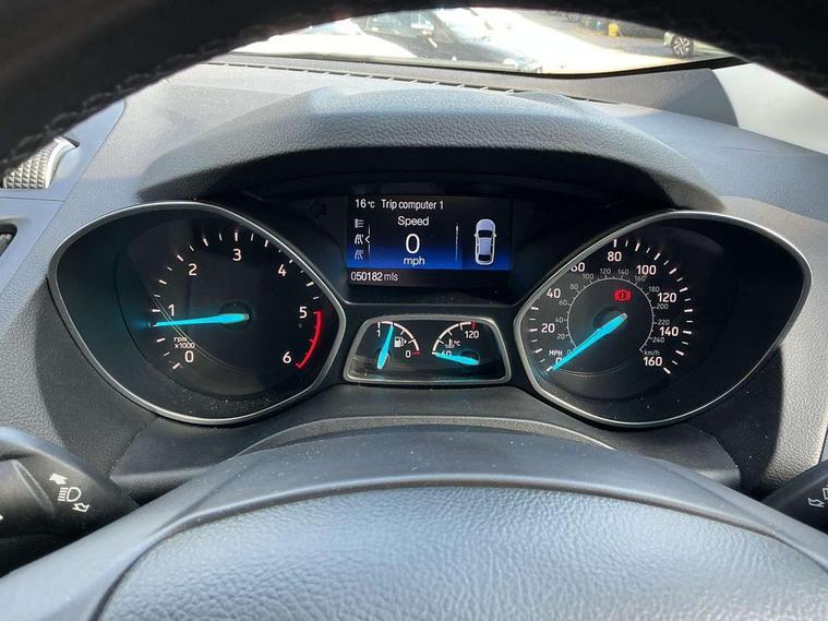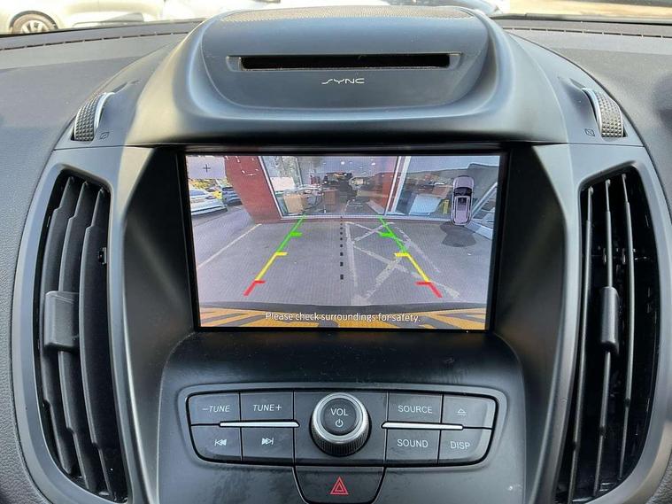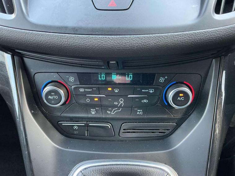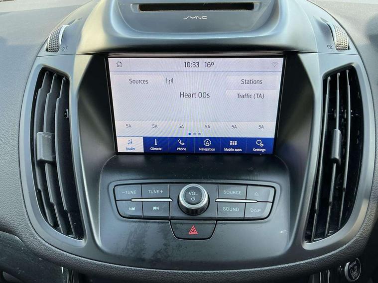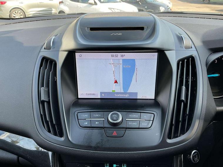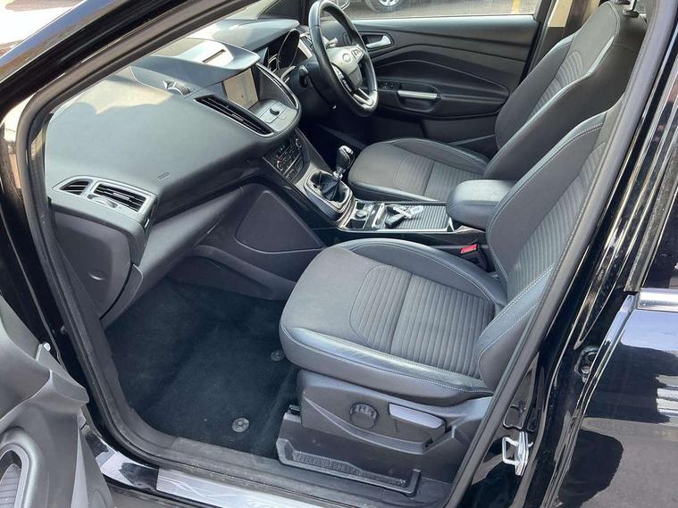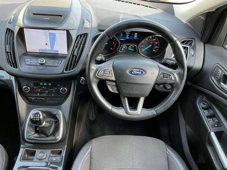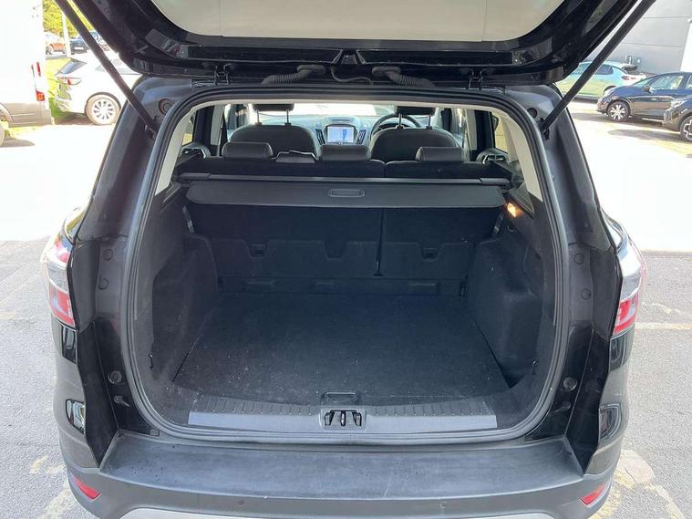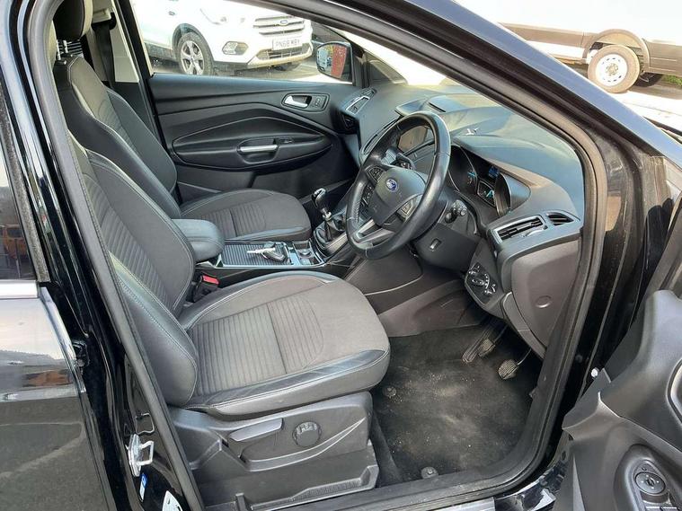 Appearance pack - Kuga, Mini steel spare wheel, Immobiliser, Keyless entry, Keyless start with 'Ford Power' starter button, Locking wheel nuts, MyKey system, Remote central locking, Thatcham Cat.1 alarm, Auxiliary socket for external device, Remote audio controls on steering wheel, USB connection, 3 point seatbelts on all 3 rear seats, ABS/EBD, Airbags - front driver/passenger, front and rear curtain, Drivers knee airbag, EBA, Electric traction assist system, Electronic Stability Programme, Front passenger airbag deactivation switch, Hill start assist, Intelligent Protection System (IPS), Tyre pressure monitoring system, Auto dimming rear view mirror, Body colour bumpers, Body colour rear spoiler, Electrically operated and heated door mirrors with side indicators, Electrically operated front and rear windows with global closing, Front fog lights, Front scuff plate, Power folding door mirrors, Quickclear heated windscreen, Rain sensor windscreen wipers, Tailgate wash/wipe, Twin exhausts and rear diffuser, 6 way manually adjustable passenger seat with lumbar support, 60/40 split/folding rear back and cushion, Auxiliary power socket in luggage area, Centre console with stowage tray/bottle holder/CD stowage/front and rear 12V power point, Driver/passenger front seatback pockets, Dual electronic automatic temperature control, Folding rear centre armrest, Footwell courtesy lights front and rear, Front floor mats, Front head restraints, Front overhead courtesy lights with theatre style dimming and delay, Front/rear reading lights, Isofix system on outer rear seats, Leather steering wheel and gear knob, Multi-colour ambient interior lighting, Part leather upholstery, Reach + rake adjustable steering column, Rear floor mats, Rear head restraints, Sports style front seats, Stowage unit in upper instrument panel, Tie down hooks, Tonneau cover, Variable intensity instrument illumination, Apple car play/Android Auto, EPAS, Hands free telephone, Trip computer,