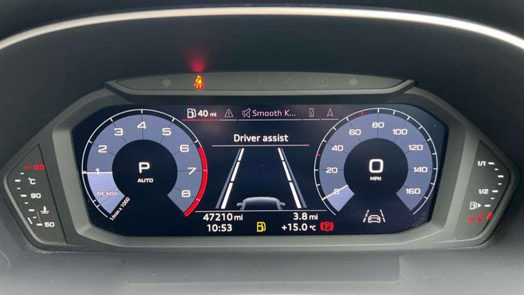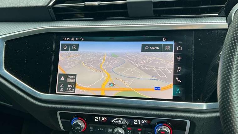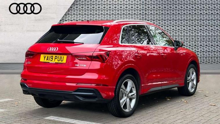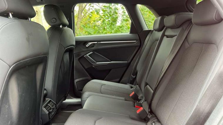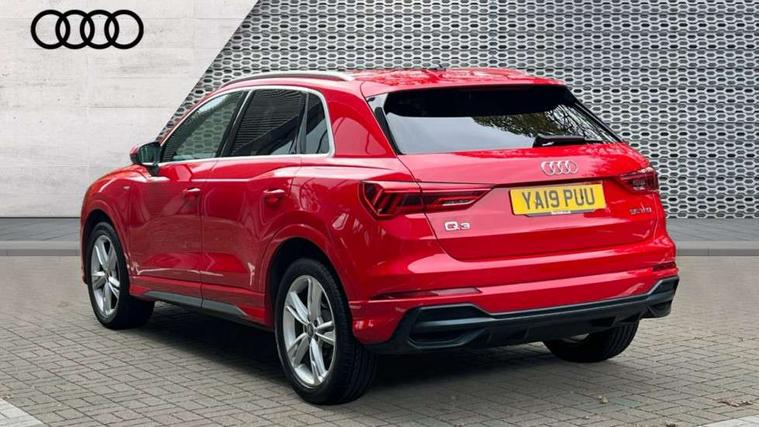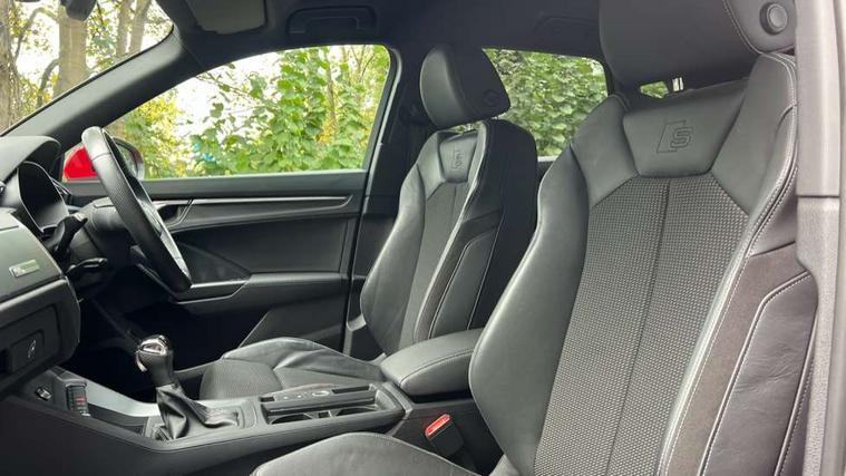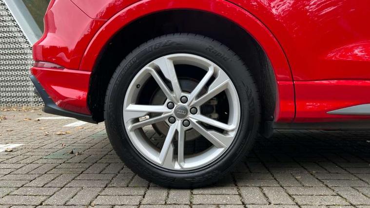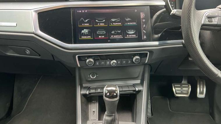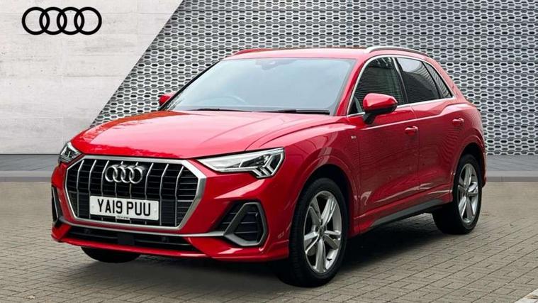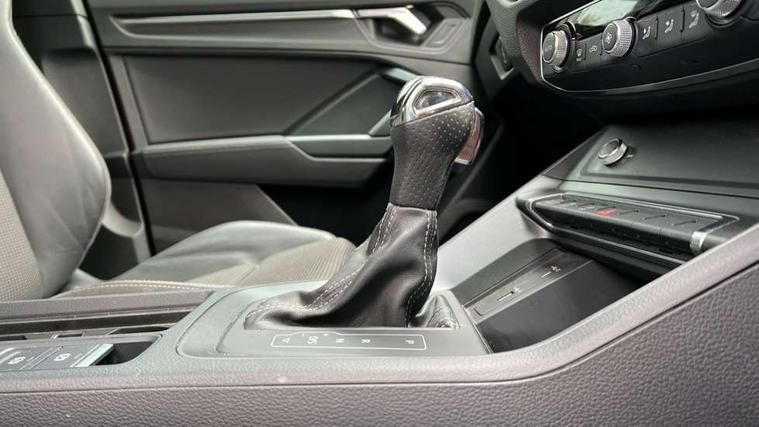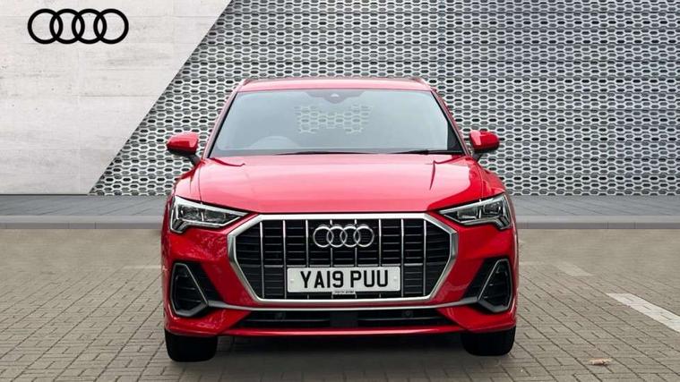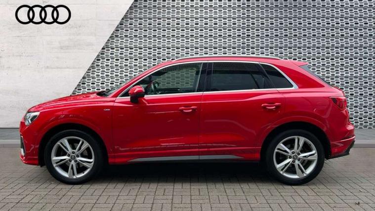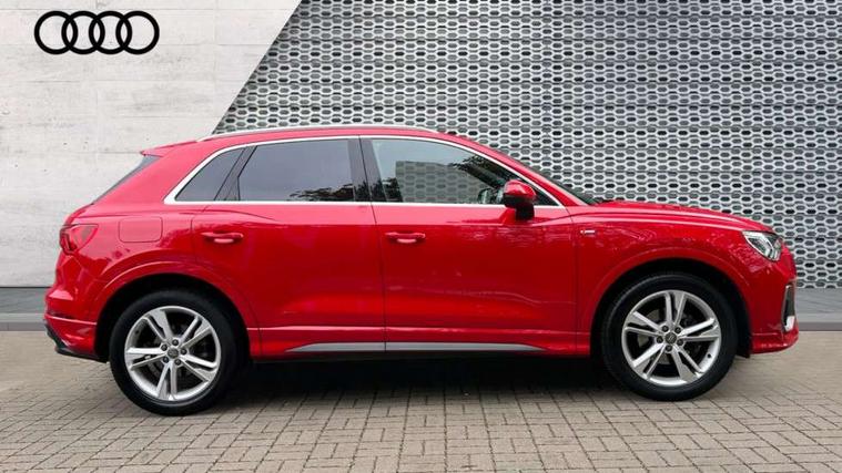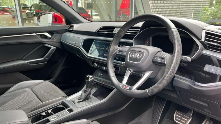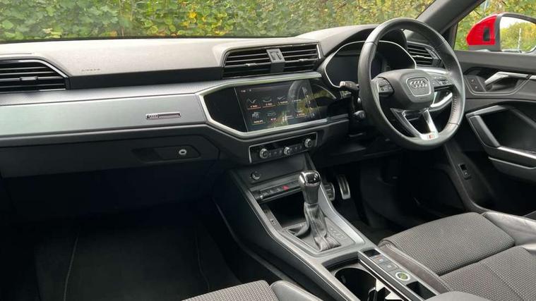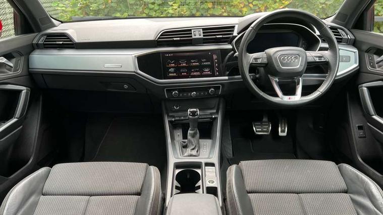 Dark matt brushed aluminium inlay, MMI touch colour display in gloss black with aluminium surround, Non smoking pack - Q3, Tyre repair kit, Anti theft alarm, Anti theft wheel bolts, Remote central locking, 1 x USB type C and 1 USB type A charging points, 6 speakers, DAB digital radio module, 3x3 point rear seatbelts, 6 airbags - Driver, front passenger, curtain and side windows, Audi pre-sense front with pedestrain and cyclist recognition, Electrically operated child locks on rear doors, Electromechanical parking brake, Electronic stabilisation control including ABS, ASR and EDL, Hill hold assist, Pre sense basic, Seatbelt monitoring, Tyre pressure warning, Warning triangle and first aid kit, Acoustic windscreen, Aluminium roof rails, Aluminium window trim, Auto dimming rear view mirror, Body coloured bumpers, Diffuser in matt Platinum grey, Electrically adjustable and heated door mirrors with integrated LED side indicators, Front and rear electric windows, Front fog lights, Front side air inlets in matt platinum grey, Front spoiler blade in matt platinum grey, Grille vertical bars in aluminium silver/Matt, High gloss black finish B and C pillars, LED headlights with LED daytime running lights and dynamic rear indicator, LED rear lights, Privacy glass, Rain and light sensors, Rear diffuser strip in matt titanium black, S Line badge on wings, S Line front and rear bumpers, Side skirt insert in matt Platinium grey, Titanium black radiator grille, 12V socket in rear centre console, 40:20:40 split folding rear bench seat, Adjustable rear seat bench/backrest with centre armrest and cupholder, Aluminium door sill trims, Black cloth headlining, Dual zone climate control, Front and rear black floor mats with contrast stitching in rock grey, Front and rear headrests, Front centre armrest with storage compartment and angle adjustment, Illuminated door sill trims with S logo, ISOFIX child seat mounting and Top Tether with front passenger airbag deactivation, Manual front seats with height adjustment, Perforated leather gearknob, Stainless steel luggage compartment sill finisher, Stainless steel pedals, Tool kit, Audi connect safety and service (e-call), Audi drive select, Audi lane departure warning, Audi side assist, Audi smartphone interface, Bluetooth interface, Camera based traffic sign recognition, MMI navigation plus with MMI touch, Power opening/closing tailgate, Progressive steering, Rear parking sensors, Service interval indicator, Stop/start system, Voice control system, Sports suspension,