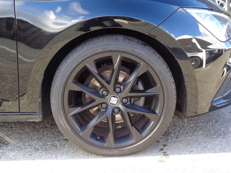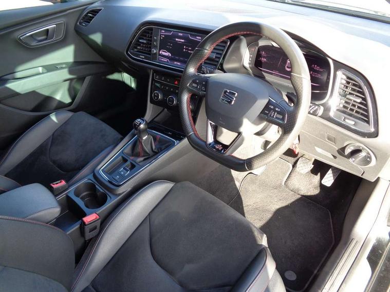 Chrome interior detailing, Convenience pack+ - Leon, Winter pack - Leon, 2 folding remote keys with window open/close function and boot opening/door mirror folding function, Central locking fuel filler cap, Engine immobiliser, Locking wheel bolts, Remote central locking + deadlocks, Volumetric alarm with back up horn, Auxiliary input socket, SEAT USB media cable, 3 point seatbelts on all rear seats, ABS, traction control system, electronic stability control, Child proof door locks, Driver and front passenger airbags with front passenger airbag de-activation, front side, curtain, driver knee airbags, EBA, Electric handbrake, Electronic parking brake with auto hold, Front seatbelt pretensioners, Front seatbelt reminder, Hill hold control, Multi-Collision braking, Tyre pressure monitoring system, Black front grille, Body colour door handles, Body coloured bumpers, Dark tinted rear windows, Electric folding door mirrors, Electric front/rear windows, Electrically adjustable and heated door mirrors, Exclusive FR front and rear bumpers, Full LED headlights with LED day time running lights + LED rear tail lights + LED licence plate lights and LED front and rear fog lights, High gloss black finish B and C pillars, Illuminated aluminium front door sill with FR logo, Matt black door mirrors with integrated LED indicators, Matt black front grille frame, Rear wash/wipe, Visible twin exhaust tailpipes, 12v power point in centre console, 60/40 split folding rear seat with armrest, Additional heating and ventilation outlet in rear of centre console, Black interior roof, Boot storage net, Cargo rings in boot, Driver and passenger seat height adjust, Driver and passenger sun visor, covered and illuminated mirror, driver sun visor with card holder, Driver seat lumbar adjustment, Dual zone climate control, Dust/pollen filter, Flat bottomed perforated leather steering wheel with red stitching and FR logo and leather gear knob, Front and rear head restraints, Front centre armrest with storage compartment, Front cupholders x 2, Front passenger seat lumbar adjustment, Front seatback storage pockets, Front sport seats in microsuede, Front/rear floor mats, Height adjustable front and rear headrests and third rear headrest, Height/reach adjust steering wheel, High centre console with integrated box & cup holder, rear air outlet, with armrest in front seats, ISOFIX points in outer rear seats with top tether anchorage points, Luggage tie-down hooks, Multi-colour ambient interior lighting, Storage box under drivers and passenger seat, Digital cockpit, Electro-mechanical power steering, Front and rear parking sensors, Front assist with pedestrian protection, Full Link Smartphone Integration with Mirror Link, Apple Car Play, Google Android Auto with USB cable for Apple and Android compatibility, Media system plus with 8" display, 4 USB, 8 speakers, CD, voice control, DAB, bluetooth and handsfree, steering wheel mounted audio and phone control, Navigation system 3D map display, high resolution colour driver display, two SD card slots, RPM, trip computer, outside temp gauge, instrument light brightness, low fuel warning light, lights on reminder, gearshift indicator, SEAT drive profile with 4 modes (Eco/Normal/Sport/Individual), throttle response, SEAT logo boot release, Service interval indicator, Lowered sports suspension, XDS electronic differential lock,