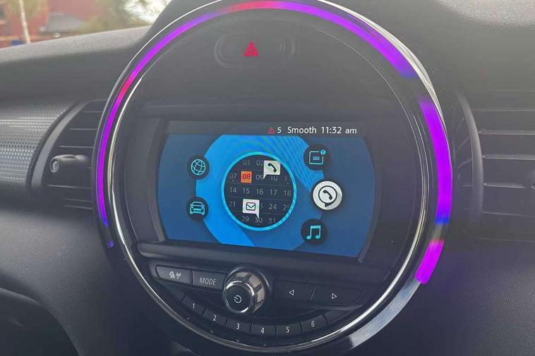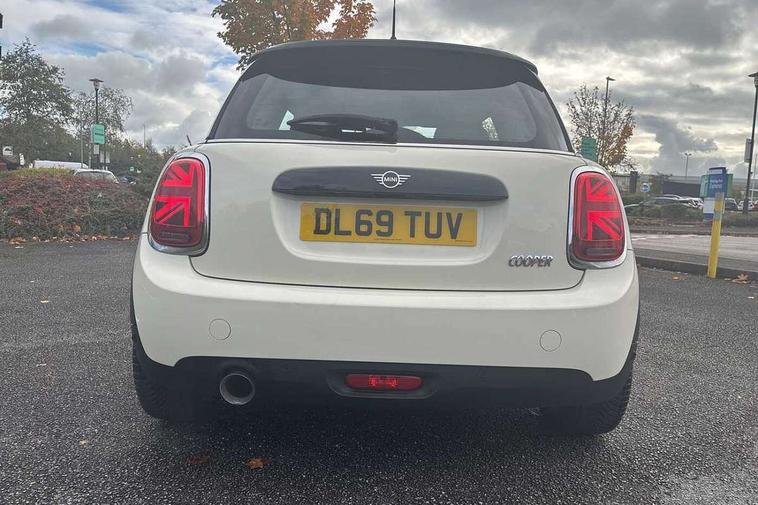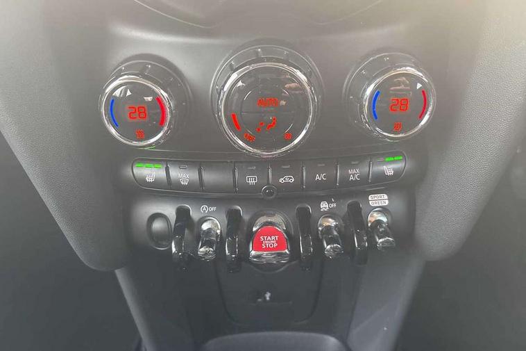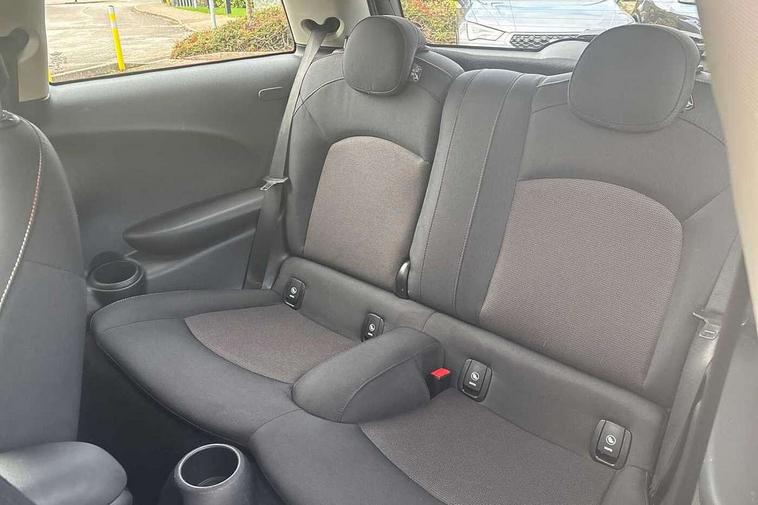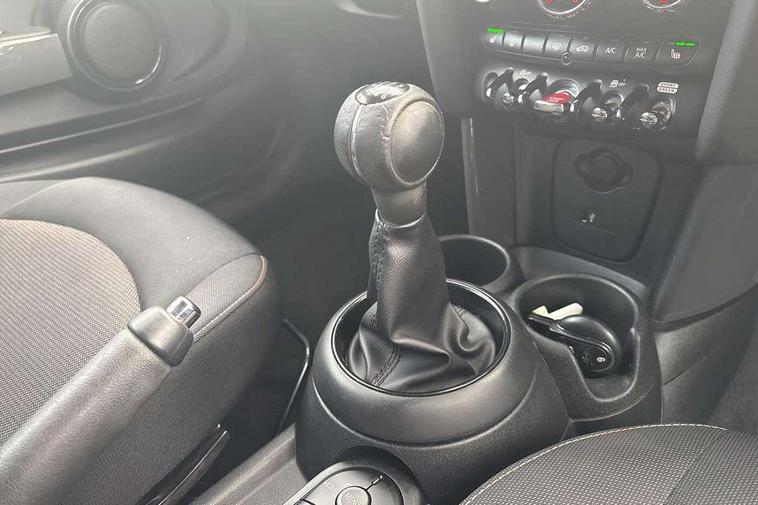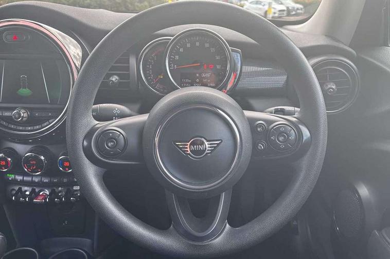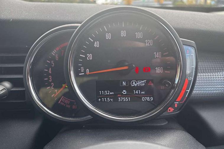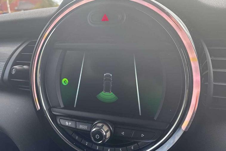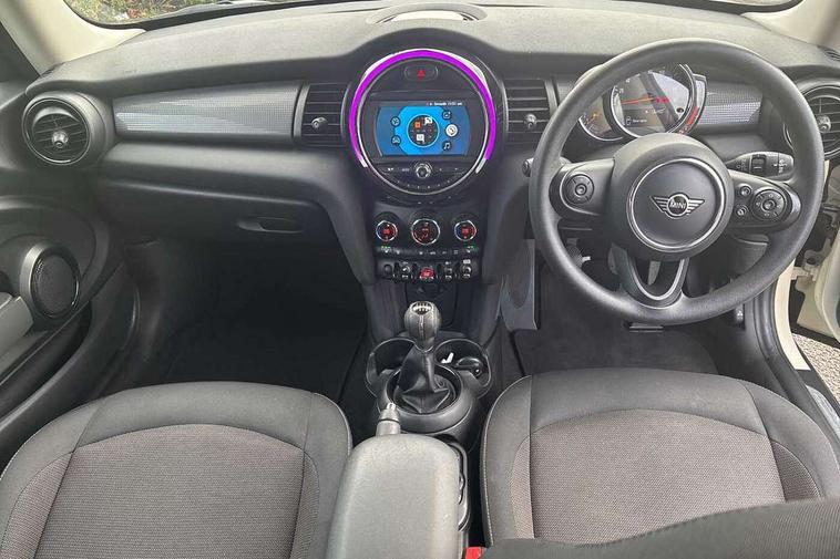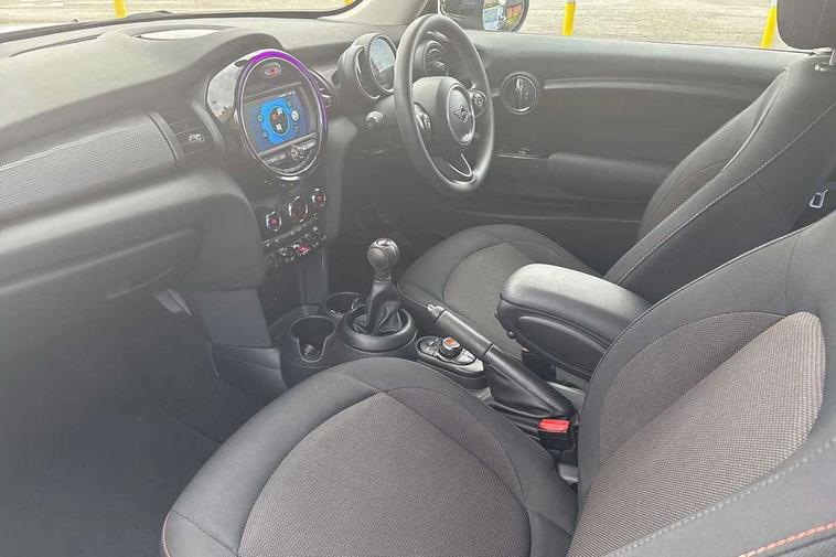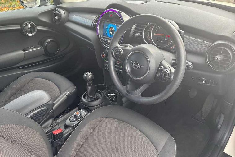 Alarm system with tilt sensor, monitoring doors, bonnet interior and tailgate, Electronic vehicle immobiliser, Start/stop toggle with keyless go, 6.5" touchscreen with LED ring, FM tuner and DAB digital radio, 3 point seatbelts on all four seats, 6 Airbags - front, side, head and seat belt tensioners, Anti-lock braking system (ABS), DSC - Dynamic Stability Control, Front and rear disc brakes, Hill start assist, Single tone fanfare horn, Tyre pressure monitoring system, Automatic headlight activation switch, Body colour fuel filler cap, Chrome border high gloss black slats radiator grille, Dynamic brake lights, Electric front+rear windows, Heated rear window, Heated windscreen washer jets, LED headlight with closed ring and daytime driving lights, Left exhaust tailpipe with chrome finisher, Metal door sill strips with MINI imprint, Model logo Cooper on right of tailgate, Rain sensor window wipers, Rear fog lights, Rear LED lights with union jack design, Rear window wiper, Side scuttle panel with integrated indicator, Sun/heat protection glass, White indicator lenses, 12V Accessory socket in centre console, 4 lashing eyes in luggage compartment, 60/40 split folding rear seat, Chrome interior highlights, Colour line - Carbon black, Cupholders, Front and rear head restraints, Front and rear isofix with front passenger airbag deactivation, Glove compartment, Height and length steering column adjustment, Interior lighting with 12 basic colours selectable via toggle switch in roof, Leather gearshift lever and handbrake gaiters, LED reading lights, vanity mirror lights, front foot well light and spotlight on front seats, Manual air conditioning, Mechanical seat adjustment, driver seat height adjust, forward/back and front seats backrest, Mini logo projection on floor from drivers exterior mirror, Multifunction steering wheel, Satellite grey headlining, Storage compartments in doors, Sunvisors with vanity mirrors, Tool kit, Automatic start/stop function with brake energy recuperation, Compatible mobile phone bluetooth with audio streaming, Electro-mechanical speed dependant steering assistance, Instrument cluster, Mini E-call, MINI TeleServices, On board computer, Service interval indicator, Double Vanos system, Fully variable valve control, High precision injection,
