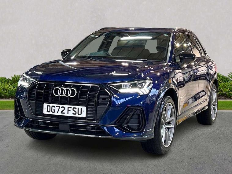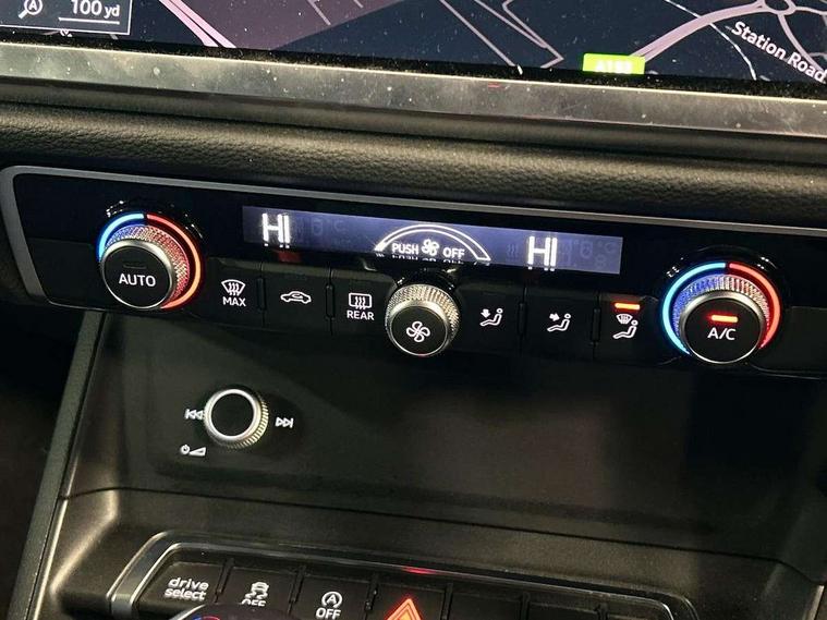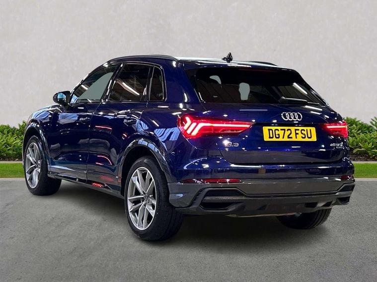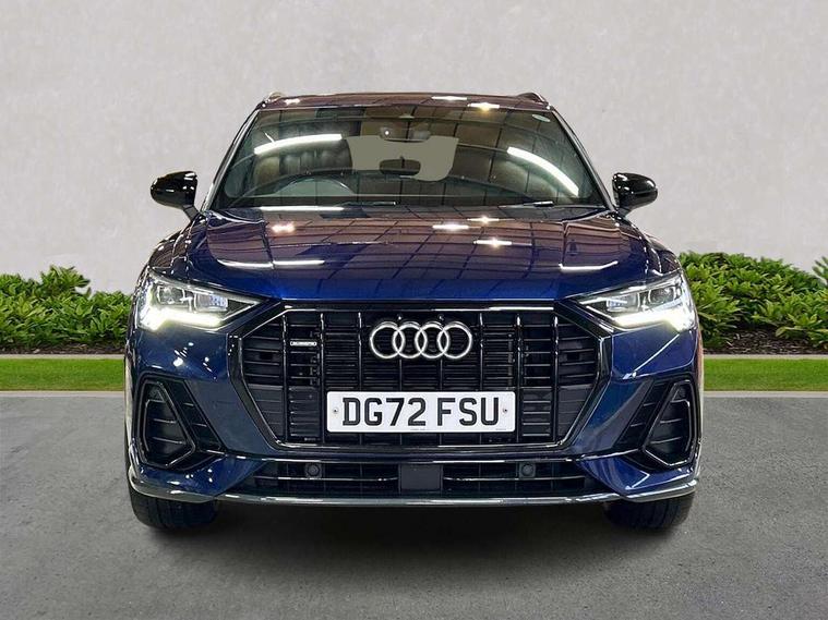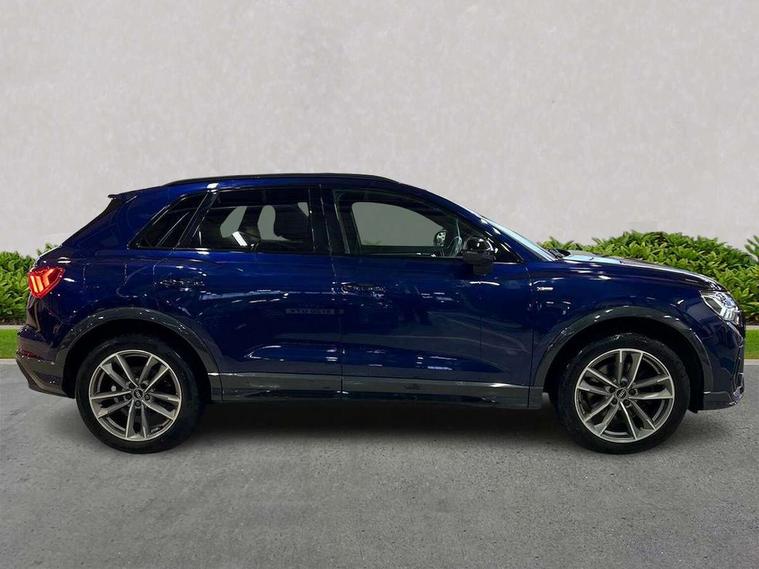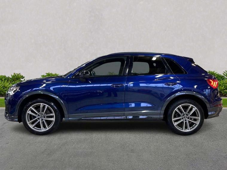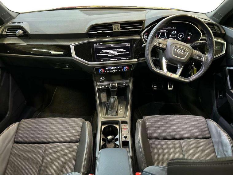 Detail dashboard around MMI touch colour display in glass look, black with surround in aluminium look, Leatherette door armrest, Piano black inlay, Ambient lighting pack - Q3, Black styling pack - Q3, Non smoking pack - Q3, Anti theft alarm, Anti theft wheel bolts, Immobiliser, Remote central locking, 2 USB-C ports with charge and data functions, 6 passive loudspeakers, DAB digital radio module, 3x3 point rear seatbelts, 6 airbags - Driver, front passenger, curtain and side windows, Audi pre-sense front with pedestrain and cyclist recognition, Electrically operated child locks on rear doors, Electromechanical parking brake, Electronic stabilisation control including ABS, ASR and EDL, Front seatbelt reminder, Hill descent control, Hill hold assist, Pre sense basic, Seatbelt monitoring, Tyre pressure warning, Warning triangle and first aid kit, Acoustic windscreen, Auto dimming frameless rear view mirror, Black roof rails, Electrically folding, adjustable and heated door mirrors with integrated LED side indicators and kerb view function for passenger side, Front and rear electric windows, Front fog lights, Grille vertical bars in aluminium silver/Matt, High gloss black finish B and C pillars, LED Dynamic rear indicators, LED headlights with LED daytime running lights, LED rear lights, LED third brake light, Privacy glass dark tinted rear and rear-side windows (from B-pillar backwards), Rain and light sensors, Rear diffuser grille in grained matt black, Rear diffuser strip in matt titanium black, Rear side wing doors, Rear wiper, S line bumpers in contrasting Manhattan grey, Variable front intermittent wipers, 12V socket in rear centre console, 3 seat bench in 2nd row, 40:20:40 folding with manual adjustment for 60:40 forwards/backwards position and backrest angle, Adjustable rear seat bench/backrest with centre armrest and cupholder, Black cloth headlining, Dual zone electronic climate control, Front and rear black floor mats with contrast stitching in rock grey, Front and rear headrests, Front and rear roof module including reading lights, Front centre armrest, Glove compartment lighting, Height and reach adjustable steering wheel, Illuminated door sill trims with S logo, ISOFIX child seat mounting for front passenger with airbag deactivation and outer rear seat including top tether attachment point for outer rear seats, Luggage compartment light, Manual front seats with height adjustment, Perforated leather gearknob, Single front passenger seat, Stainless steel luggage compartment sill finisher, Stainless steel pedals, Amazon alexa Integration, Audi drive select, Audi lane departure warning, Audi smartphone interface includes wireless Apple carplay/Android Auto, Audi Virtual Cockpit - 10.25" display, Bluetooth interface, Camera based traffic sign recognition, Legal emergency call, MMI Navigation Plus with high resolution 10.1 inch touchscreen colour display, Power operated tailgate, Progressive steering, Service interval indicator, Start stop system with recuperation, Voice control system with natural language interaction, Sports suspension,