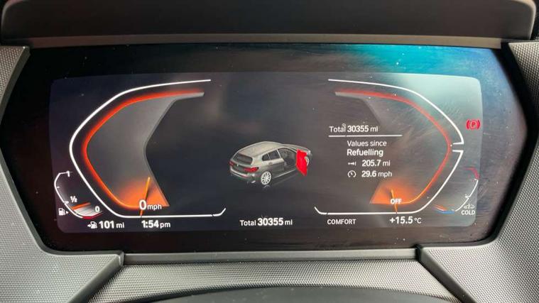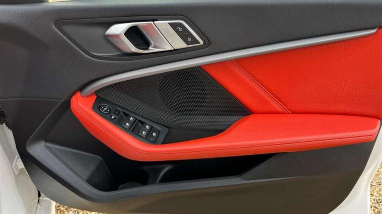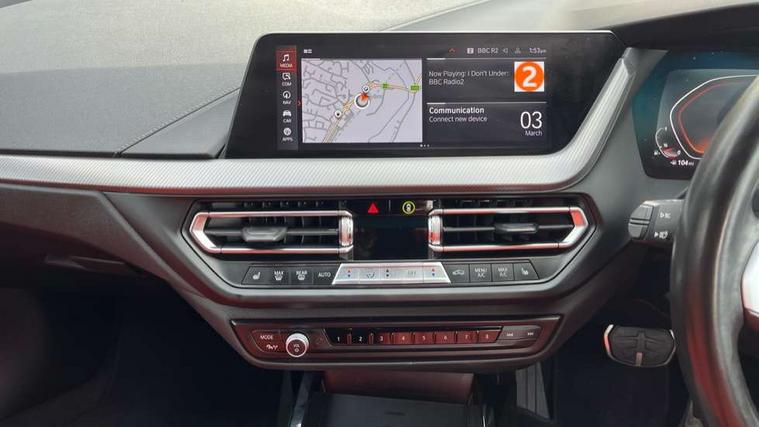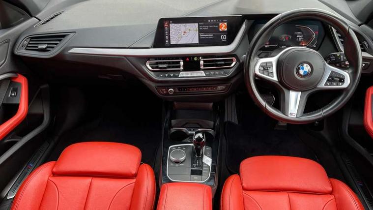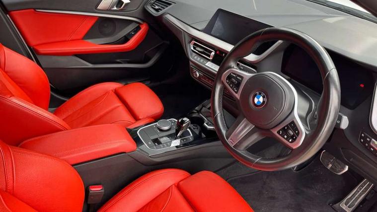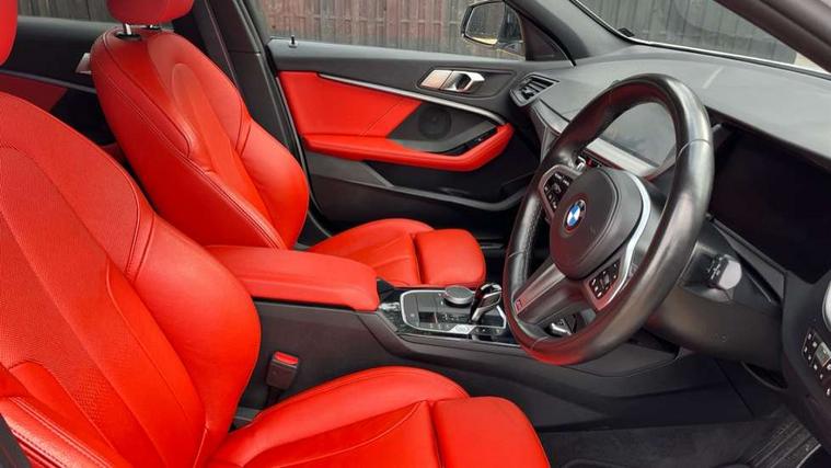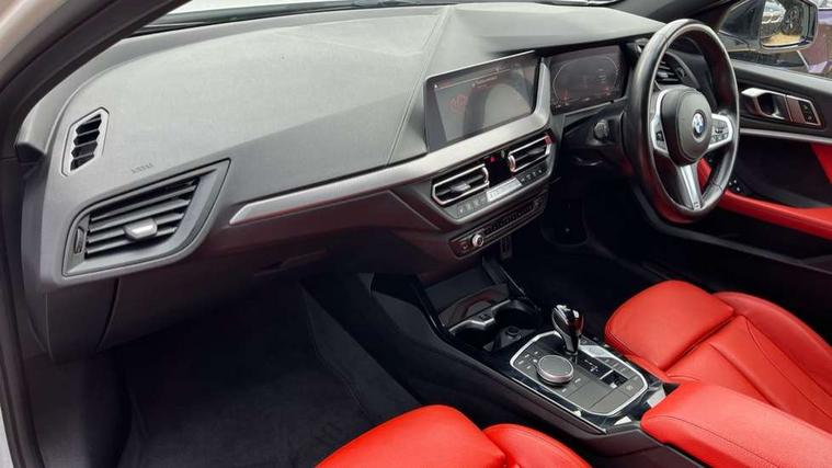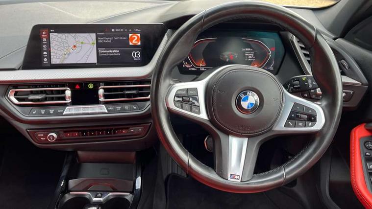 Contrast stitching on instrument panel, Additional interior lighting pack - 1 Series, Connected pack professional - 1 Series, Extended storage pack - 1 Series, Interior lights pack - 1 Series, Luggage compartment pack - 1 Series, M Sport exterior styling aerodynamics pack - 1 Series, Reduced rolling resistance tyres, Automatic drive away locking facility, Central locking switch for all doors, fuel filler cap and luggage compartment, Deadlocking function system to all doors, Locking wheel bolts, Remote control with integrated key with High-gloss Black inlay and M designation and 1 button for open/ close lock, window, open luggage compartment, Start/stop button with comfort go keyless engine start and auto start stop deactivation button, Thatcham Cat.1 alarm and immobiliser, Bluetooth audio streaming, DAB Digital radio, 2 tone horn, 3 point seatbelts on all seats, front pyrotechnic belt tensioners, stopper and belt force limiters, rear coded belt buckles, Airbags - front driver/passenger, front & rear curtain, front side, Anti lock braking system (ABS) with brake assist, BMW emergency call, Brake drying, Braking readiness, Crash sensor activating central locking release, hazard warning lights, fuel cut off, interior lighting + activation of safety battery terminal clamp, Driver and front passenger seat belt security check, Dynamic stability control + (DSC+), Dynamic Traction Control - DTC, Electrically operated hand brake, Front and rear disc brakes, Front passenger manual airbag deactivation, Seatbelt warning, Side impact protection, Tyre pressure monitoring system, Warning triangle and first aid kit, Auto dimming rear view mirror, Automatic headlight beam throw control, Automatic windscreen wipers and automatic headlight, Body colour door handles, Body colour mirror caps, Chrome 'M' logo side designation, Chrome exhaust tailpipe in single, round (Exhaust tailpipe, stainless steel - single, round), Chrome kidney grille frame with Satin Aluminium struts, Direction indicator side lights in exterior mirrors, Electric folding and anti dazzle exterior mirrors, Fading support, Follow me home headlights, Front and rear bumper system with replaceable deformation elements, Front and rear electric windows with open and close fingertip control, anti trap facility and comfort closing, Front door sill finishers in black plastic with M designation in metallic look, Green tinted heat protection glazing, Heated, electrically adjustable exterior mirror aspheric on driver side, convex on passenger side, High gloss shadowline window frame, Recess cover mirror frames and B/C pillar embelisher trim, High level third brake light, LED daytime running lights, LED eyebrow turn indicators, LED front fog lights, Lightweight engineering, Matt black air guide grilles, Model designation on right side of tailgate, Nearside reverse light in rear light cluster, Preparation for high beam assistant, Rain sensor including auto headlights activation, Rear fog lights, Rear window wiper, Shark fin antenna, Visible VIN plate, Welcome lighting, 12V power socket in centre console, 3 rear seat head restraints, 3 spoke M sports design leather steering wheel finished in nappa leather with specific M badge, Anthracite headlining, Anthracite Velour floor mats, Child seat ISOFIX attachment for two outer rear seats and front passenger seat with anchorage points, Conditioned based service, Dakota leather upholstery with perforation and contrast stitching, Driver and front passenger seat heating, Folding rear clothes hook, Four grab handles integrated in roof lining, Front and rear door pockets, Front and rear door pockets with bottle holders, Front and rear side armrest integrated into door trim, Front armrest foldable with integrated storage compartment, Front sports seats with electric side bolster adjustment, Glove compartment, Height adjustable front head restraints, Manual adjust steering wheel, Multi-function controls for steering wheel, Storage compartment in centre console, Sun visors with vanity mirrors and insert tab, Two zone automatic air conditioning, Active guard plus, Attentiveness assist, BMW Online services, BMW Teleservices, Check Control warning system for monitoring of lights and door/luggage compartment open warning, Connected eDrive Services, Eco pro mode, Integrated owners handbook, Oil sensor for level and grade, On board computer, Optimum shift indicator, Personal Profile, Pull away assistant, Speed limiter, Aluminium lightweight construction, Anti roll bar front and rear, Balancer shaft, Double VANOS, Drive Performance Control, Electronic differential lock, High precision injection, M sport suspension, Petrol Particulate Filter, VALVETRONIC engine management,