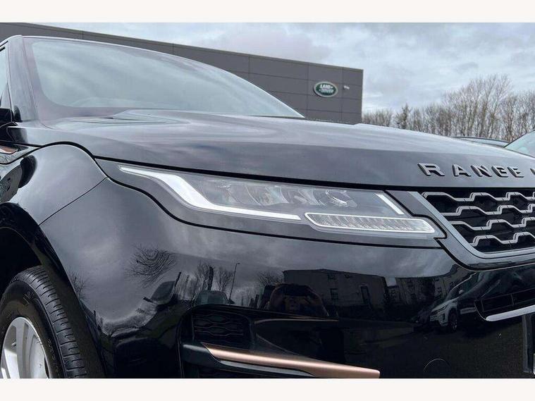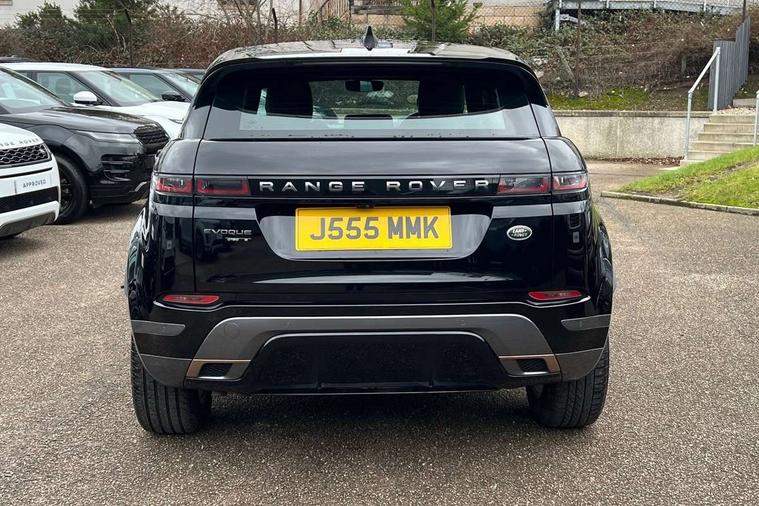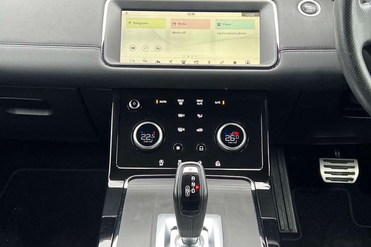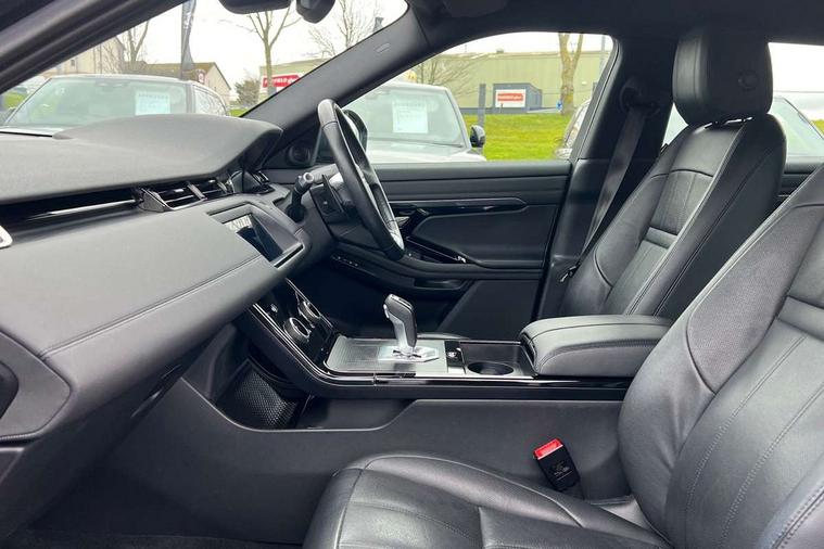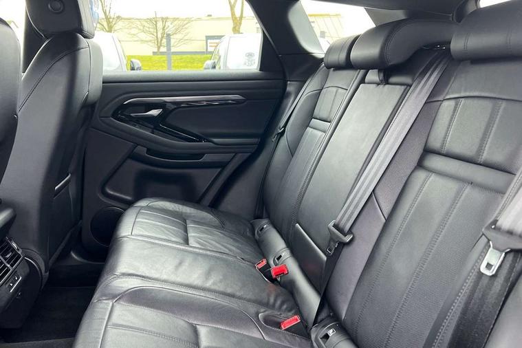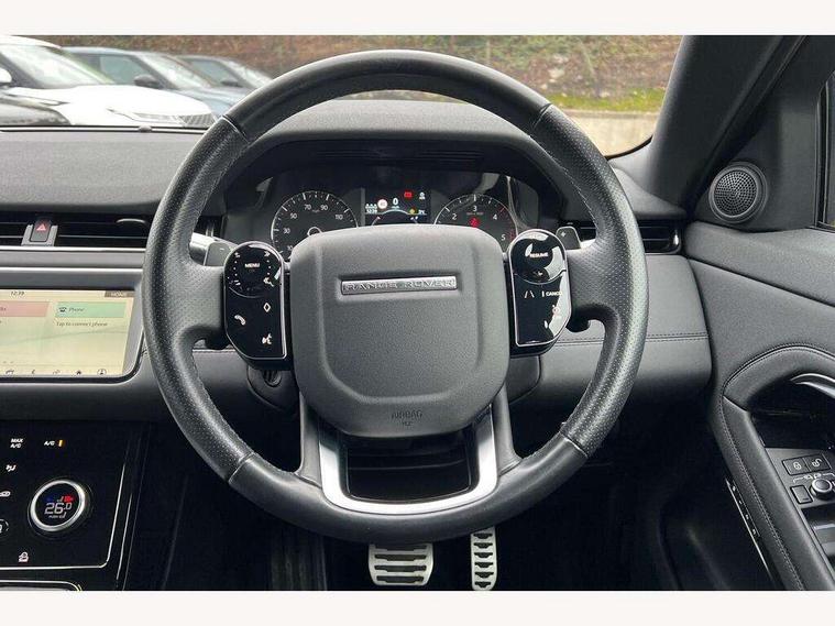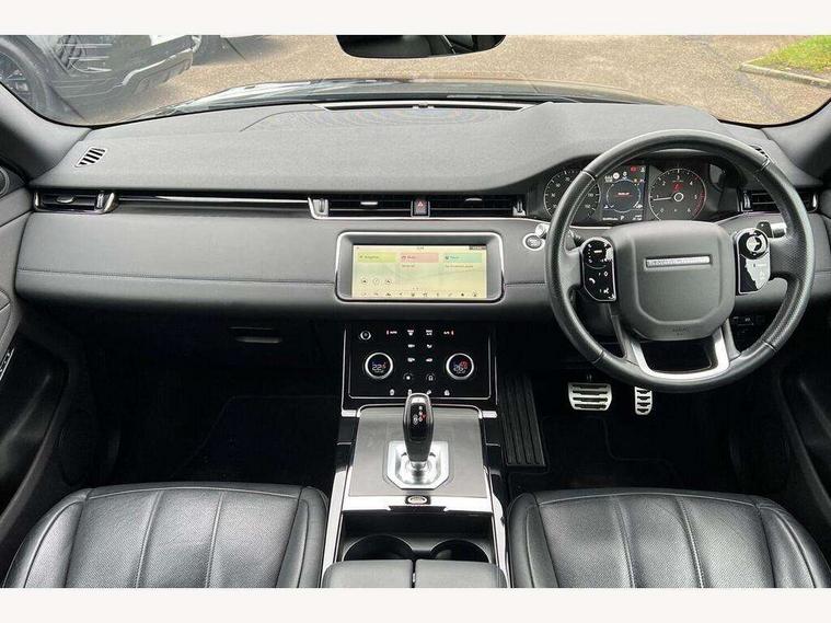 Alarm, Immobiliser, Intrusion sensor, Locking wheel nuts, Digital Audio Broadcast radio-DAB, Steering wheel mounted controls, Anti-lock braking system (ABS), Customer configurable autolock, DSC - Dynamic Stability Control, Electronic brake force distribution, Electronic parking brake, Electronic traction control, Front and rear seatbelt reminder, Hill descent control, Hill launch assist, Low traction launch, Power operated child locks, Roll stability control, Six airbags - Driver and passenger airbags/driver knee airbag/front side airbag and curtain airbags, Torque vectoring brake, Tyre pressure monitoring system, Electric windows with one touch open/close and anti trap, Evoque and R-Dynamic badge, Flush deployable exterior door handles, Heated rear window with timer, Heated washer jets, Heated windscreen, Rain sensing windscreen wipers, Rear fog lights, Shadow atlas bonnet and tailgate script, Tailgate spoiler, 40:20:40 split folding rear seats, Black gearshift paddles, Bright metal pedals, Isofix system on outer rear seats, Overhead lighting console, Overhead stowage for sunglasses, Passive front head restraints, Rear air vents, Rear centre headrest, Sunvisors with illuminated vanity mirrors, Twin front cupholders with cover, Twin sliding front centre armrest, Two zone climate control, Android Auto, Apple car play, Bluetooth connectivity, Brake pad wear indicator warning light, Driver condition monitor, Electronic power assisted steering (EPAS), InControl remote, Land Rover InControl apps, Lane keep assist, Navigation pro system, Pro services and wifi hotspot, Push button starter, Smart settings, Traffic sign recognition with adaptive speed limiter, Voice control system, All terrain progress control, Efficient Driveline, Passive suspension, Terrain Response 2 Auto,