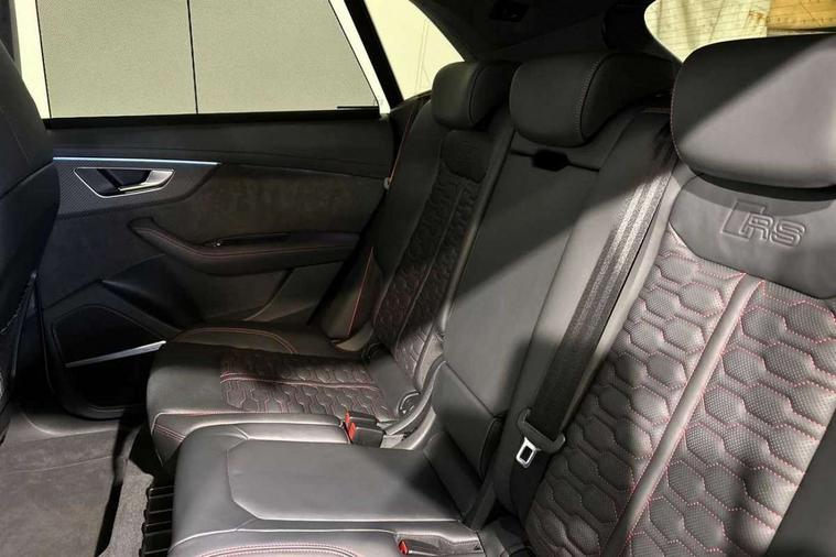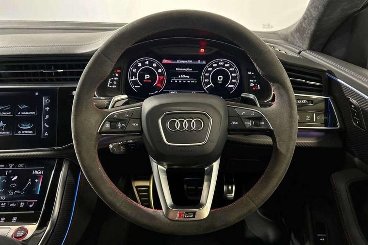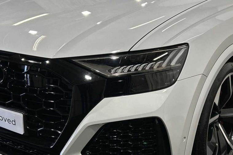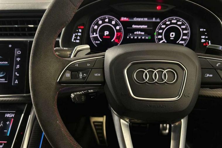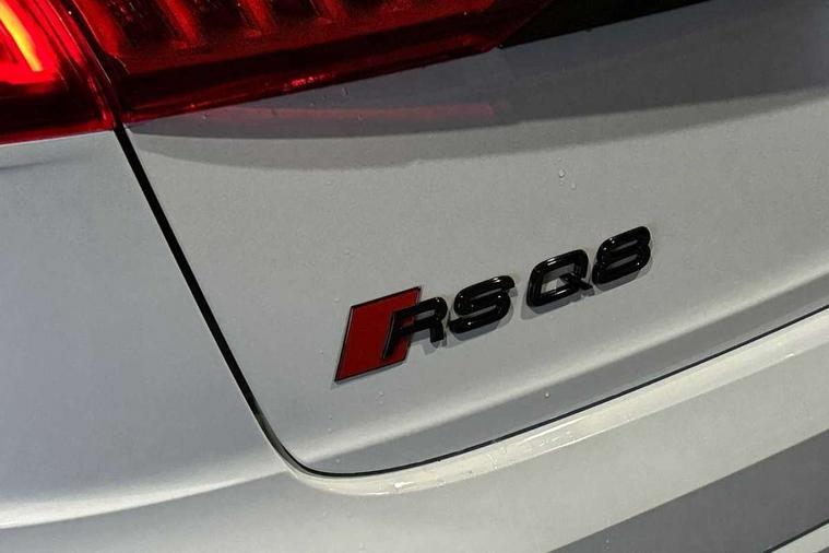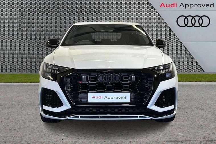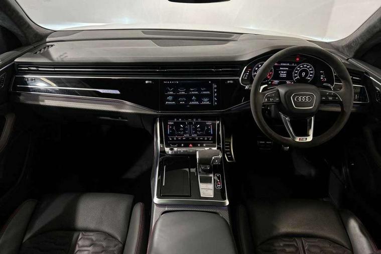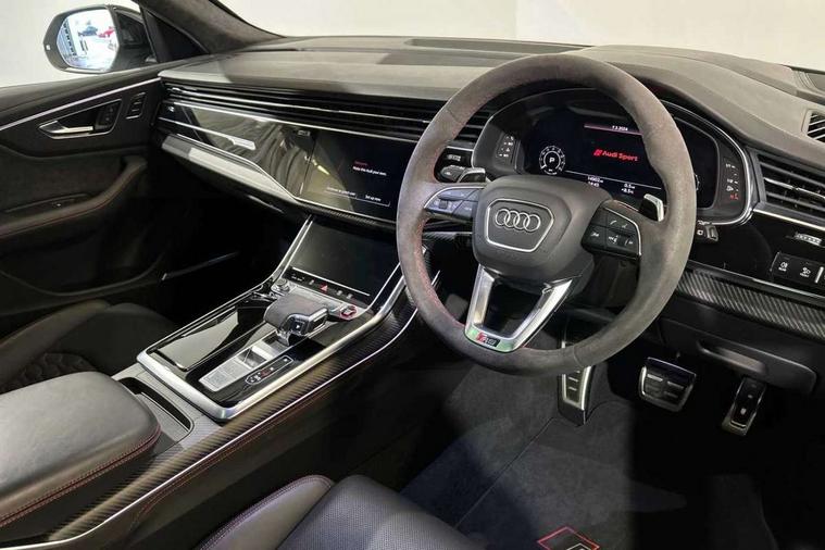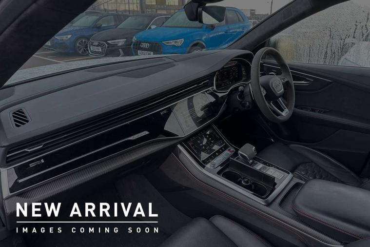 Air quality package - RS Q8, City assist pack - Q8, Comfort and sound pack - RS SQ8, Multi-coloured extended LED interior lighting pack - RS Q8, RS specific styling pack - RS Q8, Titanium black styling pack - RS Q8, Tour pack - Q8, 23" x 10.5J 5 Y spoke rotor design Audi sport alloy wheels in gloss anthracite black with diamond finish, Tyre repair kit, Advanced key, Anti theft alarm with tow away protection, Anti-theft wheel bolts and wheel loosening detection, Immobiliser, Audi music interface with 2 USB ports with charge and data functions, Aux-in socket, DAB Digital radio, 3 point seatbelts on all seats, Audi pre sense front, Driver and front passenger, front side and curtain airbags, Electromechanical parking brake, Electronic Stability Control (ESC) including ABS, ASR and EDL, Front passenger airbag deactivation, Hill descent control, Hill hold assist, Predictive pedestrian protection, Seatbelt monitoring, Tyre pressure loss indicator, Warning triangle and first aid kit, Adaptive windscreen wipers with integrated washer jets, Audi Beam uses LEDs to project Vorsprung logo, Audi HD Matrix LED headlights in RS specific design with dynamic front and rear indicators, Auto dimming frameless rear view mirror, Electric front+rear windows, Electric panoramic glass sunroof, Electrically folding auto dimming/adjustable/heated door mirrors with memory function, LED side indicators and kerb view function for passenger side, Gloss black finish for exterior Audi rings and RS Q8 logo, Headlight washers, Heat insulating glass in windshield, Illuminated door sill trims with RS logo, LED 3rd brake light, LED signature daytime running lights, Privacy glass - dark tinted rear and rear side windows from B-pillar backwards, Rain and light sensors, Rear side wing doors, Rear wiper, RS badges on front wings, RS coming/leaving home animations in front and rear, RS manhattan grey front spoiler lip and rear diffuser insert, RS manhattan grey grille surround with honeycomb grille insert in black, RS specific bumpers in full body colour paint finish, RS sport exhaust system with black exhaust tips, 4 zone automatic climate control, 4-way lumbar support for front seats, 40:20:40 split folding rear bench seat, Black Alcantara headlining, Comfort front centre armrest, Double sun visor with illuminated vanity mirror on driver and passenger side extendable, Driver and front passenger seat memory function for electrically adjustable front seats, Electric adjustable steering column with memory functionality, Electric sunblind for the rear side windows and manual sunblind for the rear window, Front head restraints, ISOFIX child seat mounting for front passenger seat and 2 outer rear seats with top tether child seat mounting for all 3 rear seats, Luggage compartment sill protection in stainless steel, Massage and ventilation function for front seats, Perforated Valcona leather upholstery + RS front super sports seats + honeycomb pattern with RS embossed logo, Rear headrests, Rear seat bench plus, Single front passenger seat, Stainless steel pedals, Tool kit, 10.1" and 8.6" Dual colour touchscreens, 2 USB ports with charge and data functions in the rear, All wheel steering, Audi connect safety and service (e-call), Audi connect with Amazon Alexa Integration, Audi smartphone interface includes wireless Apple carplay/Android Auto, Audi virtual cockpit - 12.3" high resolution LCD display with fully customisable instrument cluster and RS specific menus and options, Automatic start/stop system, Bluetooth interface, Electro-mechanical PAS, Head up Display, MMI navigation plus with MMI touch, Natural voice recognition, On board computer, Operating buttons in black, glass look with haptic feedback, Power door closure, Power operated tailgate, RS Audi drive select, Service interval indicator, 48V Mild hybrid technology, Electromechanical active roll stabilisation, Quattro all wheel drive with sport differential, RS specific Adaptive air suspension,