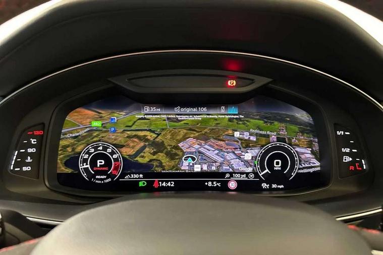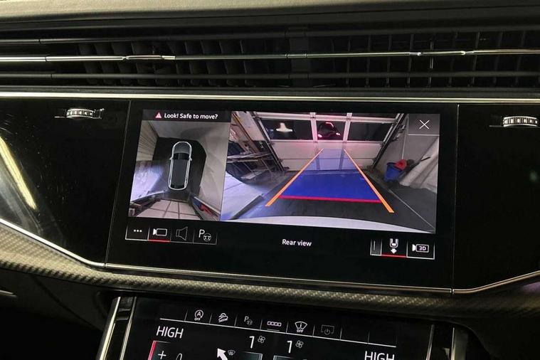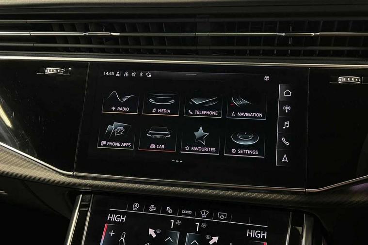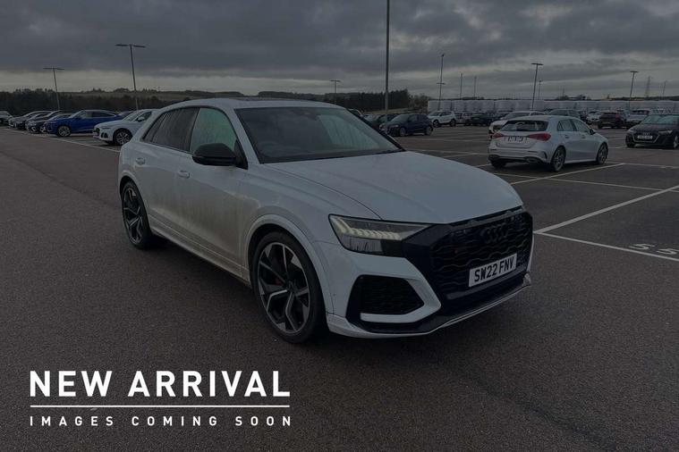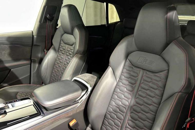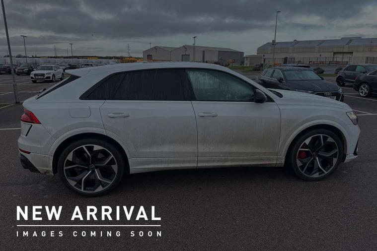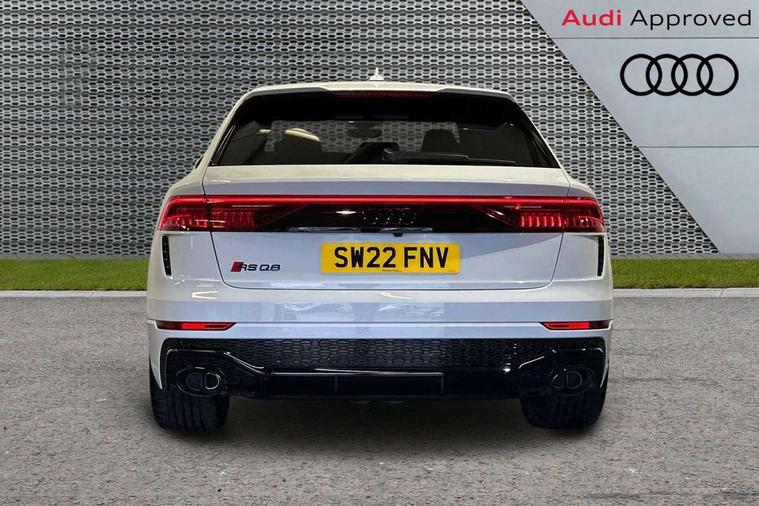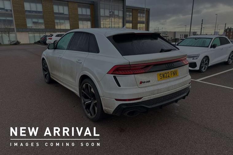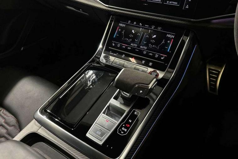 Air quality package - RS Q8, City assist pack - Q8, Comfort and sound pack - RS SQ8, Multi-coloured extended LED interior lighting pack - RS Q8, RS specific styling pack - RS Q8, Titanium black styling pack - RS Q8, Tour pack - Q8, 23" x 10.5J 5 Y spoke rotor design Audi sport alloy wheels in gloss anthracite black with diamond finish, Tyre repair kit, Advanced key, Anti theft alarm with tow away protection, Anti-theft wheel bolts and wheel loosening detection, Immobiliser, Audi music interface with 2 USB ports with charge and data functions, Aux-in socket, DAB Digital radio, 3 point seatbelts on all seats, Audi pre sense front, Driver and front passenger, front side and curtain airbags, Electromechanical parking brake, Electronic Stability Control (ESC) including ABS, ASR and EDL, Front passenger airbag deactivation, Hill descent control, Hill hold assist, Predictive pedestrian protection, Seatbelt monitoring, Tyre pressure loss indicator, Warning triangle and first aid kit, Adaptive windscreen wipers with integrated washer jets, Audi Beam uses LEDs to project Vorsprung logo, Audi HD Matrix LED headlights in RS specific design with dynamic front and rear indicators, Auto dimming frameless rear view mirror, Electric front+rear windows, Electric panoramic glass sunroof, Electrically folding auto dimming/adjustable/heated door mirrors with memory function, LED side indicators and kerb view function for passenger side, Gloss black finish for exterior Audi rings and RS Q8 logo, Headlight washers, Heat insulating glass in windshield, Illuminated door sill trims with RS logo, LED 3rd brake light, LED signature daytime running lights, Privacy glass - dark tinted rear and rear side windows from B-pillar backwards, Rain and light sensors, Rear side wing doors, Rear wiper, RS badges on front wings, RS coming/leaving home animations in front and rear, RS manhattan grey front spoiler lip and rear diffuser insert, RS manhattan grey grille surround with honeycomb grille insert in black, RS specific bumpers in full body colour paint finish, RS sport exhaust system with black exhaust tips, 4 zone automatic climate control, 4-way lumbar support for front seats, 40:20:40 split folding rear bench seat, Black Alcantara headlining, Comfort front centre armrest, Double sun visor with illuminated vanity mirror on driver and passenger side extendable, Driver and front passenger seat memory function for electrically adjustable front seats, Electric adjustable steering column with memory functionality, Electric sunblind for the rear side windows and manual sunblind for the rear window, Front head restraints, ISOFIX child seat mounting for front passenger seat and 2 outer rear seats with top tether child seat mounting for all 3 rear seats, Luggage compartment sill protection in stainless steel, Massage and ventilation function for front seats, Perforated Valcona leather upholstery + RS front super sports seats + honeycomb pattern with RS embossed logo, Rear headrests, Rear seat bench plus, Single front passenger seat, Stainless steel pedals, Tool kit, 10.1" and 8.6" Dual colour touchscreens, 2 USB ports with charge and data functions in the rear, All wheel steering, Audi connect safety and service (e-call), Audi connect with Amazon Alexa Integration, Audi smartphone interface includes wireless Apple carplay/Android Auto, Audi virtual cockpit - 12.3" high resolution LCD display with fully customisable instrument cluster and RS specific menus and options, Automatic start/stop system, Bluetooth interface, Electro-mechanical PAS, Head up Display, MMI navigation plus with MMI touch, Natural voice recognition, On board computer, Operating buttons in black, glass look with haptic feedback, Power door closure, Power operated tailgate, RS Audi drive select, Service interval indicator, 48V Mild hybrid technology, Electromechanical active roll stabilisation, Quattro all wheel drive with sport differential, RS specific Adaptive air suspension,