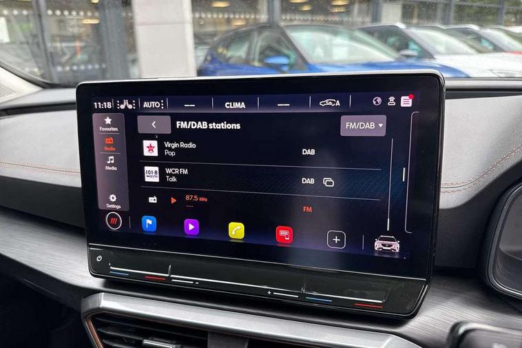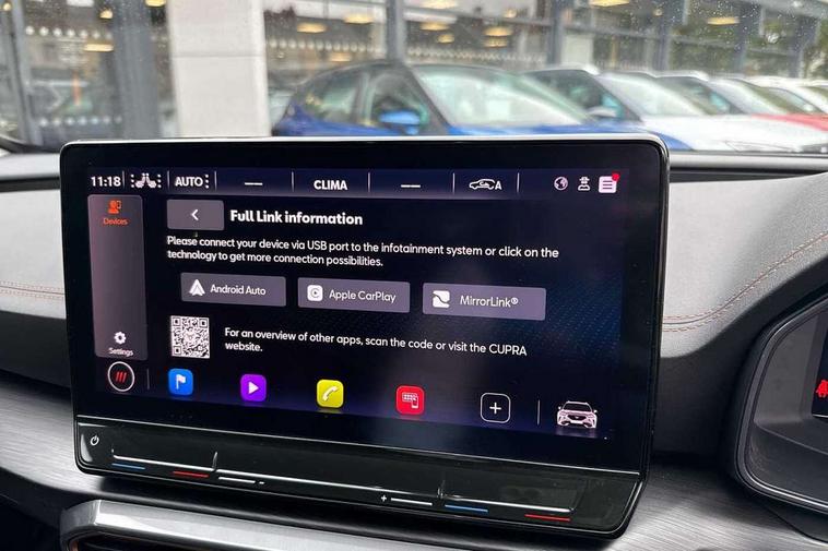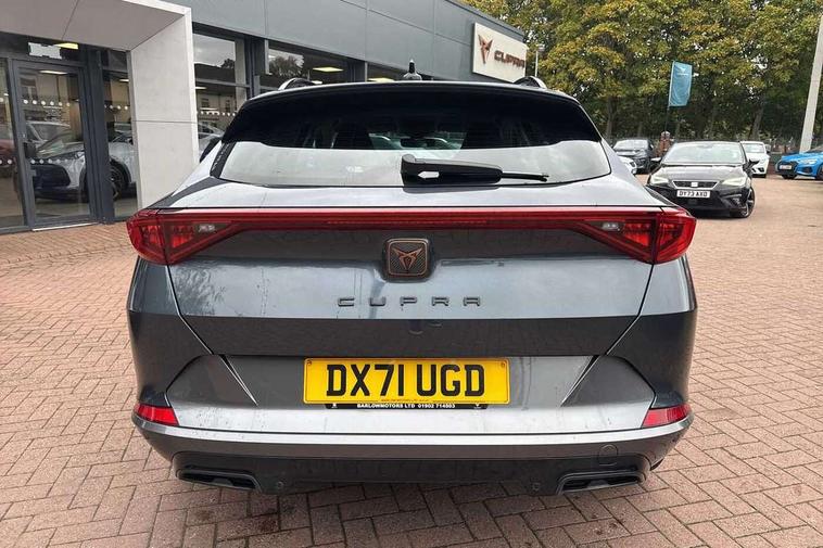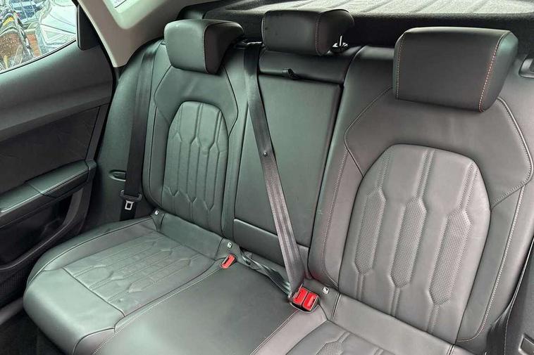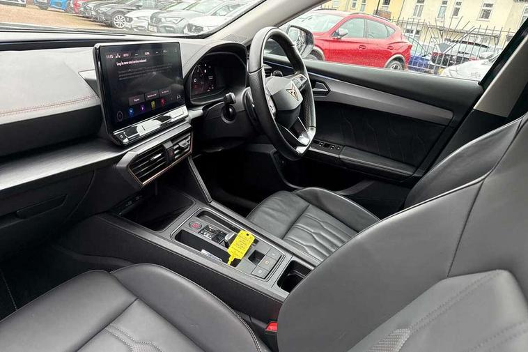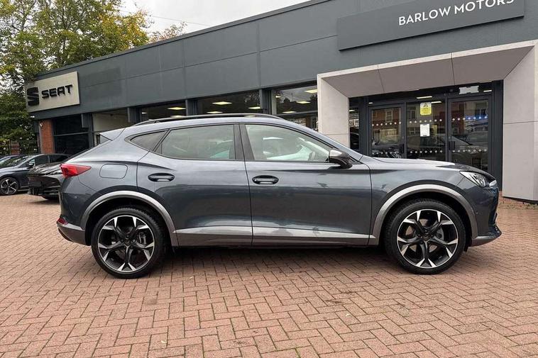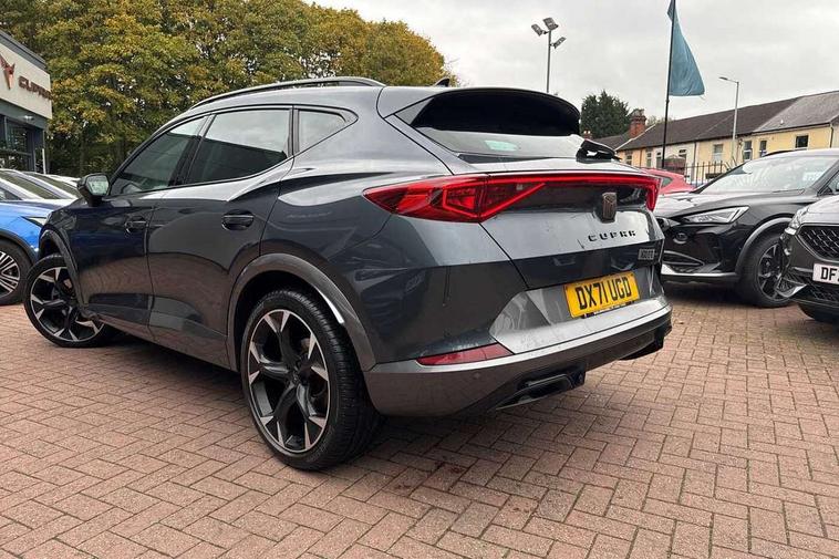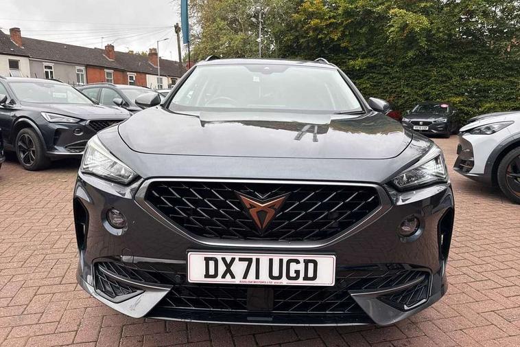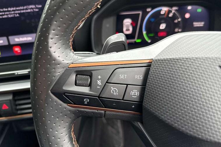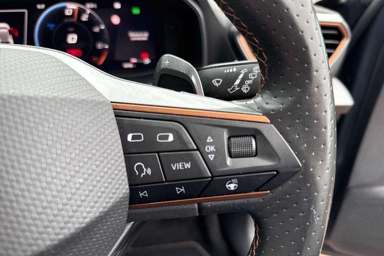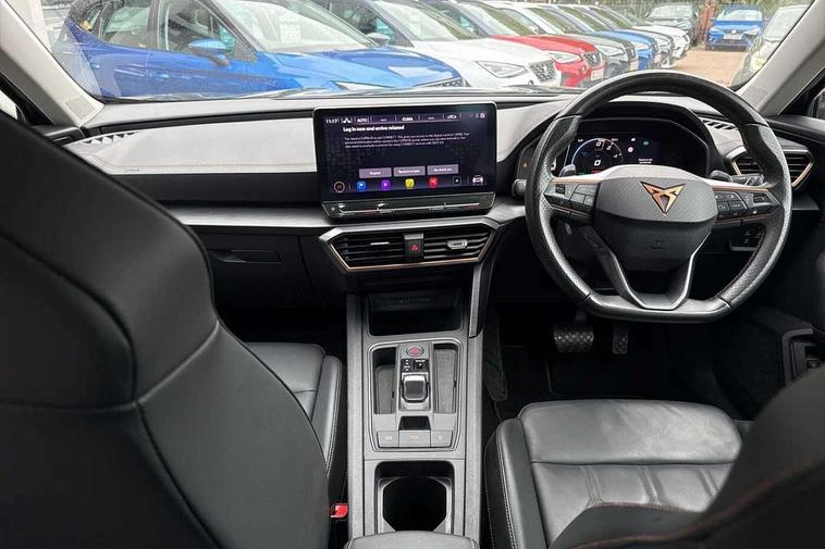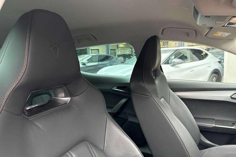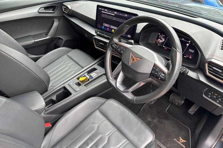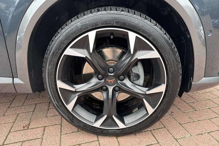 Copper and aluminium interior detailing, Genuine Nappa leather Pack - Cupra, Navigation system pack with 10" navigation system - Formentor, 19" 'Exclusive' machined sport matte black and silver alloy wheels, Tyre repair kit, Anti theft alarm system, Keyless entry and start system (KESSY), Locking wheel bolts, 2 front and 2 rear USB type C sockets, 6 speakers, DAB radio, 3 point seatbelts on all rear seats, ABS, Brake control system - ESC and brake booster, Child proof door locks, Driver and front passenger airbags with front passenger airbag de-activation, Electronic parking brake, Front and rear disc brakes, Front side curtain airbags, Hill hold control, Seat belt reminder for front and rear seats, Tyre pressure monitoring system, Auto dimming rear view mirror, Body colour door handles, Body coloured bumpers, Dark grey wing mirror, Daytime running light with automatic headlight control and coming home feature, Dynamic headlight range control, Electric front/rear windows, Electrically adjustable heated and folding door mirrors with memory function, Front fog lamps with cornering function, Gloss black roof rails and window surrounds, LED Headlights, LED Taillights with dynamic indicator, Rain sensing wipers, Rear diffuser with black simulated exhaust pipes, Rear wash/wipe, Tinted rear windows, Welcome lights, 12V socket, 2 front and 2 rear reading lights, 60/40 split rear bench seat with armrest and mechanical seat release, Dust/pollen filter, Front and rear head restraints, Front centre armrest, Height/reach adjust steering wheel, Illuminated interior front door sills, Illuminated sunvisor with mirror, Isofix, Leather multi function heated steering wheel with gear shift paddles, Three zone climate control with control panel in rear, Wraparound lighting, Digital cockpit and configurable dashboard, Driver alert system, Driving profile selection, Forward collision warning with automatic braking, Lane assist, Park assist (inc front/rear parking sensors), PAS, Predictive adaptive cruise control with speed limiter, Rear view camera, RPM, trip computer, outside temp gauge, instrument light brightness, low fuel warning light, lights on reminder, gearshift indicator, Service interval indicator, Start/stop system with regenerative braking, Wireless apple carplay, Wireless phone charger, 10 amp mode 2 charging cable, 16 amp mode 3 charging cable, 3.6 kw On-board charger, Electronic locking differential and dynamic traction support, Standard suspension,