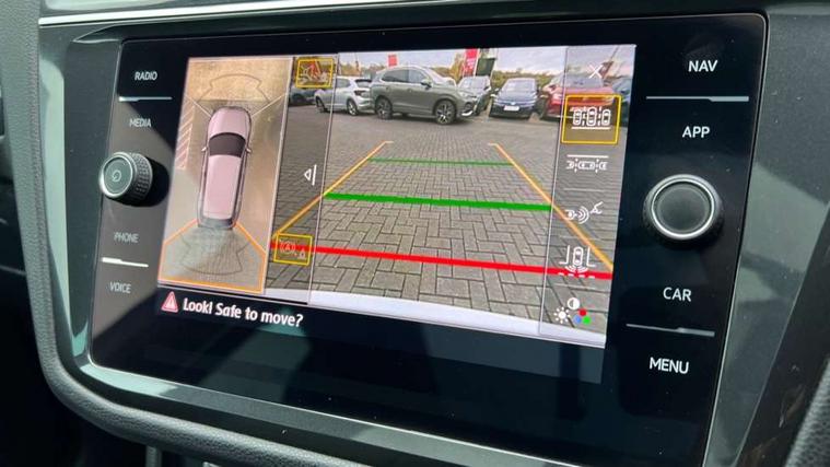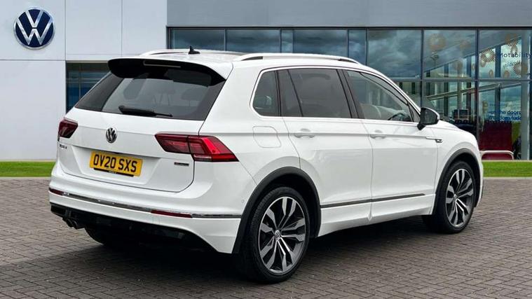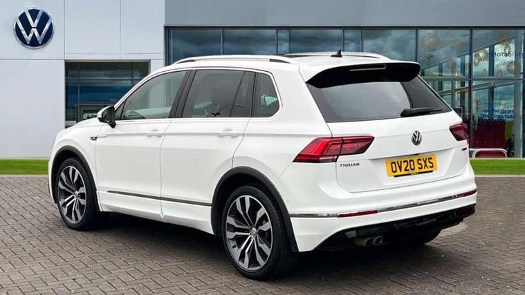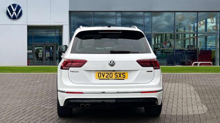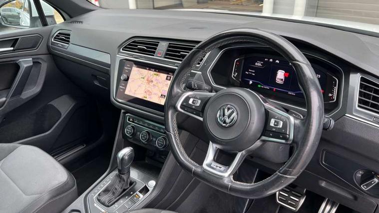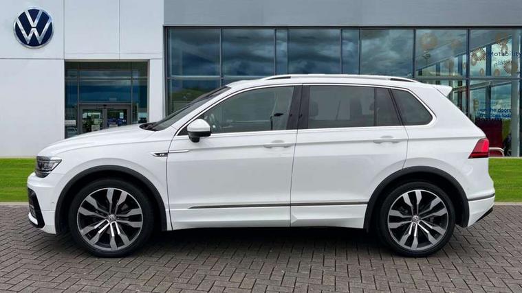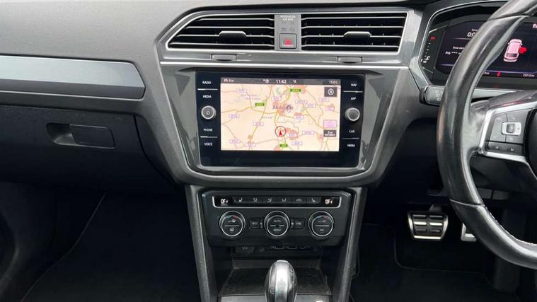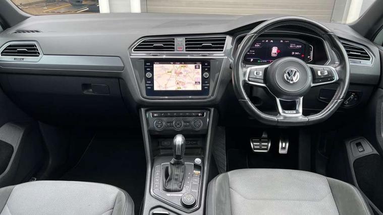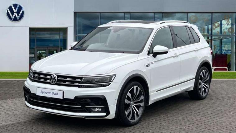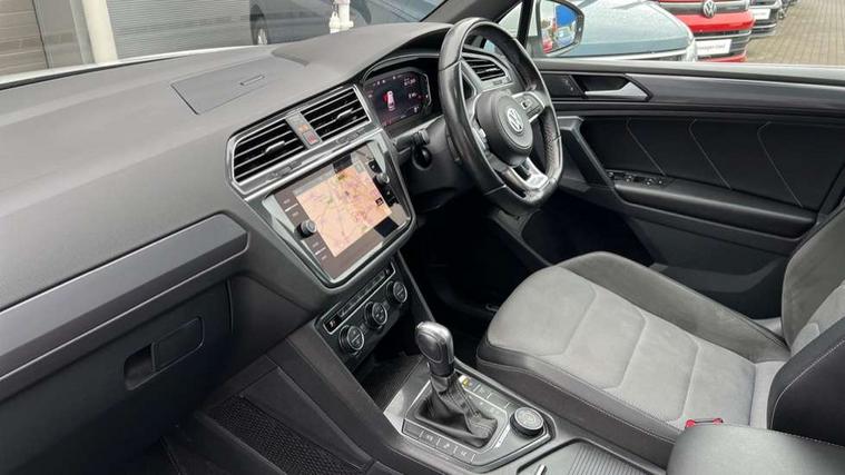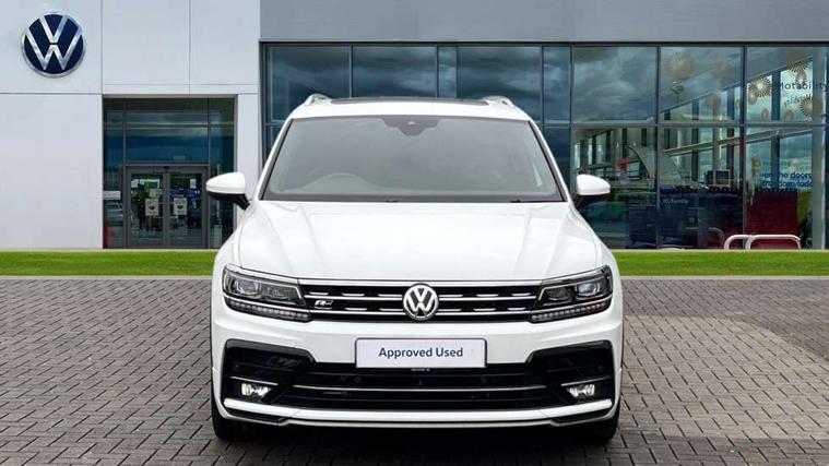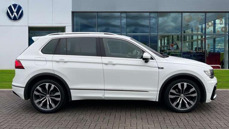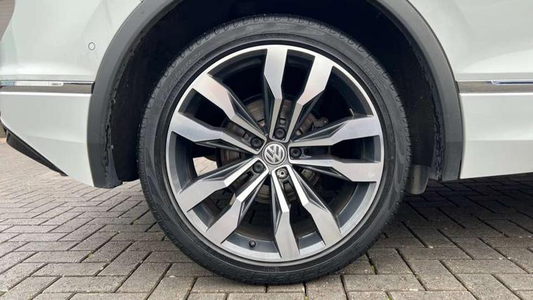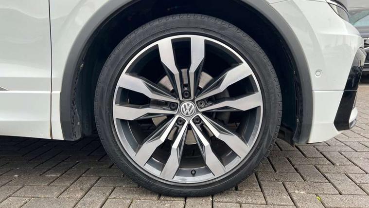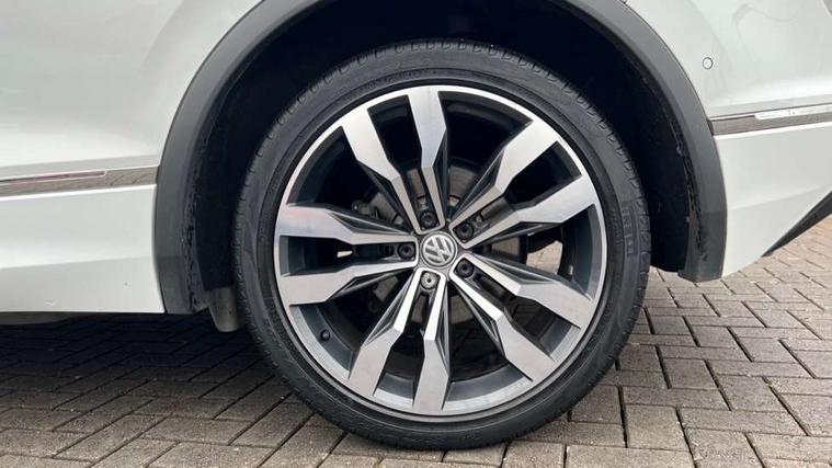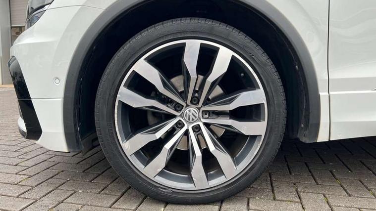 Chrome door trim inserts, Dark grey decorative inserts in dash and door panel, Piano black decorative inserts in centre console, Ambient lighting pack - Tiguan, R Line styling pack - Tiguan, 20" Suzuka alloy wheels with mobility self sealing tyres + anti theft wheel bolts, Steel space saver spare wheel, Alarm with interior protection, Electronic engine immobiliser, Remote central locking with 2 remote folding keys, 2 x USB connection + USB charging socket, 4 X 20 watt output, DAB Digital radio, SD card slot, Simultaneous pairing of 2 compatible mobile devices, SMS functionality - read, compose and send SMS messages using touch-screen display, Title and cover art display, 3 rear 3 point seatbelts, ABS+EBD+Brake assist, Active bonnet, Active pedestrian safety system, Curtain airbags, Driver/Front Passenger airbags, Driver/Passenger whiplash optimised head restraints, Drivers knee airbag, DTC - Drag torque control, Electronic parking brake with auto hold, ESC with EDL, ASR, EDTC and trailer stabilisation function, First aid kit, Front seat side impact airbags, Front side airbags, Front ventilated disc brakes and rear disc brakes, Head airbag system, Height adjustable front 3 point seatbelts + pretensioners, Hill hold control, Passenger airbag deactivate switch, Passenger knee airbag, Pre crash preventive occupant protection, Rear side airbags, Rigid safety cell with front and rear crumple zones, Two tone horn, Warning sound and light for front seat belts if unfastened, Warning triangle, 3D effect cherry red LED rear tail lights, Aluminium decorative inserts in dash and door panels, Auto dimming interior mirror, Automatic activation of hazard warning lights, Body colour door handles, Body colour door mirrors, Body colour rear spoiler, Body colour side skirt, Body coloured bumpers, Chrome side window surrounds, Chrome trimmed radiator grille, Coming/leaving home lighting function, Dusk sensor + auto driving lights, Electric panoramic sunroof with sunblind, Electrically heated and foldable door mirrors, door mirror puddle lights and reverse activated kerb view adjustment on passenger's door mirror, Front and rear electric windows, Heated rear window, High level 3rd brake light, LED headlights with dynamic light assist daytime running lights and cornering front fog lights, LED rear number plate lights, Piano black front air intake and rear diffuser, R Line body kit, R Line side sills, Rain sensor windscreen wipers, Rear tinted glass from B-pillar backwards approx 65% tinted, Rear windscreen washer and wiper with interval delay, Side skirts and rear bumper with chrome insert, Silver front underbody protection and rear diffuser, Silver roof rails, Trailer Stability Programme, Unique R Line badging, Windscreen wipers/ intermittent wipe + 4 position delay, 12V socket in centre console storage area, 2 cup holders in front, 3 rear headrests, 3 spoke multi-function leather steering wheel and gearknob, 3 zone climate control, 4 load lashing points, 40:20:40 split folding rear seats, Bag hook in luggage compartment, Black headlining, Foldable front passenger seat backrest, Front + rear carpet mats, Front centre armrest with 12v socket, Front centre armrest with storage + rear 2 air vents, Front seat back storage pockets, Front seat R Line logo with rear seat backrest, Front seatback folding tables, Height/reach adjust steering wheel, Illuminated driver/passenger vanity mirrors, Illuminated scuff plates, Instrument lighting white adjustable panel illumination, Interior light with delay, Isofix Preparation 2 Rear child seats, Leather gear knob, Load through provision with 2 cupholders when folded, Lockable cooled glovebox, Luggage compartment lighting, Map pockets on front seats, Passenger seat height adjuster, Removable luggage cover, Sliding/reclining rear seats, Stainless steel pedals, Storage compartment in driver's door, Storage compartment in passenger's door, Storage compartment in rear doors, Storage compartments in luggage area left and right, Storage tray on dashboard, Sunglasses storage, Unique R Line door sill protectors, Variable boot floor, height adjustable and removable, App-Connect, 2D/3D map view, Active information display, Adaptive cruise control, Area view with park assist steering and front and rear parking sensors, Bluetooth phone integration system, Car information display, Distance control assist, Driver alert system with fatigue detection, Driver profile selection, Front assist, radar sensor controlled distance monitor, city emergency braking + predictive pedestrian protection, Fully electric tailgate + keyless entry and start, Instrument cluster, Lane assist, Lights on warning, Multifunction computer with visual gear change recommendation for fuel consumption, Outside temperature display, Progressive power assisted steering, Service interval indicator, Speed limiter, Start/Stop function, Warning sound and light for doors and tailgate open, Battery regeneration during braking, Diesel particulate filter, Misfuel prevention device for diesel engine, XDS electronic differential lock for improved traction and handling,