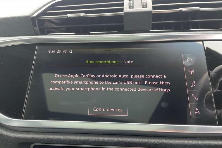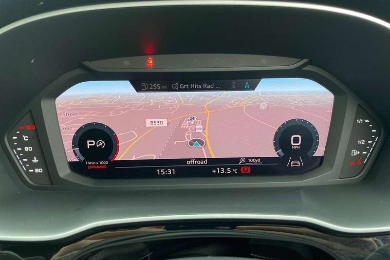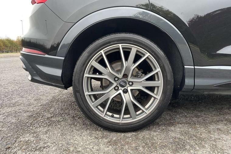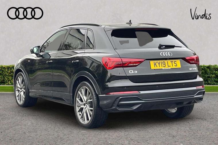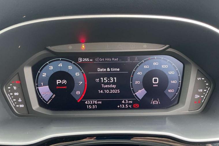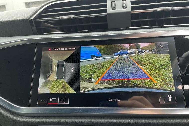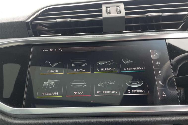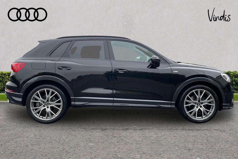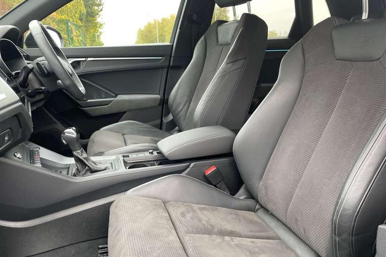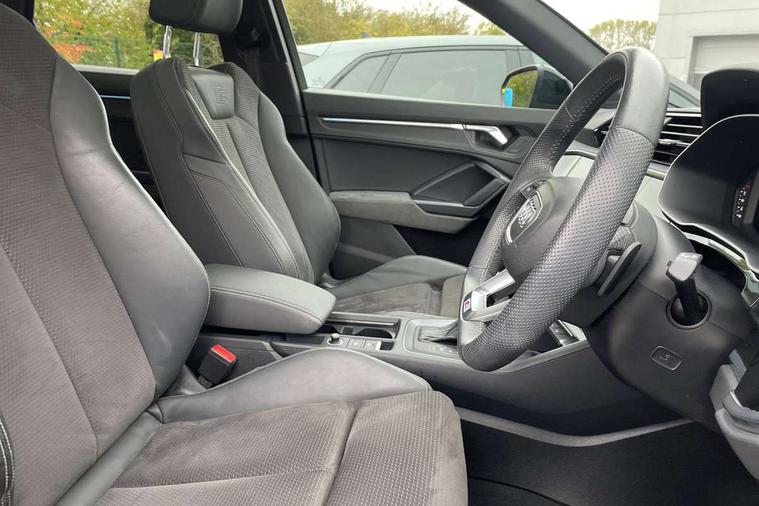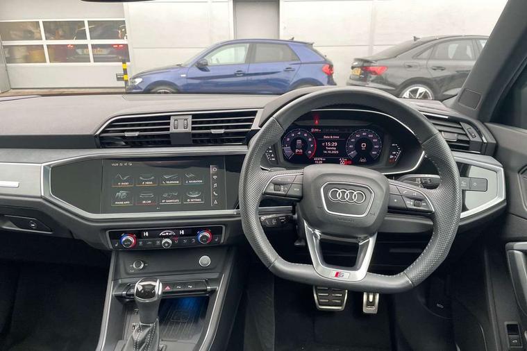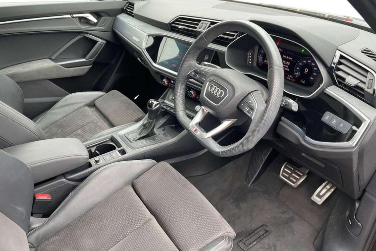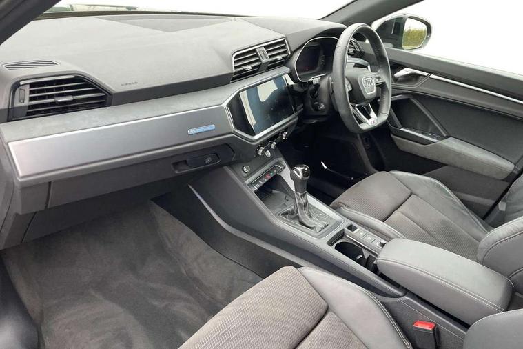 Dark matt brushed aluminium inlay, MMI touch colour display in gloss black with aluminium surround, Black styling pack - Q3, Driver Assistance Pack - Q3, Multi coloured extended ambient interior lighting pack - Q3, Non smoking pack - Q3, Tyre repair kit, Advanced key, Anti theft alarm, Anti theft wheel bolts, Remote central locking, 1 x USB type C and 1 USB type A charging points, Bang & Olufsen 3D Premium Sound System, DAB digital radio module, 3x3 point rear seatbelts, 6 airbags - Driver, front passenger, curtain and side windows, Audi pre-sense front with pedestrain and cyclist recognition, Electrically operated child locks on rear doors, Electromechanical parking brake, Electronic stabilisation control including ABS, ASR and EDL, Hill hold assist, Pre sense basic, Seatbelt monitoring, Tyre pressure warning, Warning triangle and first aid kit, Acoustic windscreen, Auto dimming and folding door mirrors, Auto dimming rear view mirror, Black roof rails, Contrast bumpers in Manhattan grey paint finish, Diffuser in matt Platinum grey, Electrically adjustable and heated door mirrors with integrated LED side indicators, Front and rear electric windows, Front fog lights, Front side air inlets in matt platinum grey, Front spoiler blade in matt platinum grey, Front spoiler in matt selenite silver, Grille vertical bars in aluminium silver/Matt, Headlight washers, High gloss black finish B and C pillars, Matrix LED headlights with LED rear lights and dynamic front and rear indicator, Panoramic opening glass sunroof, Privacy glass, Rain and light sensors, Rear diffuser strip in selenite silver, S line bumpers in contrasting Manhattan grey, 12V socket in rear centre console, 3 spoke flat bottomed high multi-function leather sport steering wheel with gearshift paddles, 4 way electric lumbar support for driver and front passenger, 40:20:40 split folding rear bench seat, Adjustable rear seat bench/backrest with centre armrest and cupholder, Aluminium door sill trims, Black cloth headlining, Dual zone climate control, Electrically adjustable front seats, Front and rear black floor mats with contrast stitching in rock grey, Front and rear headrests, Front centre armrest with storage compartment and angle adjustment, Heated front seats, ISOFIX child seat mounting and Top Tether with front passenger airbag deactivation, Perforated leather gearknob, Stainless steel luggage compartment sill finisher, Stainless steel pedals, Tool kit, 360 degree parking camera, Audi connect safety and service (e-call), Audi drive select, Audi lane departure warning, Audi parking system plus with front and rear sensors, Audi phone box with wireless charging, Audi side assist, Audi smartphone interface, Audi virtual cockpit plus, Bluetooth interface, MMI navigation plus with MMI touch, Power opening/closing tailgate, Progressive steering, Rear cross traffic alert, Service interval indicator, Stop/start system, Voice control system, Adaptive suspension with damping control,