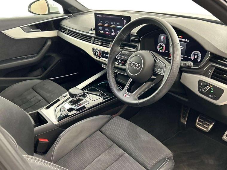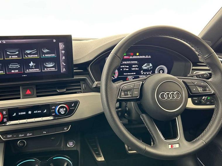 Audi connect safety and service (e-call), Audi drive select, Audi smartphone interface, Audi virtual cockpit, Automatic start-stop system with coasting functionality and efficiency programme, Bluetooth interface, Camera based traffic sign recognition, Electromechanical power steering, Email, calendar and text messages displayed via MMI, Front and rear parking sensors, Lane departure warning, MMI Navigation plus with MMI touch includes 10.1" high resolution colour MMI display, 3D map, Power operated tailgate, Rear view camera, Voice control system, Sports suspension lowered by 23mm, 2 USB charging ports, 8 passive loudspeakers, DAB digital radio reception, Aluminium roof rails, Auto dimming rear view mirror, Body colour door handles, Body colour front spoiler lip, Body colour side sill trim, Body coloured door mirrors, Electric adjustable/heated/folding door mirrors with auto dimming, Grained matt black side air inlets with matt aluminium silver inlay, High beam assistant, Honeycomb structure radiator grille in grained matt black, LED headlights with LED rear lights + dynamic rear indicators + headlight adjustment and high beam, turning light + LED daytime running lights, LED third brake light, Matt aluminium silver tailpipe trim, Privacy glass, Rain and light sensors, Rear side wing doors, Rear wiper, S Line badges on the front wings, S line front and rear bumpers with side skirts, S Line rear diffuser in matt anthracite black with trim strip in matt aluminium silver, S Line roof edge spoiler, Variable intermittent front wash/wipe, Windscreen with acoustic glazing, 3 spoke high multi-function sports leather steering wheel grips in perforated leather with S badging including paddle shift, 4 way electric lumbar support for driver and front passenger, 40/20/40 split folding 3 rear seat bench in 3 parts with rear centre armrest, Black carpets, Black cloth headlining, Black perforated leather gearknob, Contrast stitching on seats, steering wheel and gear lever gaiter, Deluxe 3 zone electronic climate control, Electric load area cover, Front and rear head restraints, Front centre armrest, Heated front seats, Illuminated door sill trims with S logo, ISOFIX child seat mounting and top tether, Manual seat adjustment, Single front passenger seat, Stainless steel pedals and foot rest, Tool kit, High gloss package - A4, LED Interior light pack - A4/S4, 3 rear seatbelts, 6 airbags - Driver, front passenger, curtain and side windows, Attention and drowsiness assist, Electronic Stabilisation Control (ESC) including ABS, ASR and EDL, Hill hold assist, Multi collision brake assist, Pop-up bonnet for pedestrian protection, Pre sense city, Rear door child safety locks, Seatbelt monitoring, Warning triangle and first aid kit, Anti theft alarm, Anti theft wheel bolts, Central locking, Keyless Go, Matt brushed aluminium inlays, Tyre repair kit,