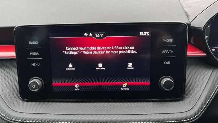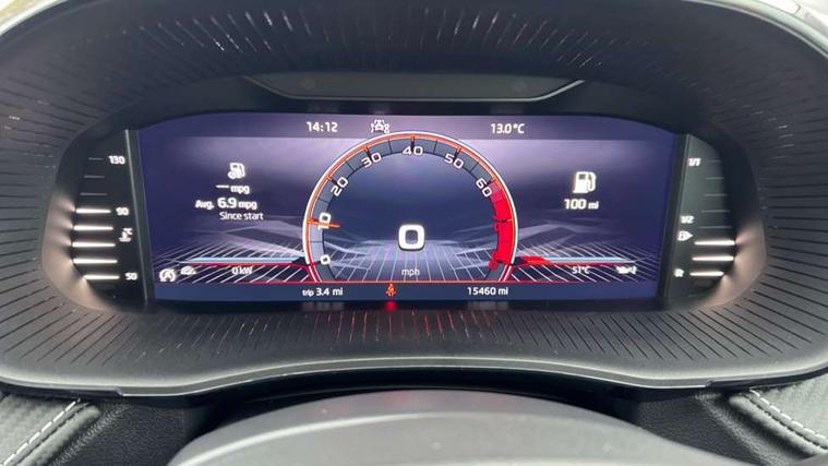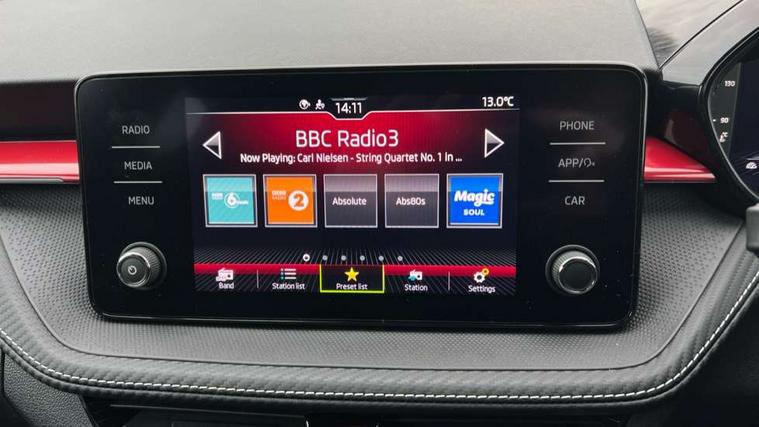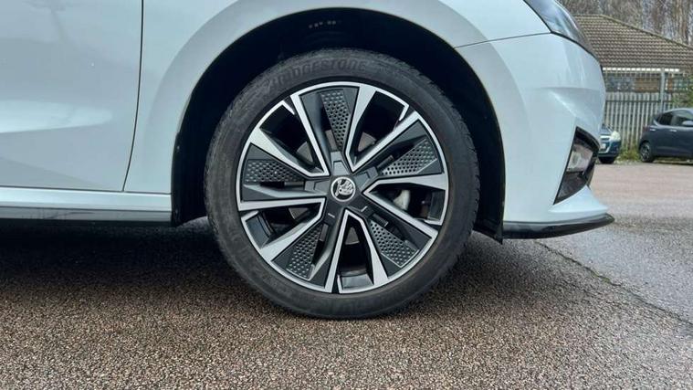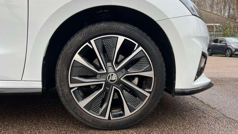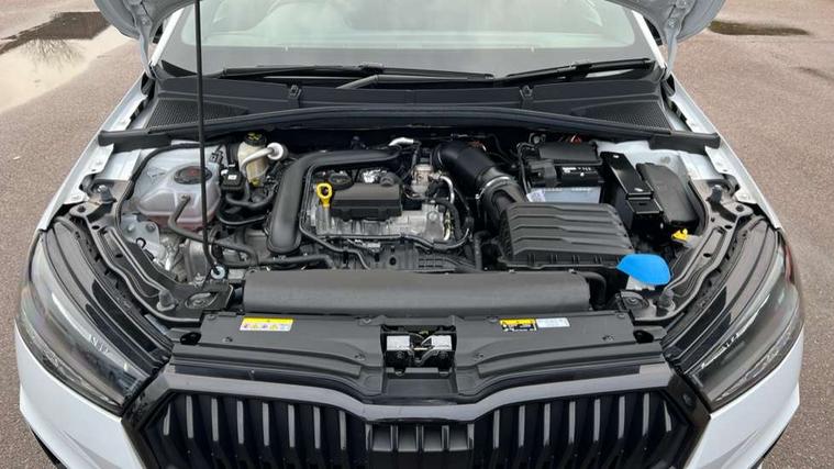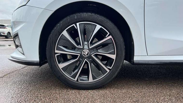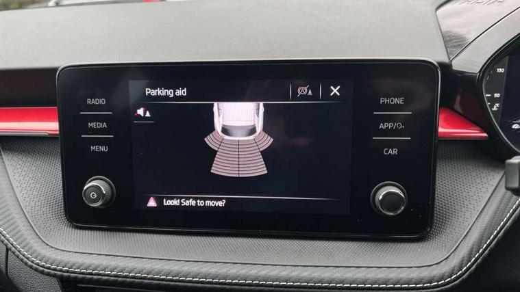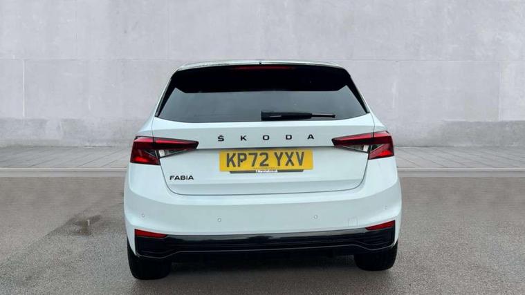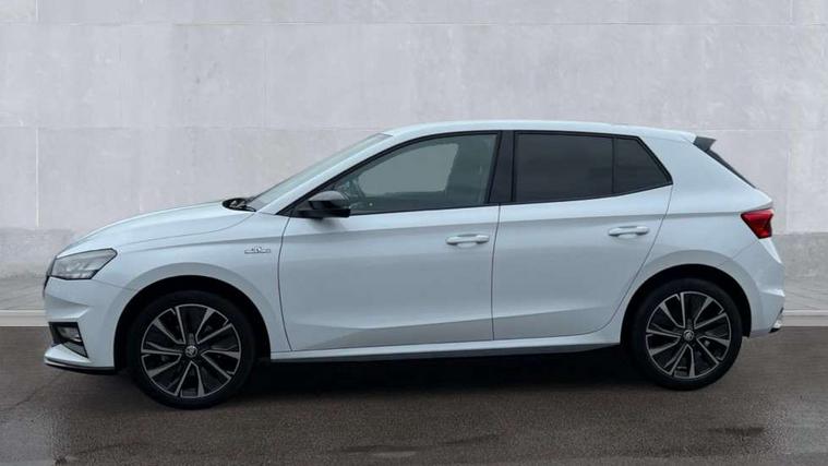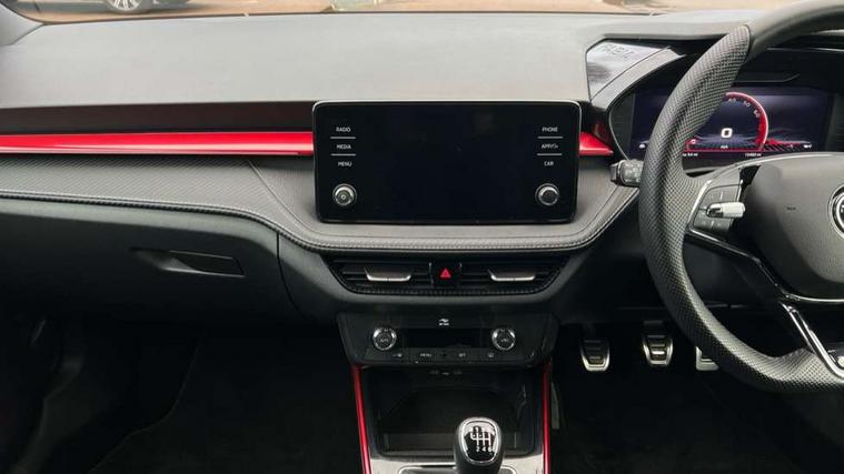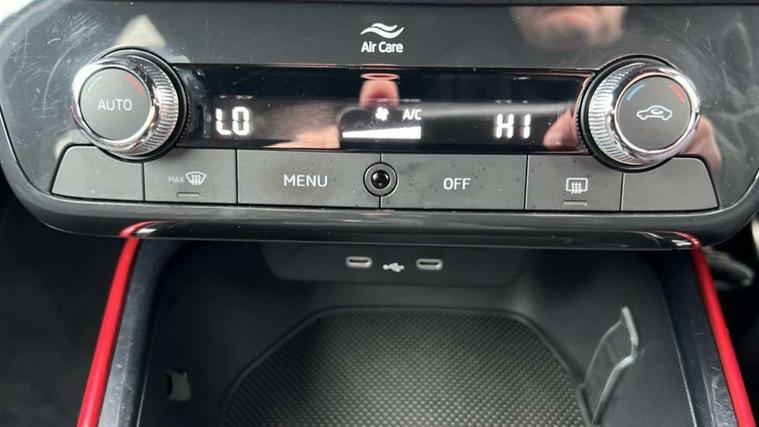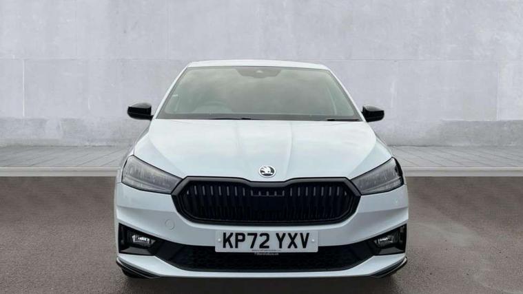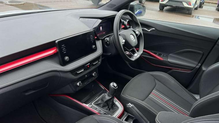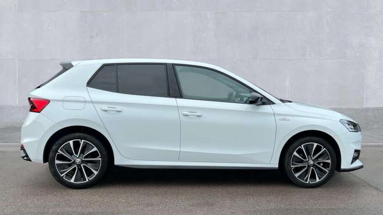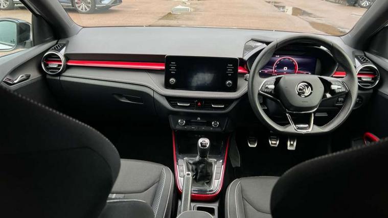 Carbon effect door and side trim panels, Carbon effect lower decorative trim with white stitching, Red metallic upper decorative trim, Ambient lighting pack 2 - Fabia Hatchback, Anti-theft wheel bolts protection, Super-low rolling resistance tyres, Anti-theft alarm system including immobiliser, interior monitoring, backup horn, and towing protection, 2x USB-C in the front (for data transmission and charging), 6 Speakers (4 in front and 2 in rear), Auxiliary socket for external MP3 player, Bolero radio with 8" colour display, DAB digital radio reception, 3-point height adjustable front seats belts with pretensioner and force limiter, Automatic warning lights in case of crash, Driver and passengers airbag with switch off function, e-Call+, ESC including ABS, MSR, ASR, EDS, HBA and XDS, Front and rear seat belt warning, FRONT ASSIST (AEB City and AEB Inter Urban), Front side airbags, Head airbags, One tone horn, Pedestrian protection, Three rear 3-points safety seat belts with pretensioner and force limiter including stop function for outer rear seat belts, Tyre pressure monitoring system, Auto dimming rear view mirror, Basic rear light, Black radiator grille, Body coloured bumpers, Door mirror integrated indicators, Electrically adjustable and heated door mirrors, Front and rear electric windows, Front window wiper intermittent control, Headlight range control - Automatic, Ice scraper in fuel cap, LED daytime running lights with coming and leaving home feature, Monte Carlo badging, Privacy glass, Rear LED fog light, Rear side wing doors, Rear window wiper with washing nozzles, Roof mounted spoiler, SKODA tailgate lettering in black, Sports bumpers, Third brake light, 3 rear headrests, Aluminium pedals, Backrest split and folding, Black headlining, Central console with removable cup holder and storage box, Chrome handbrake release button, Fabric/artificial leather upholstery, Front sports seats, Gearshift knob/handle in leather, Hand brake lever handle in leather, Height adjustable front headrests, Height adjustable steering wheel, ISOFIX and TopTether anchorage points to the outer rear seats, ISOFIX and TopTether on the front passenger seat, Luggage compartment lighting, Metallic painted red central console cover, Metallic red interior door handles, Monte Carlo door sills, Pollen filter, Rear seat bench unsplit, Single front passenger seat, Sun visors with mirror and airbag label on passenger side, Textile floor mats, Ticket holder, Umbrella in drivers door, Bluetooth connection, Driver alert system - DAS, Electromechanical power steering, Exterior temperature gauge, Service interval indicator,