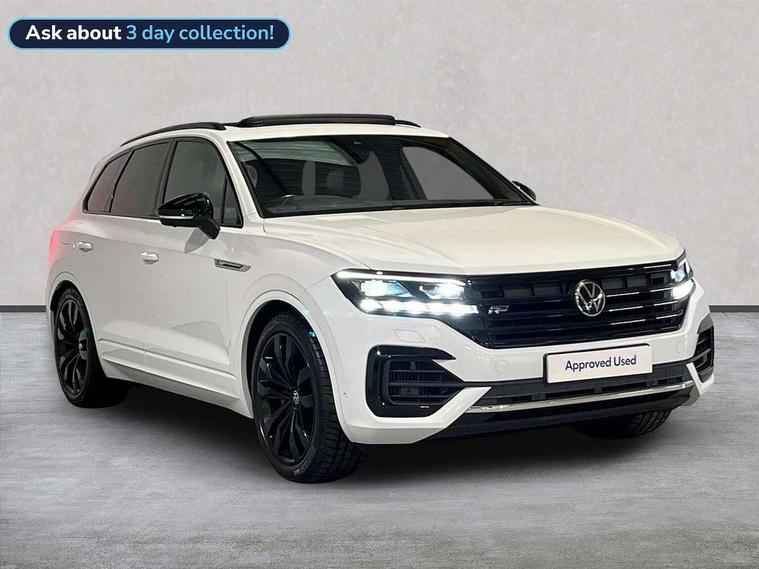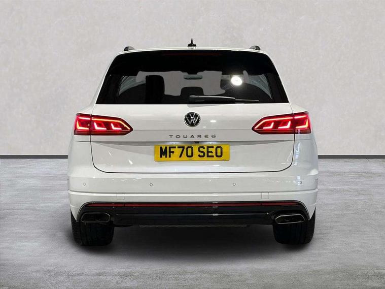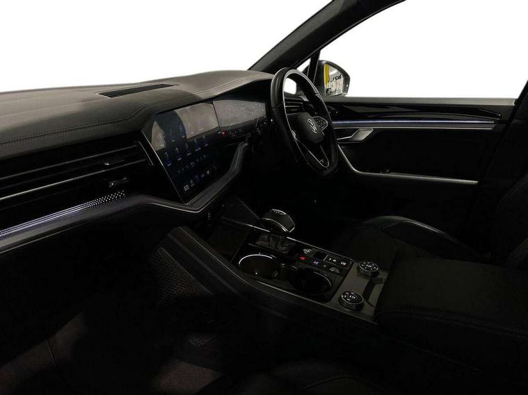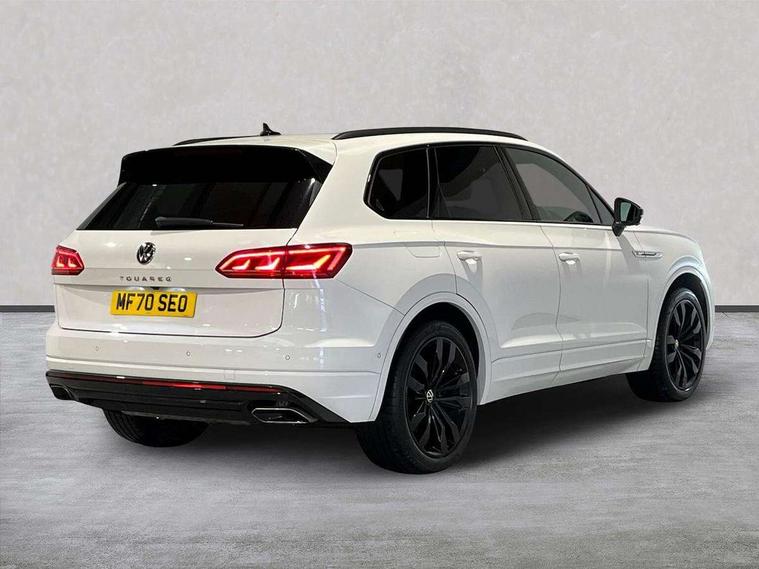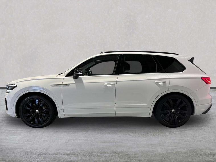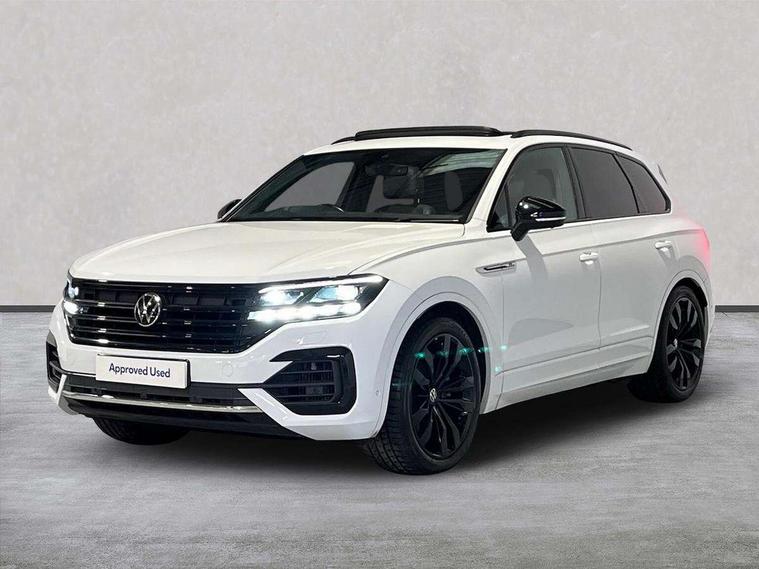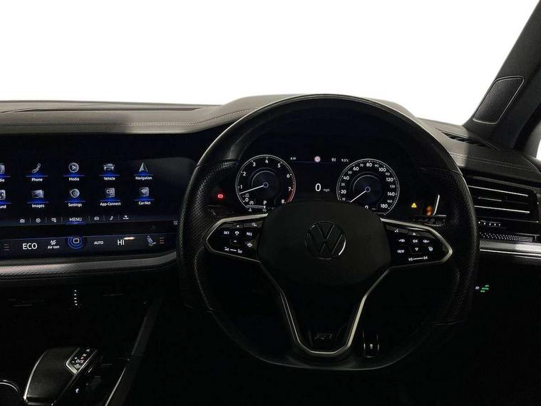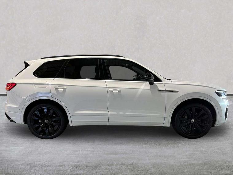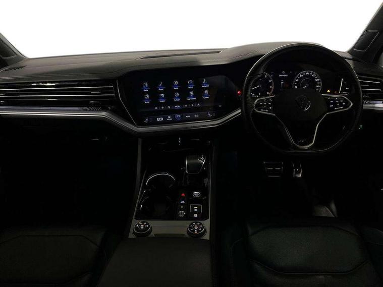 Black decorative trims on the side windows, High gloss black centre console, Innovision cockpit pack - Touareg, R line styling pack - Touareg, Tyre repair kit, Alarm with interior monitoring in cab, backup horn and towing protection, Child security locks for front and rear doors, Electronic engine immobiliser, Remote central locking, DAB Digital radio, Dynamic navigation based on TMC+, Gesture control for infotainment system, Multi device interface (MDI) with illuminated USB-C connection, Music playback - MP3, WMA and AAC files, SD card slot, Simultaneous pairing of 2 compatible mobile devices, SMS functionality - read, compose and send SMS messages using touch-screen display, Title and cover art display, Volkswagen media control, 3 point front seatbelts with pre-tensioners, ABS, Active bonnet, Automatic post collision braking system, Curtain airbags, Driver/Front Passenger airbags, EBD + Brake Assist, EDL, Electronic parking brake with auto hold, ESC with ASR, Front seat side impact airbags, Hill descent control, Hill start assist, Passenger airbag deactivate switch, Seatbelt warning lamp and buzzer, Three 3 point rear seatbelts, Two tone horn, Volkswagen roadside assistance, Warning triangle and first aid kit, Adaptive low beam for urban and motorway use, Auto dimming rear view mirror, Automatic coming/leaving home lighting function, Automatic headlights, Black anodised roof rails, Black door mirrors, Black rear diffuser, Black side window surrounds, Black upper and lower grille louvres extending into headlights and radiator grille, Body colour door handles, Body coloured wheel arches, C signature gloss black front air intake, Chromed tailpipe on the left and right integrated in the bumper with trapezoid design, Dynamic headlight range control, Electric front tilt/slide panoramic sunroof and fixed rear sunroof, Electrically power adjustable, heated, folding, auto dimming, front passenger exterior door mirror lowering function, Front and rear electric windows, Galvanised body, Gloss black finish B pillar, Gloss black rear diffuser, Headlight washers, Heat insulating glass in side and rear windows, Heated windscreen washer jets, IQ.Light-LED matrix headlight, daytime running light with dynamic cornering light and indicator, LED rear fog light, LED rear number plate lights, Plastic scuff plates in door apertures, Poor weather light, Puddle lights, Rain sensor, Rear wiper, 12V socket in front and rear centre console and boot, 2 Coat hooks on B pillar, 3 rear head restraints, 3 spoke sport heated leather multi-function sports steering wheel with gear shift paddles - generation 2, 4 way adjustable front head restraints, 4 way electric lumbar support for driver and front passenger, 4 zone climate control, 40:20:40 split folding slide/recline rear seat, B pillar vents, Black lower edge of door extending sills, Branded points of interest, Double sun visor for drivier and passenger with LED illuminated vanity mirrors, Electric luggage compartment cover, Folding rear centre armrest with 2 cupholders, Front + rear carpet mats, Front centre armrest with storage box, Gear shift indicator, Height/reach adjust steering wheel, Illuminated air conditioned glovebox, Isofix preparation for 2 rear child seats, Jack and tool kit, Leather trimmed gear knob with gloss black inlay/aluminum trim, Leatherette door trim, LED luggage compartment lighting, Load through provision, Luggage compartment with load lashing rings, Plastic loading edge protection, Rear seat remote release levers, Soul black headlining, Stainless steel pedals, 2D/3D map view, ACC - Adaptive cruise control with front assist, forward collision warning, distance monitoring, city emergency brake and speed limiter, Apple car play/Android Auto, Audible and visual fatigue detection system, Bluetooth hands free telephone connection, Car information display, Drive select with Damper control, Driver alert system, Dusk sensor, Dynamic road sign display camera controlled system with visual warning for traffic and road signs, eCall emergency system, Fully electric tailgate + keyless entry and start, Instrument cluster, MirrorLink, Multifunction camera with lane assist, Multifunction computer premium with 7" colour display, One touch indicators with repeat function, Park assist with area view camera, Service interval indicator, Speed sensitive power steering, Start/stop system with regenerative braking, Tailgate power latch, Think blue trainer driver tips and journey analysis, Traffic sign recognition, Voice control system, Wireless Smartphone charger, Torsen limited slip differential,