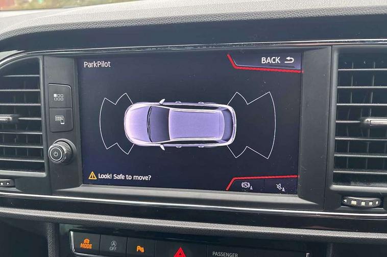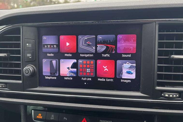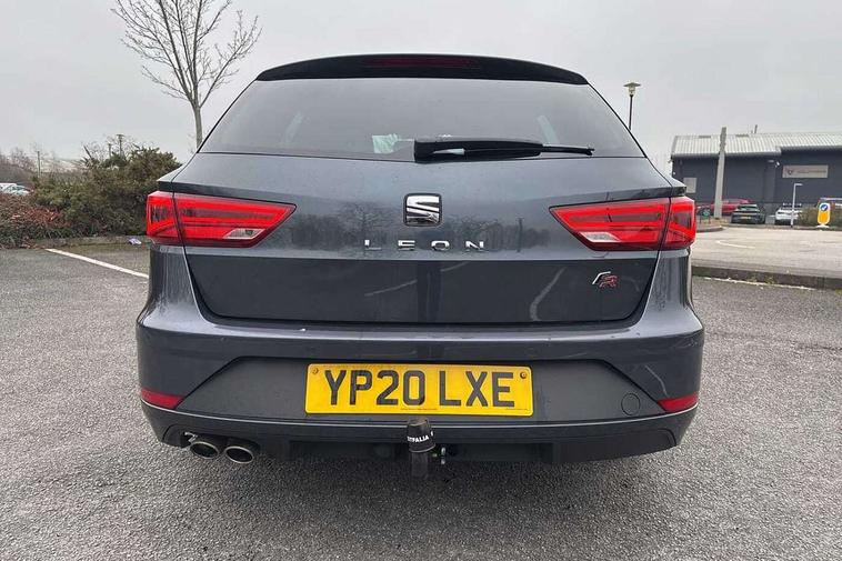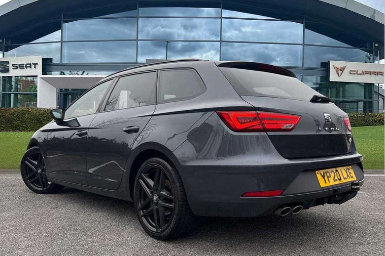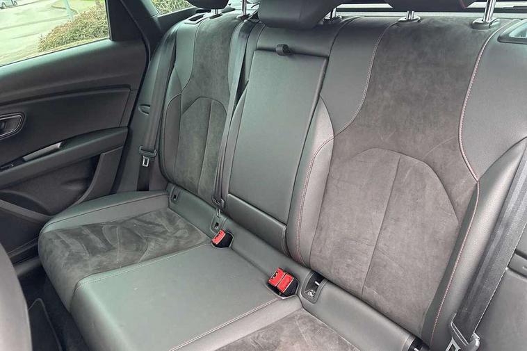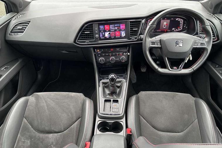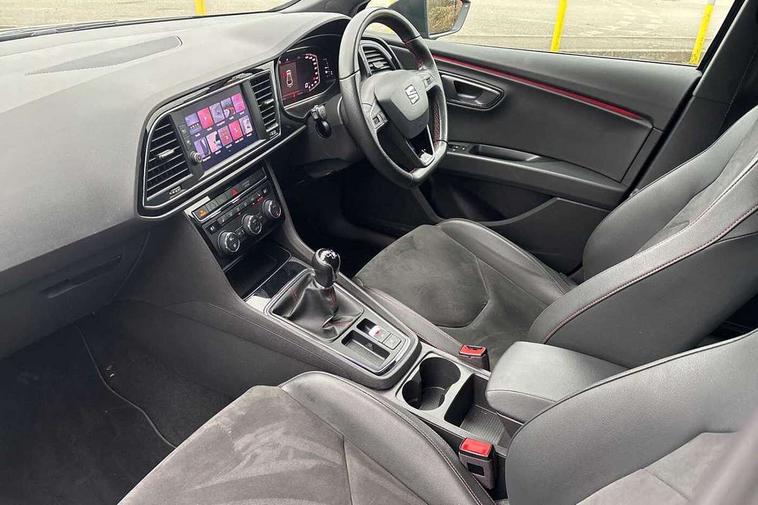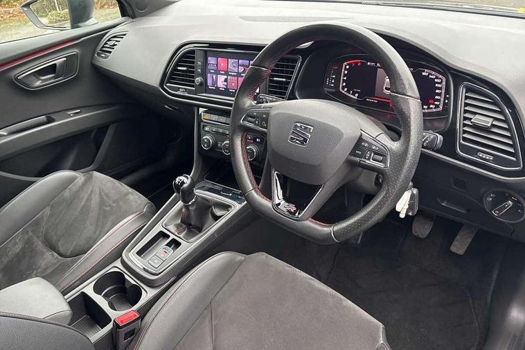 Chrome interior detailing, Convenience pack+ - Leon, Winter pack - Leon, 2 folding remote keys with window open/close function and boot opening/door mirror folding function, Central locking fuel filler cap, Engine immobiliser, Locking wheel bolts, Remote central locking + deadlocks, Volumetric alarm with back up horn, Auxiliary input socket, SEAT USB media cable, 3 point seatbelts on all rear seats, ABS, traction control system, electronic stability control, Child proof door locks, Driver and front passenger airbags with front passenger airbag de-activation, front side, curtain, driver knee airbags, EBA, Electric handbrake, Electronic parking brake with auto hold, Front seatbelt pretensioners, Front seatbelt reminder, Hill hold control, Multi-Collision braking, Tyre pressure monitoring system, Black front grille, Black roof rails, Body colour door handles, Body coloured bumpers, Dark tinted rear windows, Electric folding door mirrors, Electric front/rear windows, Electrically adjustable and heated door mirrors, Exclusive FR front and rear bumpers, Full LED headlights with LED day time running lights + LED rear tail lights + LED licence plate lights and LED front and rear fog lights, High gloss black finish B and C pillars, Illuminated aluminium front door sill with FR logo, Matt black door mirrors with integrated LED indicators, Matt black front grille frame, Rear wash/wipe, Visible twin exhaust tailpipes, 12v power point in centre console, 60/40 split folding rear seat with armrest, Additional heating and ventilation outlet in rear of centre console, Black interior roof, Boot storage net, Cargo rings in boot, Double boot floor, Driver and passenger seat height adjust, Driver and passenger sun visor, covered and illuminated mirror, driver sun visor with card holder, Driver seat lumbar adjustment, Dual zone climate control, Dust/pollen filter, Flat bottomed perforated leather steering wheel with red stitching and FR logo and leather gear knob, Front and rear head restraints, Front centre armrest with storage compartment, Front cupholders x 2, Front passenger seat lumbar adjustment, Front seatback storage pockets, Front sport seats in microsuede, Front/rear floor mats, Height adjustable front and rear headrests and third rear headrest, Height/reach adjust steering wheel, High centre console with integrated box & cup holder, rear air outlet, with armrest in front seats, ISOFIX points in outer rear seats with top tether anchorage points, Luggage compartment cover, Luggage tie-down hooks, Multi-colour ambient interior lighting, Storage box under drivers and passenger seat, Digital cockpit, Electro-mechanical power steering, Front and rear parking sensors, Front assist with pedestrian protection, Full Link Smartphone Integration with Mirror Link, Apple Car Play, Google Android Auto with USB cable for Apple and Android compatibility, Media system plus with 8" display, 4 USB, 8 speakers, CD, voice control, DAB, bluetooth and handsfree, steering wheel mounted audio and phone control, Navigation system 3D map display, high resolution colour driver display, two SD card slots, RPM, trip computer, outside temp gauge, instrument light brightness, low fuel warning light, lights on reminder, gearshift indicator, SEAT drive profile with 4 modes (Eco/Normal/Sport/Individual), throttle response, SEAT logo boot release, Service interval indicator, Lowered sports suspension, XDS electronic differential lock,