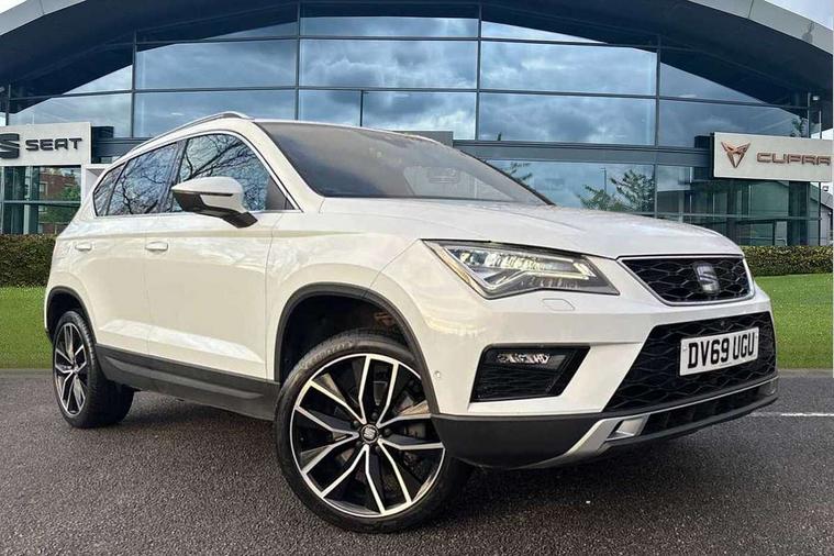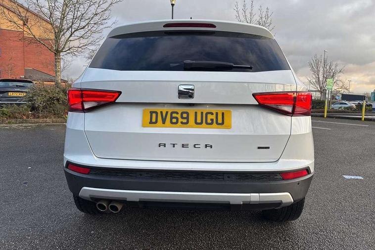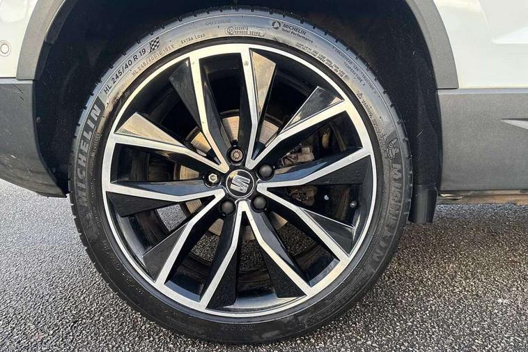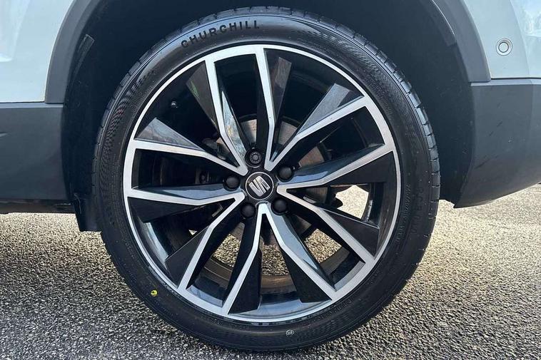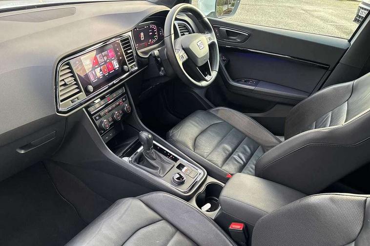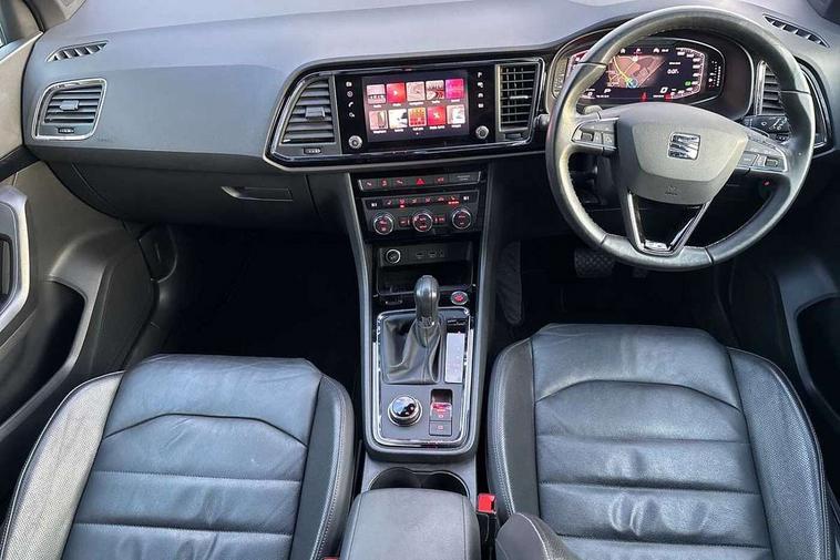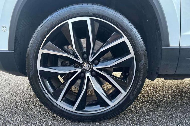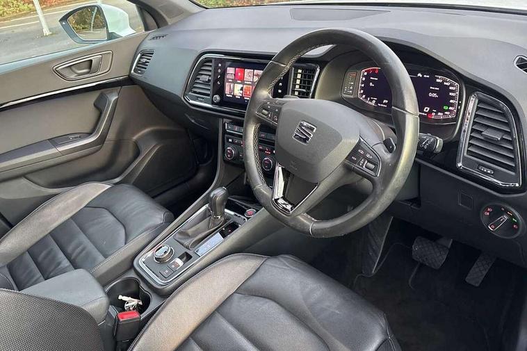 Chrome interior detailing, Advanced Driving Assistance Pack - Ateca Xcellence, Convenience pack - Ateca, Navigation system pack - Ateca, Winter Pack - Ateca, 19" Exclusive machined bi-colour alloy wheels, 2 folding remote keys with window open/close function, Immobiliser, Keyless entry and go and connectivity hub with wireless charger, Locking wheel bolts, Remote central locking, Volumetric alarm with back up horn, SEAT USB media cable, Steering wheel mounted audio/phone controls, 3x3 point rear seatbelts, ABS, Automatic post collision braking, Driver/Front Passenger airbags, Drivers knee airbag, Electronic parking brake with auto hold, Electronic stability control, ESP+EBA, Front and rear seatbelt reminder, Front passenger airbag deactivation, Front side airbags, Hill hold control, Tiredness recognition system, Traction control, Twin curtain airbags, Tyre pressure monitoring system, Aluminium front door sills, Armrest with air outlet in rear, Auto dimming rear view mirror, Auto headlights with automatic coming and leaving home function, Black wheel arch extensions, Body colour bumpers, Body colour door handles, Body colour door mirrors, Chrome front grille frame, Chrome roof rails, Chrome side window trim, Dark tinted rear windows, Door mirrors with welcome light silhouette, Electric adjustable/heated/folding door mirrors, Frameless interior mirror, Front and rear electric windows, Front grille in glossy black, Full LED headlights, Headlight washers, Heated windscreen, Illuminated aluminium front door sill with trim logo, LED daytime running lights, LED front fog lights, Rear fog lights, Rear LED tail lights, Rear wash/wipe, Twin chromed exhaust pipes, Visible dual exhaust pipes, 12v socket in front, 4 Lashing eyes in boot, 60/40 split folding rear seat, Adjustable front armrest with storage compartment, Ambient spot lighting and front footwell illumination, Black roof lining, Driver and passenger seats, height-adjustable, with lumbar adjustment and height-adjustable headrests, Driver and passenger sun visor, covered and illuminated mirror, driver sun visor with card holder, Dual zone climate control, Front courtesy lights, Front cupholders, Front reading lights, Front seat back storage pockets, Gear shift indicator, Heated front seats, Illuminated boot, Illuminated glovebox, Instrument lighting with brightness control, ISOFIX points in outer rear seats with top tether anchorage points, Leather steering wheel and gear knob, Leather upholstery with front sports seats, Multicoloured ambient lighting with LED interior illumination, Rear armrest and easy back seat release mechanism from boot, Rear reading lights, Steering wheel gearshift paddles, Storage box under drivers seat, 'Lights On' Reminder warning buzzer, Adaptive cruise control, Digital clock, Digital cockpit, Driver alert system, Electric tailgate with virtual pedal, Front assist city emergency braking and pedestrian protection, Full Link Smartphone Integration with Mirror Link, Apple Car Play, Google Android Auto, Low fuel warning light, Multi function display, Outside temperature gauge, Rear view camera, Remote fuel flap release, RPM counter, Satellite navigation system, SEAT drive profile with driving experience button, SEAT logo boot release, Self parking functionality (includes front and rear parking sensors), Top view camera, Trip computer, Wash water level indicator, Comfort suspension, XDS electronic differential lock,