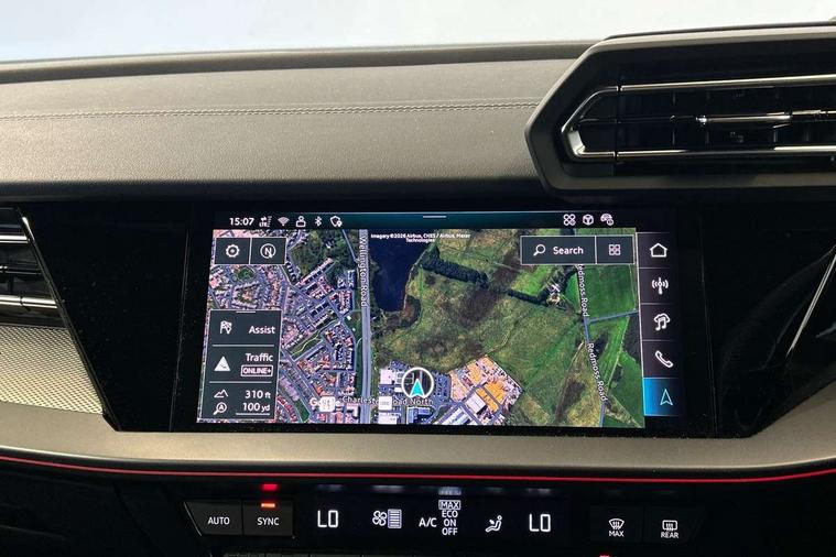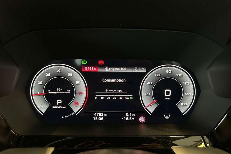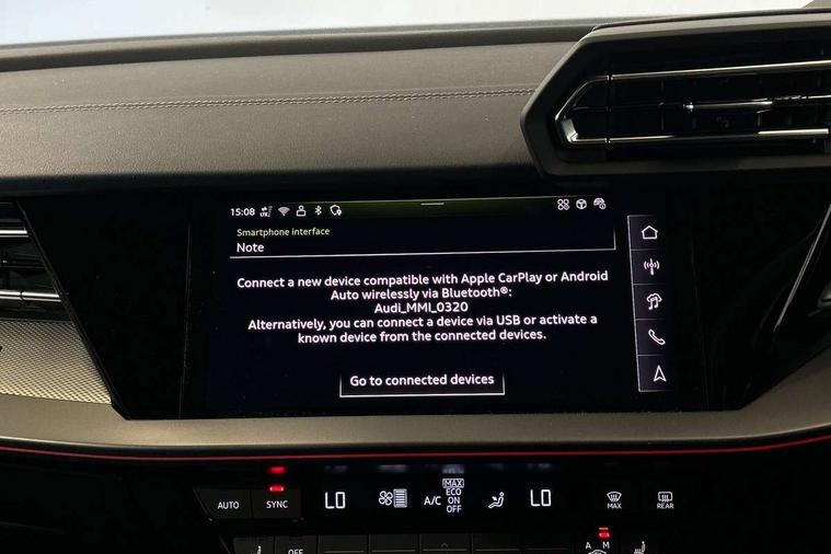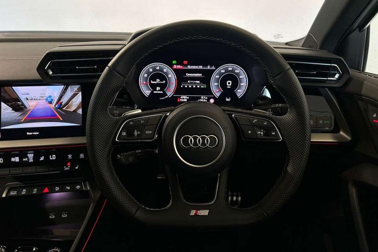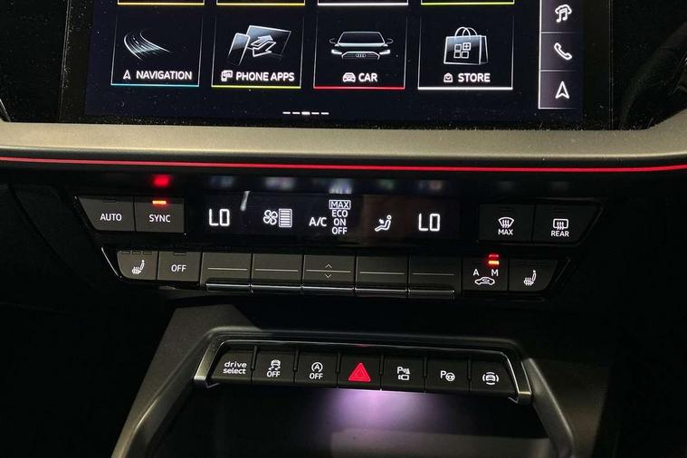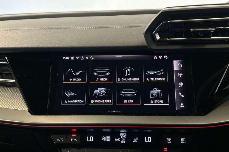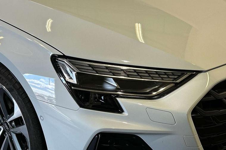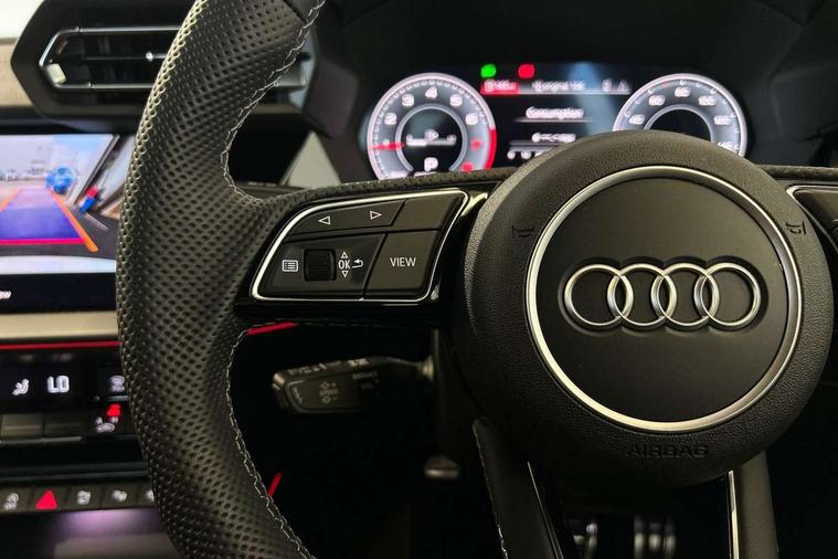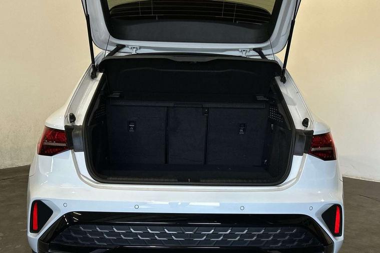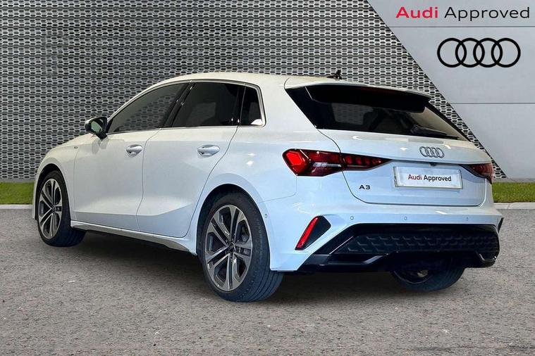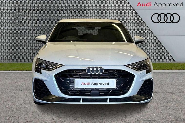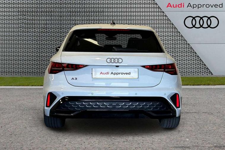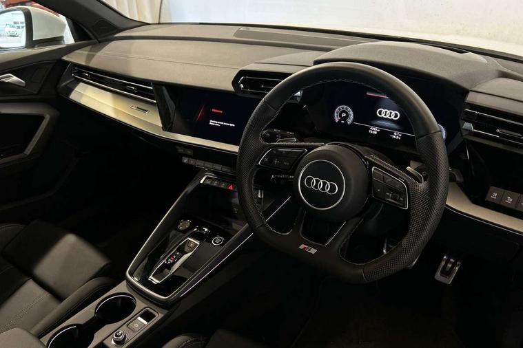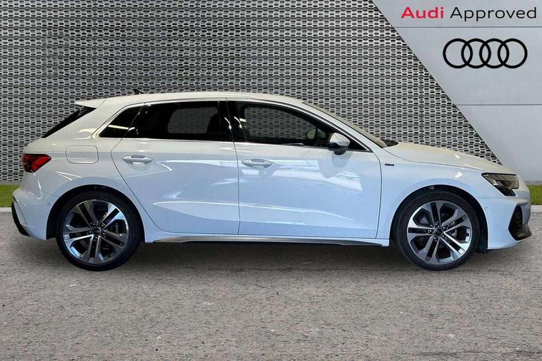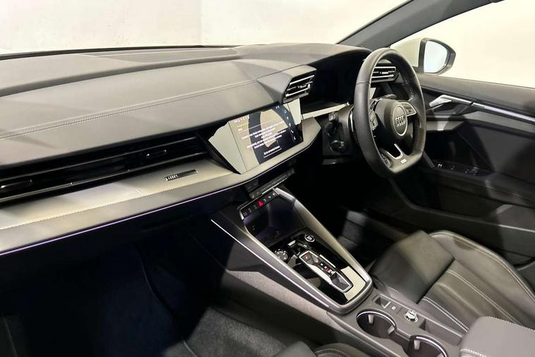Accent surfaces in the dashboard and centre console in platinum grey silk effect paint finish, Dark spectrum aluminium inlays, Aluminium interior elements pack - A3 Sportback, LED interior lighting pack - A3 Sportback, S line styling pack - A3 Sportback, Anti theft alarm, Anti-theft wheel bolts, Electronically operated child lock, Immobiliser, Remote control central locking, 2xUSB-C connection with data and charging functions, 6 passive loudspeakers, DAB Digital radio, 3x3 point rear seat belts, Audi pre sense front, Driver and front passenger airbag with passenger airbag deactivation, Electronic Stabilisation Control (ESC) including ABS, ASR and EDL, First aid kit with warning triangle and 2 safety vests, Front side airbags with head airbags and interaction airbag, Pre-sense front with pedestrian and cyclist detection, Seatbelt monitoring, Tyre pressure loss indicator, 3rd brake light, Acoustic glass windscreen, Aluminium window trim, Auto dimming frameless rear view mirror, Electrically adjustable/heated/folding/dimming door mirrors with kerb view includes integrated LED indications + kerb view function for passenger side, Front electric windows, Illuminated aluminium inserts front door sills with S logo, LED daytime running lights, LED headlights with LED rear lights and dynamic rear indicators, Light and rain sensors, Privacy glass - dark tinted rear window, rear door and side windows, Rear electric windows, Rear side air outlets in grained matt black, Rear side wing doors, Rear wiper, S line bumpers, S roof spoiler, 12V socket and storage compartment in front centre console, 3 seat bench in 2nd row, 40/20/40 split folding rear seat bench with cupholder, Black cloth headlining, Dual zone electronic climate control, Front and rear centre armrest in leather, Front and rear headrests, Front/rear floor mats, Height and reach adjustable steering wheel, Illuminated vanity mirror, Interior lighting - glove compartment light and right hand side, Luggage compartment floor covering, Manual boot compartment lid, Manually adjustable front seats, Seat side bolsters, Single front passenger seat, Stainless steel pedals and front footrest in black, Twin leather upholstery with front sports seats S embossed logo, Audi drive select (Auto, Comfort, Dynamic, Efficiency and Individual), Audi smartphone interface, Audi Virtual Cockpit - 10.25" digital and colour instrument cluster, Automatic start/stop system with recuperation, Bluetooth interface, Collision avoidance assistant, Cruise control, e-Call (emergency call), Electromechanical power speed sensitive steering, Lane departure warning system, MMI Navigation Plus with high resolution 10.1" colour touch screen display, Rear parking sensors, Service indicator, Trip computer, Voice control system with natural language interaction,
