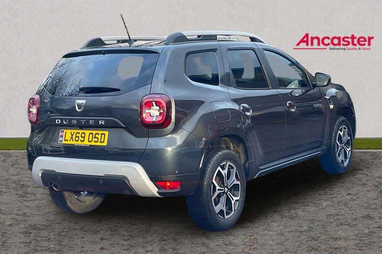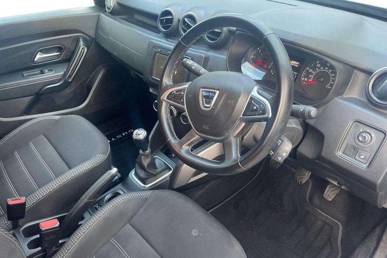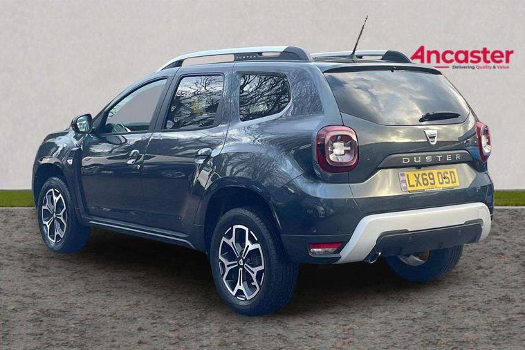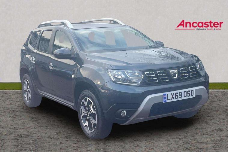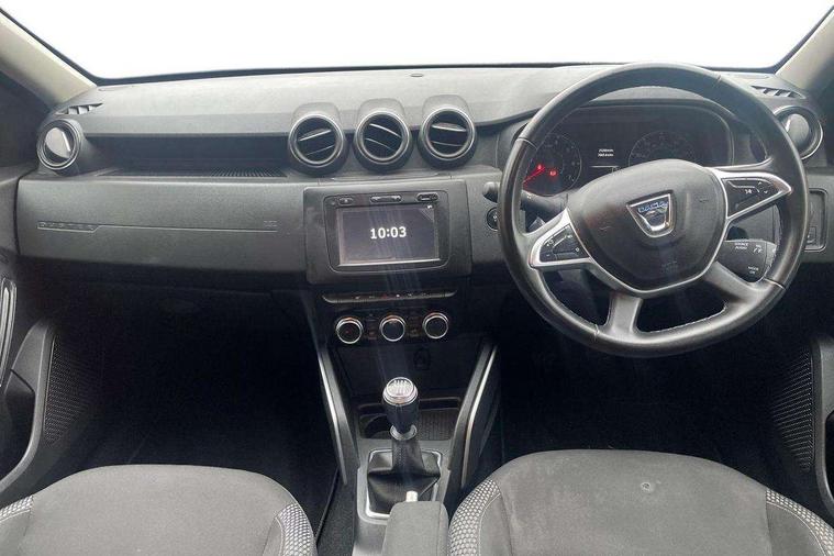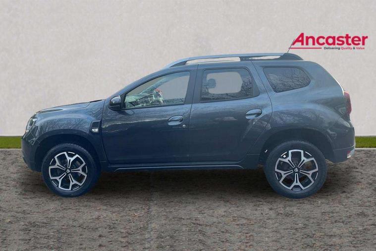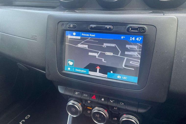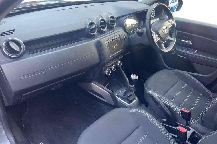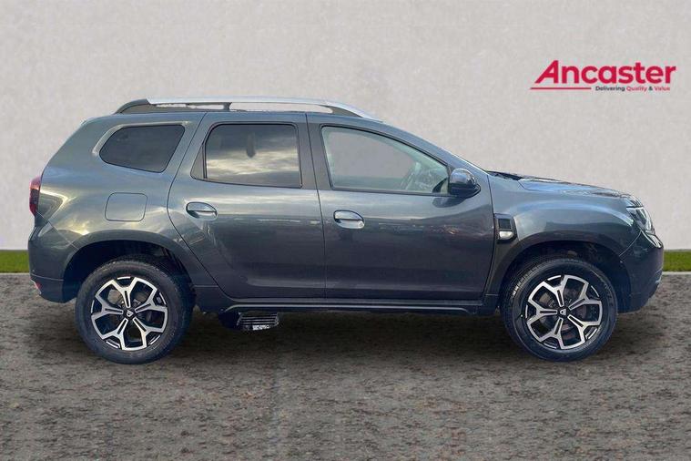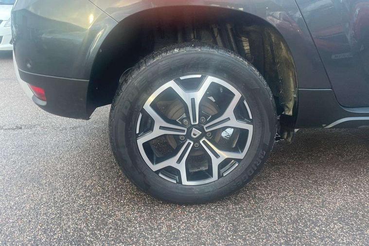 Dark carbon central console surround, Matt black central console fascia, Piano black decorative insert on door panels, Satin chrome air vent surround, Satin chrome instrument dial surrounds, 17" Diamond cut alloy wheels, Keyless entry, Remote central locking, Thatcham approved engine immobiliser, 4x 20W FM/AM/DAB tuner with steering column mounted fingertip controls, Aux-in socket, USB connection for MP3 players, 3x3 point rear seatbelts, ABS and Emergency brake assist, ASR traction control with Electronic stability control, Child locks on rear doors, Door open visual and audible warning, Driver airbag, Driver and passenger seatbelt not fastened - visual and audible warning, Front passenger airbag deactivation, Front seatbelt pretensioners, Front side airbags, Height adjustable front seatbelts, Tyre pressure monitor, 3 speed windscreen wipers, Black number plate surround, Black side sills, Black/satin chrome tailgate trim with Duster inscription in black background and lettering, Body coloured door handles, Body coloured front and rear upper section bumpers, Chrome front grille, Dark glass on lateral rear windows, Dark metal door mirrors in grey, Daytime running lights, Double optic headlights, Dusk sensor, Electric adjustable/heated door mirrors, Electric front windows, Electric rear windows, Front and rear black lower section bumpers, Front door sill protection strip, Front fog lights, Heated rear window, High level third rear brake light, LED automatically switched on - In main headlights, Rear wash/wipe, Satin chrome front and rear skid plates, Satin chrome longitudinal roof bars, 3 rear height adjustable headrests, 4 speed heating and ventilation with air recirculation, 60/40 split folding rear seat, Boot light, Climate control, Driver seat lumbar adjustment, Fabric decorative insert on door panels, Front passenger reading light, Front seat armrests, Front under seat storage, Gear shift indicator, Glovebox light, Height adjustable driver seat, Height adjustable front headrests, Height adjustable steering wheel, Isofix points for child seats in both outer rear seats, Map pocket on front seat backs, Matt black front door handles, Matt black rear door handles, Passenger sunvisor with vanity mirror, Rear passenger reading light, Satin chrome gear lever cap insert, Satin chrome lower steering wheel insert, Soft feel steering wheel, Blind spot monitoring, Bluetooth connectivity, Cruise control, Eco mode, Electric power assisted steering, MediaNav Evolution 7" touchscreen multimedia system with satellite navigation, Apple car play and Android auto, RDS with TMC, siri voice recognition, Multi view camera, On board computer, odometer, trip computer, average fuel consumption, average speed, service indicator, outside temperature gauge, Rear parking sensors, Rev counter, Speed limiter, Stop/start system,