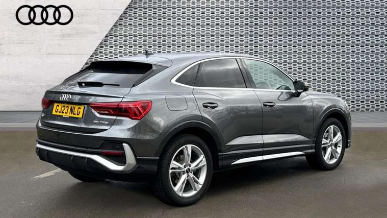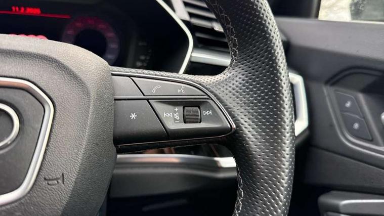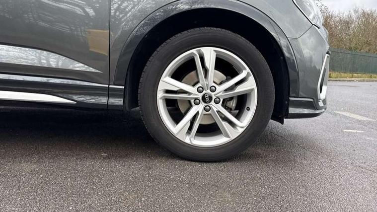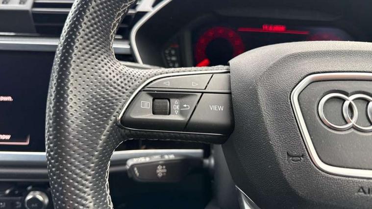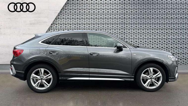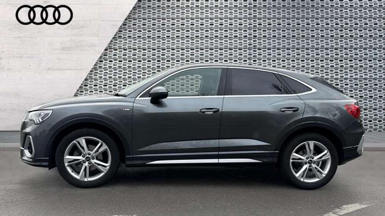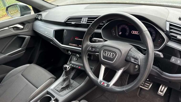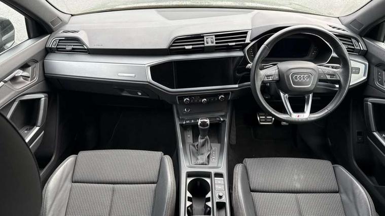Aluminium look interior elements, Black dashboard, Dark matt brushed aluminium inlay, Detail dashboard around MMI touch colour display in glass look, black with surround in aluminium look, Leatherette door armrest, Ambient lighting pack - Q3, Non smoking pack - Q3, Anti theft alarm, Anti theft wheel bolts, Immobiliser, Remote central locking, 2 USB-C ports with charge and data functions, 6 passive loudspeakers, DAB digital radio module, 3x3 point rear seatbelts, 6 airbags - Driver, front passenger, curtain and side windows, Audi pre-sense front with pedestrain and cyclist recognition, Electrically operated child locks on rear doors, Electromechanical parking brake, Electronic stabilisation control including ABS, ASR and EDL, Front seatbelt reminder, Hill descent control, Hill hold assist, Pre sense basic, Seatbelt monitoring, Tyre pressure warning, Warning triangle and first aid kit, Acoustic windscreen, Aluminium window trim, Auto dimming frameless rear view mirror, Diffuser grille in grained matt black, Diffuser trim in selenite silver, Electrically folding, adjustable and heated door mirrors with integrated LED side indicators and kerb view function for passenger side, Front and rear electric windows, Front fog lights, Front side air inlets in selenite silver, Front underbody protection in manhattan grey paint finish, Grille surround in aluminium silver matt, High gloss black finish B and C pillars, LED Dynamic rear indicators, LED headlights with LED daytime running lights, LED rear lights, LED third brake light, Privacy glass dark tinted rear and rear-side windows (from B-pillar backwards), Radiator grille in anthracite black with inlay in matt aluminium silver, Rain and light sensors, Rear side wing doors, Rear underbody protection in matt black, Rear wiper, S line badges on front wings, S line front and rear bumpers and side skirts in contrasting Manhattan grey paint finish, Side skirt insert in matt Platinium grey, Variable front intermittent wipers, 12V socket in rear centre console, 3 seat bench in 2nd row, 3 spoke leather multifunction steering wheel features S badging and grips in perforated leather with contrast stitching, 40:20:40 folding with manual adjustment for 60:40 forwards/backwards position and backrest angle, Adjustable rear seat bench/backrest with centre armrest and cupholder, Black cloth headlining, Dual zone electronic climate control, Front and rear black floor mats with contrast stitching, Front and rear headrests, Front and rear roof module including reading lights, Front centre armrest, Glove compartment lighting, Height and reach adjustable steering wheel, Illuminated door sill trims with S logo, ISOFIX child seat mounting for front passenger with airbag deactivation and outer rear seat including top tether attachment point for outer rear seats, Luggage compartment light in right, Luggage compartment sill protection in stainless steel, Manual front seats with height adjustment, Perforated leather gearknob, Single front passenger seat, Stainless steel pedals, Audi drive select, Audi lane departure warning, Audi smartphone interface includes wireless Apple carplay/Android Auto, Audi Virtual Cockpit - 10.25" display, Bluetooth interface, Camera based traffic sign recognition, Legal emergency call, MMI Navigation Plus with high resolution 10.1 inch touchscreen colour display, Power operated tailgate, Progressive steering, Service interval indicator, Start stop system with recuperation, Voice control system with natural language interaction, Sports suspension,
