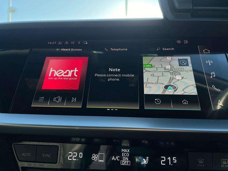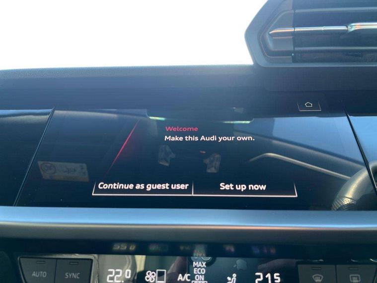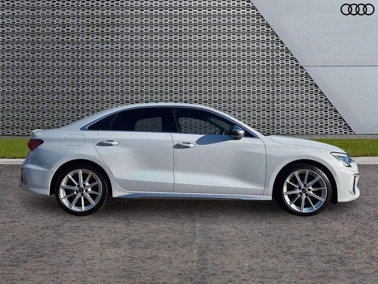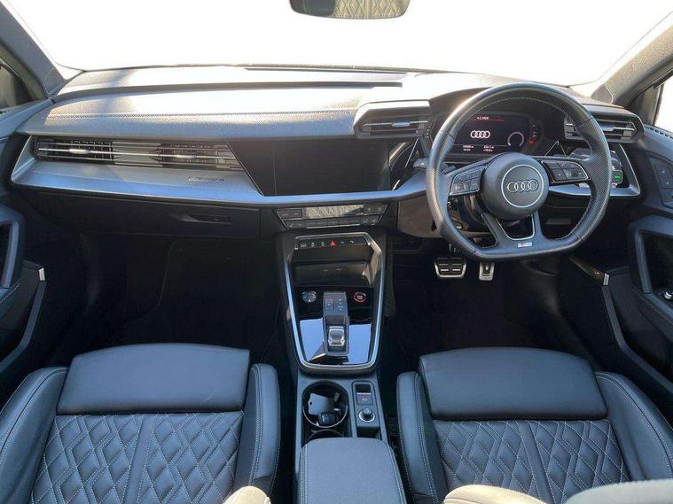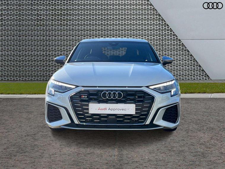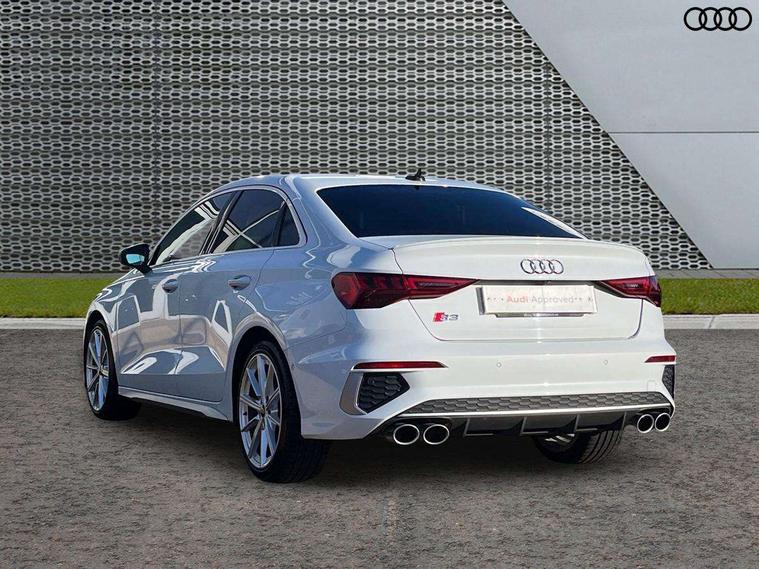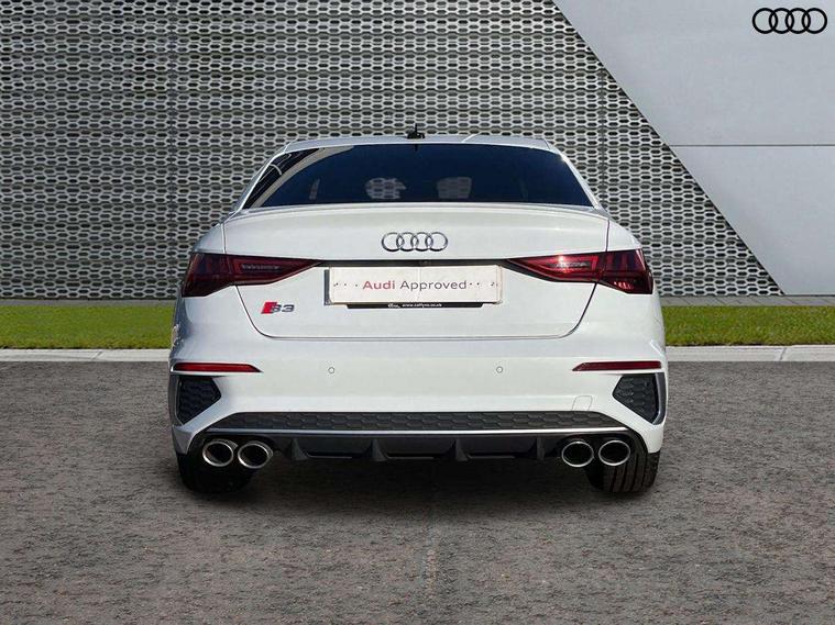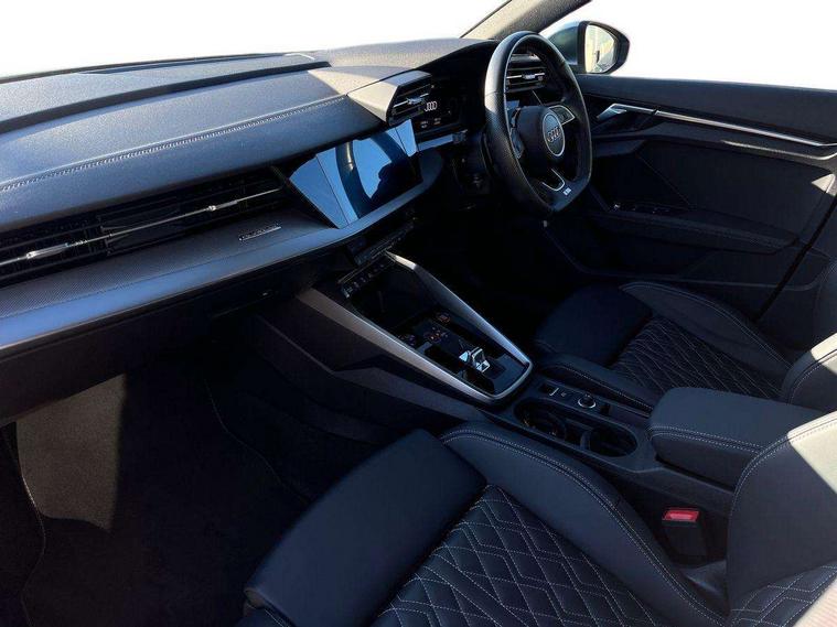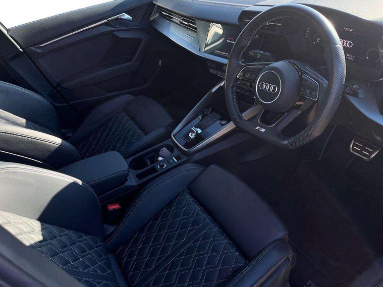 Aluminium air vent surrounds, Aluminium trim elements, Dark spectrum aluminium inlays, accent surfaces in the dashboard and centre console in platinum grey silk effect paint finish, Body styling design pack - S3, Storage pack - A3/S3 Saloon, Anti theft alarm, Anti-theft wheel bolts, Immobiliser, Manual child locks, Remote control central locking, 2x USB Type C ports (for charging and data transfer), 6 passive loudspeakers, CD player, DAB Digital radio, 3x3 point rear seat belts, Driver and front passenger airbag with passenger airbag deactivation, Electronic Stabilisation Control (ESC) including ABS, ASR and EDL, First aid kit with warning triangle and 2 safety vests, Front side airbags with head airbags and interaction airbag, Hill hold assist, Pre-sense front with pedestrian and cyclist detection, Seatbelt monitoring, Tyre pressure loss indicator, 3rd brake light, Acoustic glass windscreen, Audi Beam uses LEDs to project the Audi logo onto the ground as you exit your S3, Auto dimming frameless rear view mirror, Electrically adjustable/heated/folding/dimming door mirrors with kerb view includes integrated LED indications + kerb view function for passenger side, Front electric windows, Headlight washers, Illuminated door sills with aluminium inserts at the front with S logo, LED daytime running lights, LED headlights with LED rear lights and dynamic rear indicators, Light and rain sensors, Model and engine designation badges at rear, Privacy glass - dark tinted rear window, rear door and side windows, Rear boot, Rear electric windows, Rear side wing doors, 12V socket and storage compartment in front centre console, 3 seat bench in 2nd row, 40/20/40 split folding rear seat bench with cupholder, Black cloth headlining, Dual zone electronic climate control, Front and rear centre armrest in leather, Front and rear headrests, Front/rear floor mats, Heated front seats, Height and reach adjustable steering wheel, Illuminated vanity mirror, Interior lighting - glove compartment light and right hand side, Luggage compartment floor covering, Single front passenger seat, Stainless steel pedals and front footrest in black, Audi connect emergency call and service, Audi drive select (Auto, Comfort, Dynamic, Efficiency and Individual), Audi smartphone interface, Audi Virtual Cockpit - 10.25" digital and colour instrument cluster, Automatic start/stop system with recuperation, Bluetooth interface, Collision avoidance assistant, Lane departure warning system, MMI Navigation Plus with high resolution 10.1" colour touch screen display, Progressive steering, Service indicator, Voice control system with natural language interaction, Quattro permanent all wheel drive, S sport suspension with spring damper adjustment and lowering by 15mm,