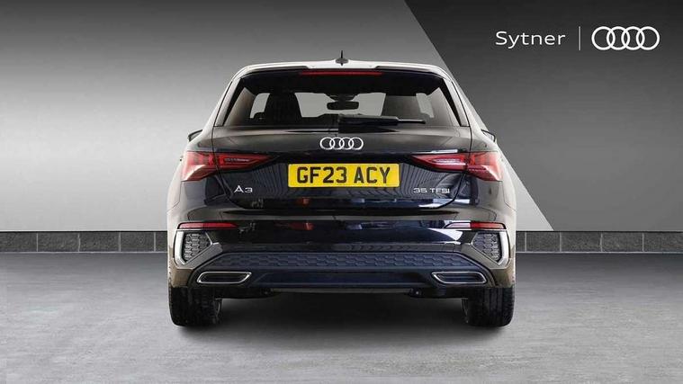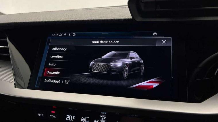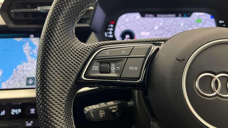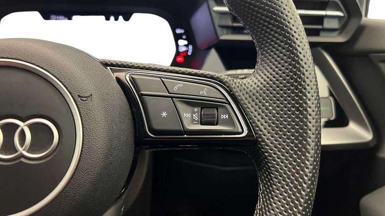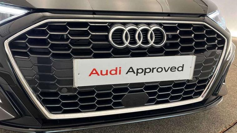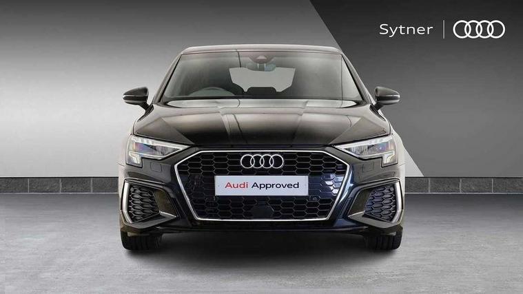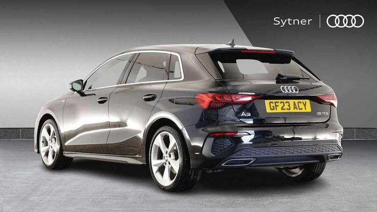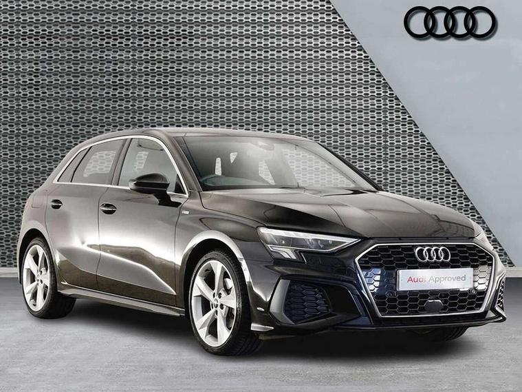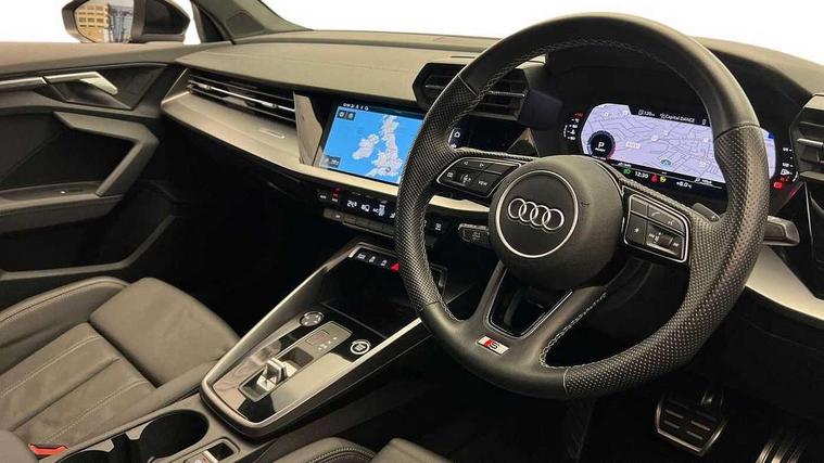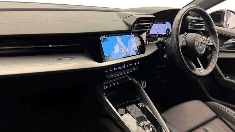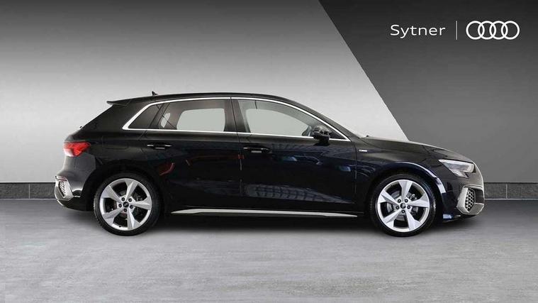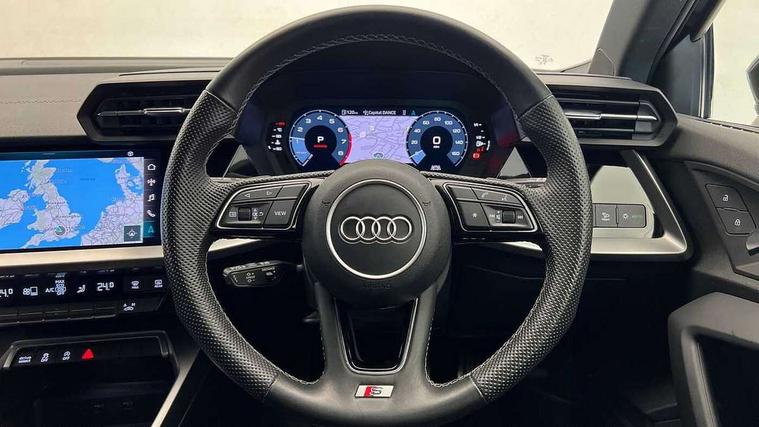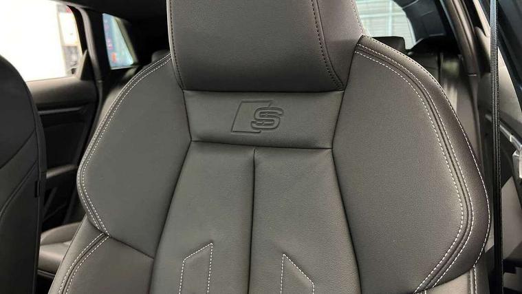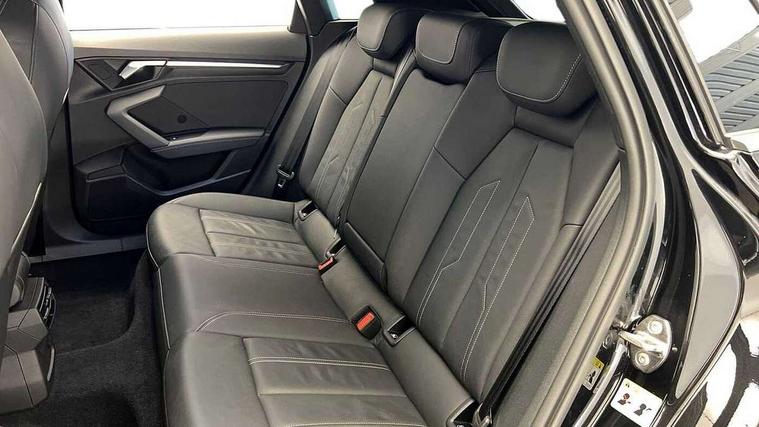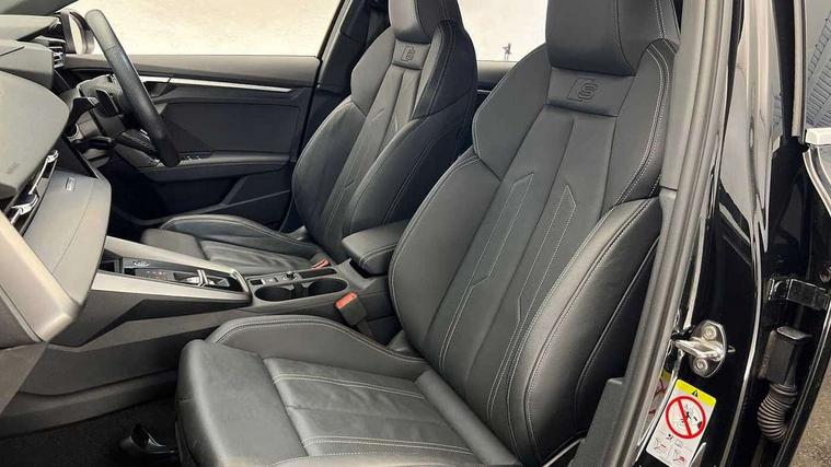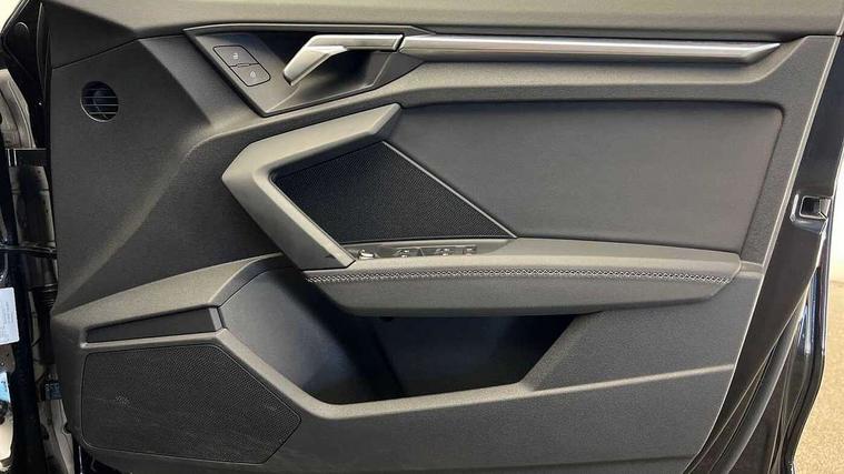 Accent surfaces in the dashboard and centre console in platinum grey silk effect paint finish, Dark spectrum aluminium inlays, Aluminium interior elements pack - A3 Sportback, LED interior lighting pack - A3 Sportback, S line styling pack - A3 Sportback, Anti theft alarm, Anti-theft wheel bolts, Electronically operated child lock, Immobiliser, Remote control central locking, 2xUSB-C connection with data and charging functions, 6 passive loudspeakers, DAB Digital radio, 3x3 point rear seat belts, Audi pre sense front, Driver and front passenger airbag with passenger airbag deactivation, Electronic Stabilisation Control (ESC) including ABS, ASR and EDL, First aid kit with warning triangle and 2 safety vests, Front side airbags with head airbags and interaction airbag, Pre-sense front with pedestrian and cyclist detection, Seatbelt monitoring, Tyre pressure loss indicator, 3rd brake light, Acoustic glass windscreen, Aluminium window trim, Auto dimming frameless rear view mirror, Body colour exterior mirrors, Electrically adjustable/heated/folding/dimming door mirrors with kerb view includes integrated LED indications + kerb view function for passenger side, Front electric windows, Illuminated aluminium inserts front door sills with S logo, LED daytime running lights, LED headlights with LED rear lights and dynamic rear indicators, Light and rain sensors, Privacy glass - dark tinted rear window, rear door and side windows, Rear electric windows, Rear side air outlets in grained matt black, Rear side wing doors, Rear wiper, S line bumpers, S roof spoiler, 12V socket and storage compartment in front centre console, 3 seat bench in 2nd row, 3 spoke leather multifunction steering wheel with paddle shift, 40/20/40 split folding rear seat bench with cupholder, Black cloth headlining, Dual zone electronic climate control, Front and rear centre armrest in leather, Front and rear headrests, Front/rear floor mats, Height and reach adjustable steering wheel, Illuminated vanity mirror, Interior lighting - glove compartment light and right hand side, Luggage compartment floor covering, Manual boot compartment lid, Manually adjustable front seats, Seat side bolsters, Single front passenger seat, Stainless steel pedals and front footrest in black, Twin leather upholstery with front sports seats S embossed logo, Audi drive select (Auto, Comfort, Dynamic, Efficiency and Individual), Audi smartphone interface, Audi Virtual Cockpit - 10.25" digital and colour instrument cluster, Automatic start/stop system with recuperation, Bluetooth interface, Collision avoidance assistant, e-Call (emergency call), Electromechanical power speed sensitive steering, Lane departure warning system, MMI Navigation Plus with high resolution 10.1" colour touch screen display, Service indicator, Trip computer, Voice control system with natural language interaction, Sports suspension,