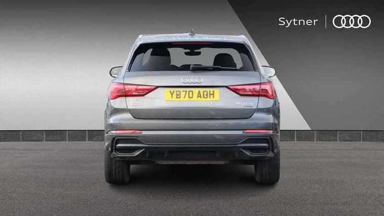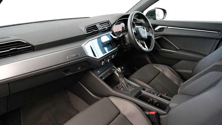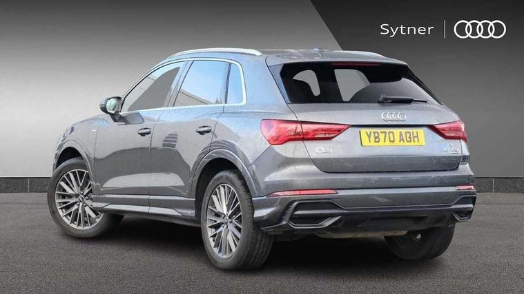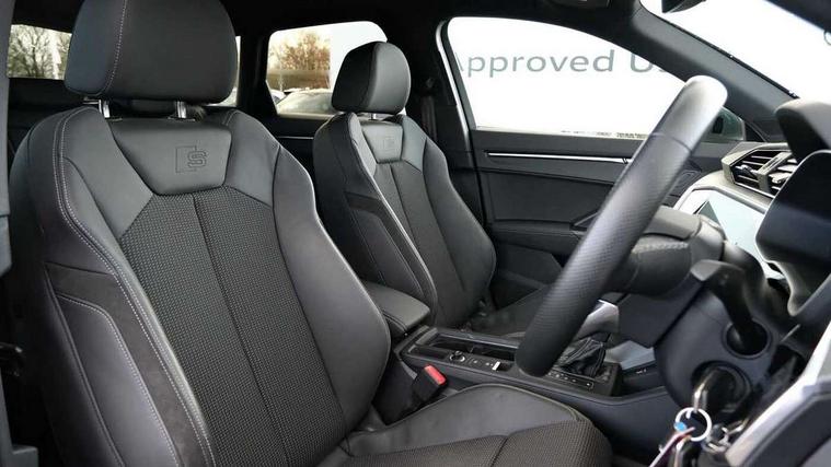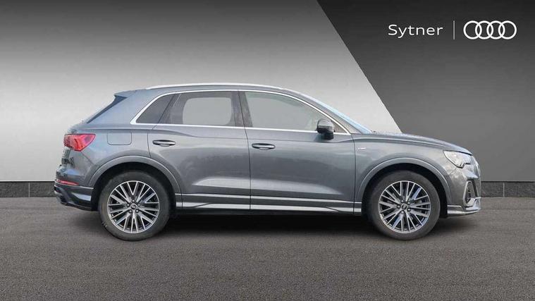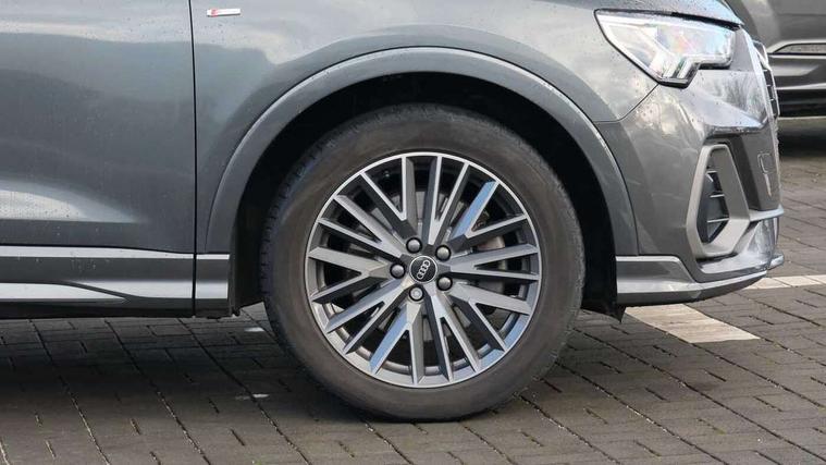 Dark matt brushed aluminium inlay, Detail dashboard around MMI touch colour display in glass look, black with surround in aluminium look, Leatherette door armrest, Non smoking pack - Q3, Anti theft alarm, Anti theft wheel bolts, Remote central locking, 2 USB-C ports with charge and data functions, 6 passive loudspeakers, DAB digital radio module, 3x3 point rear seatbelts, 6 airbags - Driver, front passenger, curtain and side windows, Audi pre-sense front with pedestrain and cyclist recognition, Electrically operated child locks on rear doors, Electromechanical parking brake, Electronic stabilisation control including ABS, ASR and EDL, Hill descent control, Hill hold assist, Pre sense basic, Seatbelt monitoring, Tyre pressure warning, Warning triangle and first aid kit, Acoustic windscreen, Aluminium roof rails, Aluminium window trim, Auto dimming frameless rear view mirror, Body coloured bumpers, Electrically folding, adjustable and heated door mirrors with integrated LED side indicators and kerb view function for passenger side, Front and rear electric windows, Front fog lights, Front side air inlets in matt platinum grey, Front spoiler blade in matt platinum grey, Grille vertical bars in aluminium silver/Matt, High gloss black finish B and C pillars, LED headlights with LED daytime running lights and dynamic rear indicator, LED rear lights, Privacy glass dark tinted rear and rear-side windows (from B-pillar backwards), Rain and light sensors, Rear diffuser strip in matt titanium black, S line badges on front wings, S Line front and rear bumpers, Side skirt insert in matt Platinium grey, Silver chrome grille surround, Titanium black radiator grille, 12V socket in rear centre console, 40:20:40 folding with manual adjustment for 60:40 forwards/backwards position and backrest angle, Adjustable rear seat bench/backrest with centre armrest and cupholder, Black cloth headlining, Dual zone electronic climate control, Front and rear black floor mats with contrast stitching in rock grey, Front and rear headrests, Front and rear roof module including reading lights, Front centre armrest, Glove compartment lighting, Height and reach adjustable steering wheel, Illuminated door sill trims with S logo, ISOFIX child seat mounting for front passenger with airbag deactivation and outer rear seat including top tether attachment point for outer rear seats, Luggage compartment light, Manual front seats with height adjustment, Perforated leather gearknob, Stainless steel luggage compartment sill finisher, Stainless steel pedals, Audi connect safety and service (e-call), Audi drive select, Audi lane departure warning, Audi side assist, Audi smartphone interface includes wireless Apple carplay/Android Auto, Audi Virtual Cockpit - 10.25" display, Bluetooth interface, Camera based traffic sign recognition, MMI Navigation Plus with high resolution 10.1 inch touchscreen colour display, Power operated tailgate, Progressive steering, Service interval indicator, Start stop system with recuperation, Voice control system with natural language interaction, Sports suspension,