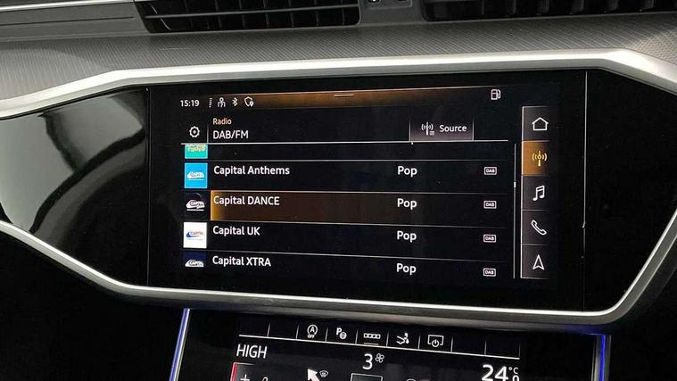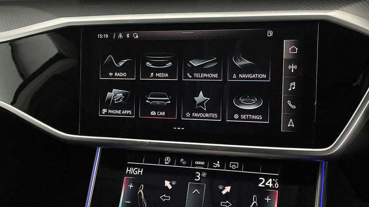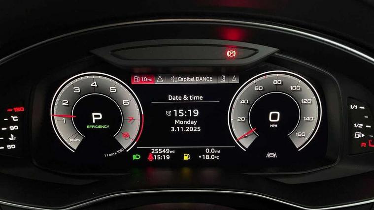 Aluminium fragment inlays, LED interior ambient lighting pack - A7, Non smoking pack - A7, Anti theft alarm with tow away protection, Anti-theft wheel bolts and wheel loosening detection, Immobiliser, Keyless Go, Preparation for tracking system, Remote central locking, Audi music interface - 2 USB ports with charger and data functions, Audi sound system with 6 channel amplifier, 180 watt amplifying capacity and 10 loudspeakers including subwoofer, Auxiliary input socket, DAB digital radio module, 3 point seatbelts on all seats, Audi pre-sense front, Driver and passenger airbags, Electromechanical parking brake, Electronic stabilisation control including ABS, ASR and EDL, Extended pedestrian protection measures, Hill hold assist, Manual child lock in rear doors, Seatbelt monitoring, Tyre pressure warning light, Warning triangle and first aid kit, All weather LED headlights with LED DRL, Black rear diffuser with chrome inlays, Body coloured bumpers, Body coloured door mirrors, Dynamic rear indicators, Frameless auto dimming interior rear view mirror, Front and rear electric windows, Heat insulating glass in side and rear windows, High beam assist, High gloss black air inlets, High gloss black radiator grille with chrome single frame surround, Rain and light sensors, Rear side wing doors, Rear wiper, Retractable rear spoiler, Third brake light, Towbar preparation, Windscreen with heat-insulating glass, 2 zone deluxe electronic climate control, 3 spoke high multi-function leather steering wheel with shift paddles, 4-way electric lumbar support, 40/20/40 split folding 3 seater rear seat bench with rear centre armrest, Cloth headlining, Door sills trims with aluminium inlays, Electrically adjustable front seats - driver seat with memory, Front and rear headrests, Front centre armrest, Front/rear floor mats, Heated front seats, Height/reach adjust steering wheel, Illuminated sun visors with vanity mirrors, ISOFIX child seat mounting and top tether in front and outer rear seats with front passenger airbag deactivation, Leather gear knob, Leatherette upper instrument panel and door shoulders, Luggage compartment floor, Lunar silver cloth headlining, Single front passenger seat, Tool kit and car jack, Twin leather upholstery, Audi connect safety and service (e-call), Audi connect with Amazon Alexa Integration, Audi drive select, Audi parking system plus - acoustic and visual park assist system for front and rear, Audi smartphone interface, Audi virtual cockpit - 12.3" high resolution LCD digital instrument cluster display, Automatic start/stop system with coasting functionality, Bluetooth interface, Colour driver's information system display, Cruise control system with speed limiter, Electric boot lid release, Lane departure warning system, MMI nav plus with MMI touch + 10.1" and 8.6" HD haptic touch screen/3D city models/country information/online map/route info and personal route assist, Operating buttons in black, glass look with haptic feedback, Power operated tailgate, Progressive steering, Rear view camera, Service indicator, Voice control system, Standard suspension,