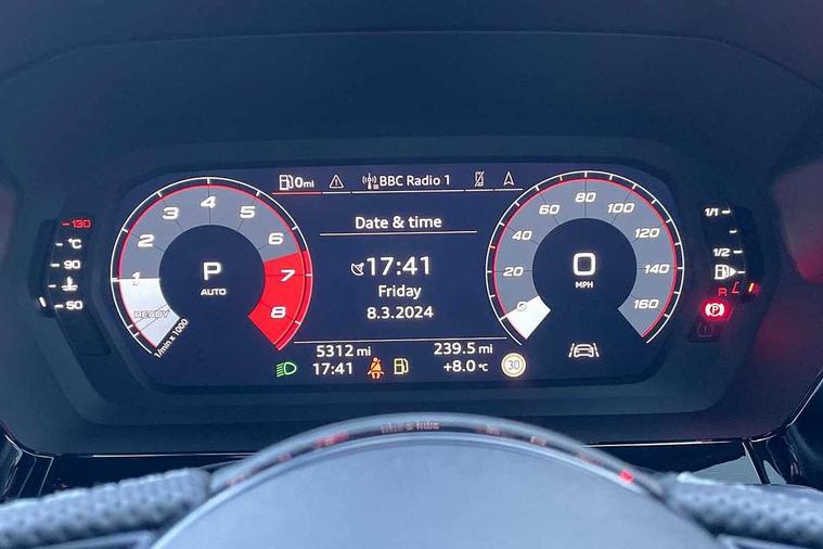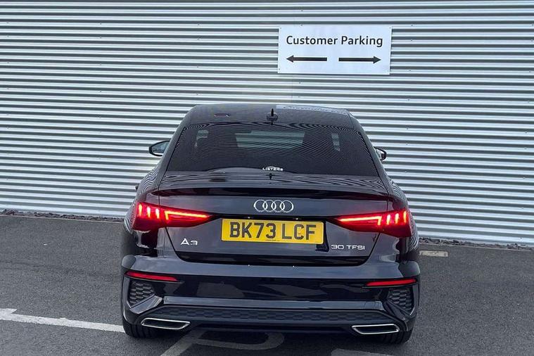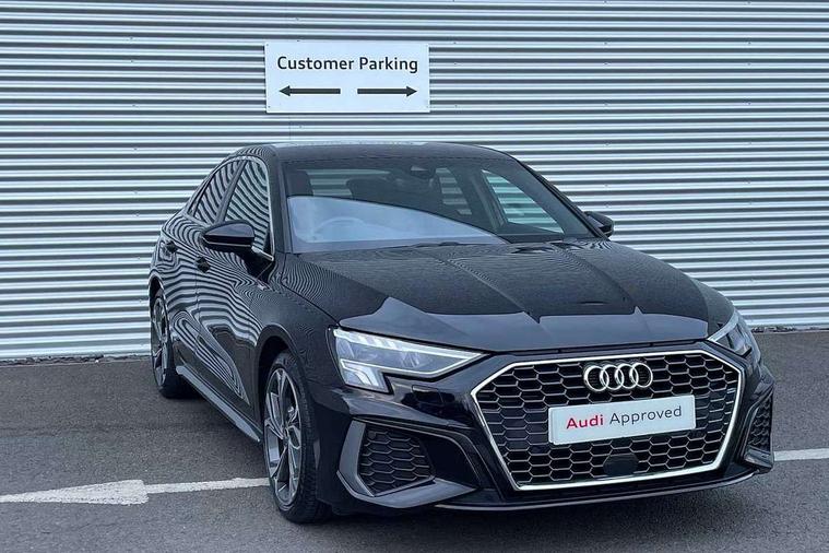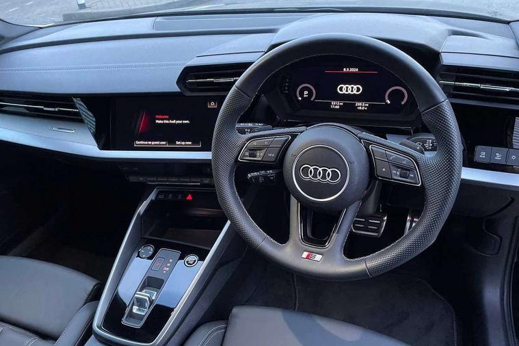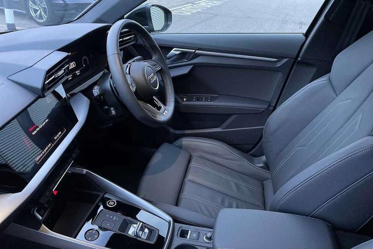 Aluminium air vent surrounds, Dark spectrum aluminium inlays, accent surfaces in the dashboard and centre console in platinum grey silk effect paint finish, Aluminium interior elements pack - A3 Saloon, LED interior lighting pack - A3 Saloon, S line styling pack - A3 Saloon, Anti theft alarm, Anti-theft wheel bolts, Electronically operated child locks, Immobiliser, Remote control central locking, 2xUSB-C connection with data and charging functions, 6 passive loudspeakers, CD player, DAB Digital radio, 3x3 point rear seat belts, Driver and front passenger airbag with passenger airbag deactivation, Electronic Stabilisation Control (ESC) including ABS, ASR and EDL, First aid kit with warning triangle and 2 safety vests, Front side airbags with head airbags and interaction airbag, Pre-sense front with pedestrian and cyclist detection, Seatbelt monitoring, Tyre pressure loss indicator, 3rd brake light, Acoustic glass windscreen, Aluminium window trim, Auto dimming frameless rear view mirror, Body colour exterior mirrors, Electrically adjustable/heated/folding/dimming door mirrors with kerb view includes integrated LED indications + kerb view function for passenger side, Front electric windows, Illuminated door sills with aluminium inserts at the front with S logo, LED daytime running lights, LED headlights with LED rear lights and dynamic rear indicators, Light and rain sensors, Model and engine designation badges at rear, Privacy glass - dark tinted rear window, rear door and side windows, Rear boot, Rear electric windows, Rear side wing doors, S line bumpers, S roof spoiler, 12V socket and storage compartment in front centre console, 3 seat bench in 2nd row, 3 spoke leather multifunction steering wheel with gear shift paddles, 4 way electrically adjustable lumbar support for driver and front passenger, 60/40 split folding rear seat bench, Black cloth headlining, Dual zone electronic climate control, Front and rear centre armrest in artificial leather, Front and rear headrests, Front/rear floor mats, Height and reach adjustable steering wheel, Interior lighting - glove compartment light and right hand side, Luggage compartment floor covering, Manual boot compartment lid, Manually adjustable front seats, Seat side bolsters, Single front passenger seat, Stainless steel pedals and front footrest in black, Twin leather upholstery with front sports seats S embossed logo, Audi drive select (Auto, Comfort, Dynamic and Individual), Audi smartphone interface, Audi Virtual Cockpit - 10.25" digital and colour instrument cluster, Automatic start/stop system with recuperation, Bluetooth interface, Camera based traffic sign recognition, Collision avoidance assistant, e-Call (emergency call), Electromechanical power speed sensitive steering, Lane departure warning system, MMI Navigation Plus with high resolution 10.1" colour touch screen display, Service indicator, Trip computer, Voice control system with natural language interaction, Sports suspension,