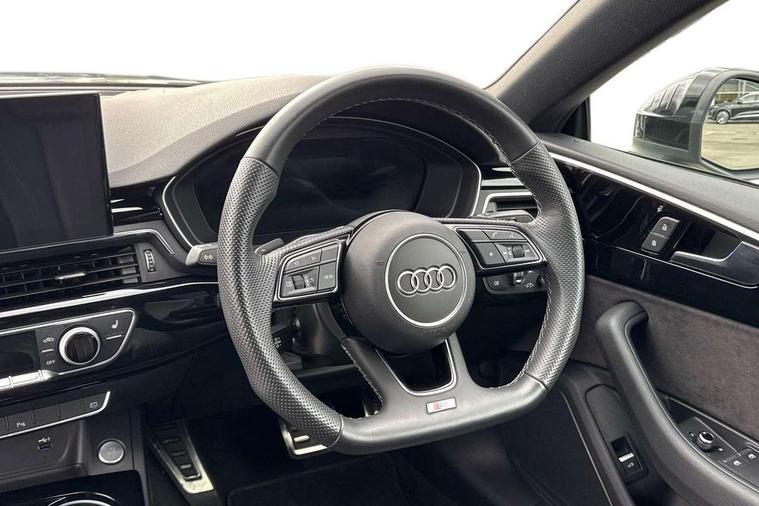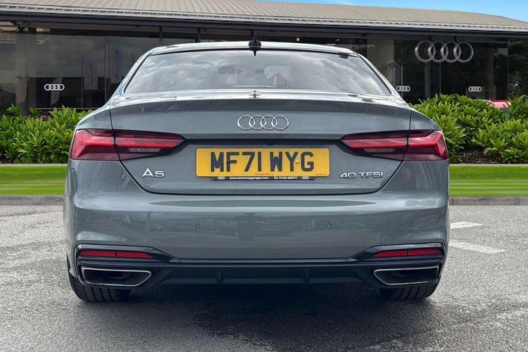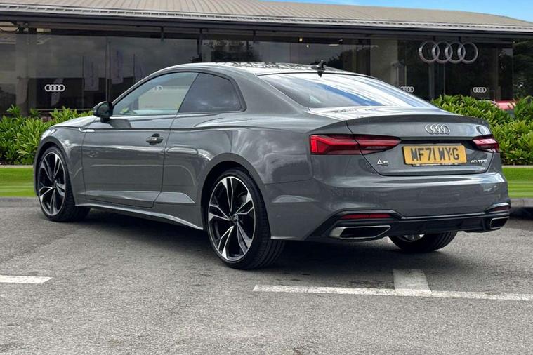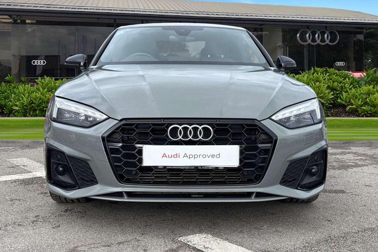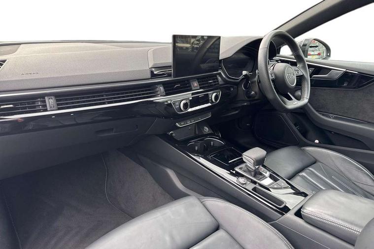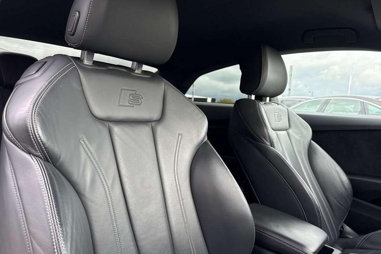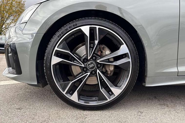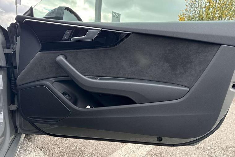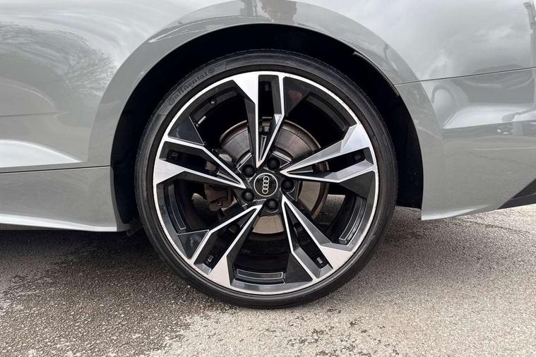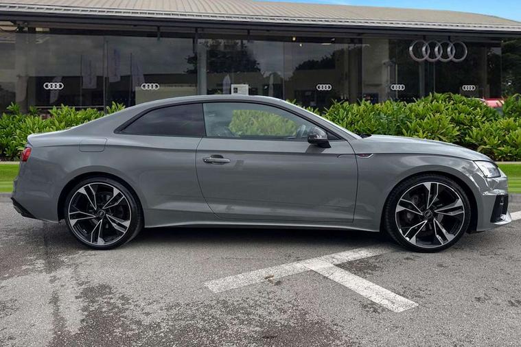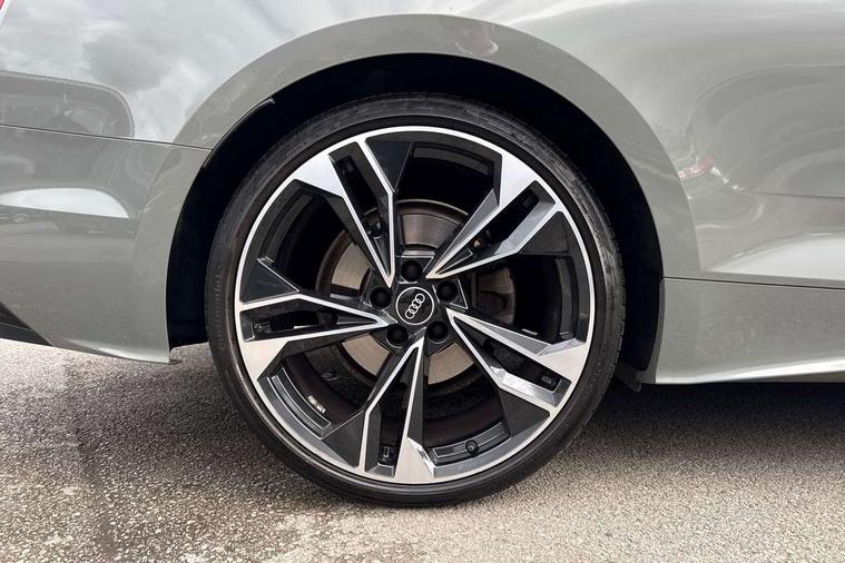 Piano black finish inlay, Black styling pack - A5 Coupe/Sportback, LED interior light pack - A5/RS5, 20" 5 twin spoke polygon design alloy wheels in gloss anthracite black and gloss turned finish, Tyre repair kit, Anti theft alarm system, Anti theft wheel bolts, Immobiliser, Keyless Go, Remote central locking, 8 passive loudspeakers, CD player, DAB digital radio reception, Two additional USB ports for rear passenger in rear centre console, Two SDXC card slots, 2 x 3-point rear seat belts, 6 airbags - Driver, front passenger, curtain and side airbags, Electromechanical parking brake, Electronic Stabilisation Control (ESC) including ABS, ASR and EDL, Front passenger airbag deactivation, Height adjustable front seatbelts, Hill hold assist, Multi collision brake assist, Pop-up bonnet for pedestrian protection, Seatbelt monitoring, Tyre pressure warning, Variable restraint system, Warning triangle and first aid kit, Auto dimming rear view mirror, Black door mirror housings, Body colour bumpers, Body colour door handles, Body colour front spoiler lip, Body colour side sill trim, Electric adjustable heated door mirrors, Electric folding door mirrors, Electric front windows, Front fog lights, Honeycomb structure radiator grille in grained matt black, Matrix LED headlights with Audi laser light, dynamic light sequencing and dynamic indicator, Matt aluminium silver tailpipe trim, Privacy glass, Rain and light sensors, Rear diffuser in matt titanium black with trim strip in matt aluminium silver, Side air inlets in grained matt black with matt aluminium silver inlay, Sport front and rear bumpers with side skirts, Towbar preparation, Windscreen with acoustic glazing, 4 way electric lumbar support for driver and front passenger, 40/20/40 split folding 2 seater rear seat bench with rear centre armrest, Adjustable steering column, Black cloth headlining, Black perforated leather gearknob, Contrast stitching on seats, steering wheel and gear lever gaiter, Deluxe 3 zone electronic climate control, Electrically adjustable front seats, Fine Nappa leather upholstery with front sports seats S embossed logo, Front centre armrest, Front head restraints, Front/rear floor mats, Heated front seats, Illuminated door sill trim with S logo, ISOFIX child seat mounting and top tether, Luggage compartment mat, Rear headrests, Stainless steel pedals, Sunvisors with vanity mirrors, Tool kit, Audi connect safety and service (e-call), Audi drive select (Auto, Comfort, Dynamic, Efficiency and Individual), Audi parking system plus with front and rear sensors, Audi phone box with wireless charging, Audi smartphone interface, Audi virtual cockpit - 12.3" full colour digital instrument cluster, vehicle/engine speed, Radio/media information+Driver assistance systems, Automatic start-stop system with coasting functionality and efficiency programme, Bluetooth interface, Electric boot lid release, Electro-mechanical power steering, Email, calendar and text messages displayed via MMI, MMI nav+ with MMI touch - 10.1" high resolution MMI display, touch sensitive, 3D map, route/country info, dynamic route guide, personal route assist, Rear view camera, Service interval indicator, Voice control system, Sports suspension lowered by 23mm,