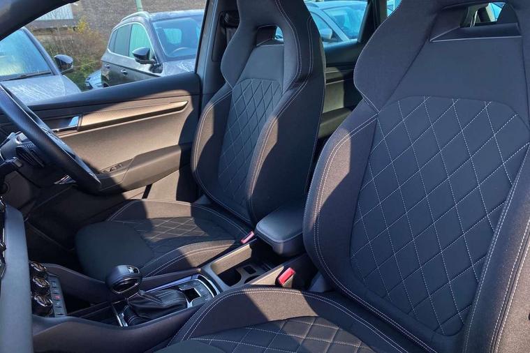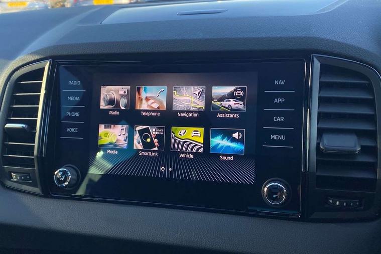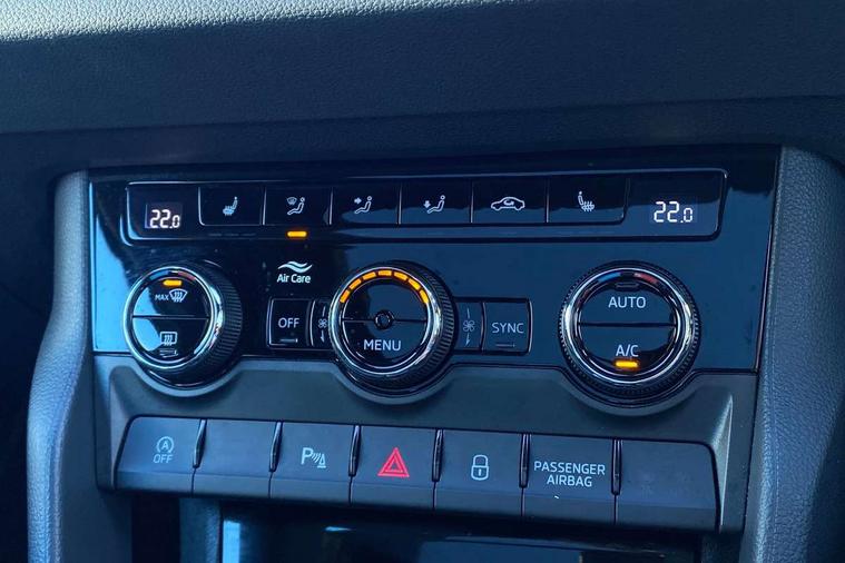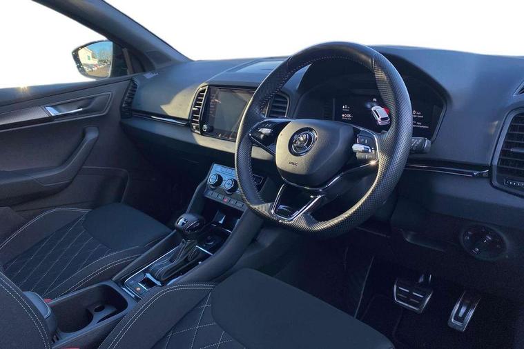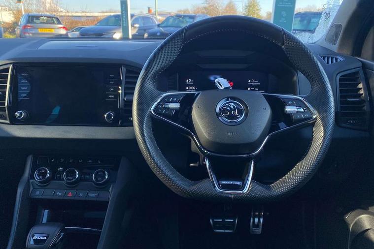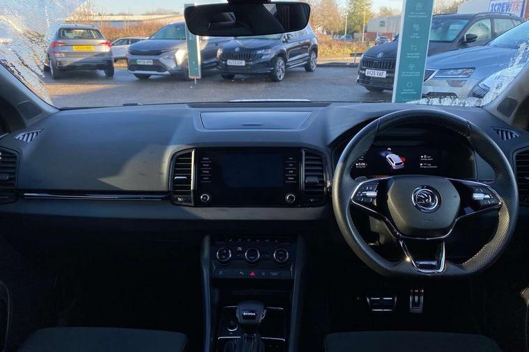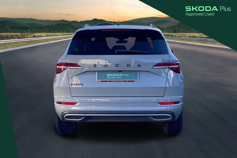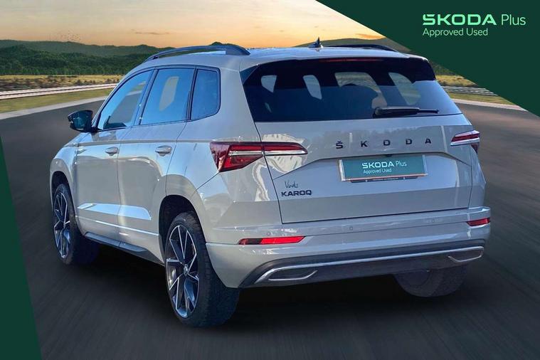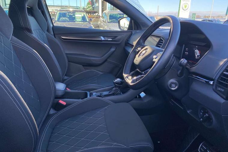 8" Digital display, Care connect, Driver fatigue sensor, Emergency services call system, Outside temperature gauge, Service interval indicator, SmartLink wireless for Apple and wired for Android, Start/stop system with regenerative braking, USB C Port x 2 in front centre console, Virtual cockpit, Virtual pedal with electrically operated boot door, 8 speakers, DAB radio with Bluetooth, USB connection, Wireless charging without wireless aerial connection, Acoustic glass, Aero front windscreen wipers with intermittent function, Auto dimming rear view mirror with light and rain sensors, Black door mirrors, Black electric window control buttons, Black radiator grille, Black roof rails, Body colour door handles, Electric front and rear windows with child proof lock, Front door steps with SportLine logo, Heated rear windscreen, LED daytime running lights, LED rear lights with high functionality welcome effect and dynamic indicators, Light assistant (coming/leaving home/tunnel light), Panoramic sliding sunroof, Plastic scuff plates, Privacy glass, Protective door side sills in body colour, Rear diffuser, Rear side wing doors, Rear spoiler, Rear window wiper with washer system and intermittent control, Safety reflectors on front doors, Skoda lettering on tailgate in black, Sportline badge on front fender, Sportline decorative inserts with badging, Sports front and rear bumpers, Third brake light, 1.5 litre bottle holders in driver and front passenger door panels, 12V socket in boot, 12v socket in front centre armrest with storage compartment and rear air vents, 3 rear height adjustable headrests, 3 seat bench in 2nd row, 3 spoke leather sports multifunction steering wheel and silver stitching with gear shift paddles, 4 foldable roof handles with rear coat hooks, Black floor carpet, Black roof headlining, Chrome inner door handles, Double sided boot floor, Foldable hooks in the boot, Front head restraints, Height adjustable front three point seats belts with tensioners, Height/reach adjust steering wheel, Ice scraper, Illuminated glovebox, Illuminated luggage compartment, Isofix child seat preparation outer rear, Manual lumbar support for front seats, Pen holder, Pollen filter, Rear boot cover, Rear reading lights, Rear seats fixed folding and divided 60:40, Rubbish bin door, Safety vest holder, Single front passenger seat, Storage box in upper central dashboard closed, Sunvisors with illuminated vanity mirrors, Textile floor mats, Ticket holder, Titan black interior ceiling, Tool kit, Welcome animation with sportline logo, Boot pack - Karoq, Light Pack - Karoq, Parking pack - Karoq, Automatic door unlocking in case of crash, Automatic fuel cut off in case of crash, Child locks on rear doors, Driver airbag, Electronic parking brake with auto hold function, Emergency rear braking signal, ESC including ABS, MSR, ASR, EDS, HBA, DSR, RBS, MKB and traction control, Front side airbags, Hill hold control, Knee airbags, Passenger airbag with switch-off function, Pedestrian monitor, Seatbelt reminder signalisation and pretensioner for all seats, Three point seatbelts rear, Two tone horn, Tyre pressure display, Tyre pressure monitor, Alarm with interior monitoring, back up horn and tilt sensor with safe function, Electronic engine immobiliser, Keyless entry and start/stop, Remote central locking with 2 remote folding keys, Black air vent surround, Black centre console, Satin black dashboard, Satin black door trim, 19" Sagitarius anthracite alloy wheels with matt black aero inserts, Anti-theft wheel bolts protection, Matt black aero hub caps,