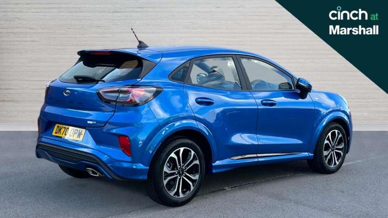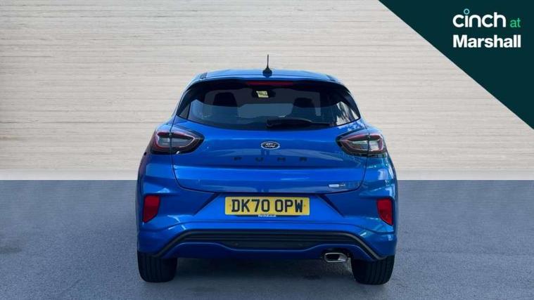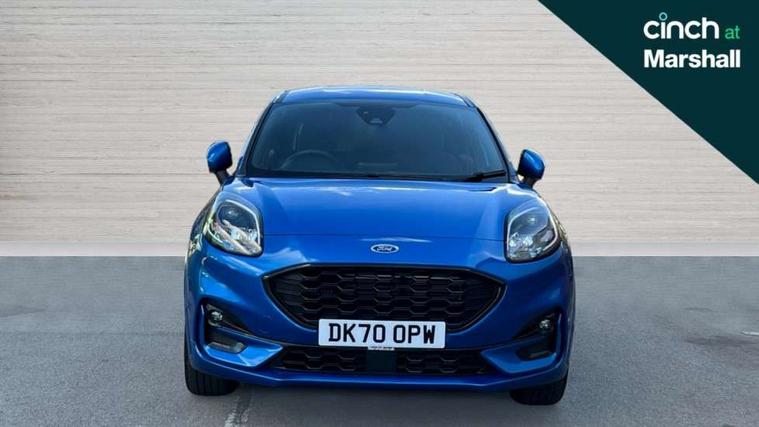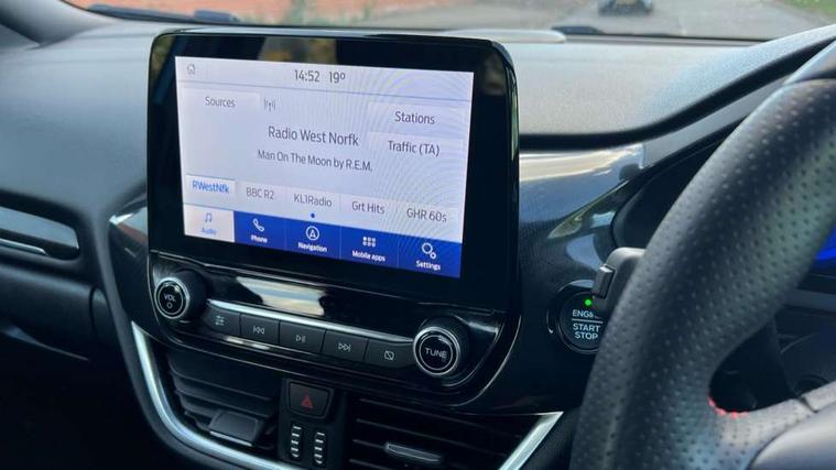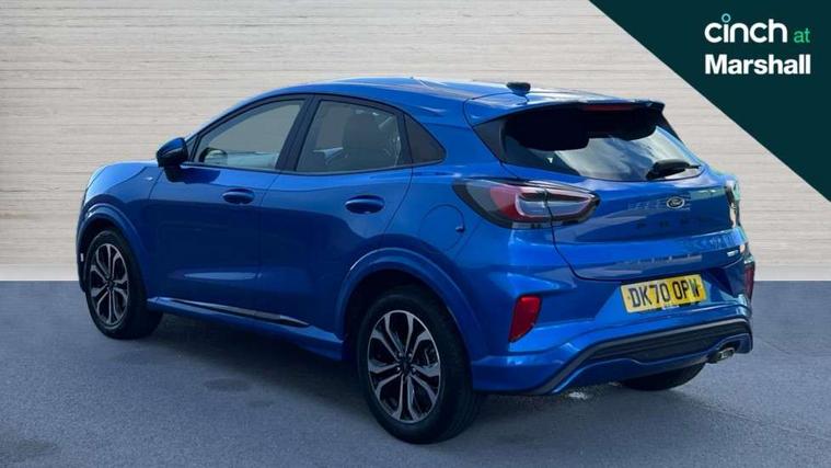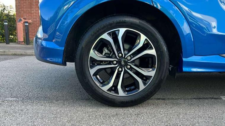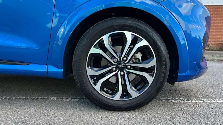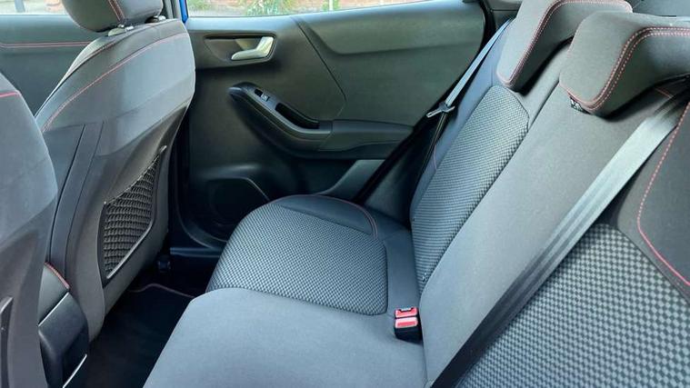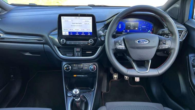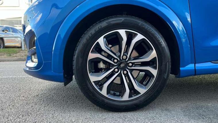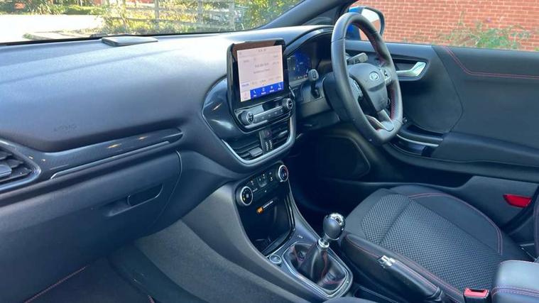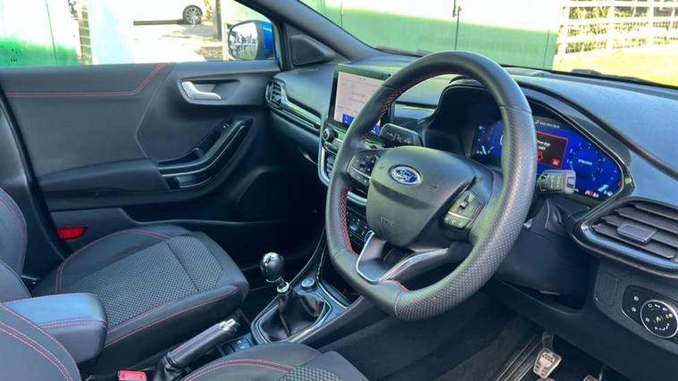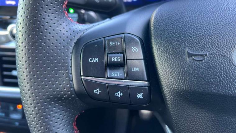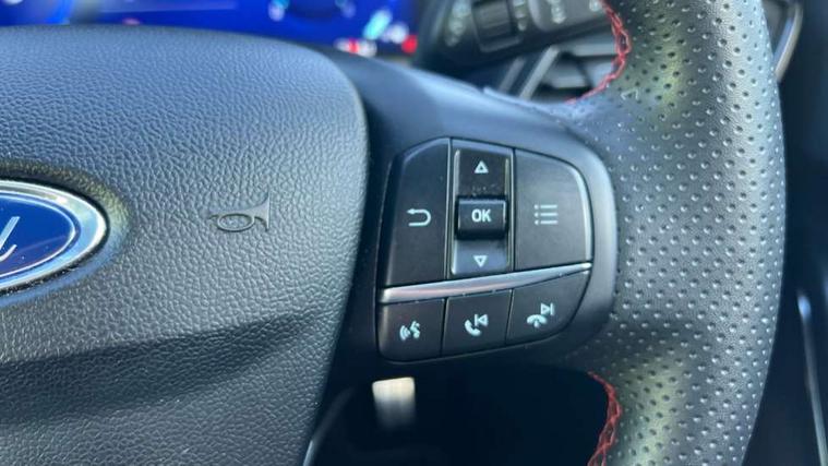 Thatcham alarm, 3 rear seatbelts, Electronic stability control (ESC) and hill start assist, Pre-collision assist with autonomous emergency braking, pedestrian/cyclist detection & post-collision braking, Tyre pressure monitoring system (TPMS), Automatic headlights with rain sensing wipers and auto high beam, Body coloured door mirrors, Front fog lights with cornering lights and LED rear lamps, Power foldable heated door mirrors with puddle lamps, Quickclear heated windscreen, Rear wiper, ST-Line body kit with large rear spoiler wth sports suspension, Alloy sports pedals, Centre console with armrest and stowage, Cloth upholstery, Driver seat height/lumbar adjust, Ford megabox extended bootspace, Front and rear floor mats, Front and rear head restraints, Manual air conditioning, ST-Line flat bottomed sensico leather steering wheel with leather handbrake and aluminium gear knob, Ford easy fuel, Full digital 12.3" instrument cluster, Lane keeping aid with lane departure warning, Power assist steering, Rear parking sensor, Selectable drive modes(Normal, sport, Eco, trail, slippery),