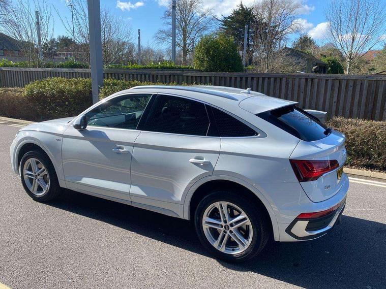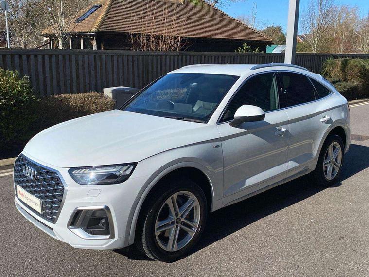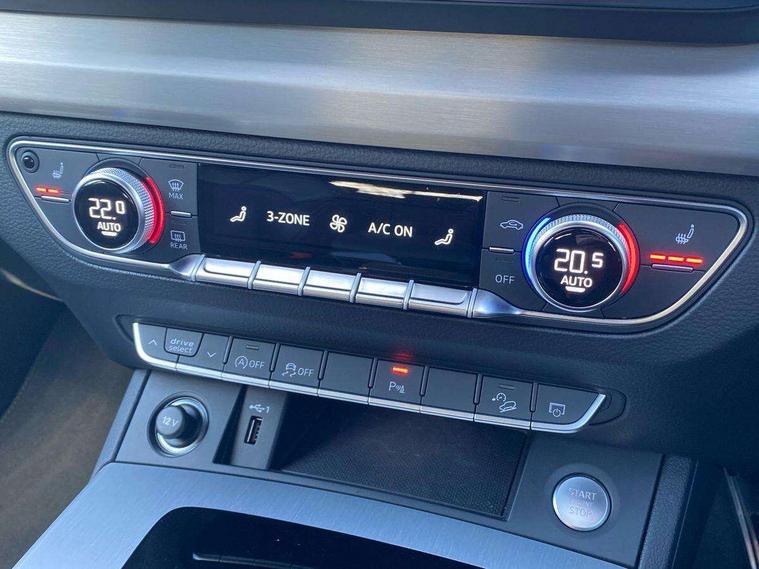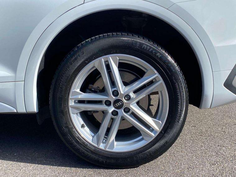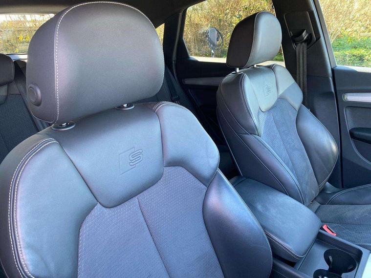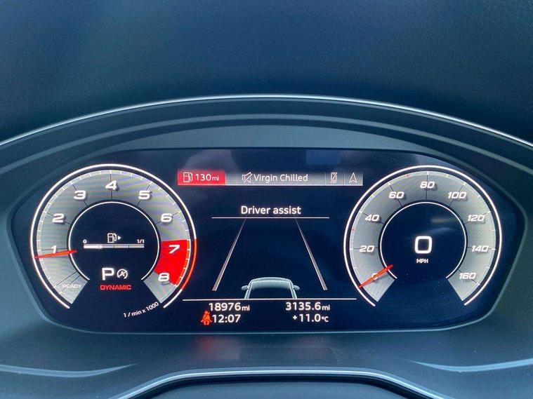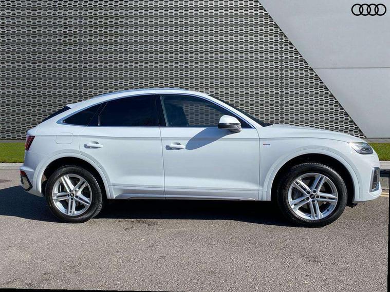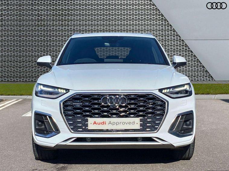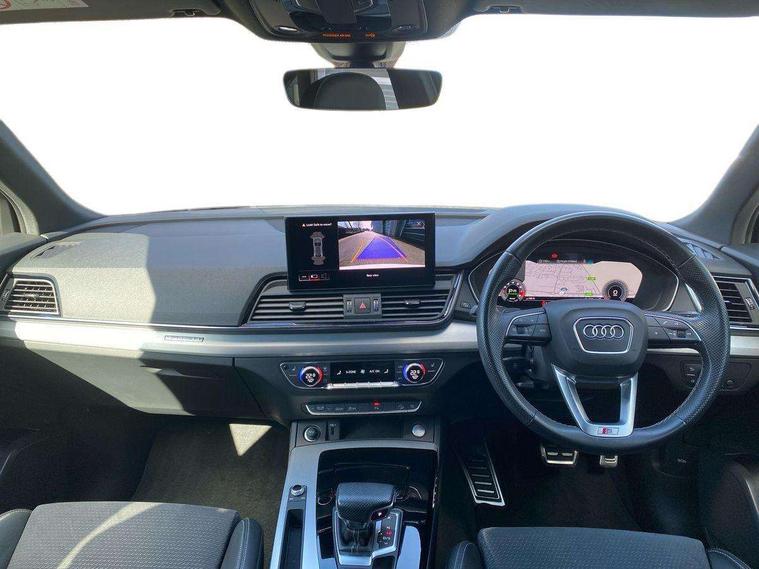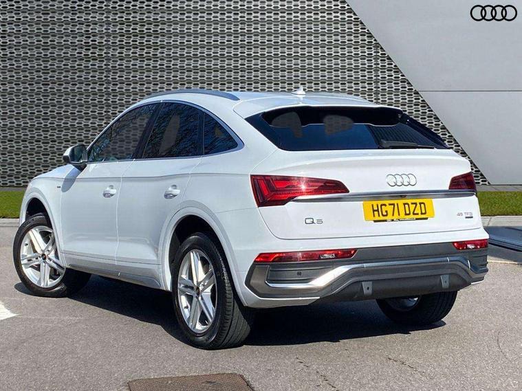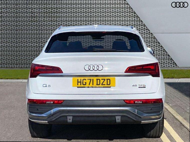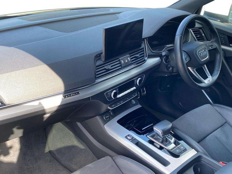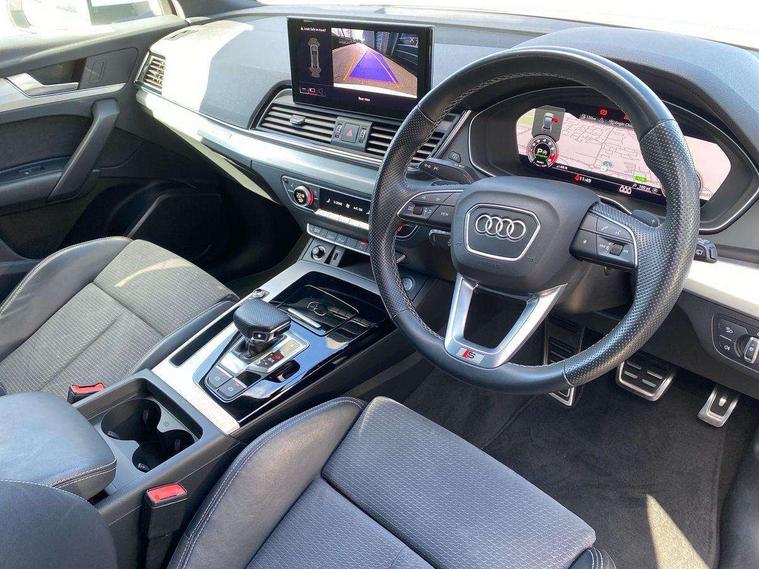 Matt brushed aluminium inlays, High gloss pack - Q5, LED interior light pack - Q5, Anti theft alarm, Anti-theft wheel bolts, Keyless Go access/ignition system, DAB Digital radio, 3 point seatbelts on all seats, 6 airbags - Driver, front passenger, curtain and side airbags, Electrically operated child locks on rear doors, Electromechanical parking brake, Electronic stabilisation control including ABS, ASR and EDL, Front passenger airbag deactivation, Hill descent control, Hill hold assist, Multi collision brake assist, Pop-up bonnet for pedestrian protection, Pre sense city, Seat belt force limiter, Seatbelt monitoring, Tyre pressure warning, Warning triangle and first aid kit, Acoustic windscreen, Aluminium roof rails, Audi matrix LED headlights with dynamic front and rear indicators, Auto dimming rear view mirror, Automatic headlights and windscreen wipers, Body colour door mirrors, Body colour rear diffuser with matt aluminium silver surrounds, Body colour underbody protection, Chrome plated exhaust trims, Door sills in Selenite silver, Electric adjustable/heated/folding door mirrors, Front air inlet surrounds in aluminium, Front and rear electric windows, Front radiator grille in honeycomb design, Headlight washers, Lower bumpers painted in contrast Manhattan grey, Rear chrome trim strip below lights, Rear privacy glass and rear side windows, Rear spoiler, Rear wiper, Roof bars, S Line badges on the front wings, S Line front and rear bumpers, S Line side skirts, 2 x USB charging port with aux input socket, 3 rear headrests, 40:20:40 split folding rear seat with rear centre armrest, Black cloth headlining, Comfort front centre armrest, Contrast stitching on seats, steering wheel and gear lever gaiter, Deluxe 3 zone electronic climate control, Front head restraints, Front/rear floor mats, Gear lever in black leather, Heated front seats, Height/reach adjustable steering column, Illuminated door sill trims with S logo, ISOFIX child seat mounting and top tether, Manual seat adjustment with 4-way electric lumbar support, Removable luggage compartment floor, Stainless steel pedals, Sunvisors with vanity mirrors, Trunk roller cover, Audi connect safety and service (e-call), Audi connect with Amazon Alexa Integration, Audi drive select, Audi virtual cockpit plus with 12.3" screen and three different layout designs, Audi wireless smartphone interface, Automatic start-stop system with coasting functionality and efficiency programme, Bluetooth interface, Electro - mechanical power assisted steering, MMI navigation plus with 10.1" touch screen, Power tailgate, Reversing camera, Service interval indicator, Voice control system with Audi hotword activation "Hey Audi", Quattro on demand, S line sports suspension,