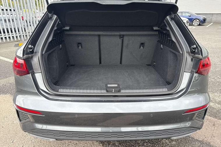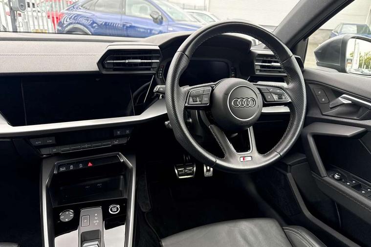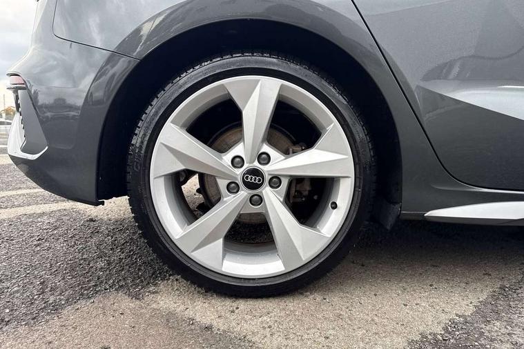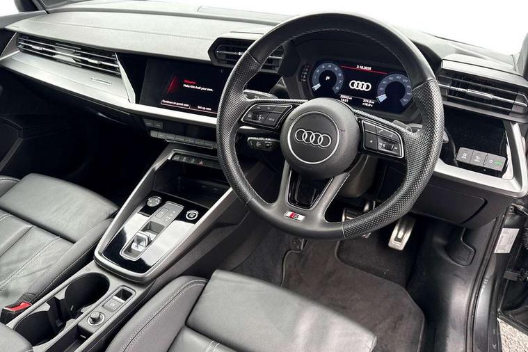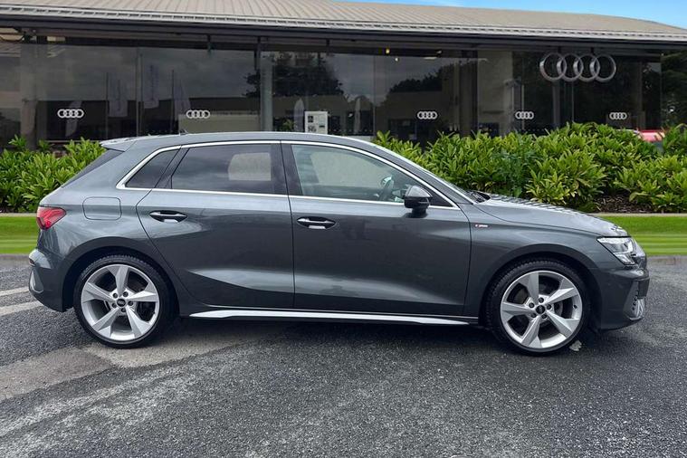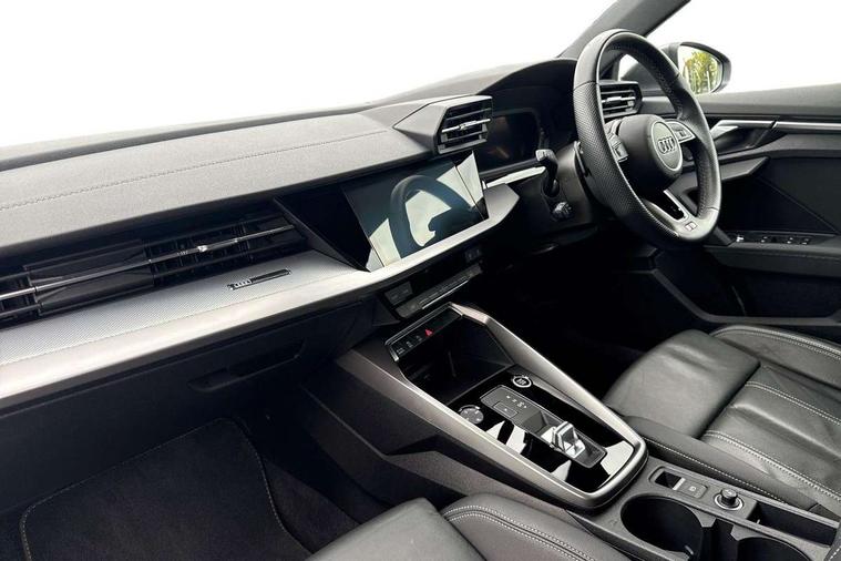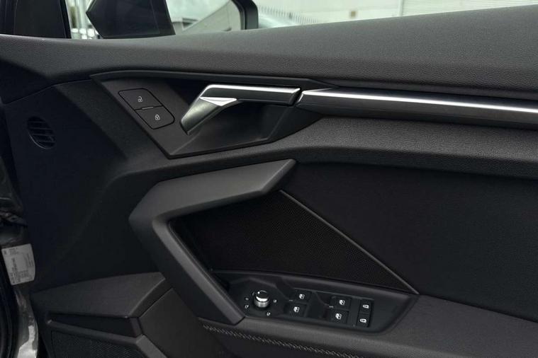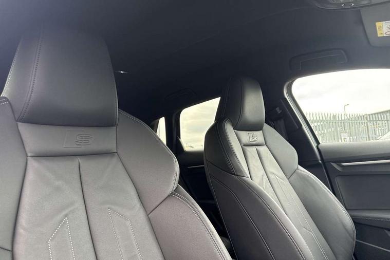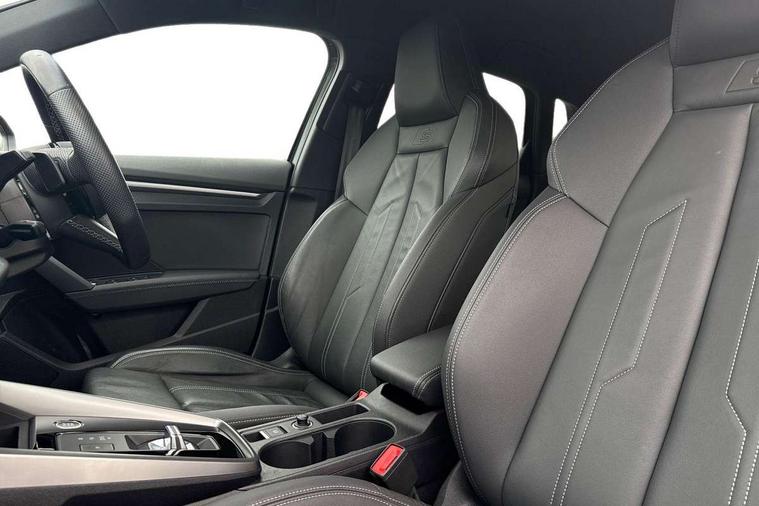 Accent surfaces in the dashboard and centre console in platinum grey silk effect paint finish, Dark spectrum aluminium inlays, Aluminium interior elements pack - A3 Sportback, LED interior lighting pack - A3 Sportback, S line styling pack - A3 Sportback, Anti theft alarm, Anti-theft wheel bolts, Electronically operated child lock, Immobiliser, Remote control central locking, 2xUSB-C connection with data and charging functions, 6 passive loudspeakers, DAB Digital radio, 3x3 point rear seat belts, Audi pre sense front, Driver and front passenger airbag with passenger airbag deactivation, Electronic Stabilisation Control (ESC) including ABS, ASR and EDL, First aid kit with warning triangle and 2 safety vests, Front side airbags with head airbags and interaction airbag, Pre-sense front with pedestrian and cyclist detection, Seatbelt monitoring, Tyre pressure loss indicator, 3rd brake light, Acoustic glass windscreen, Aluminium window trim, Auto dimming frameless rear view mirror, Body colour exterior mirrors, Electrically adjustable/heated/folding/dimming door mirrors with kerb view includes integrated LED indications + kerb view function for passenger side, Front electric windows, Illuminated aluminium inserts front door sills with S logo, LED daytime running lights, LED headlights with LED rear lights and dynamic rear indicators, Light and rain sensors, Privacy glass - dark tinted rear window, rear door and side windows, Rear electric windows, Rear side air outlets in grained matt black, Rear side wing doors, Rear wiper, S line bumpers, S roof spoiler, 12V socket and storage compartment in front centre console, 3 seat bench in 2nd row, 3 spoke leather multifunction steering wheel with paddle shift, 40/20/40 split folding rear seat bench with cupholder, Black cloth headlining, Dual zone electronic climate control, Front and rear centre armrest in leather, Front and rear headrests, Front/rear floor mats, Height and reach adjustable steering wheel, Illuminated vanity mirror, Interior lighting - glove compartment light and right hand side, Luggage compartment floor covering, Manual boot compartment lid, Manually adjustable front seats, Seat side bolsters, Single front passenger seat, Stainless steel pedals and front footrest in black, Twin leather upholstery with front sports seats S embossed logo, Audi drive select (Auto, Comfort, Dynamic, Efficiency and Individual), Audi smartphone interface, Audi Virtual Cockpit - 10.25" digital and colour instrument cluster, Automatic start/stop system with recuperation, Bluetooth interface, Collision avoidance assistant, e-Call (emergency call), Electromechanical power speed sensitive steering, Lane departure warning system, MMI Navigation Plus with high resolution 10.1" colour touch screen display, Service indicator, Trip computer, Voice control system with natural language interaction, Sports suspension,